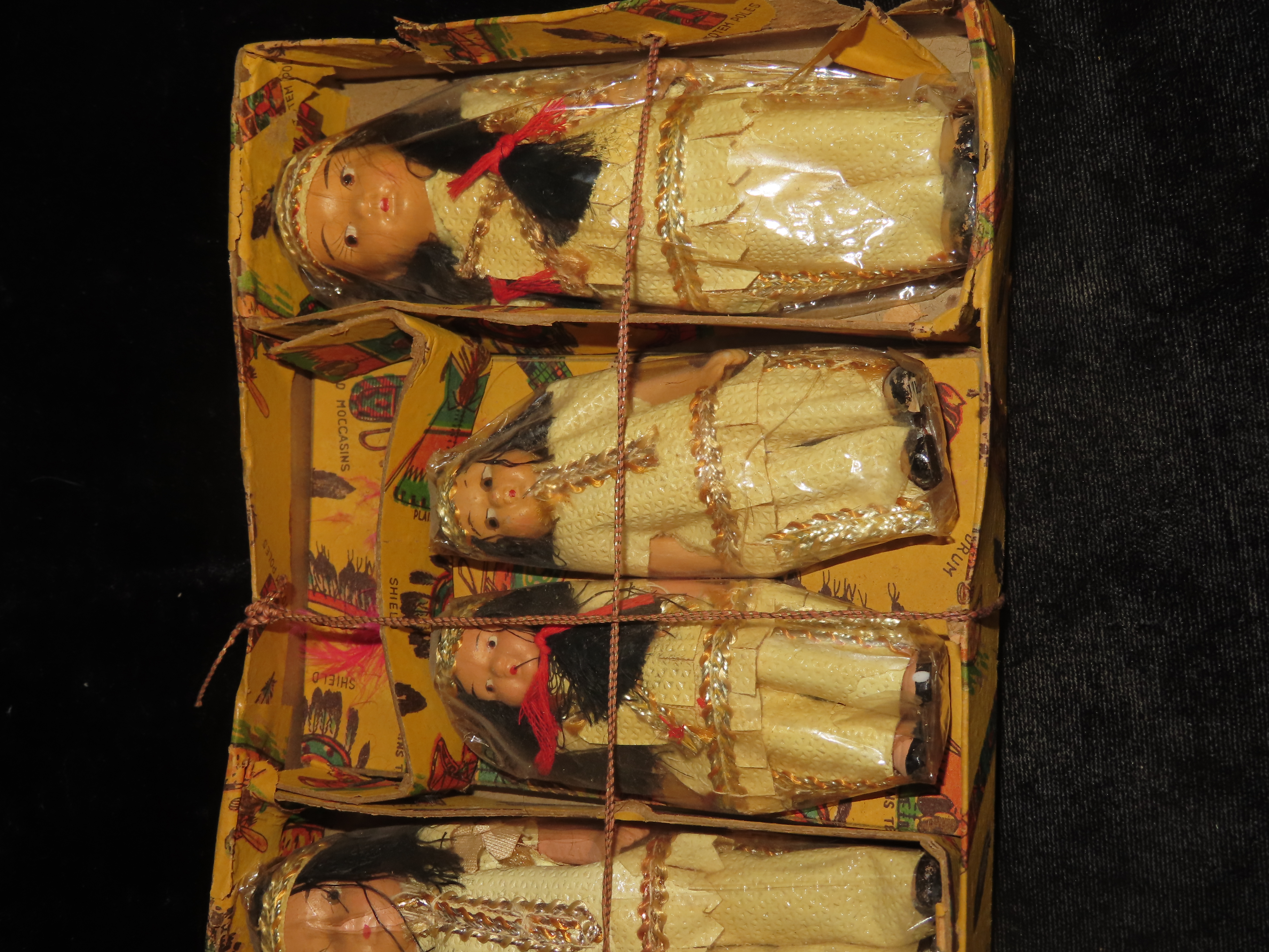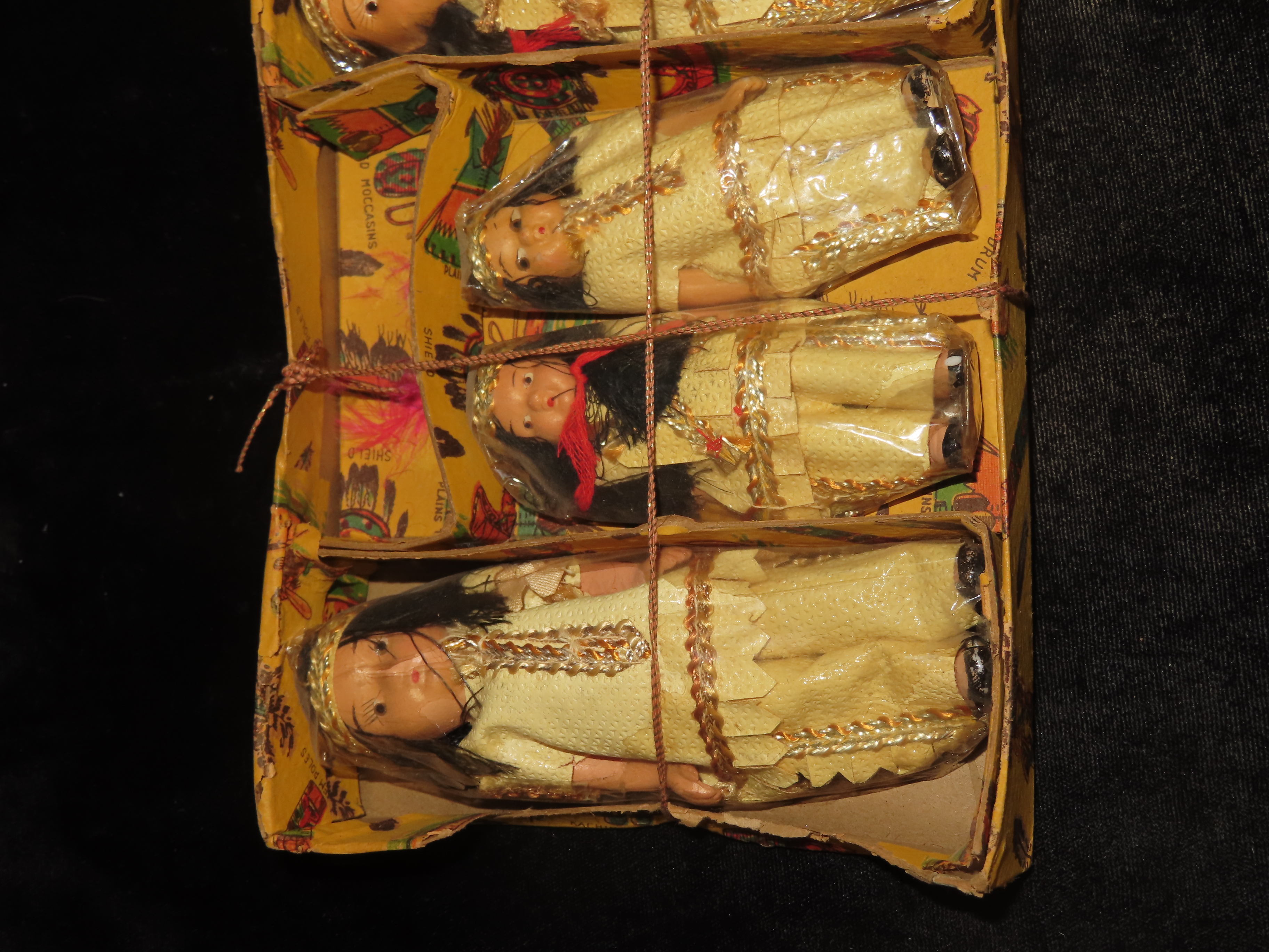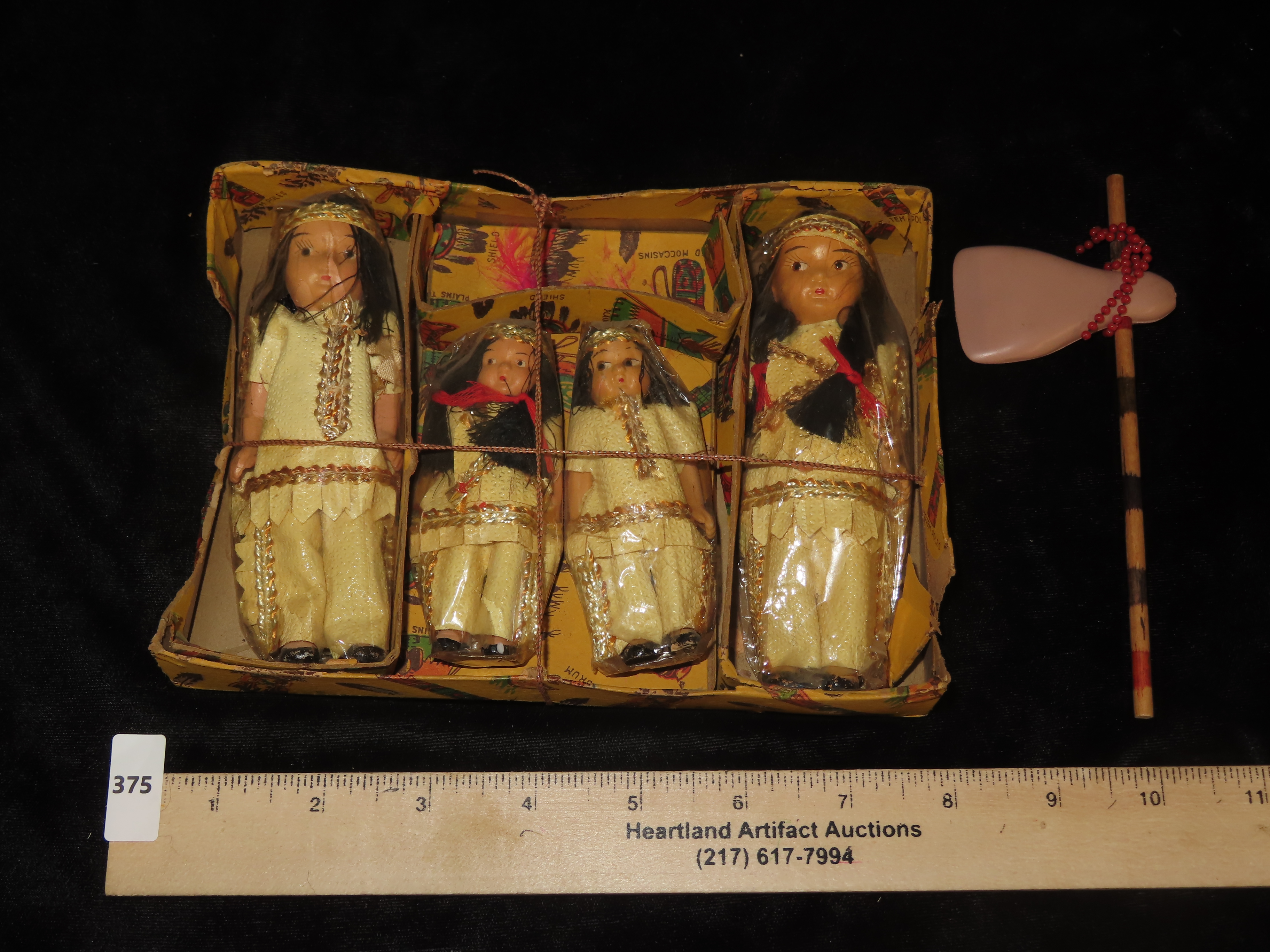 Vintage Ceramic Native American Souvenir Doll Set Japan in original box, Toy Tomahawk