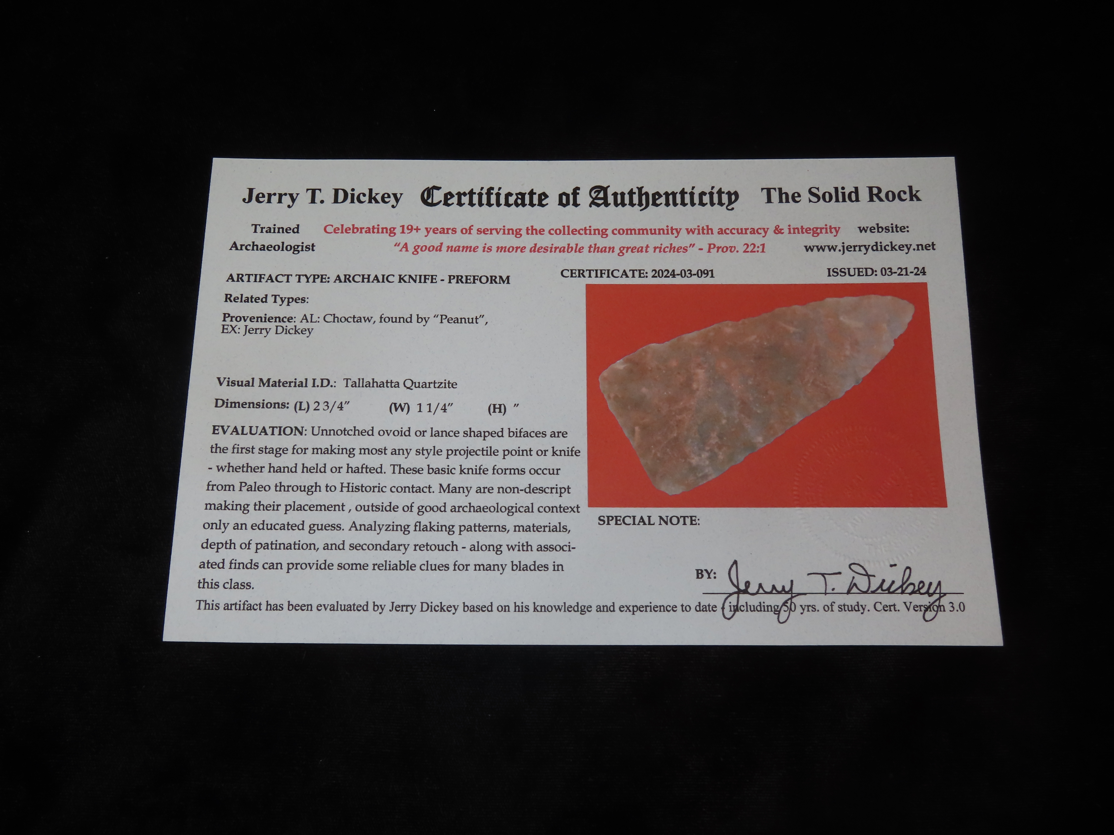 2 3/4″ Archaic Knite – Preform, Dickey COA, found by “Peanut” in Chocktaw Co., Alabama, Ex Jerry Dickey Collection