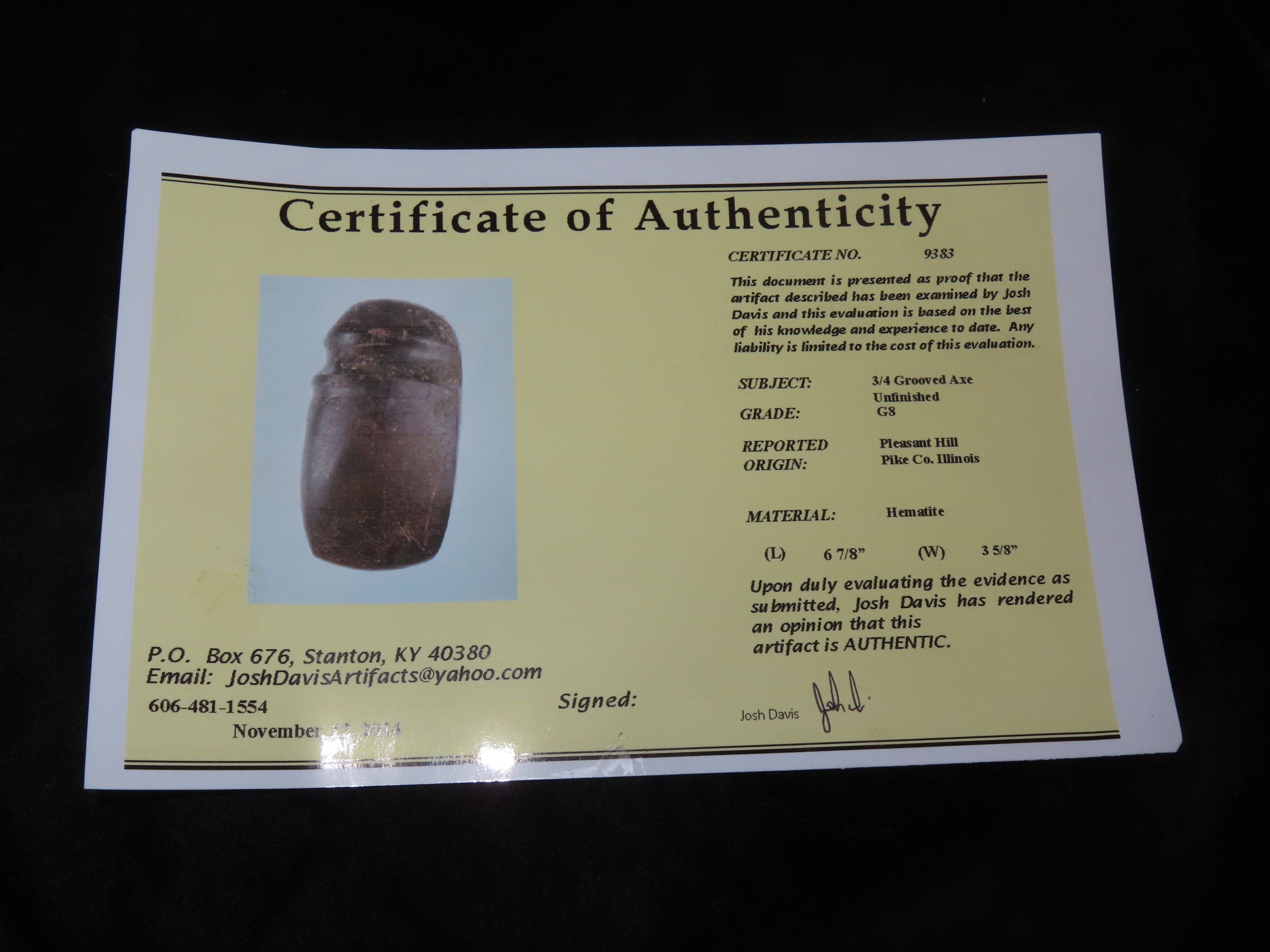 6 7/8″ Hematite 3/4 Groove Axe, Davis COA, found in Pike Co., Illinois near Pleasant Hil