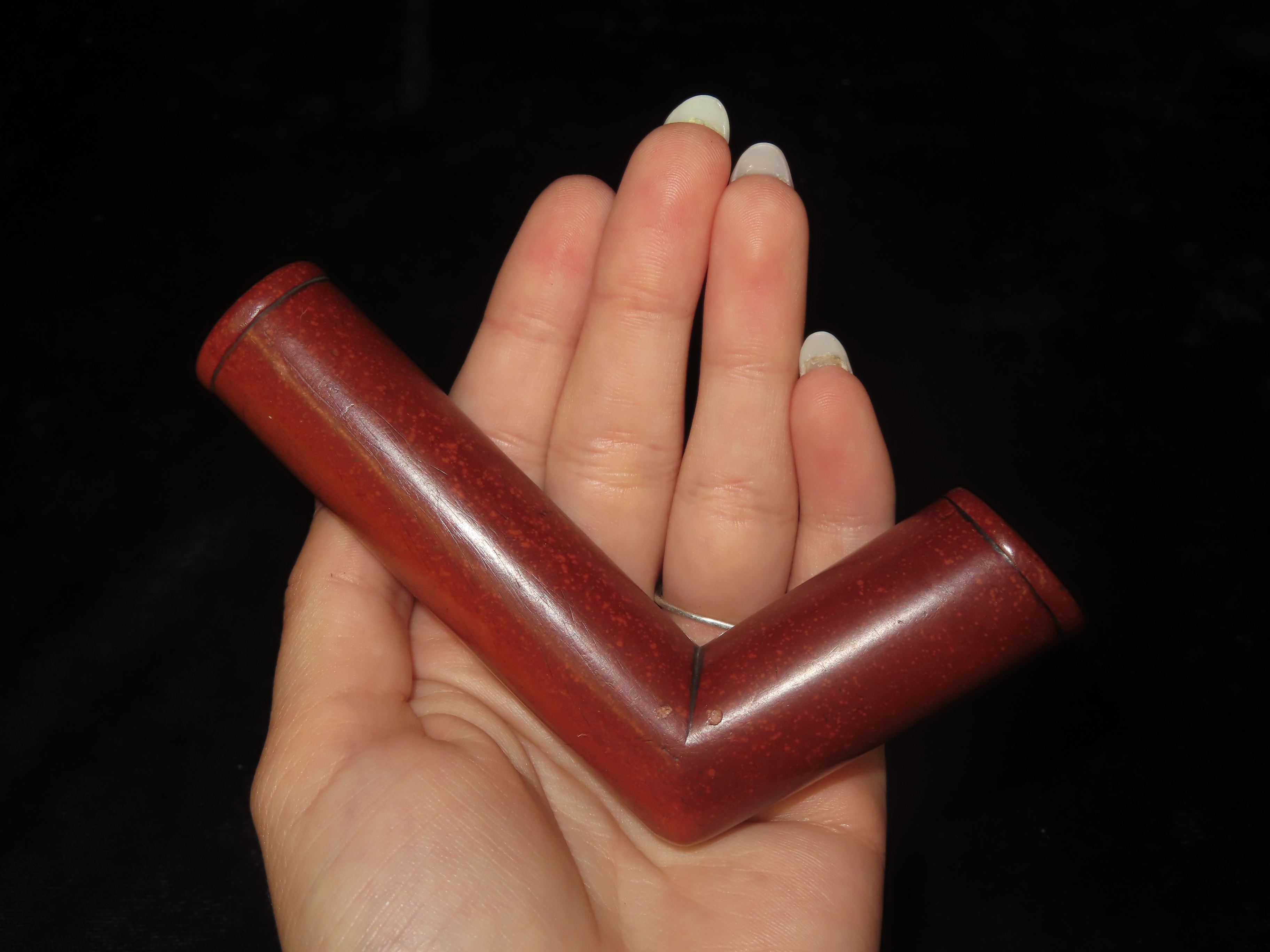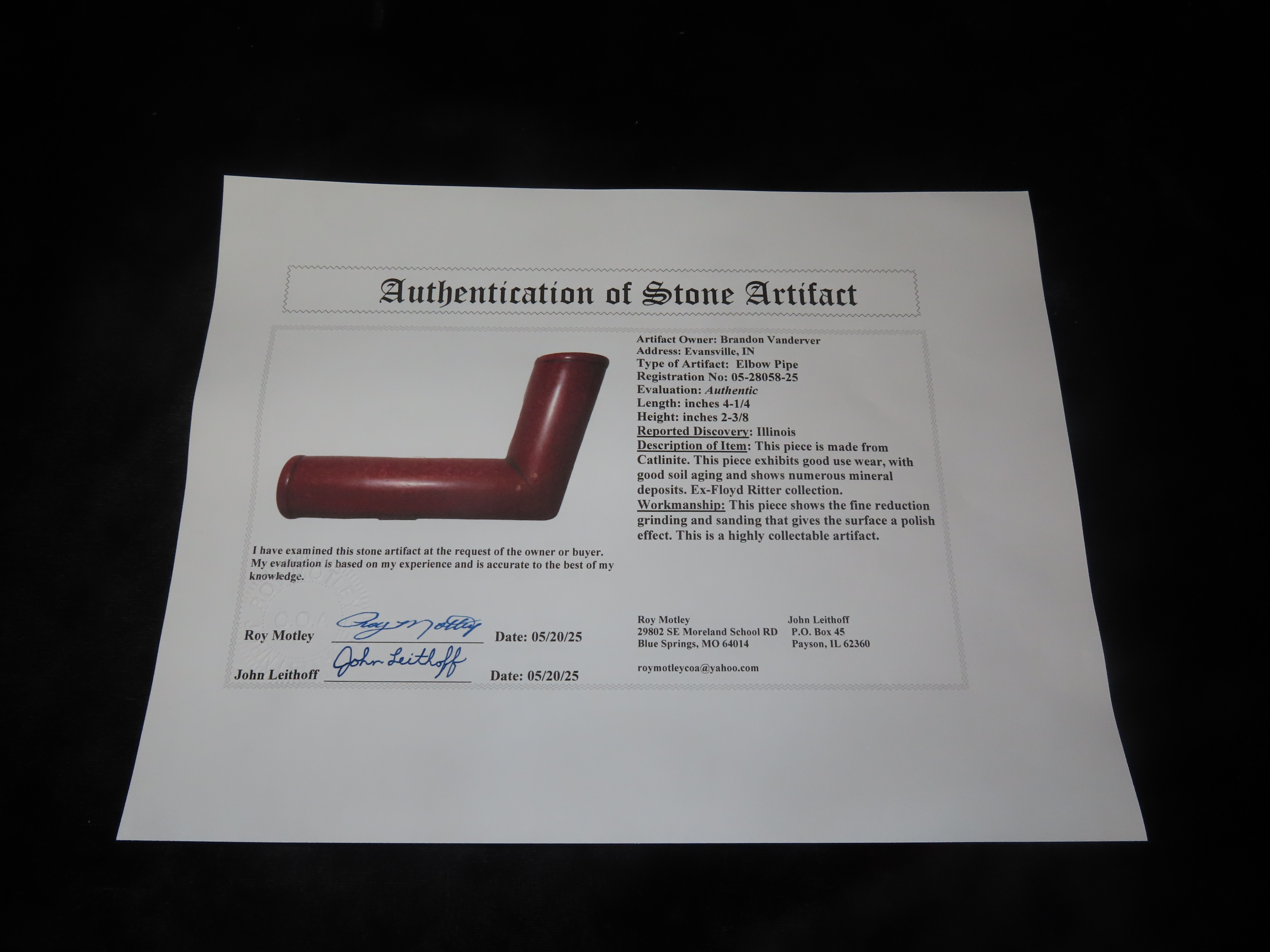 Incredible Catlinite Elbow Pipe, Illinois, Motley COA, Ex Floyd Ritter, Ex Brandon Vanderver. Amazing High Grade Example with super form and outstanding Polish