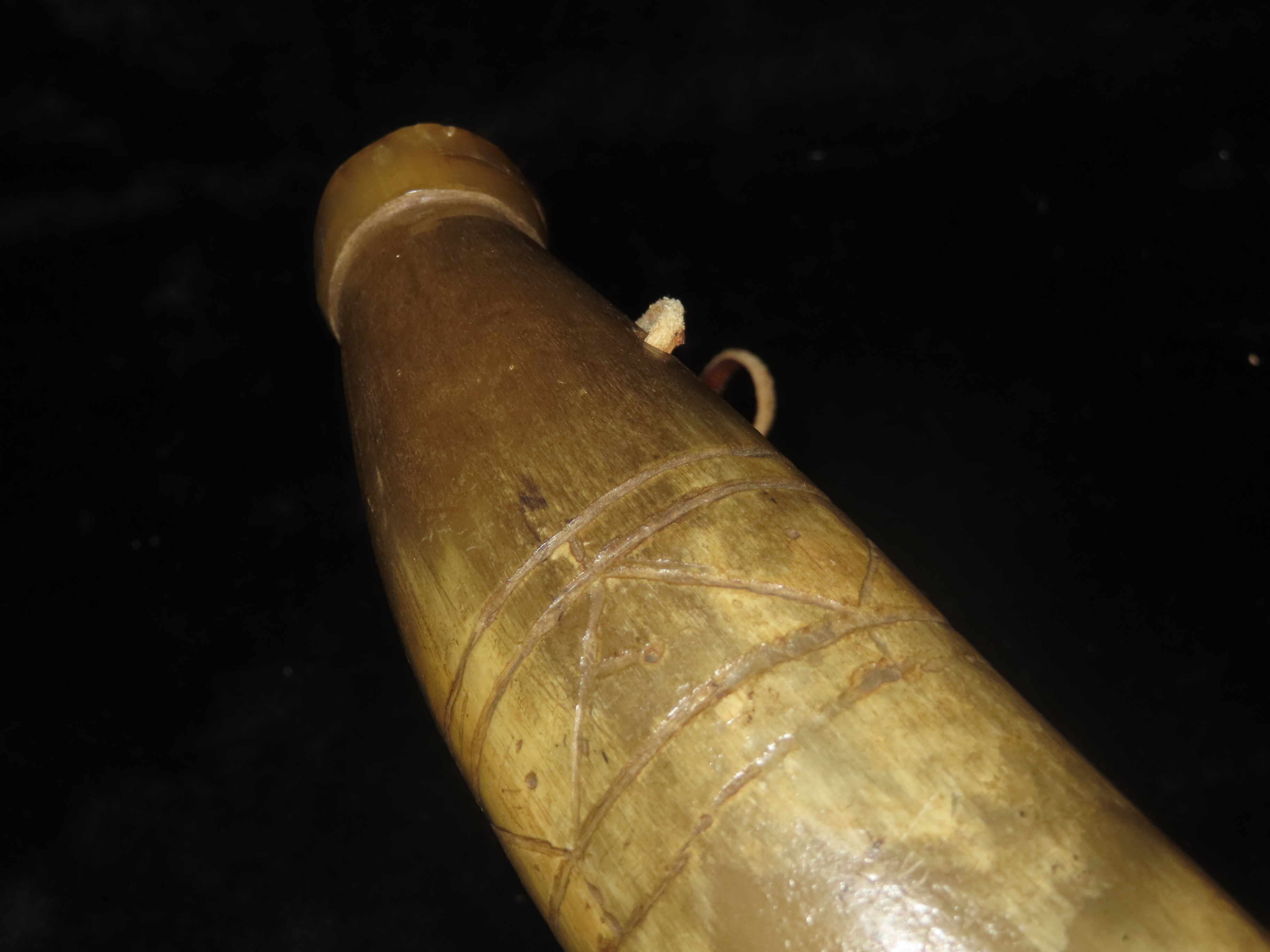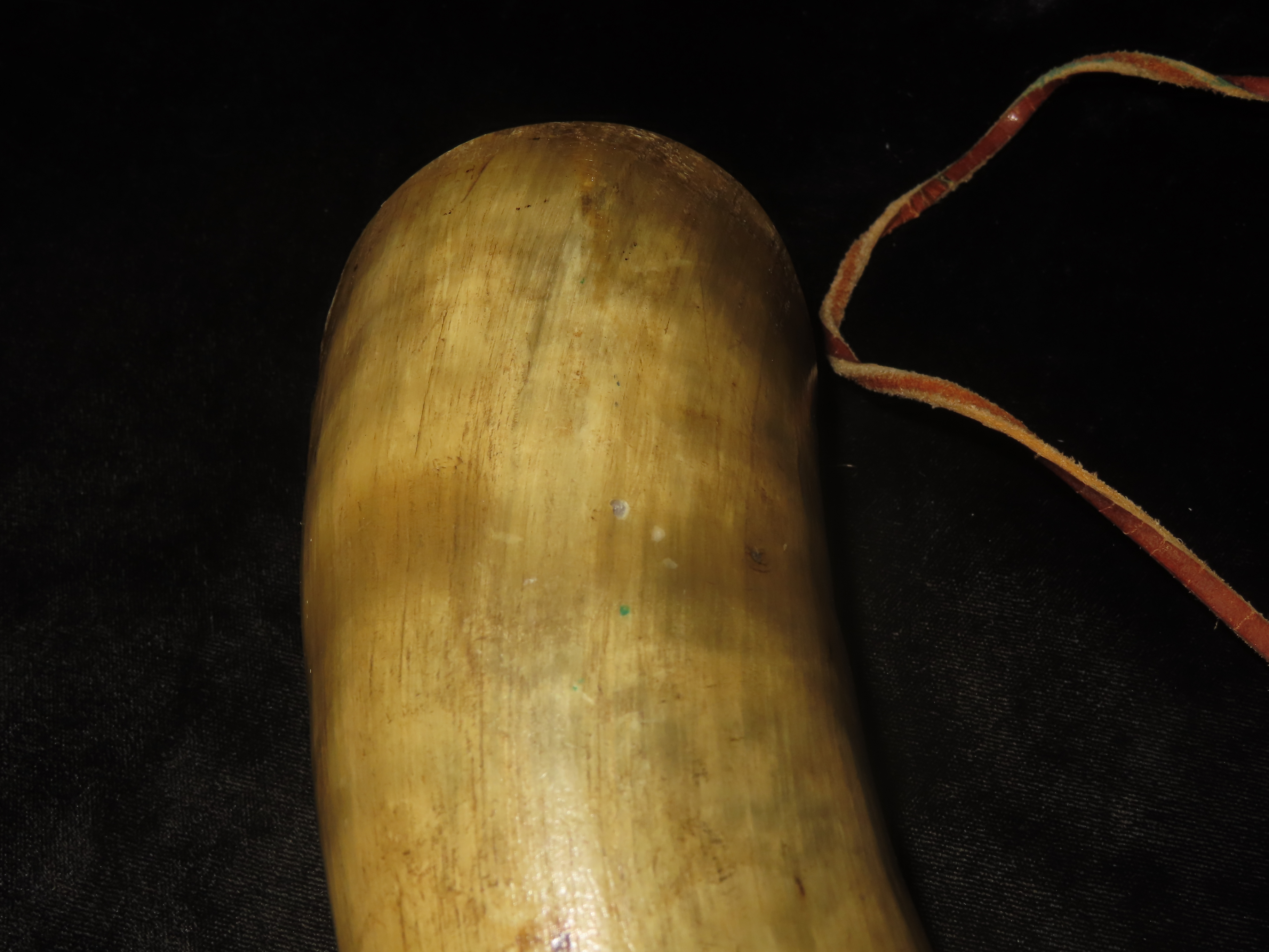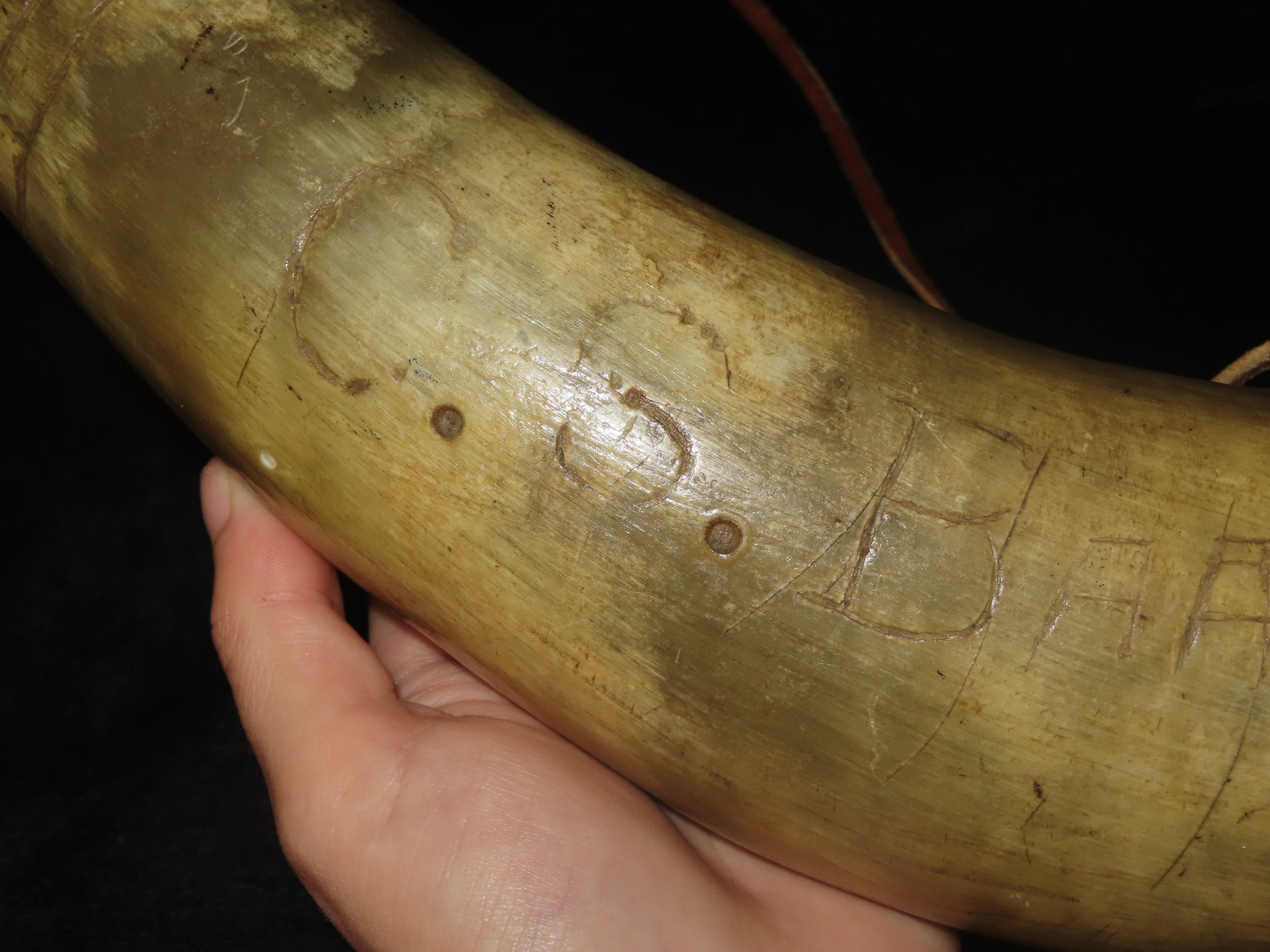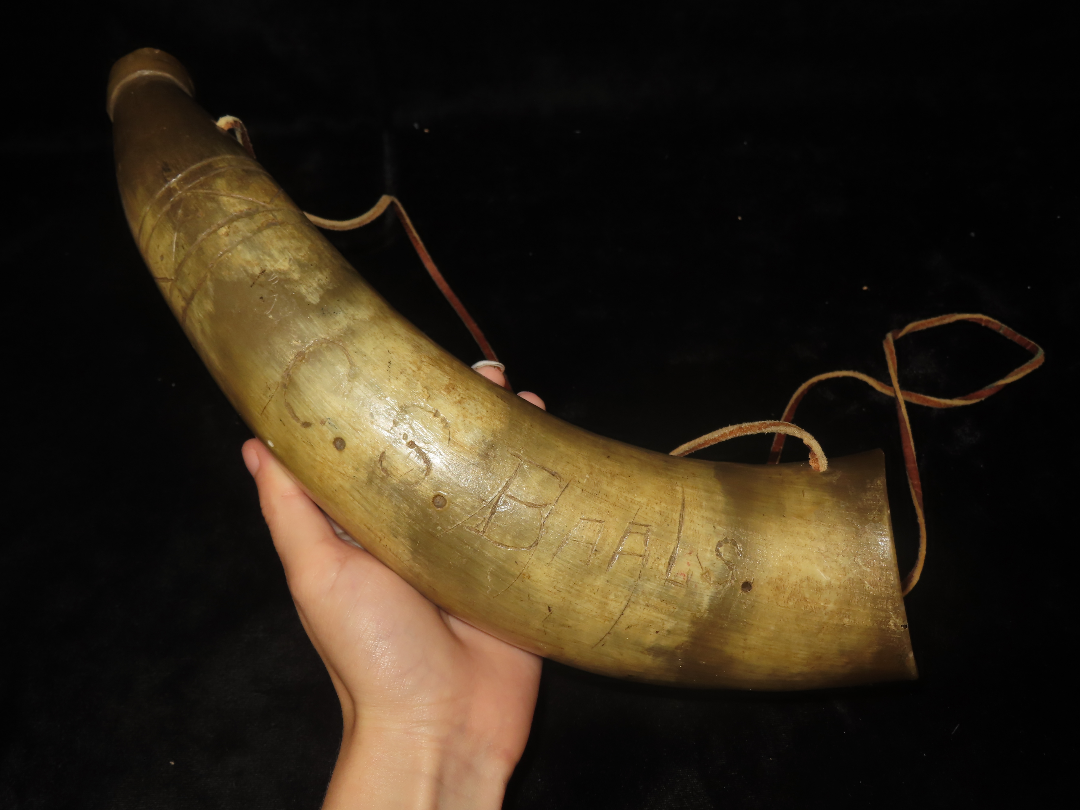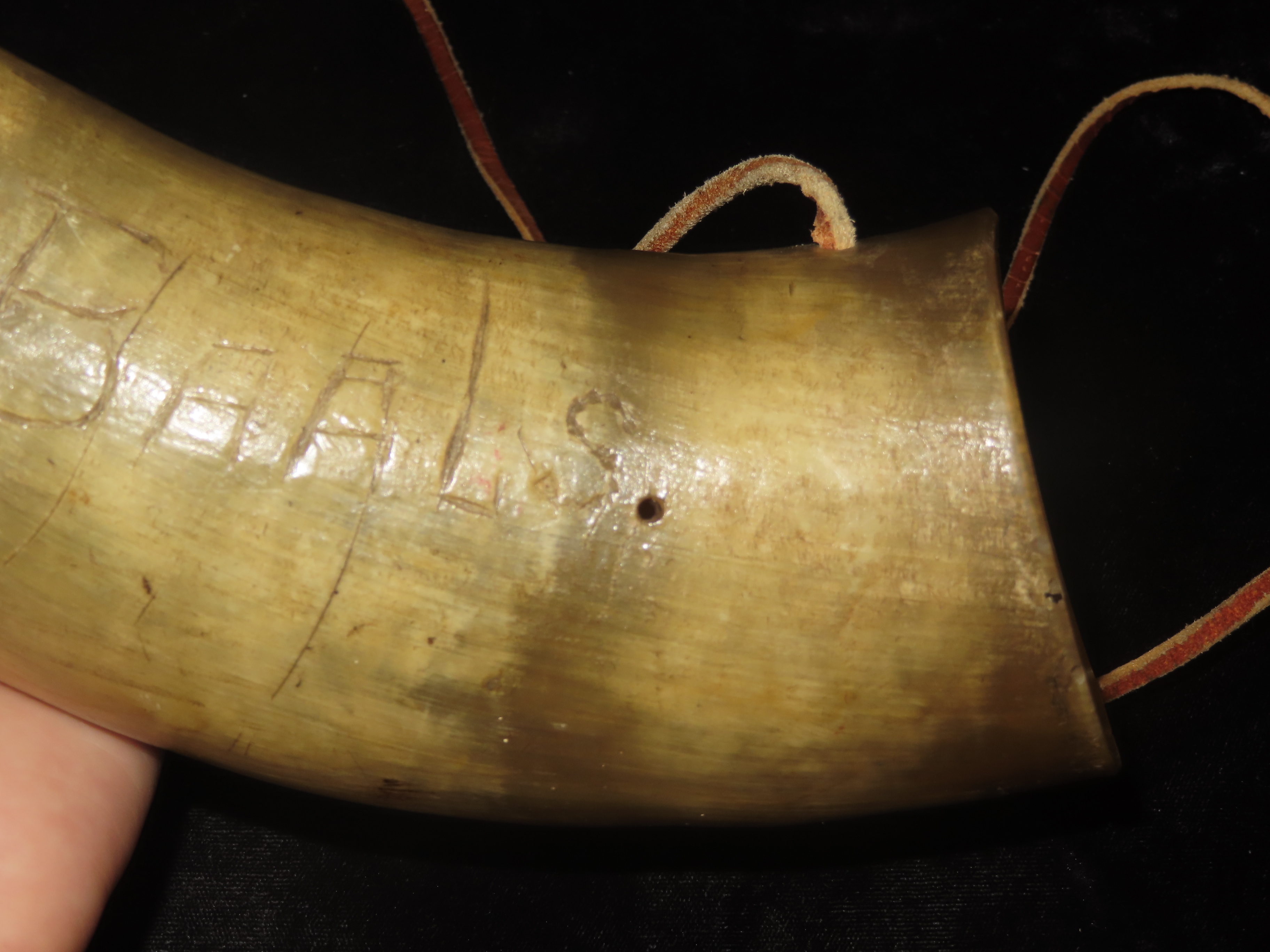 Large Engraved Civil War Confederate Era Powder Horn Flask, Engraved “C.S. BAALS.” Not sure if the C.S. stands for Confederate States or an Abbreviation of a Name. Also Has some Engraved Design Carved Around the End. Nice Original Example with Great Afe & Use Wear.