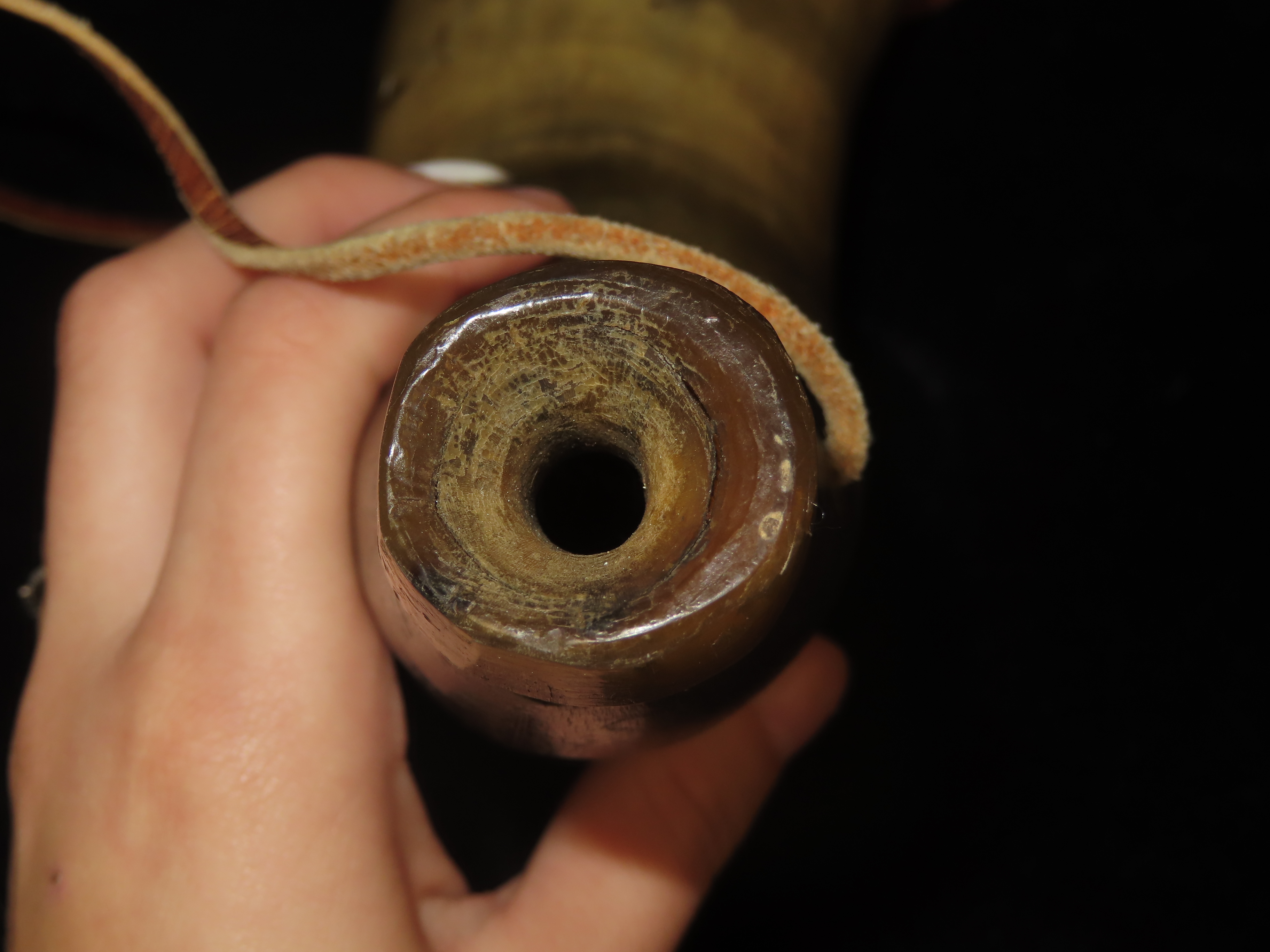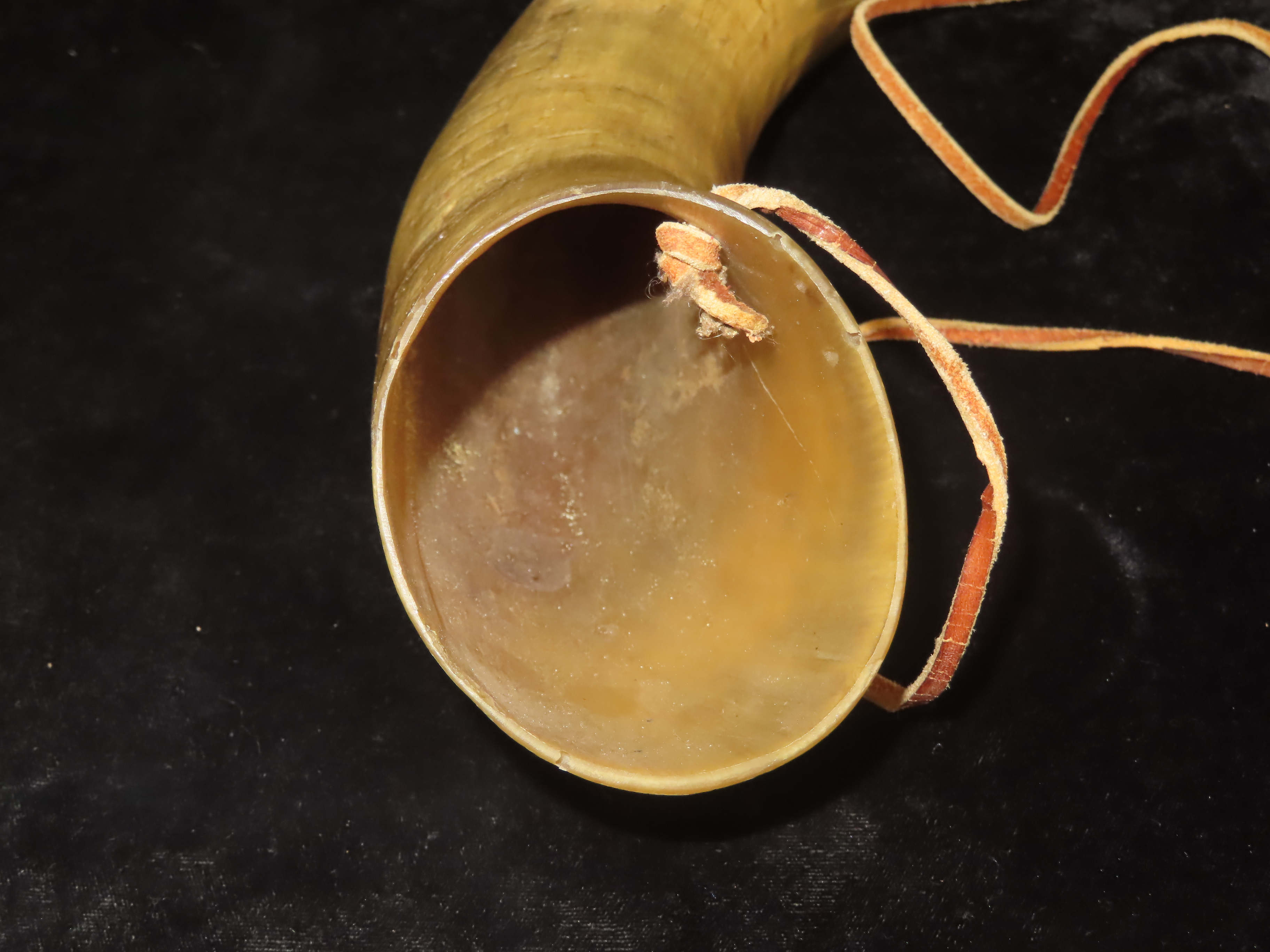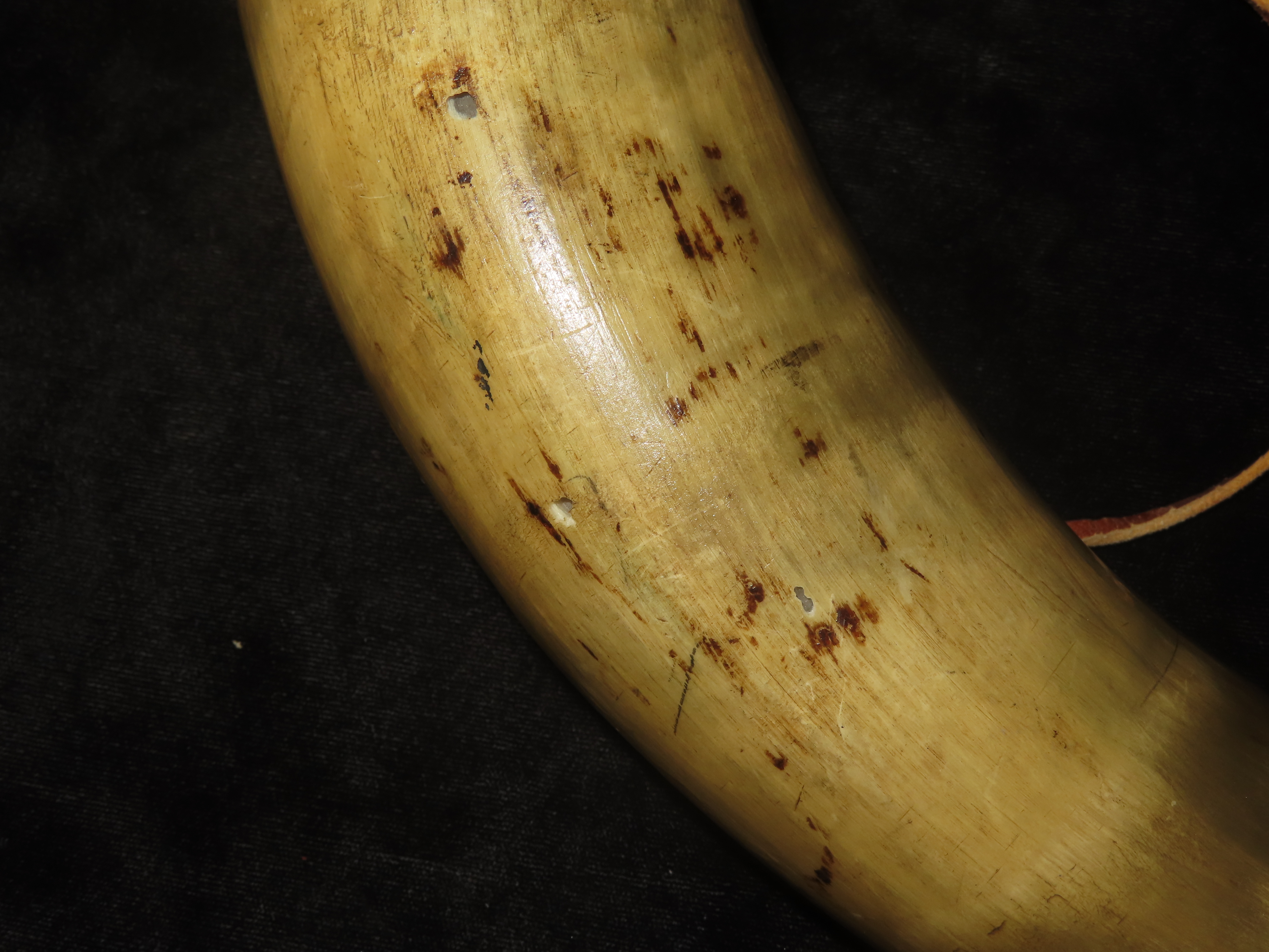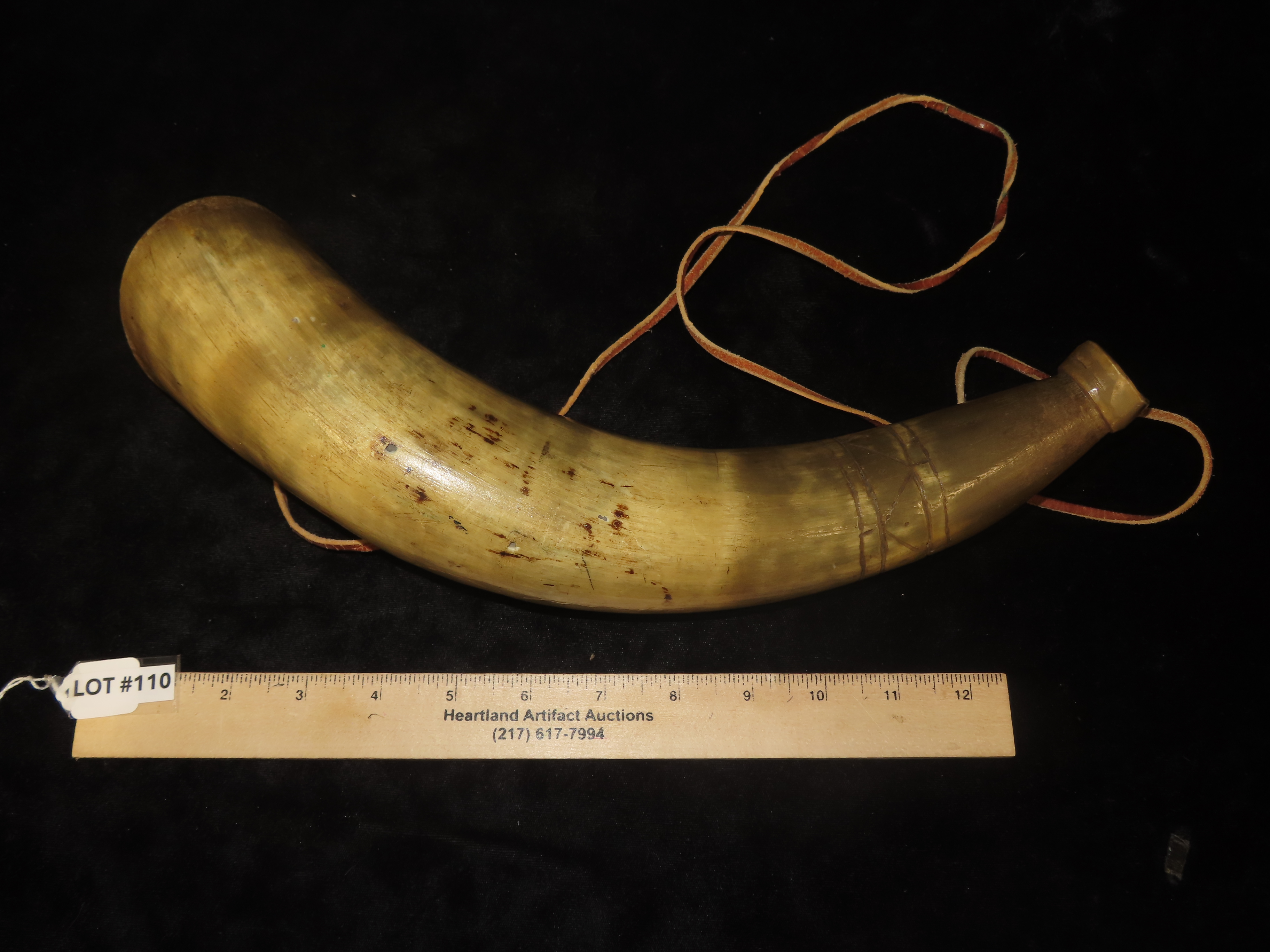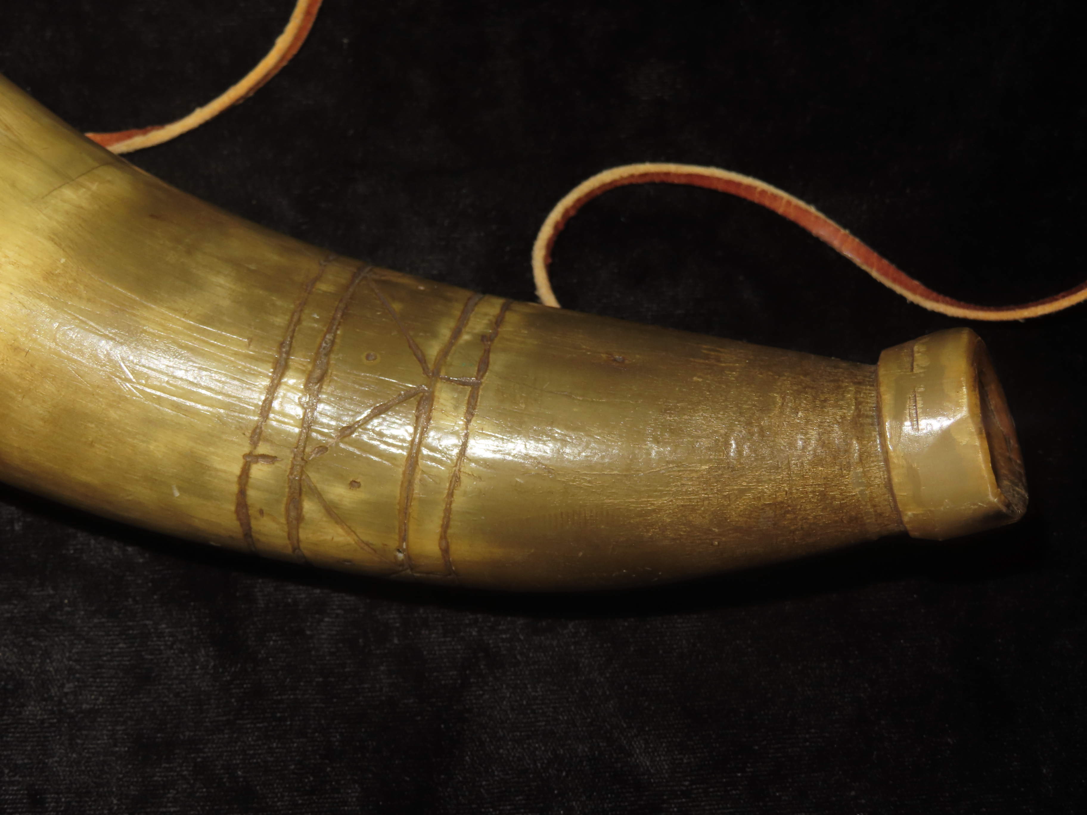 Large Engraved Civil War Confederate Era Powder Horn Flask, Engraved “C.S. BAALS.” Not sure if the C.S. stands for Confederate States or an Abbreviation of a Name. Also Has some Engraved Design Carved Around the End. Nice Original Example with Great Afe & Use Wear.