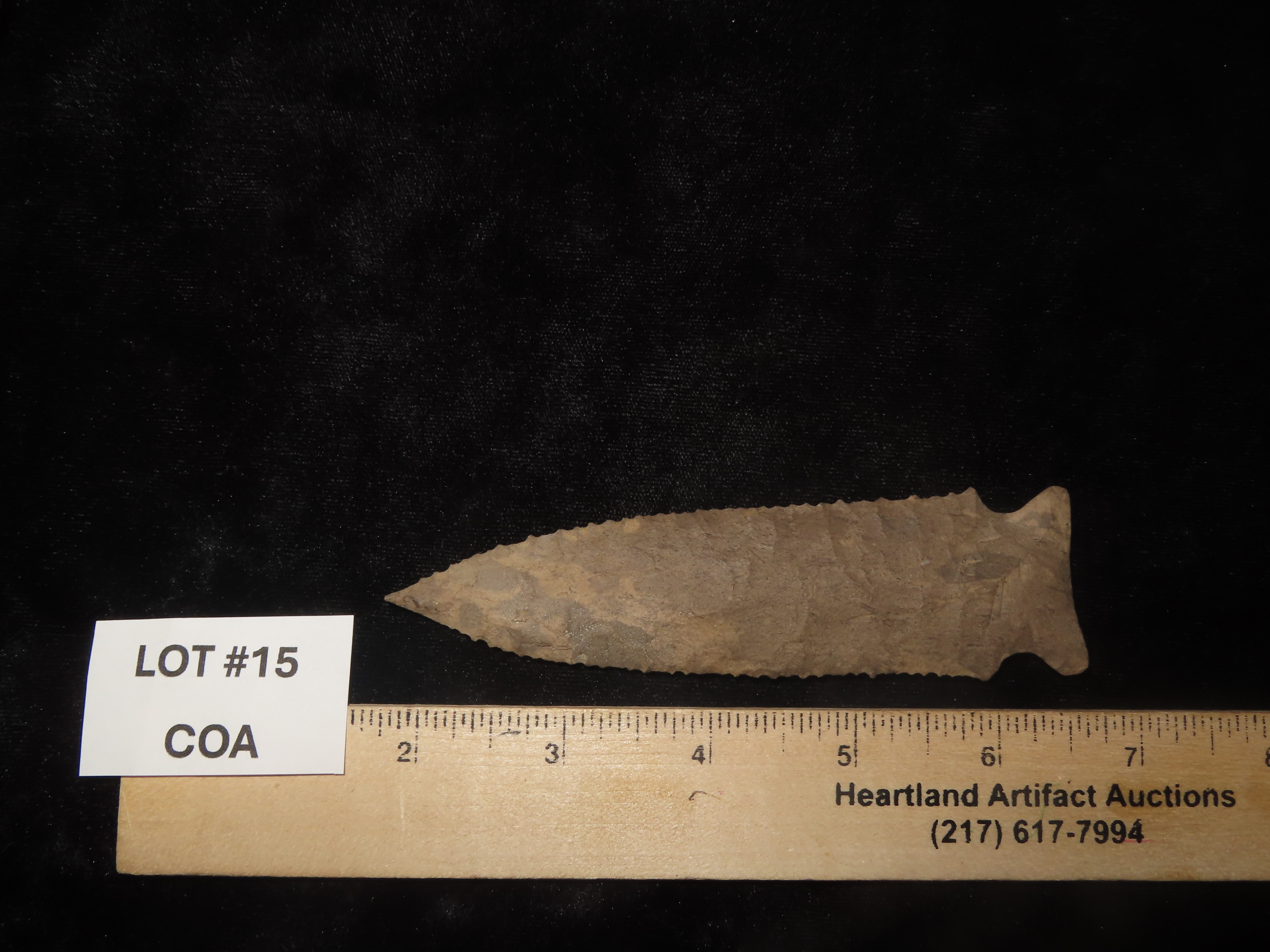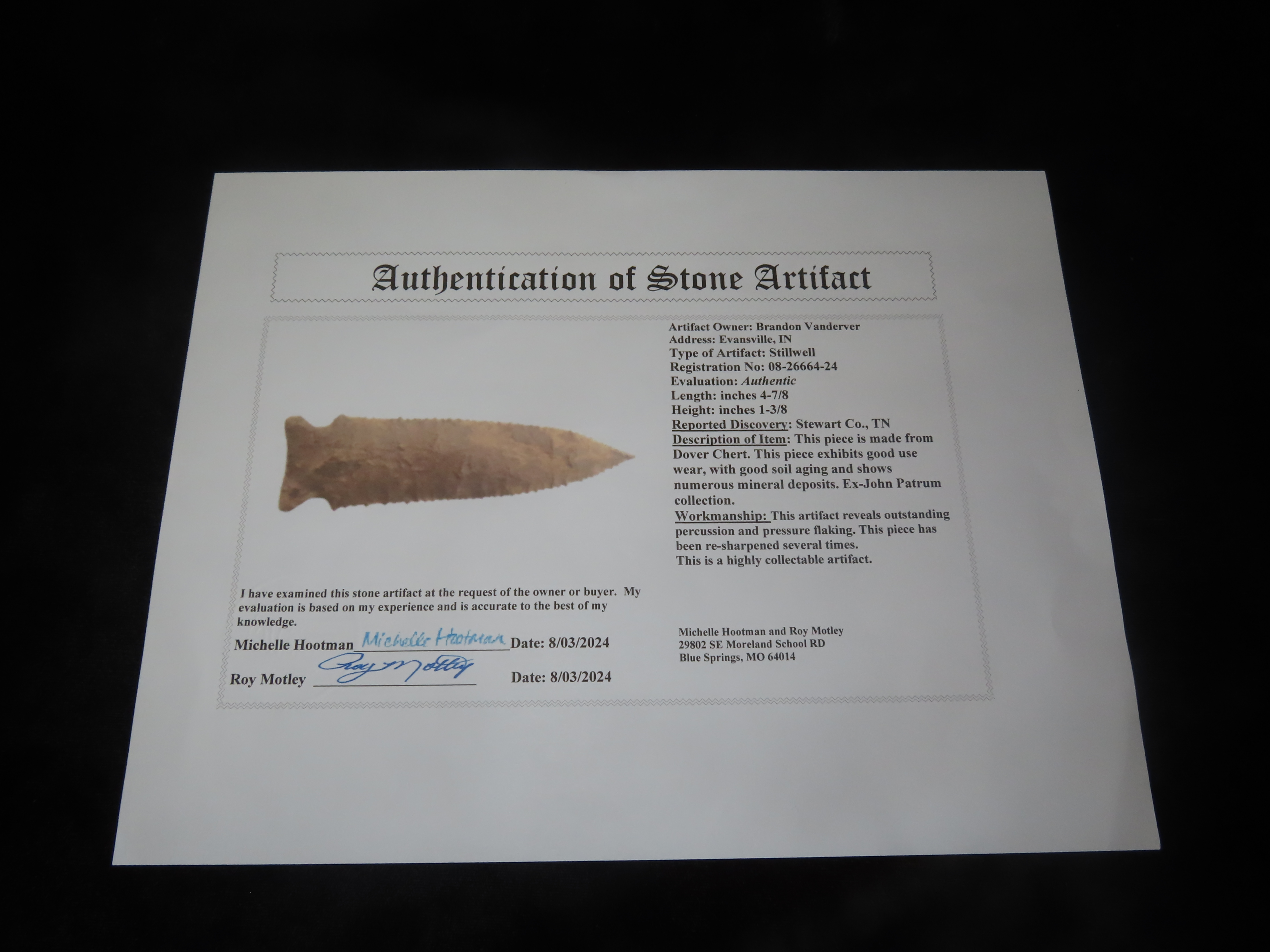 Outstanding 4 7/8″ Stillwell, Stewart Co,. Tennessee, Motley COA, Impeccable flaking, Needle Tip, Just an Amazing Example. Ex John Patrum Collection.
