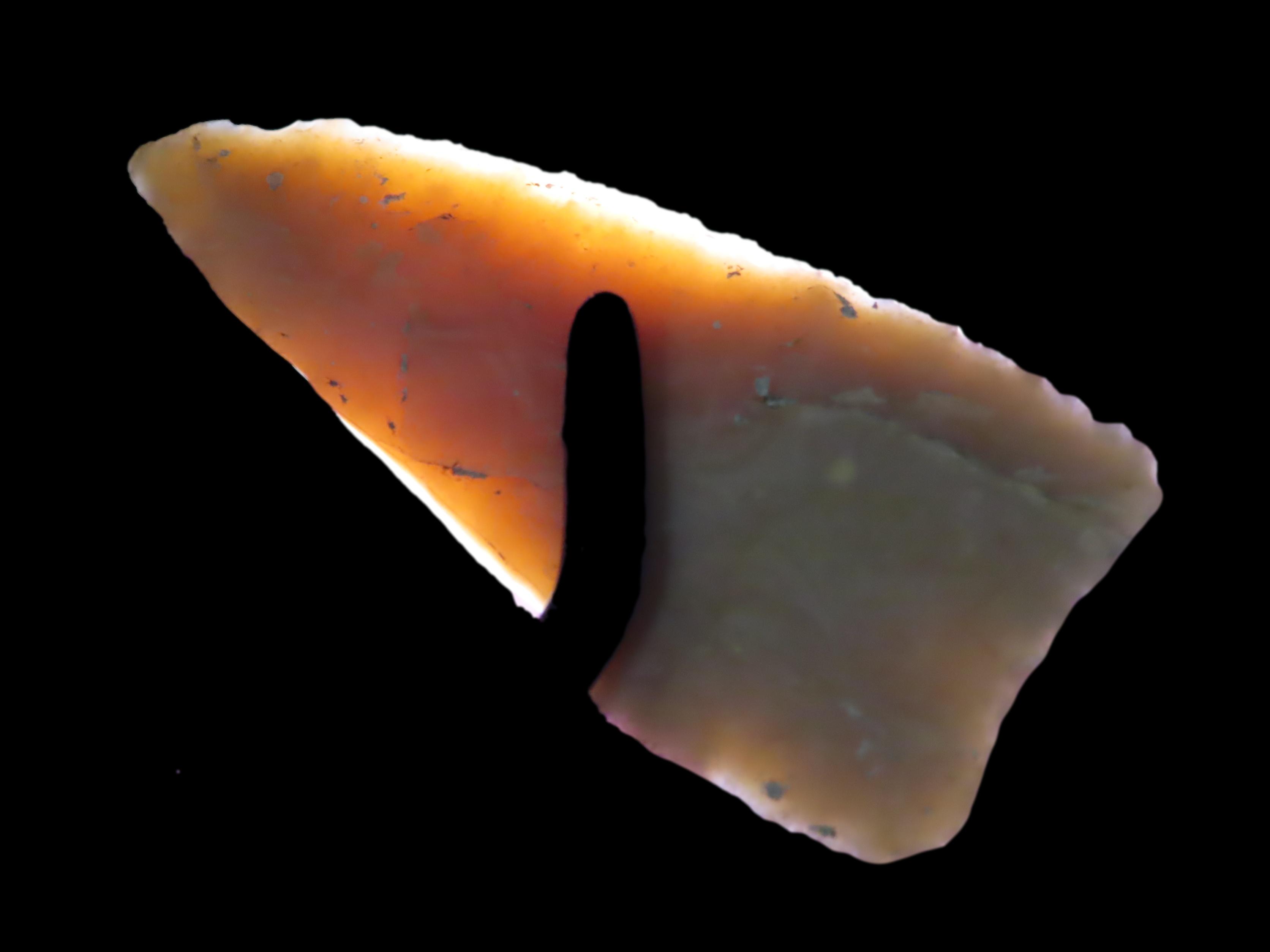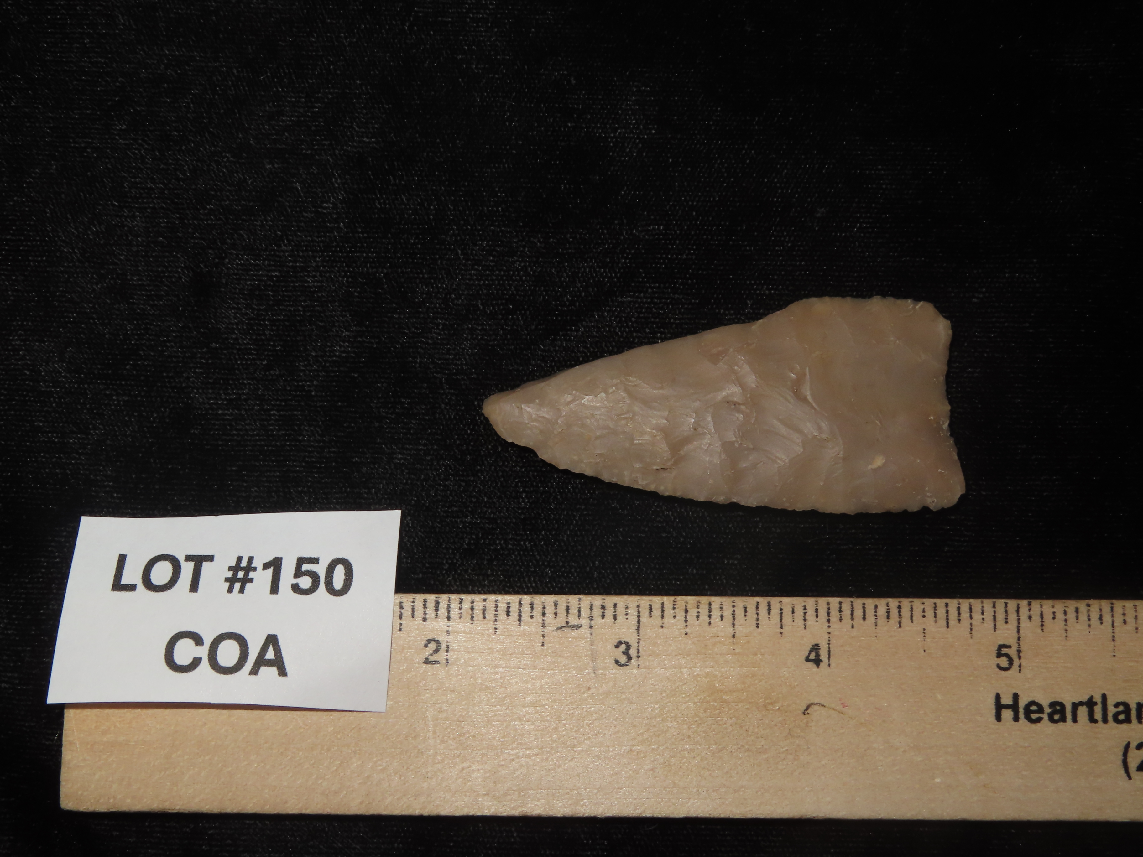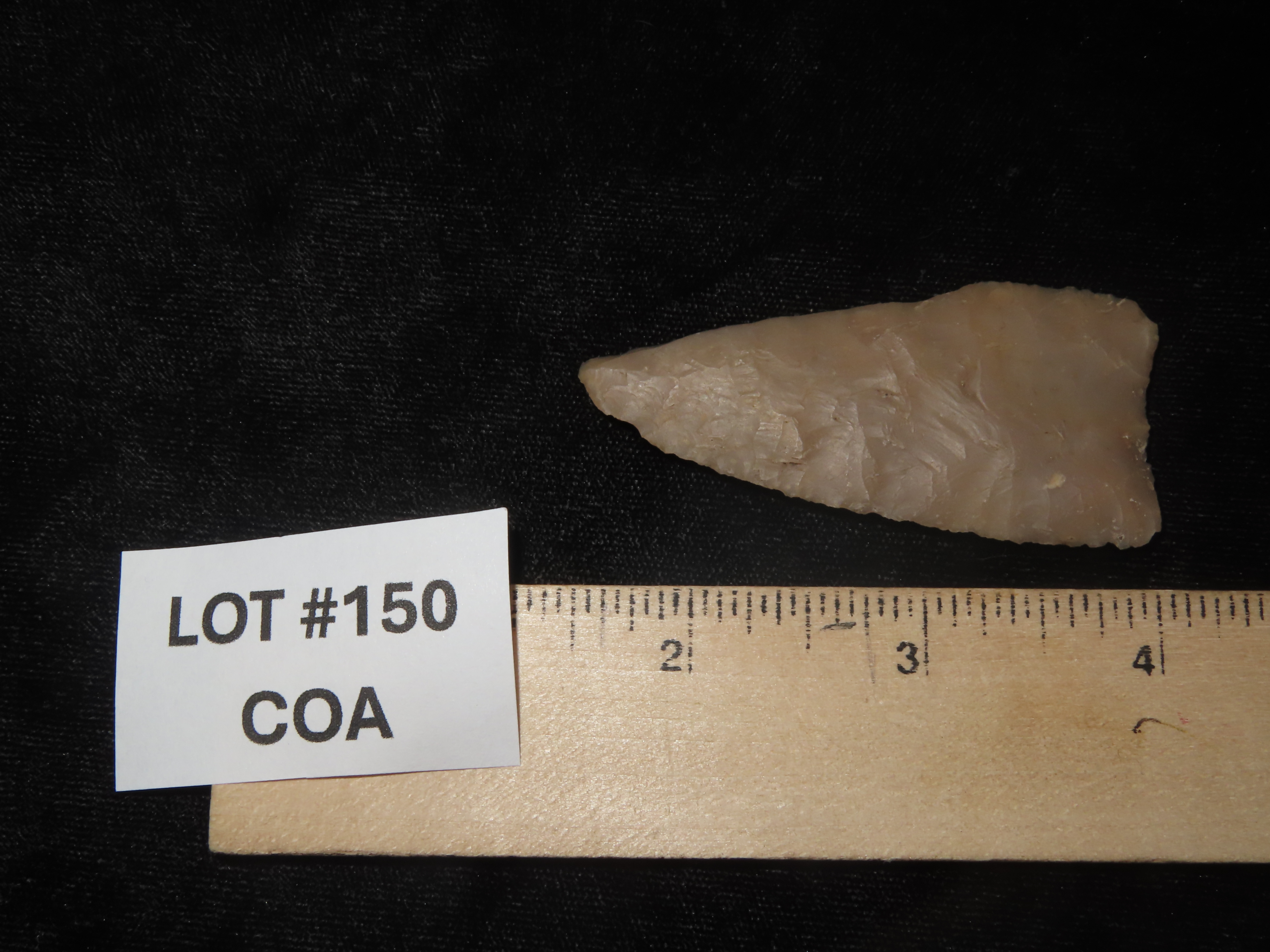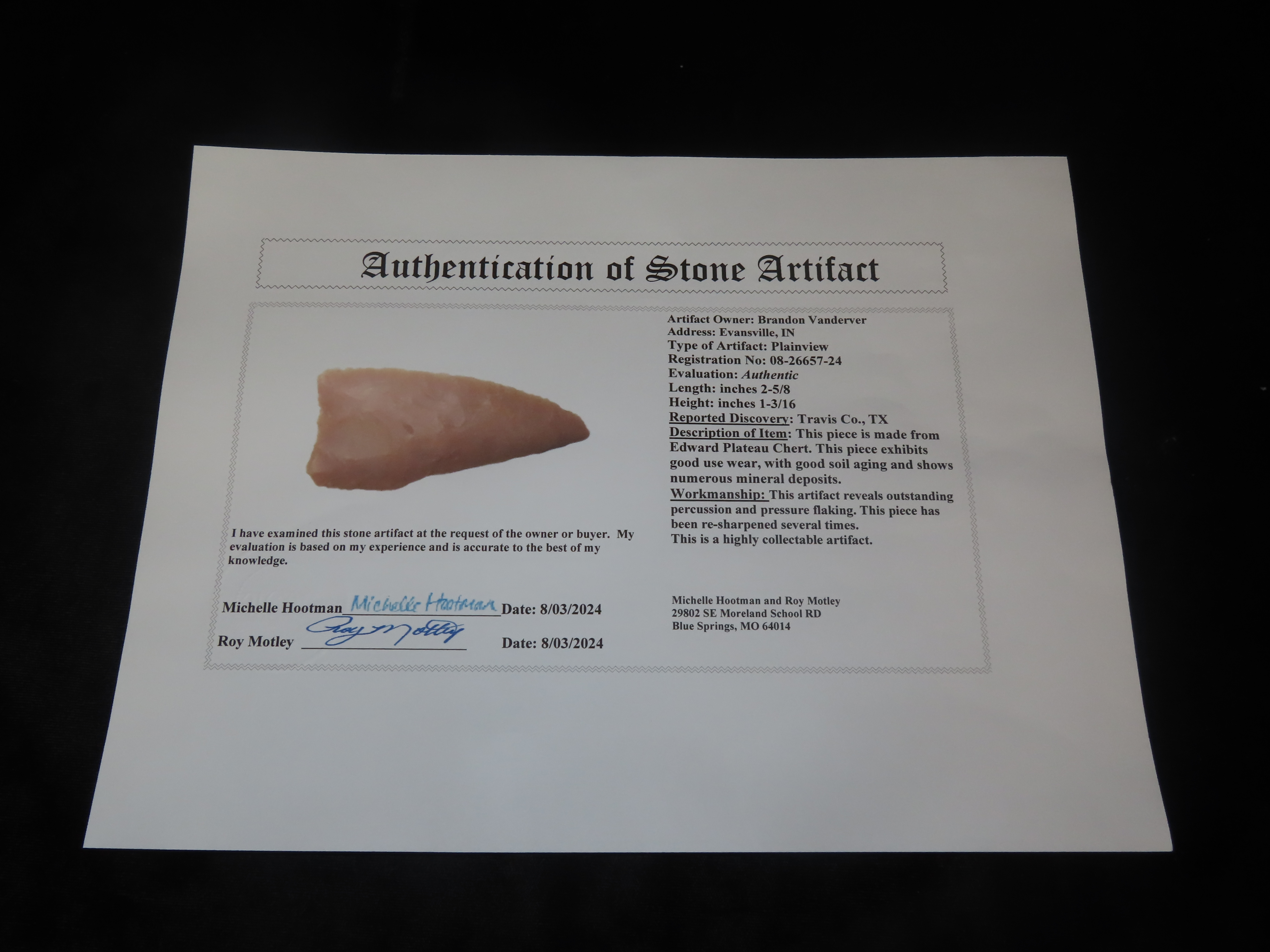 2 5/8″ Plainview, Travis County Texas, Motley COA. Highly Translucent Example, Very thin with Exceptional Flaking, Has an old Evenly Patinated Twist Fracture on One Blade Edge.