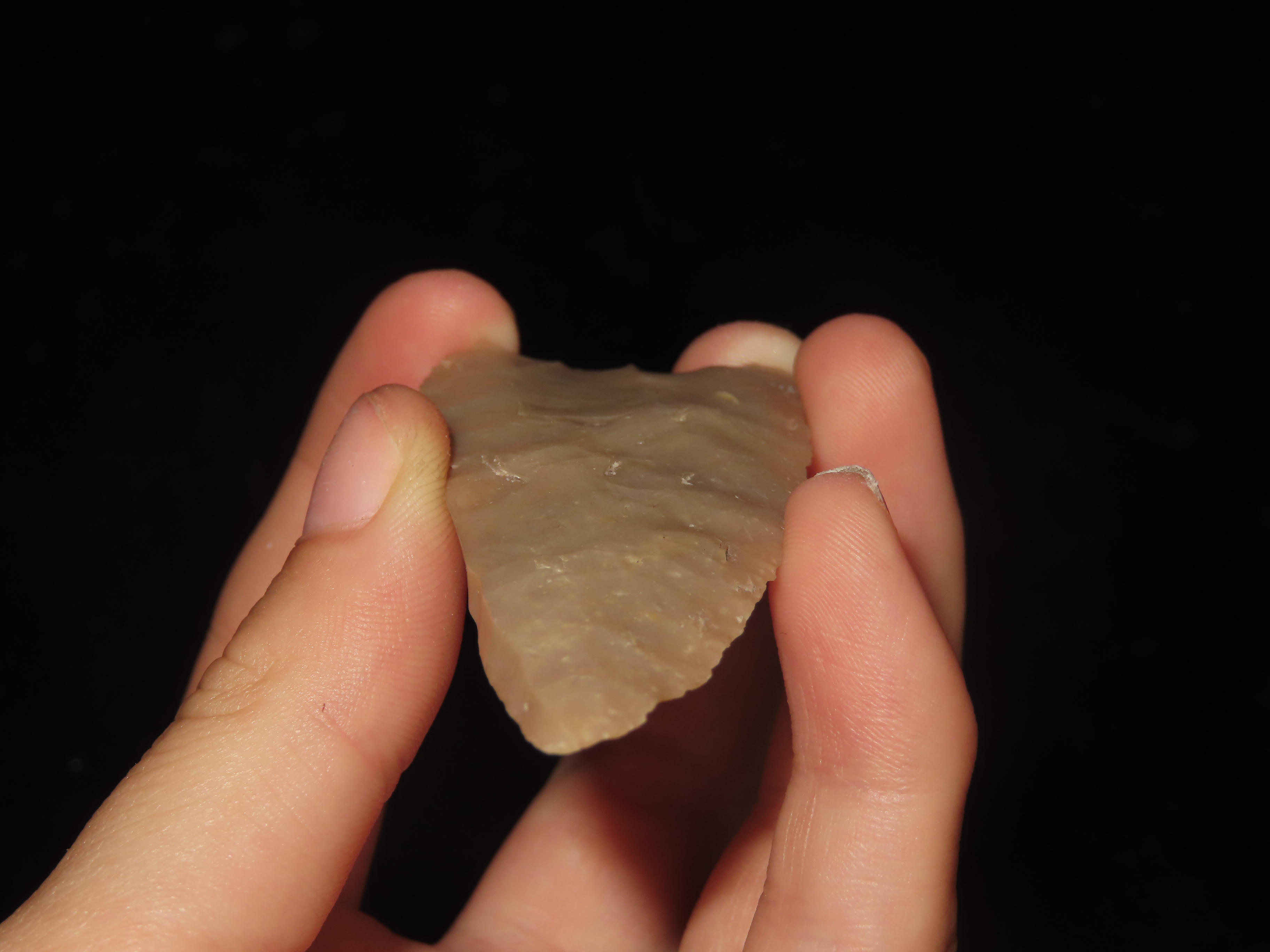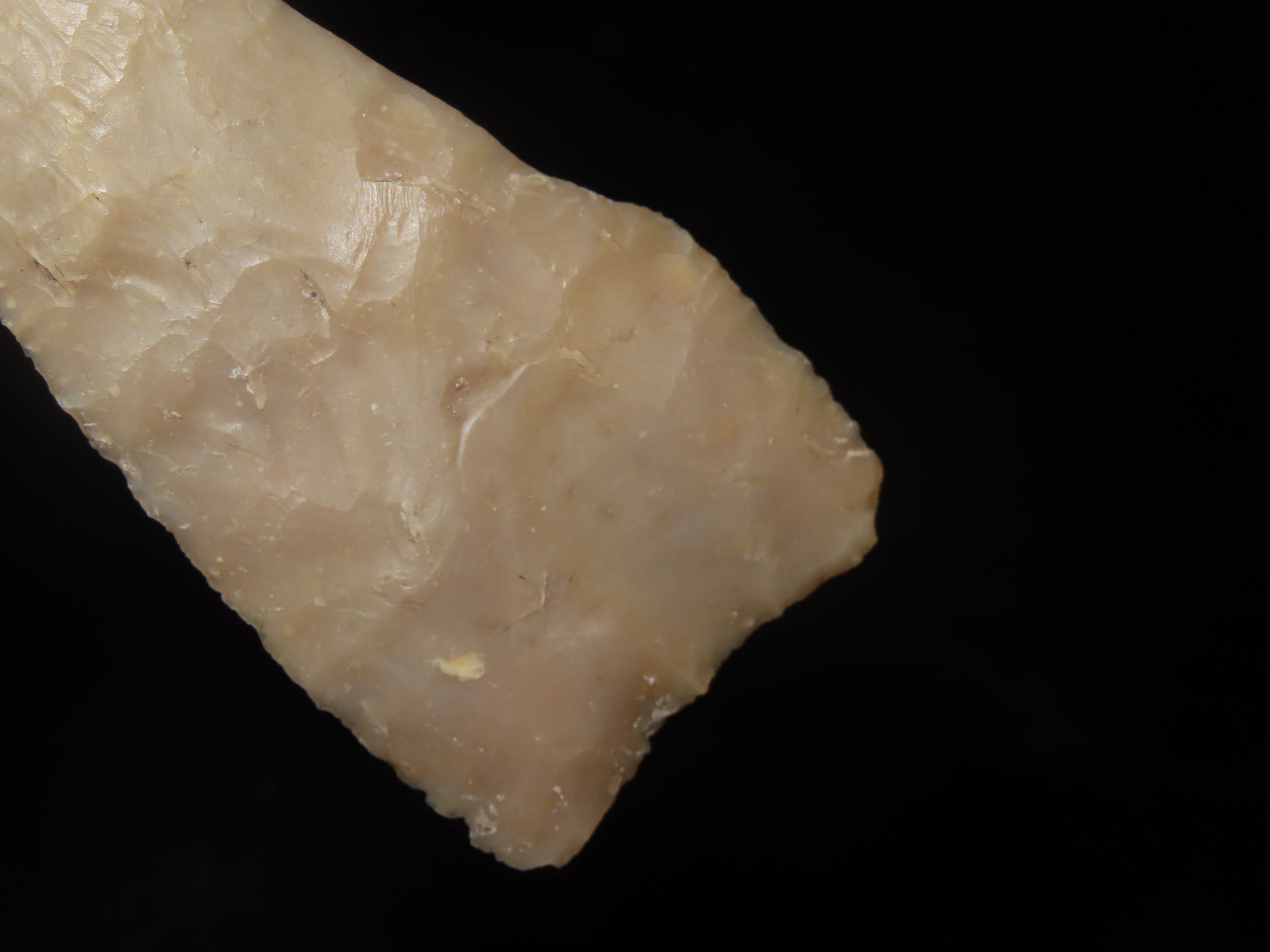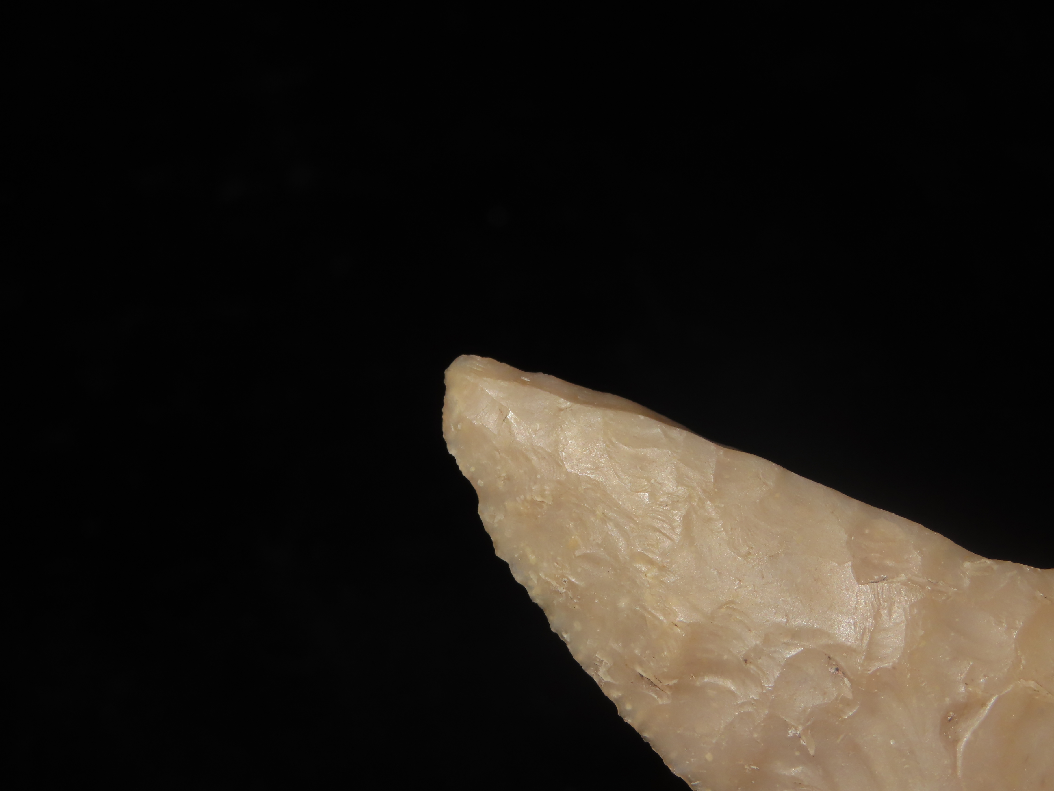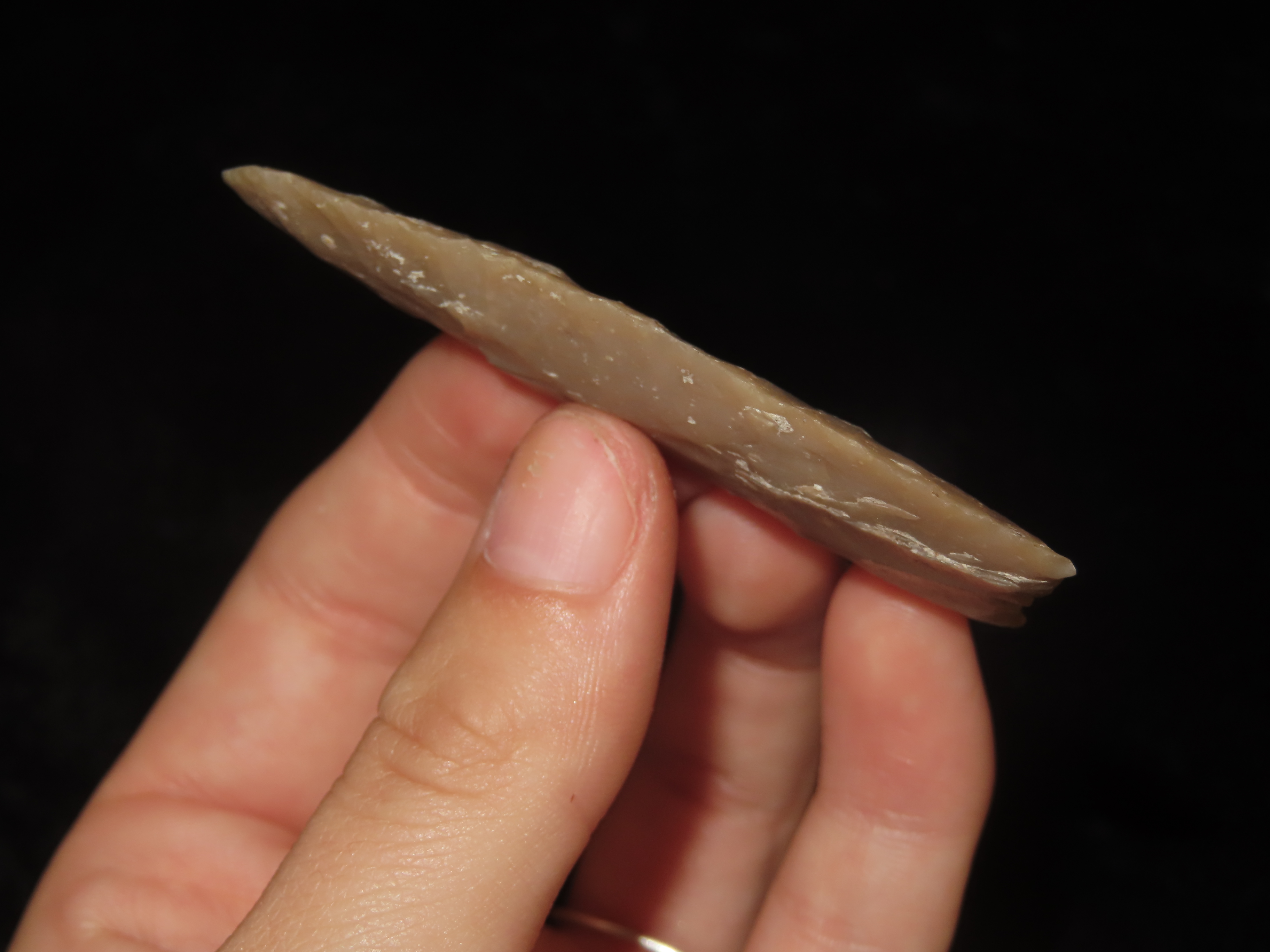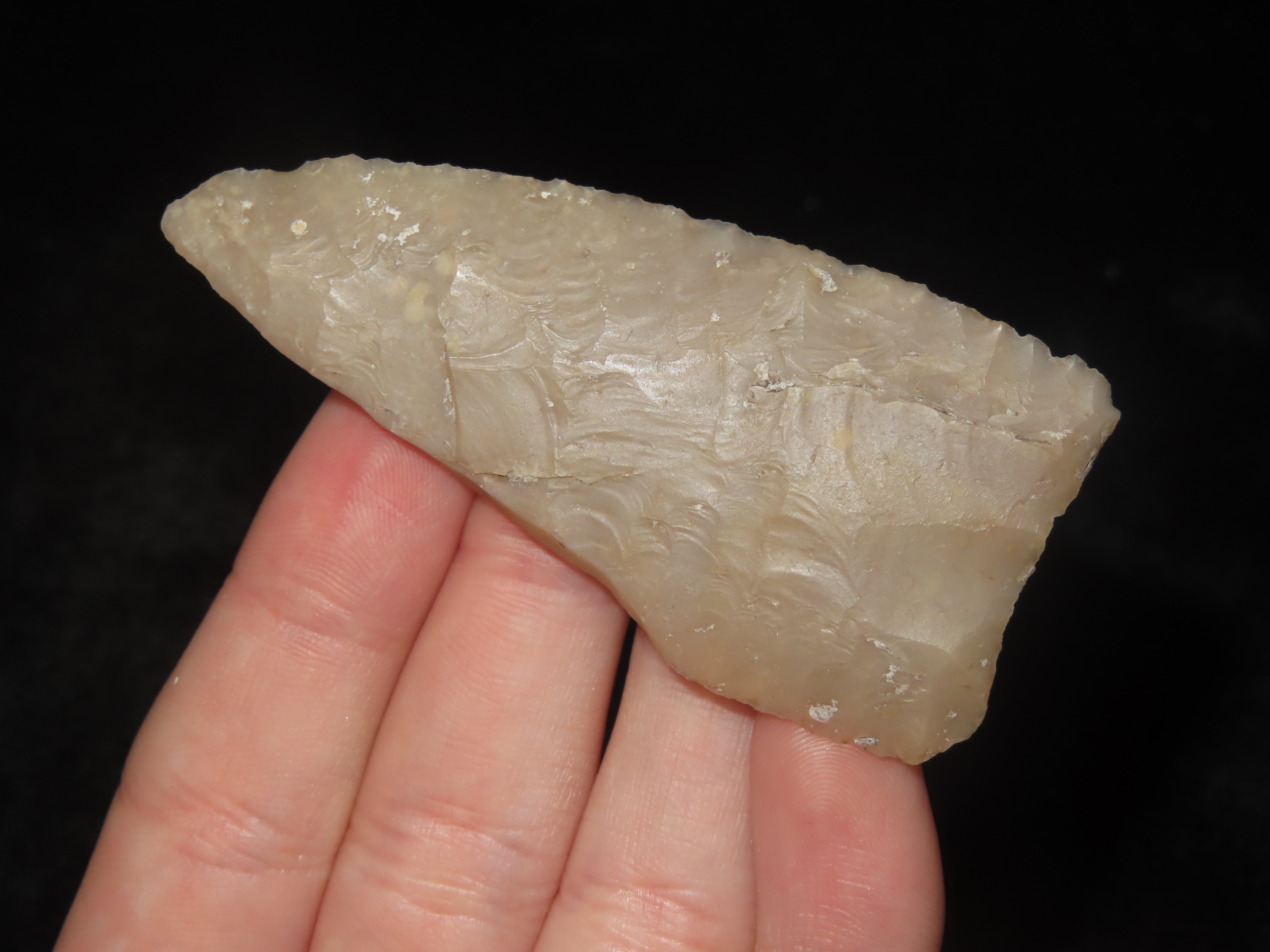 2 5/8″ Plainview, Travis County Texas, Motley COA. Highly Translucent Example, Very thin with Exceptional Flaking, Has an old Evenly Patinated Twist Fracture on One Blade Edge.