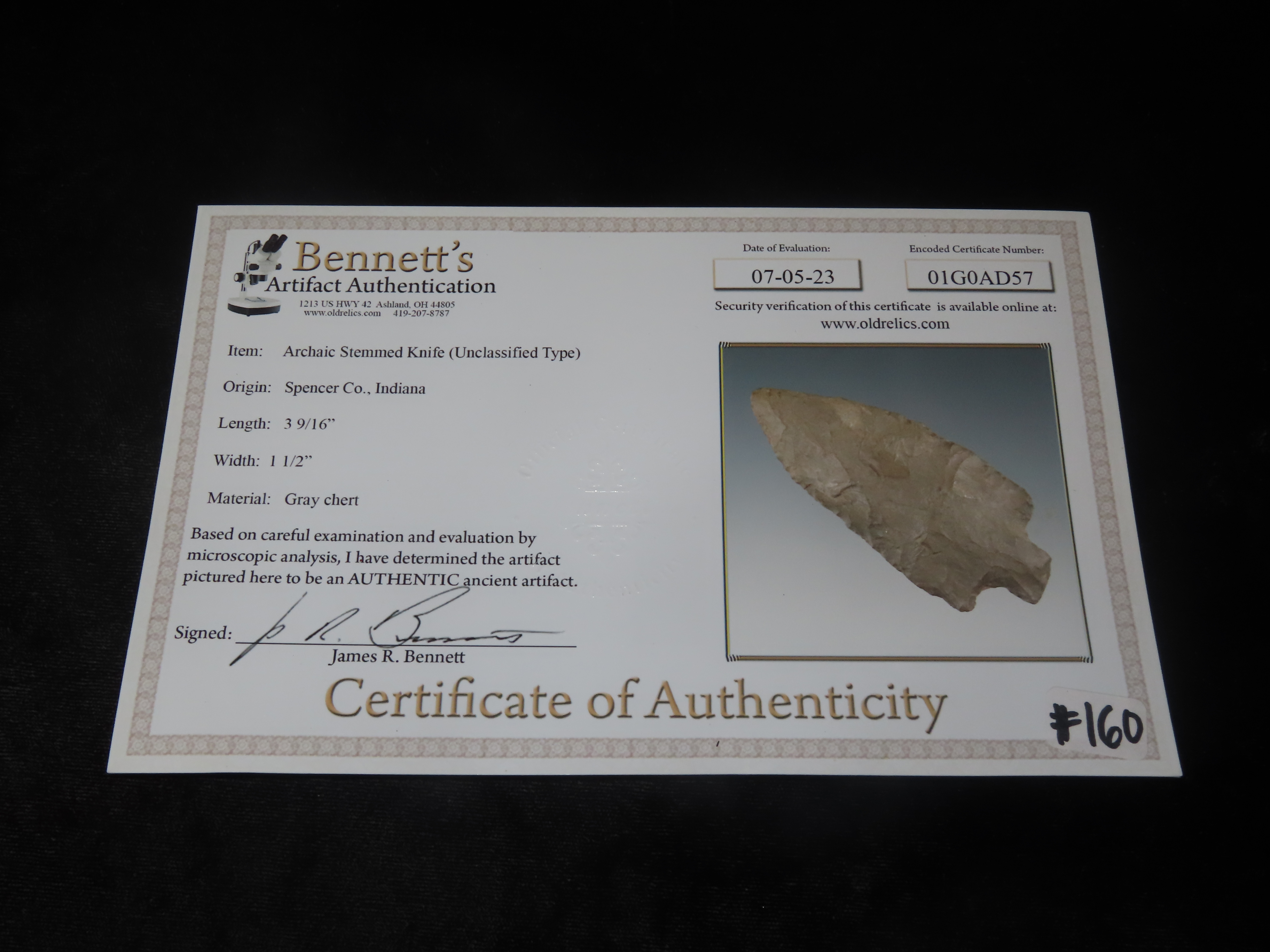 3 9/16″ Pickwick, Spencer County Indiana, Bennett COA. Nice Large Example with Great Patina.