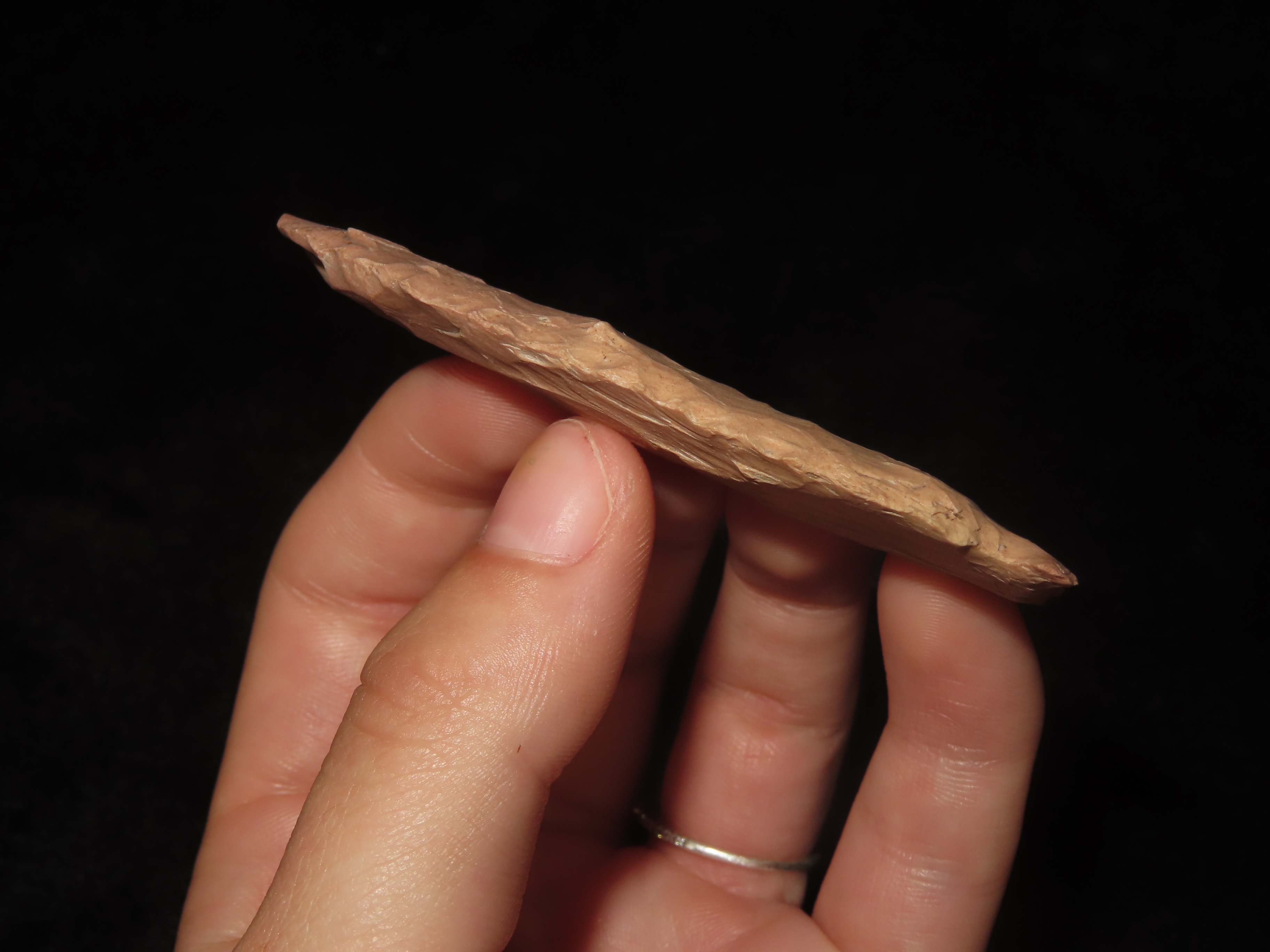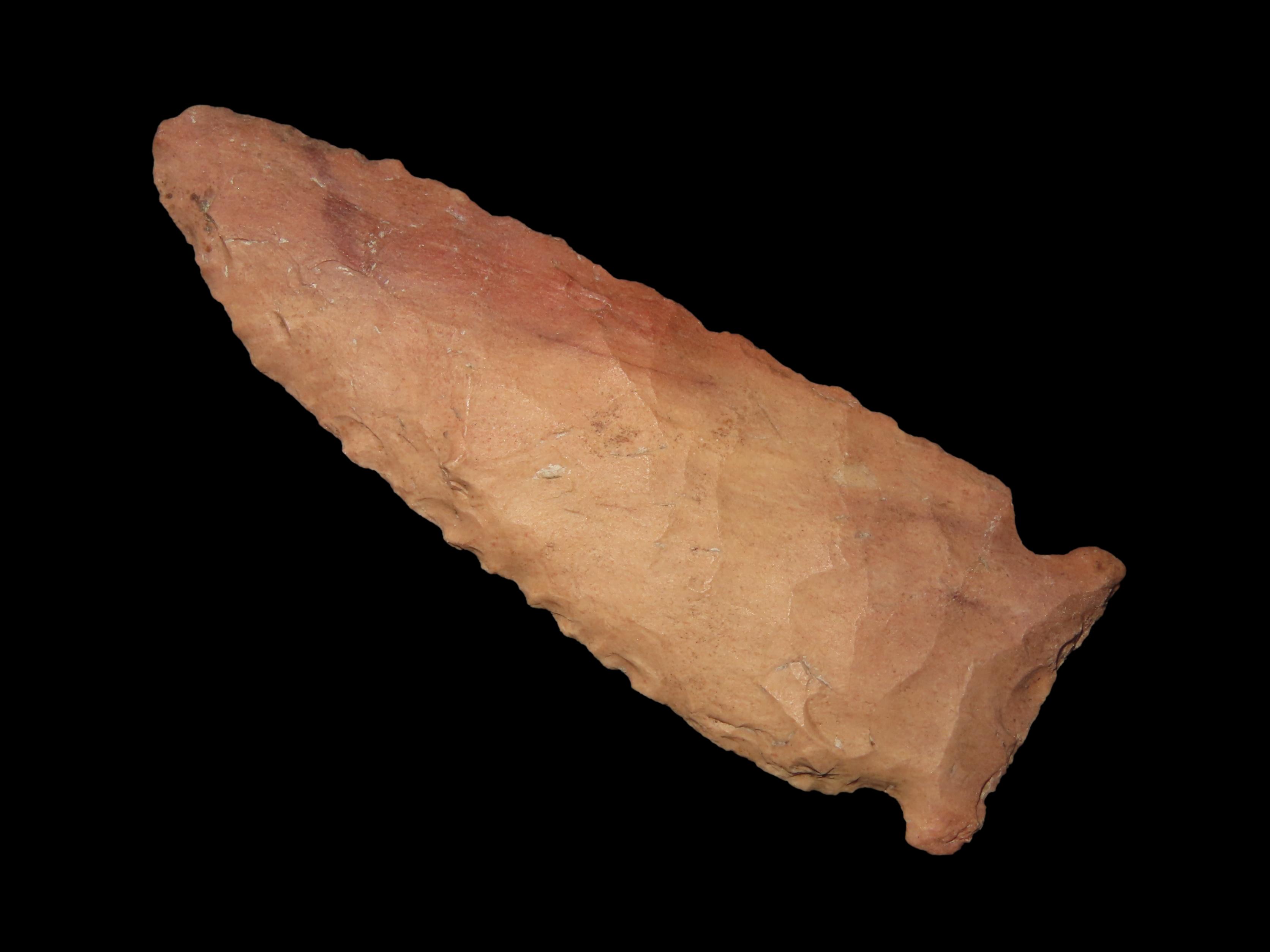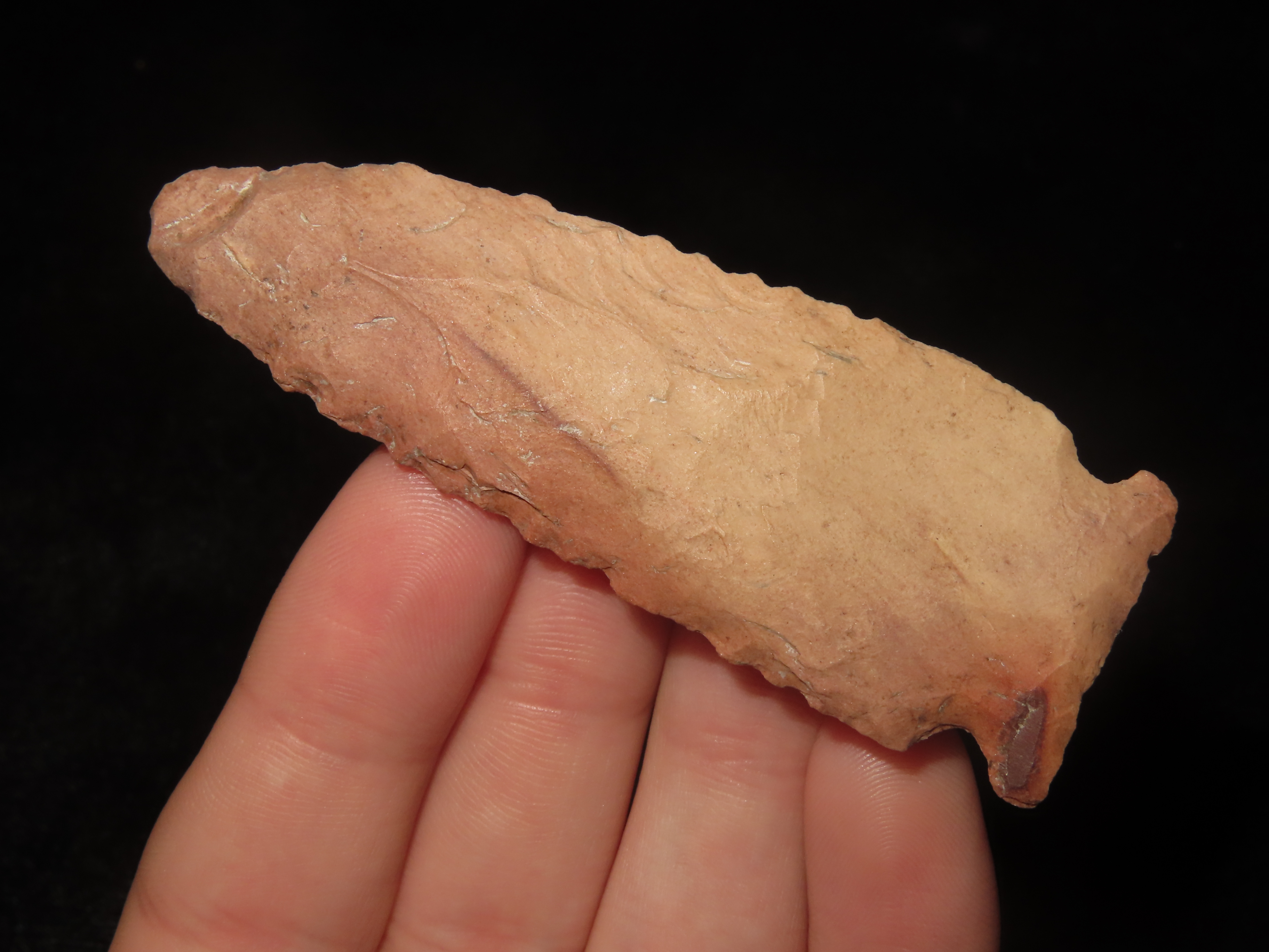 2 3/4″ Kirk Corner Notch, Adams County Ohio, Lightly Serrated Edges, Colorful Pink Jasper, Indian Arrowhead, Artifact, Knife.