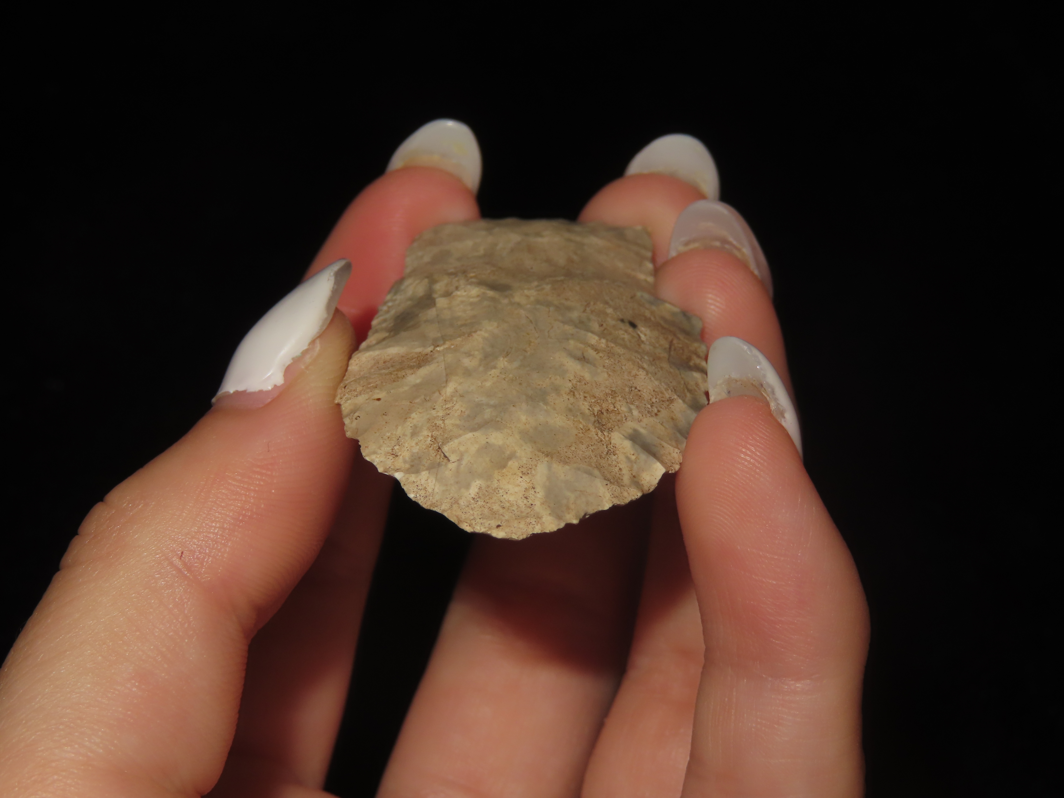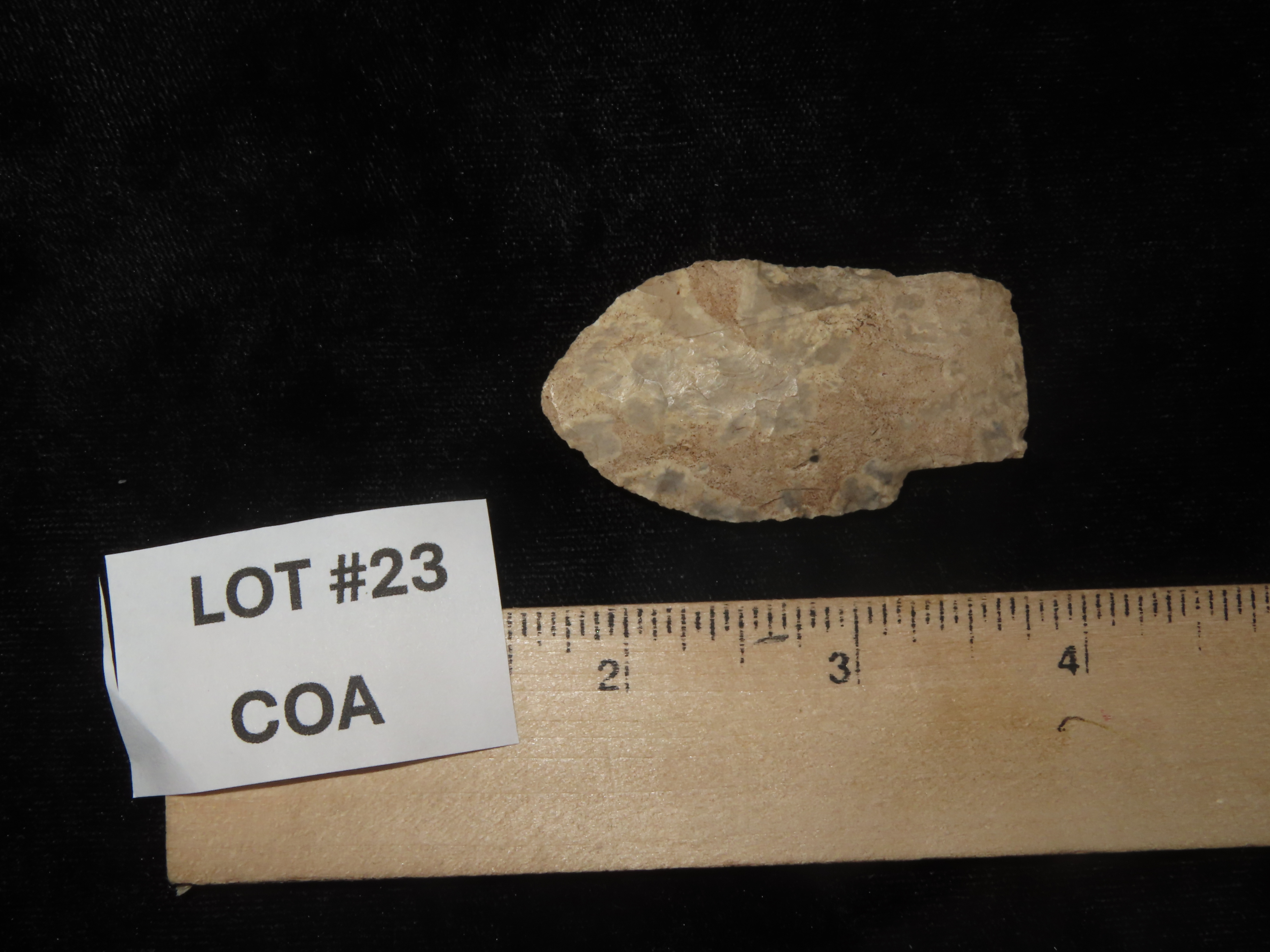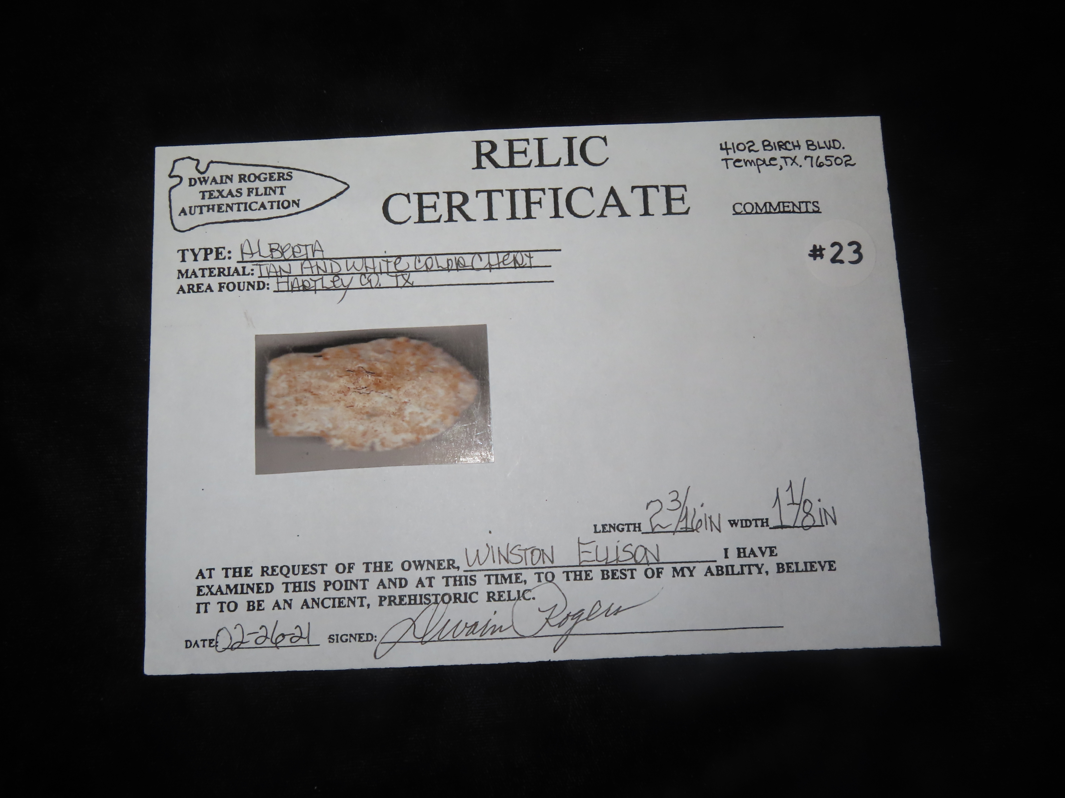 Rare 2 3/16″ Alberta, Hartley Co. Texas, Rogers COA, ex Winston Ellison, Great Example of a very rare type, Nicely Flaked and well Patinated.