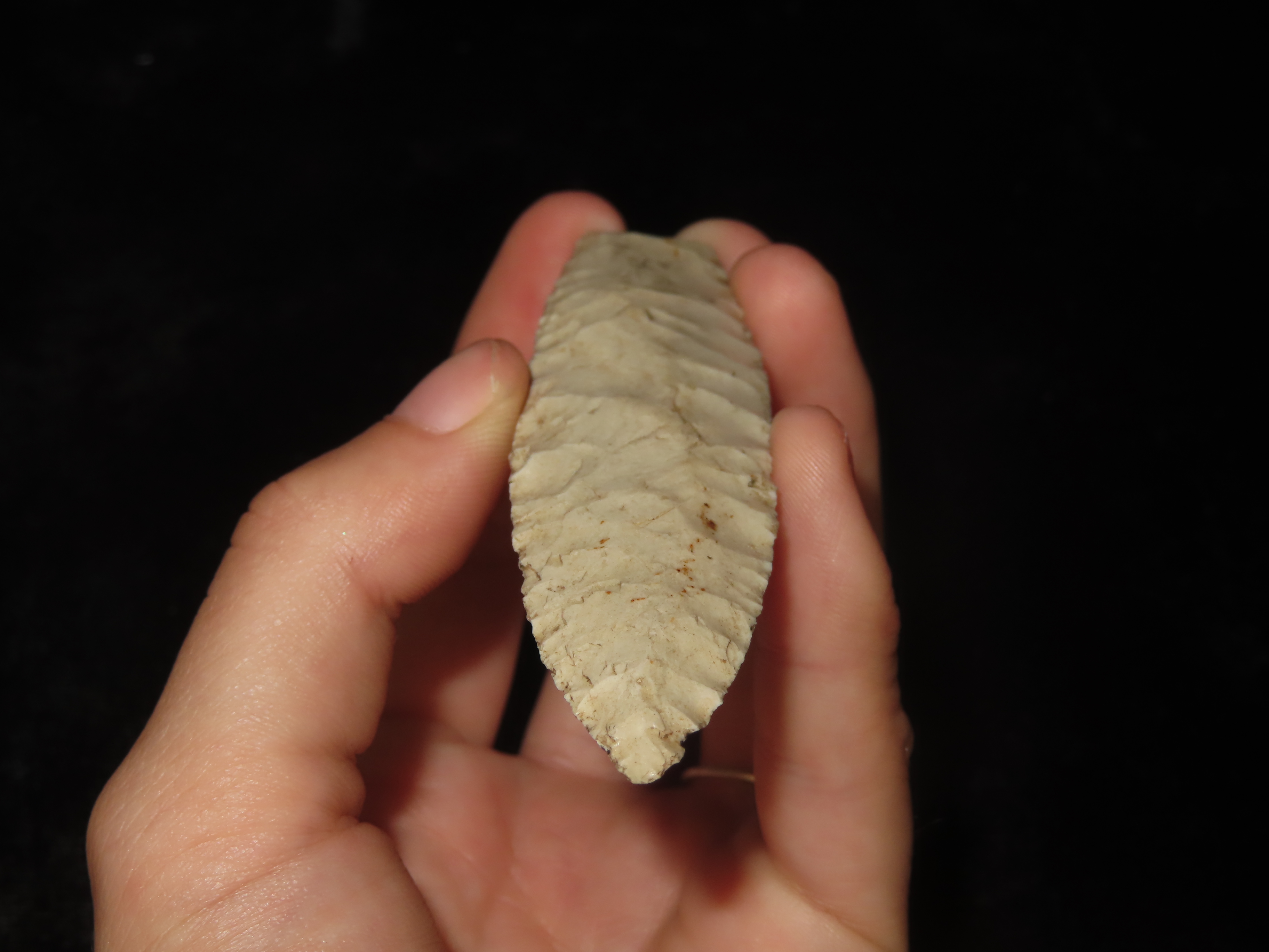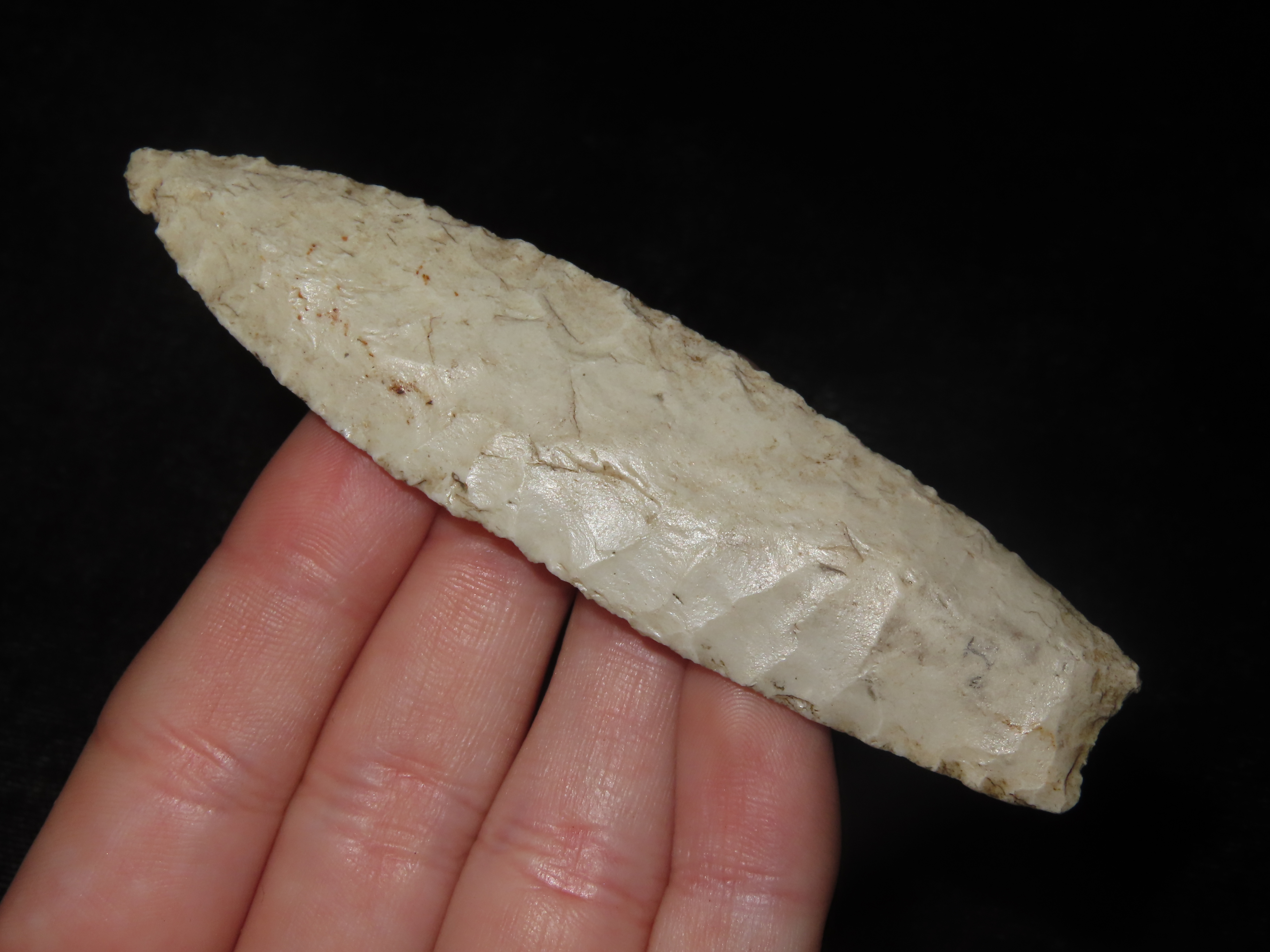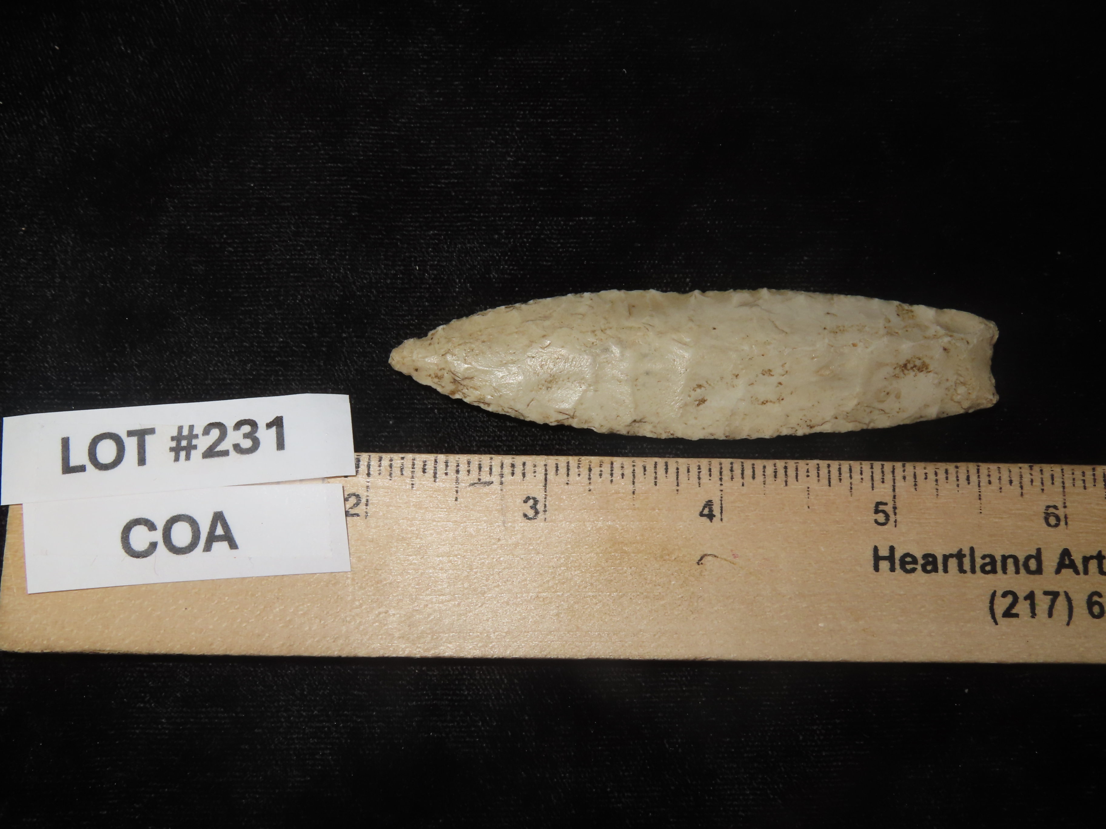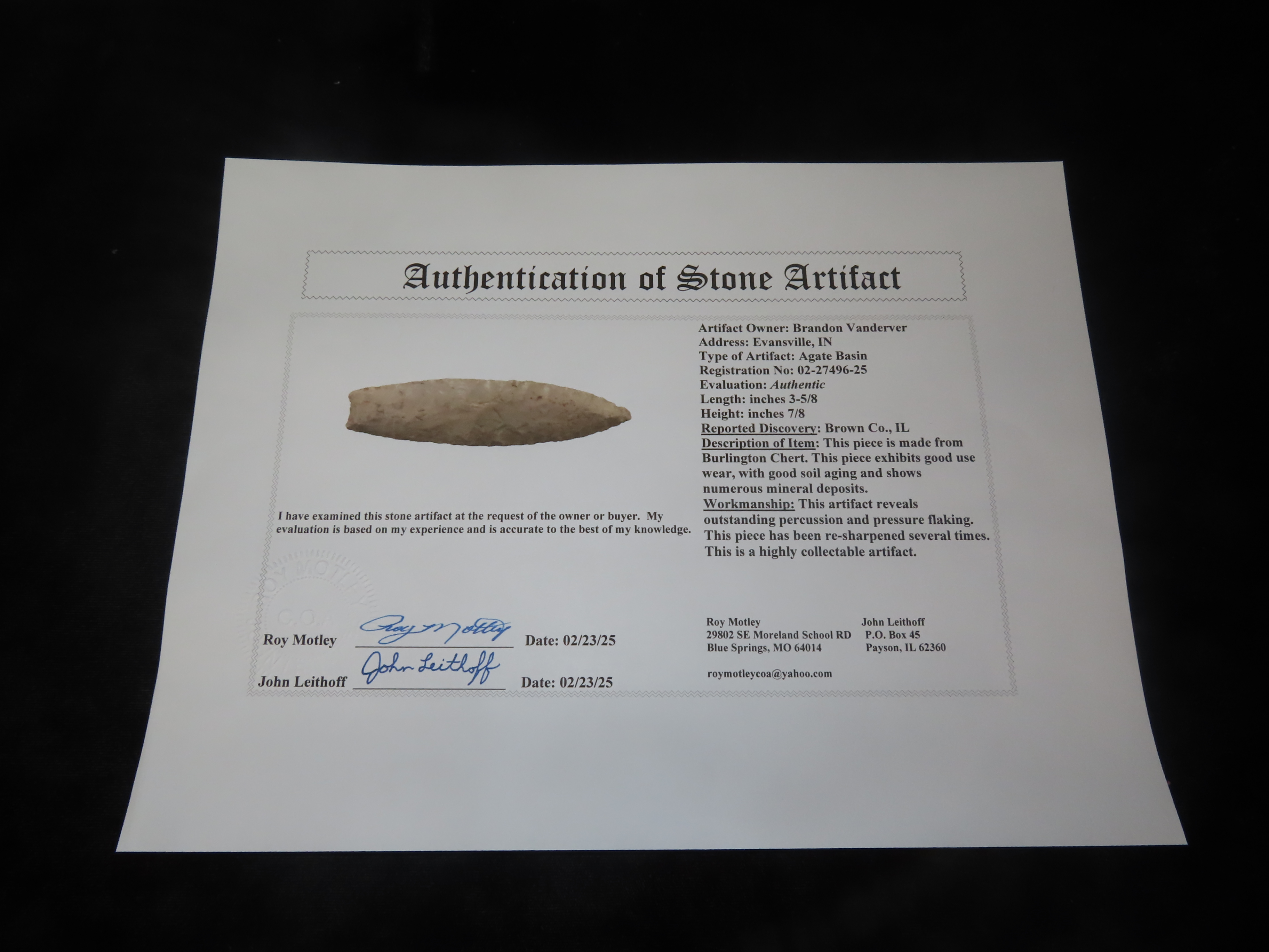 3 5/8′ Agate Basin, Brown County Illinois, Motley COA. Finely Flaked Example with a Nice Medial Ridge & Heave patination