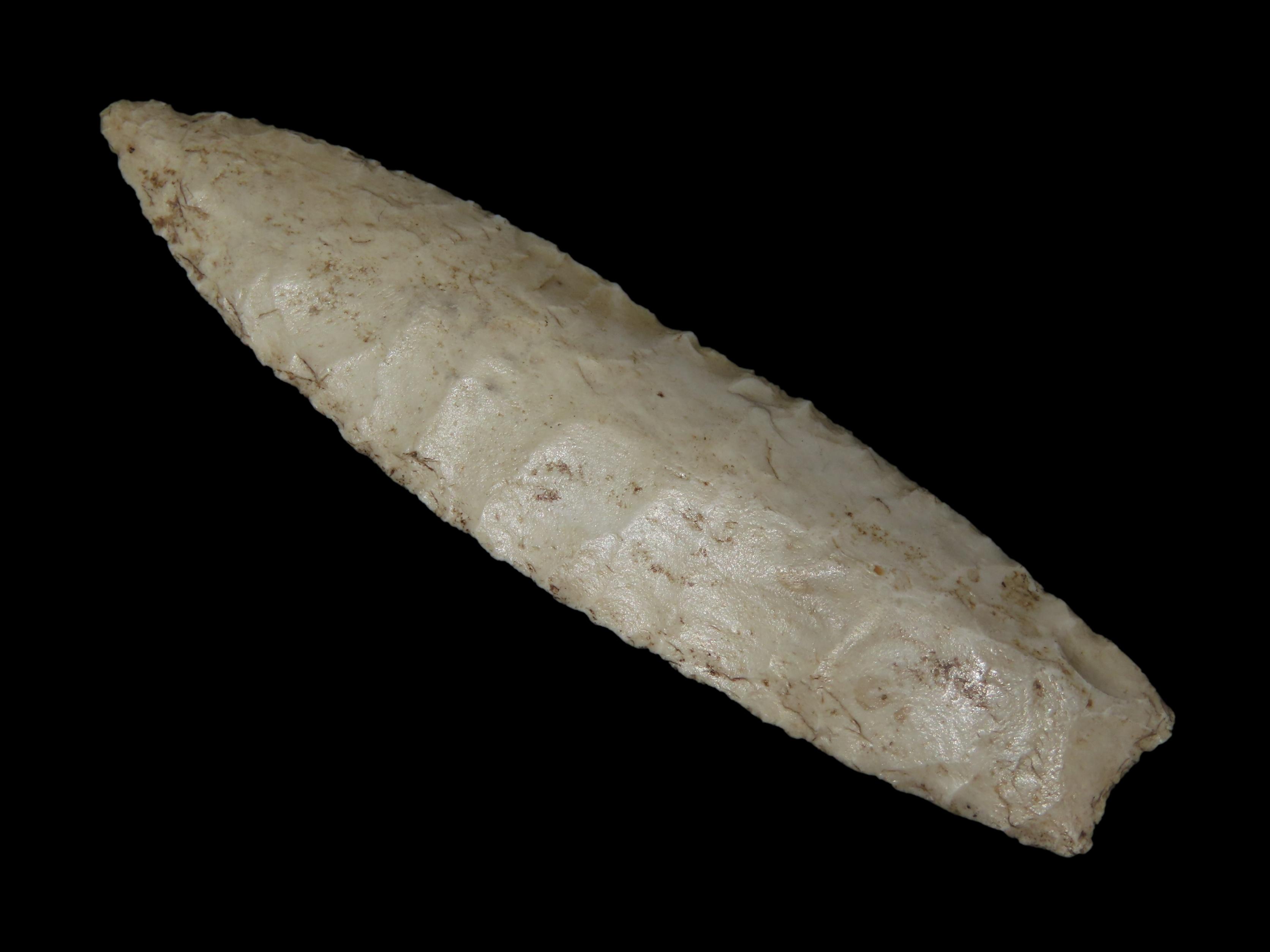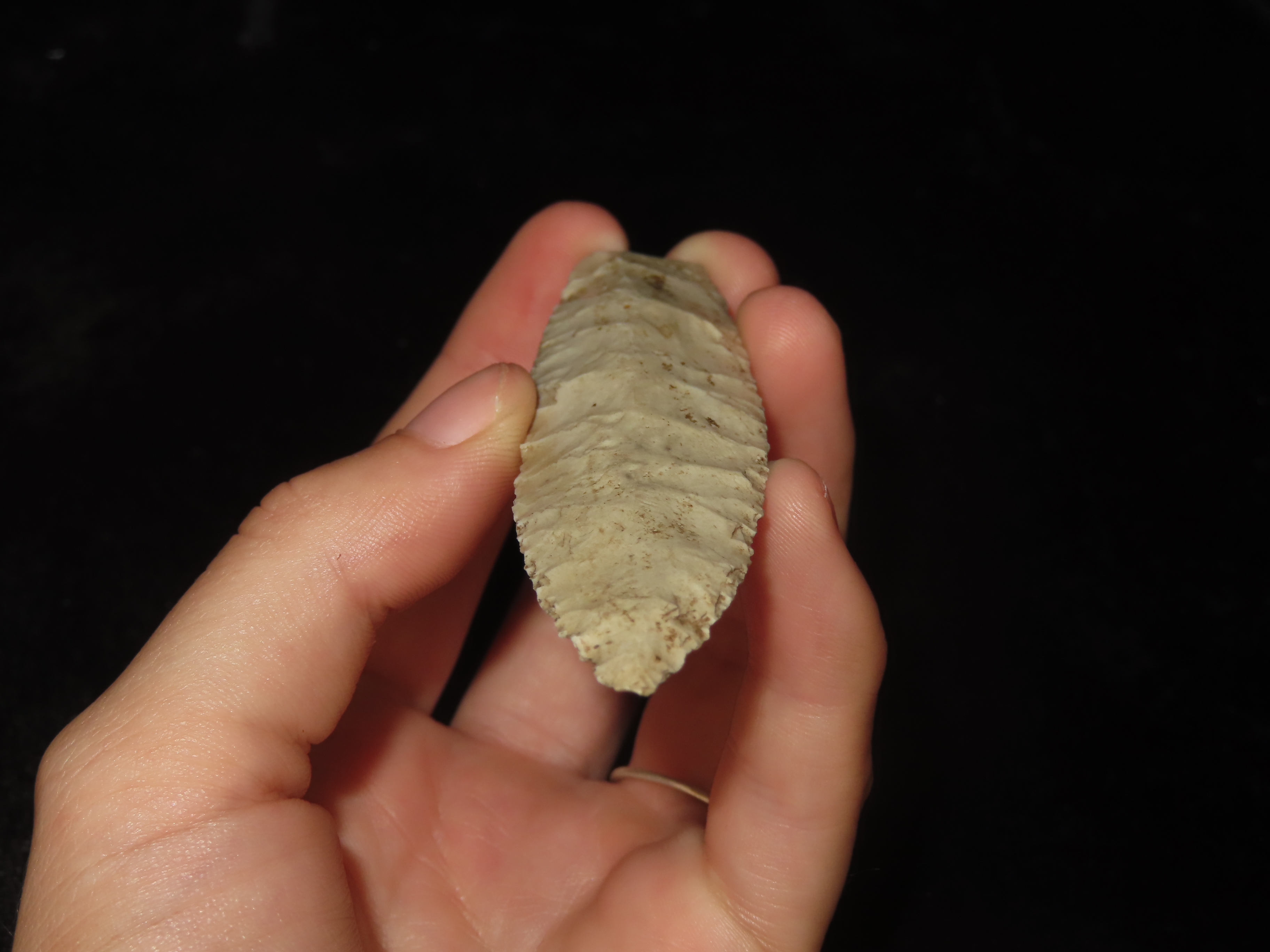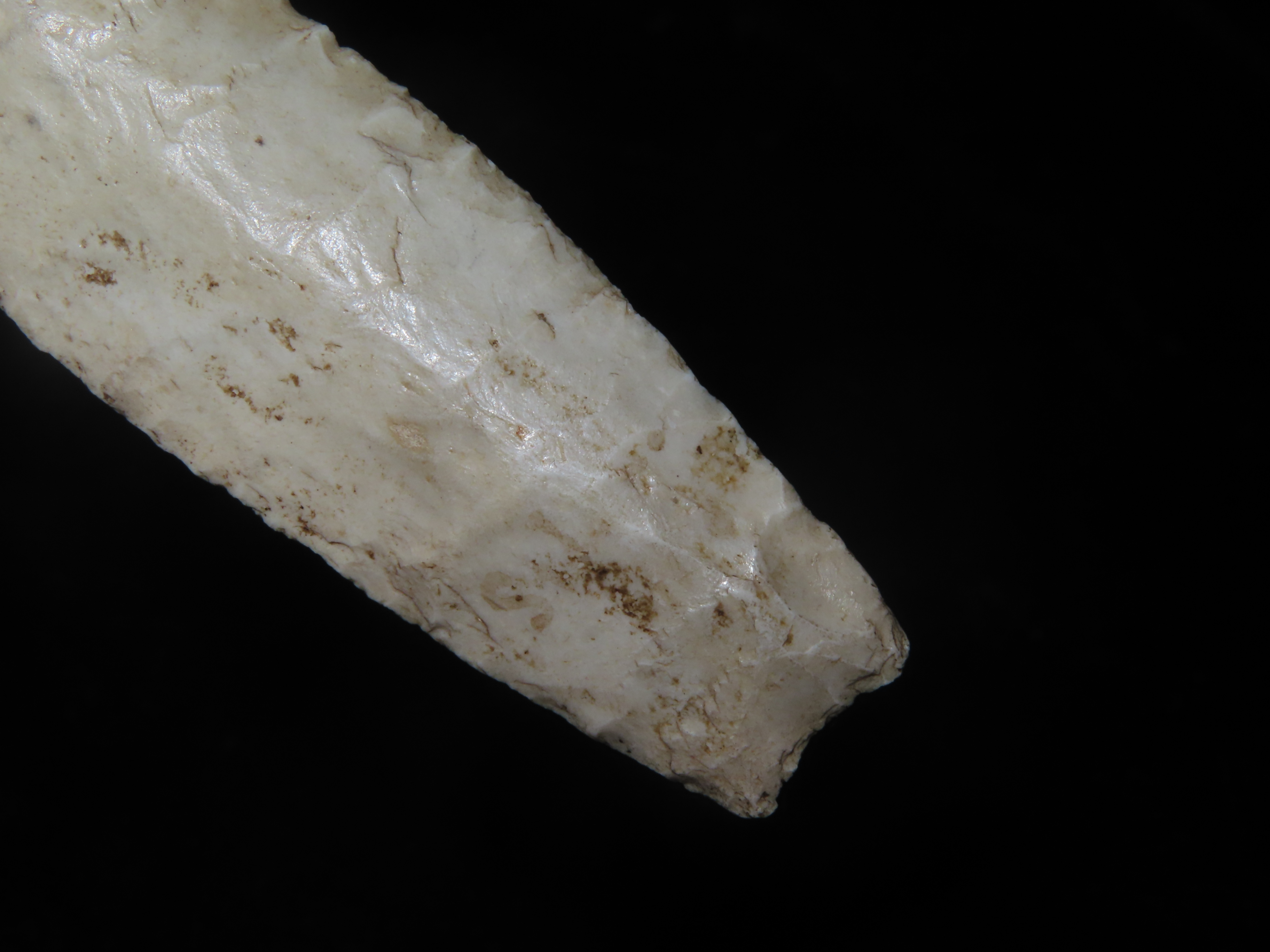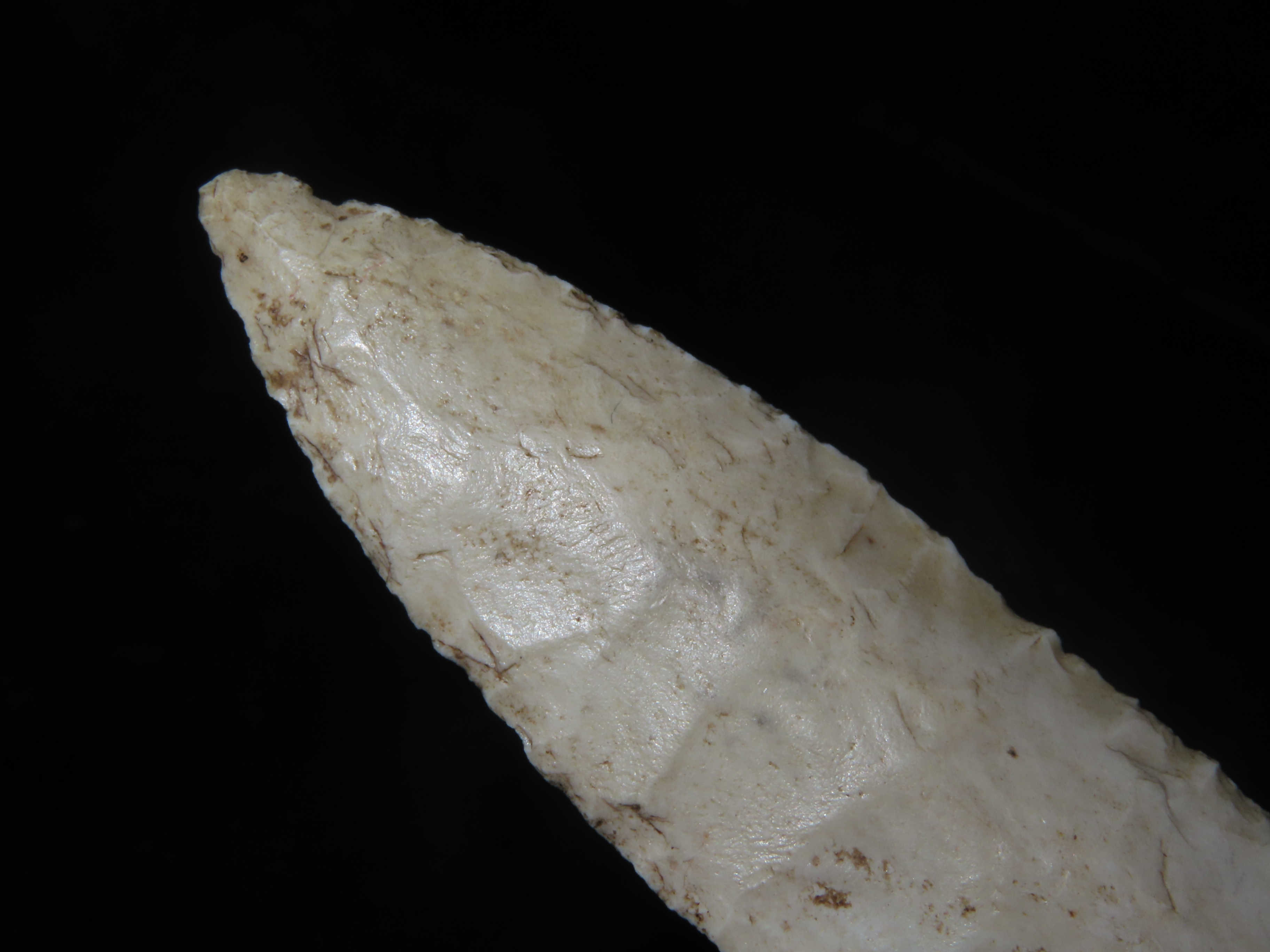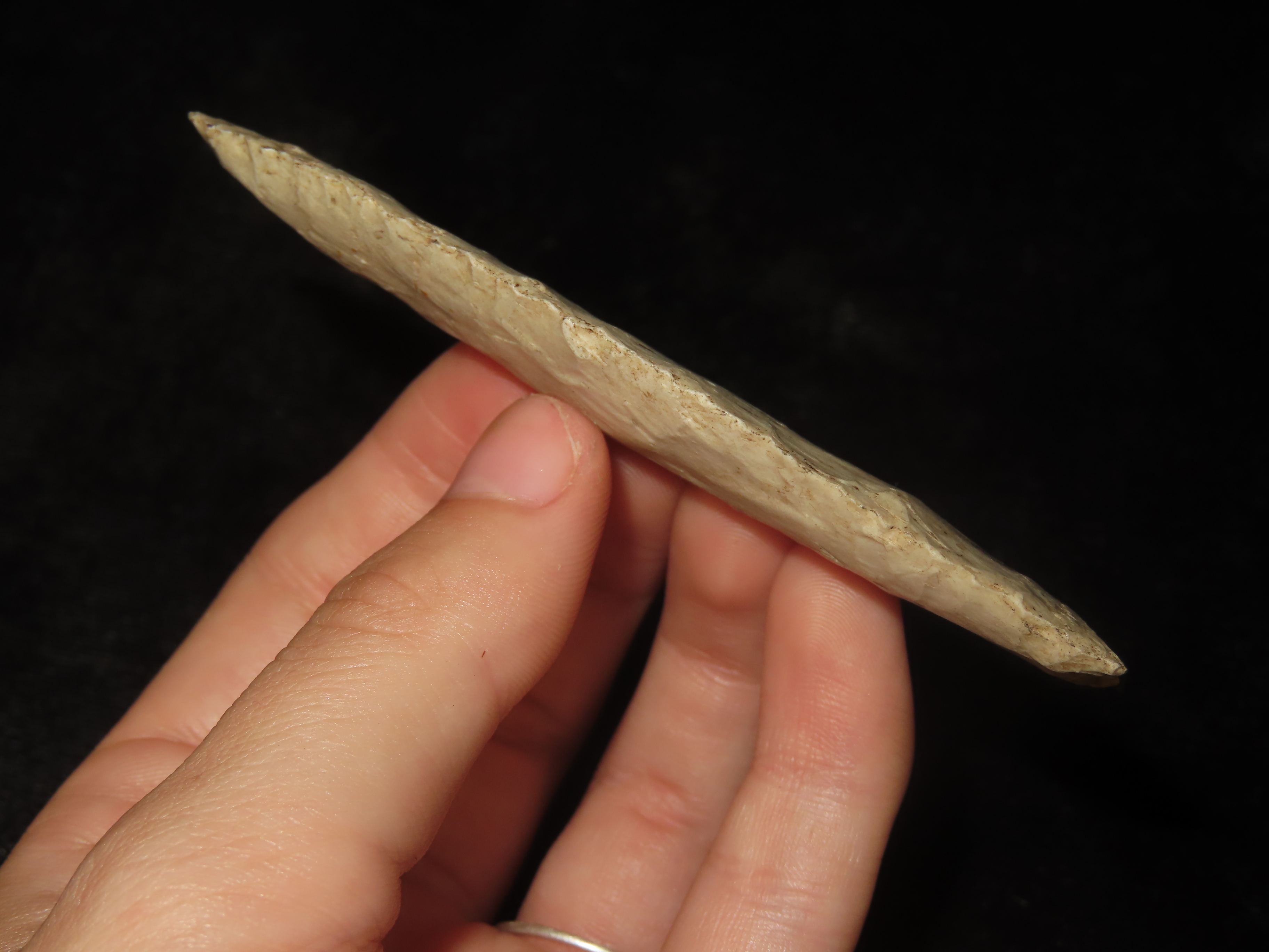 3 5/8′ Agate Basin, Brown County Illinois, Motley COA. Finely Flaked Example with a Nice Medial Ridge & Heave patination