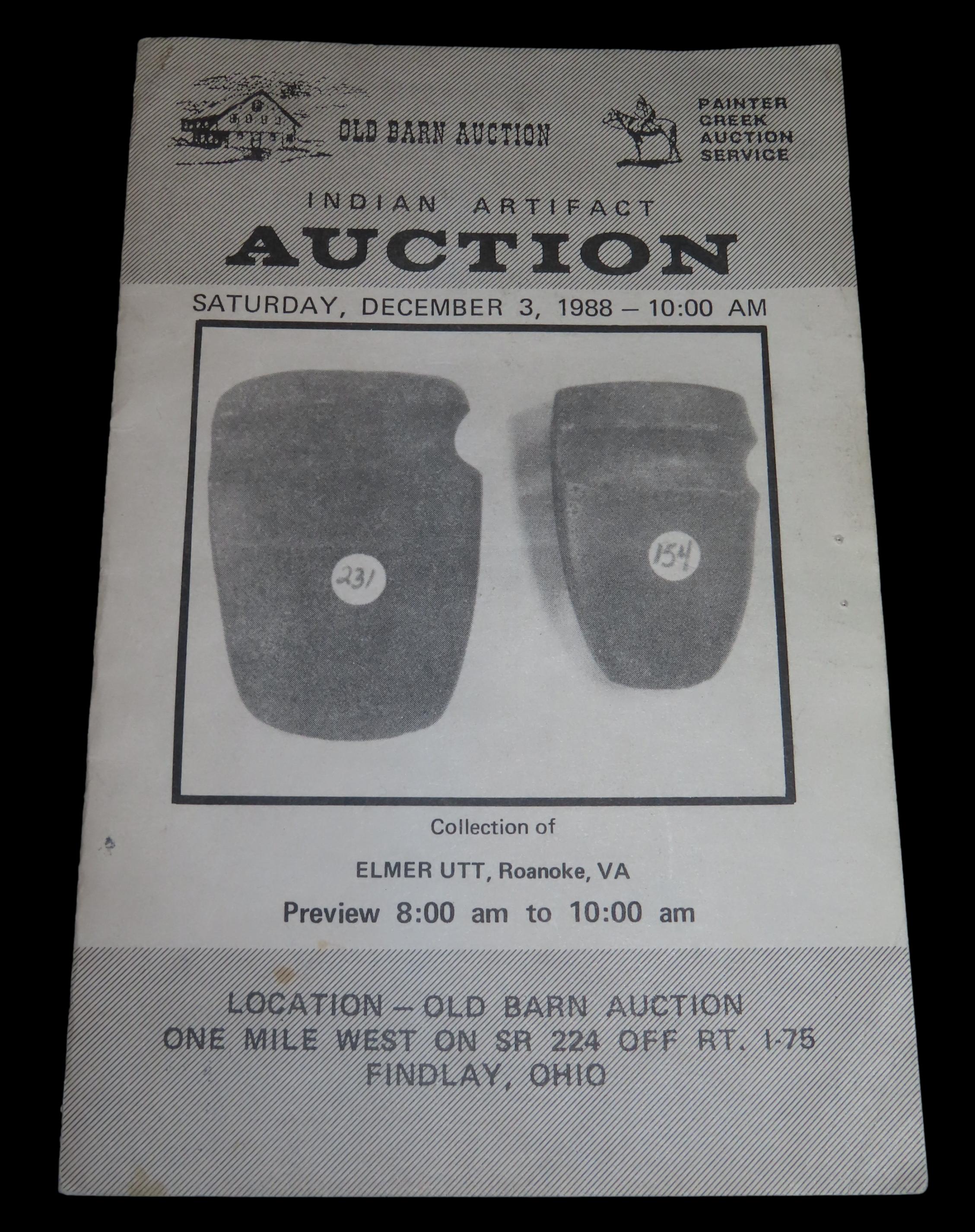 1988 Elmer Utt Indian Artifact Collection Auction Catalog, Old Barn/Painter Creek Auction Service, Birdstones, Axes, Arrowheads, Pottery, Pipes, Etc