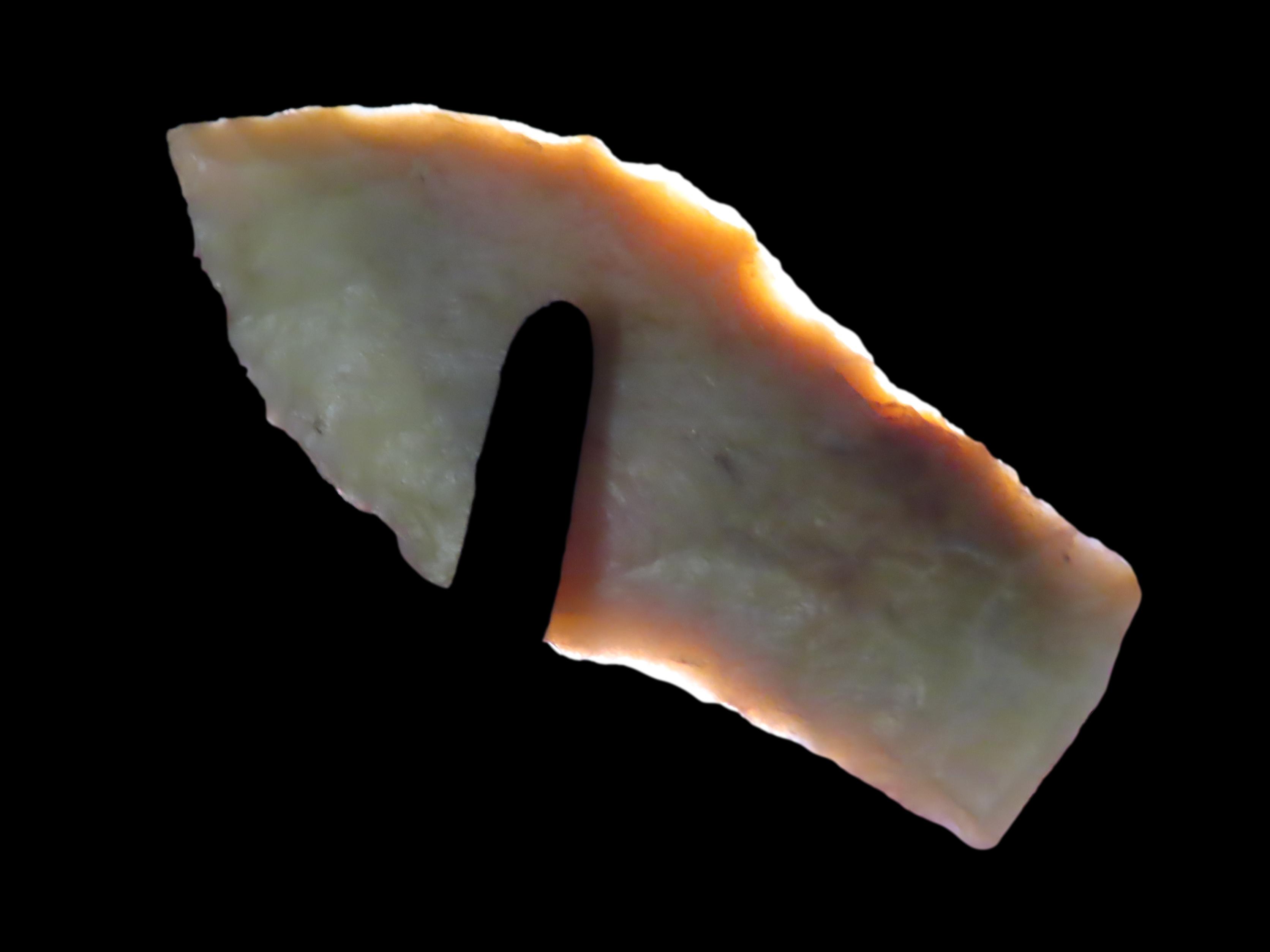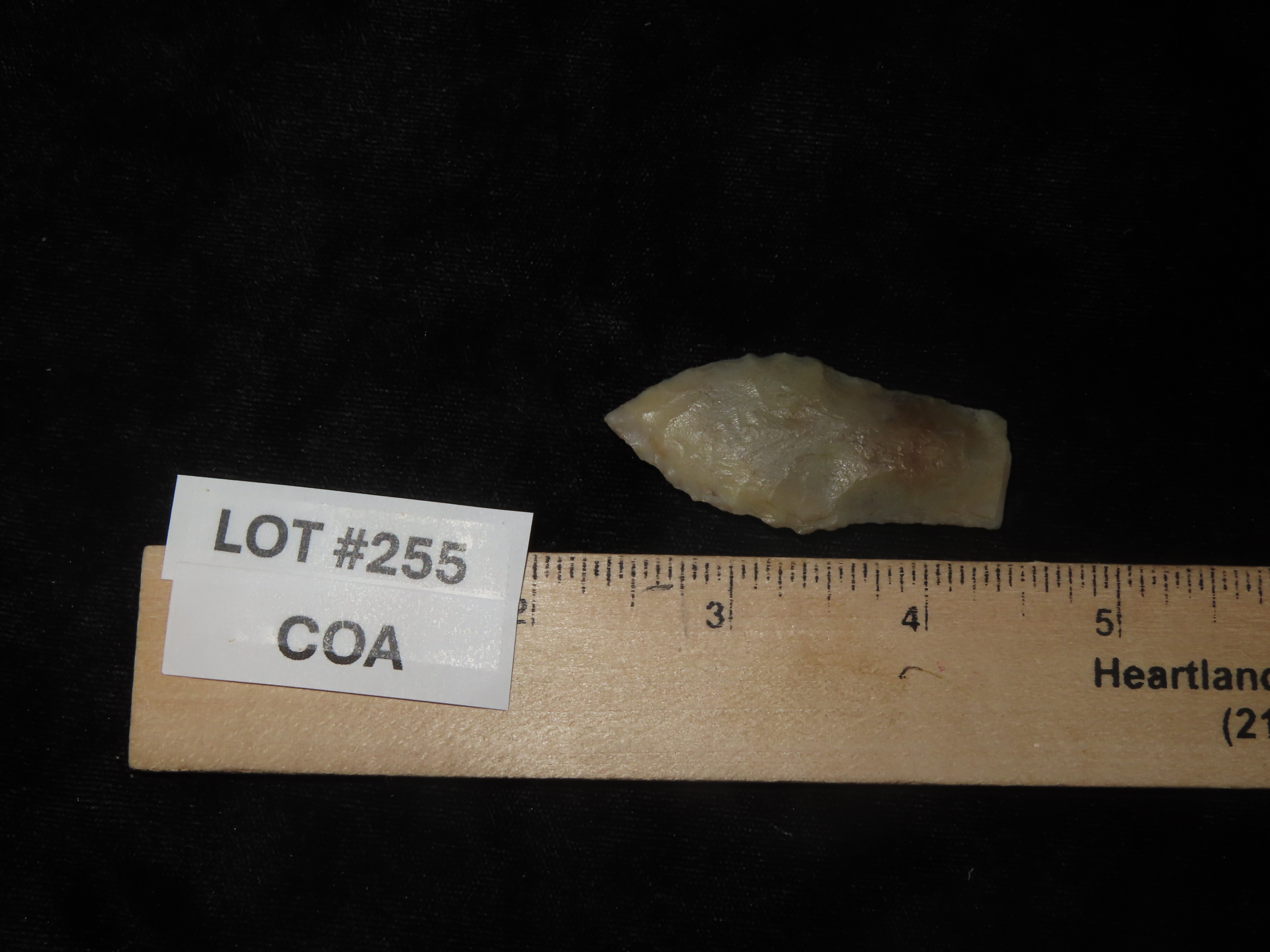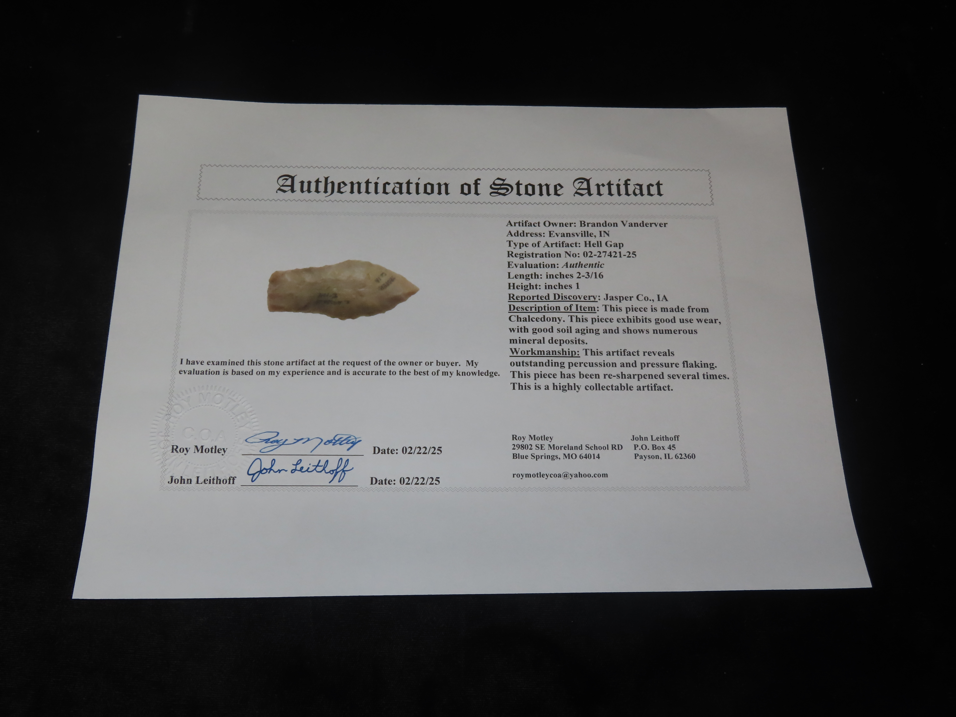 2 3/16″ Hell Gap, Jasper County Iowa, Motley COA. Ex Jerry Dickey. Beautiful Semi Translucent Chalcedony. Nice High Plains Paleo Era Arrowhead