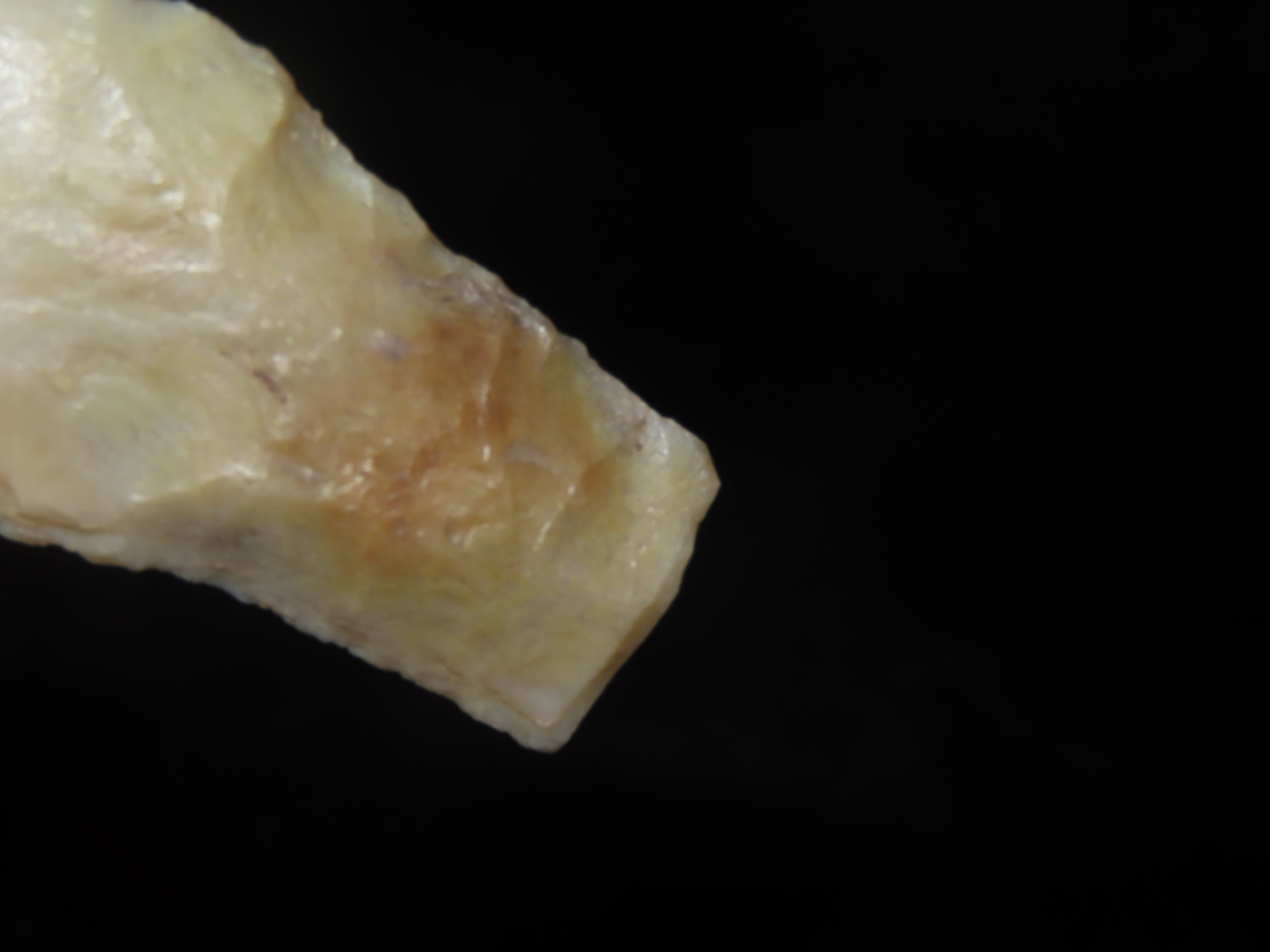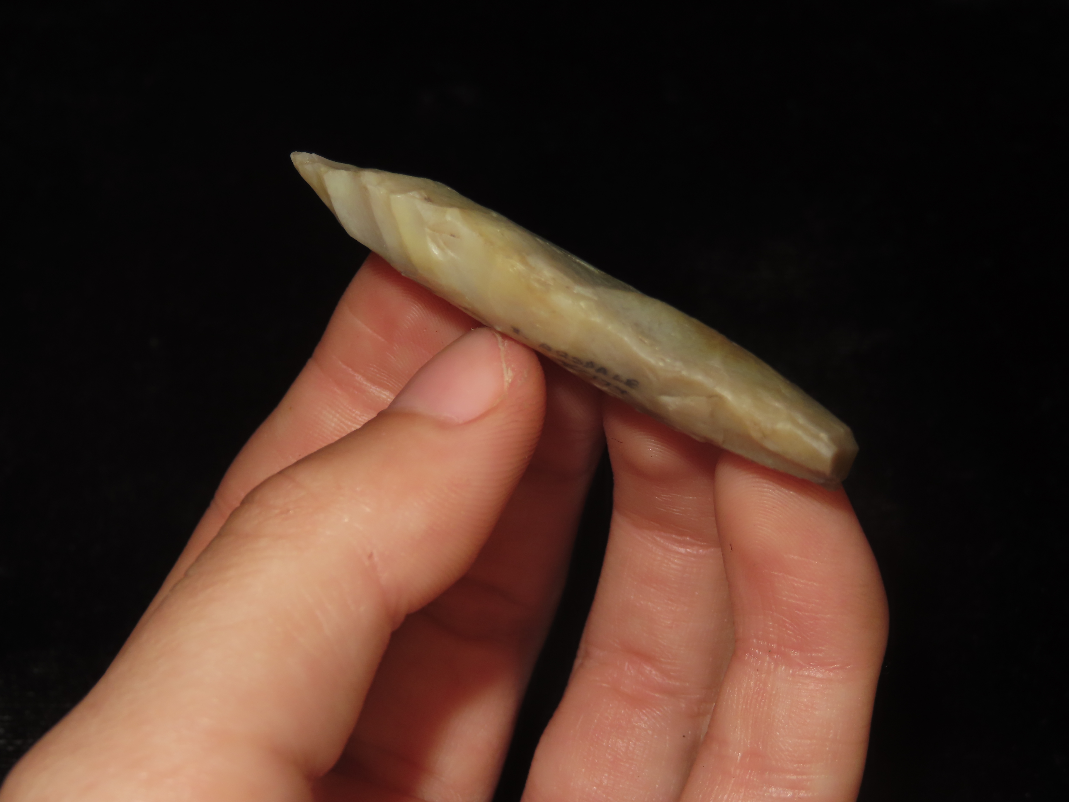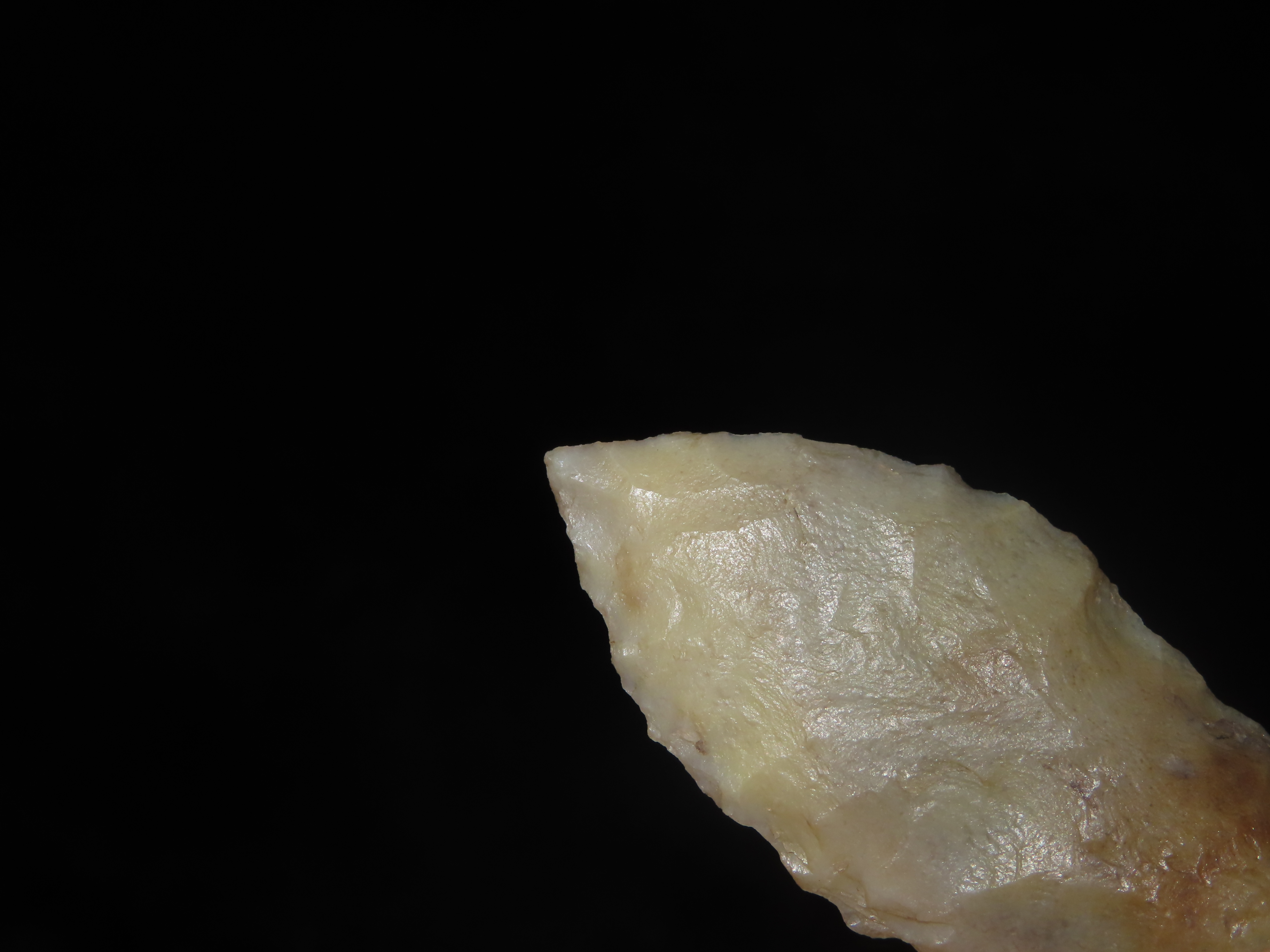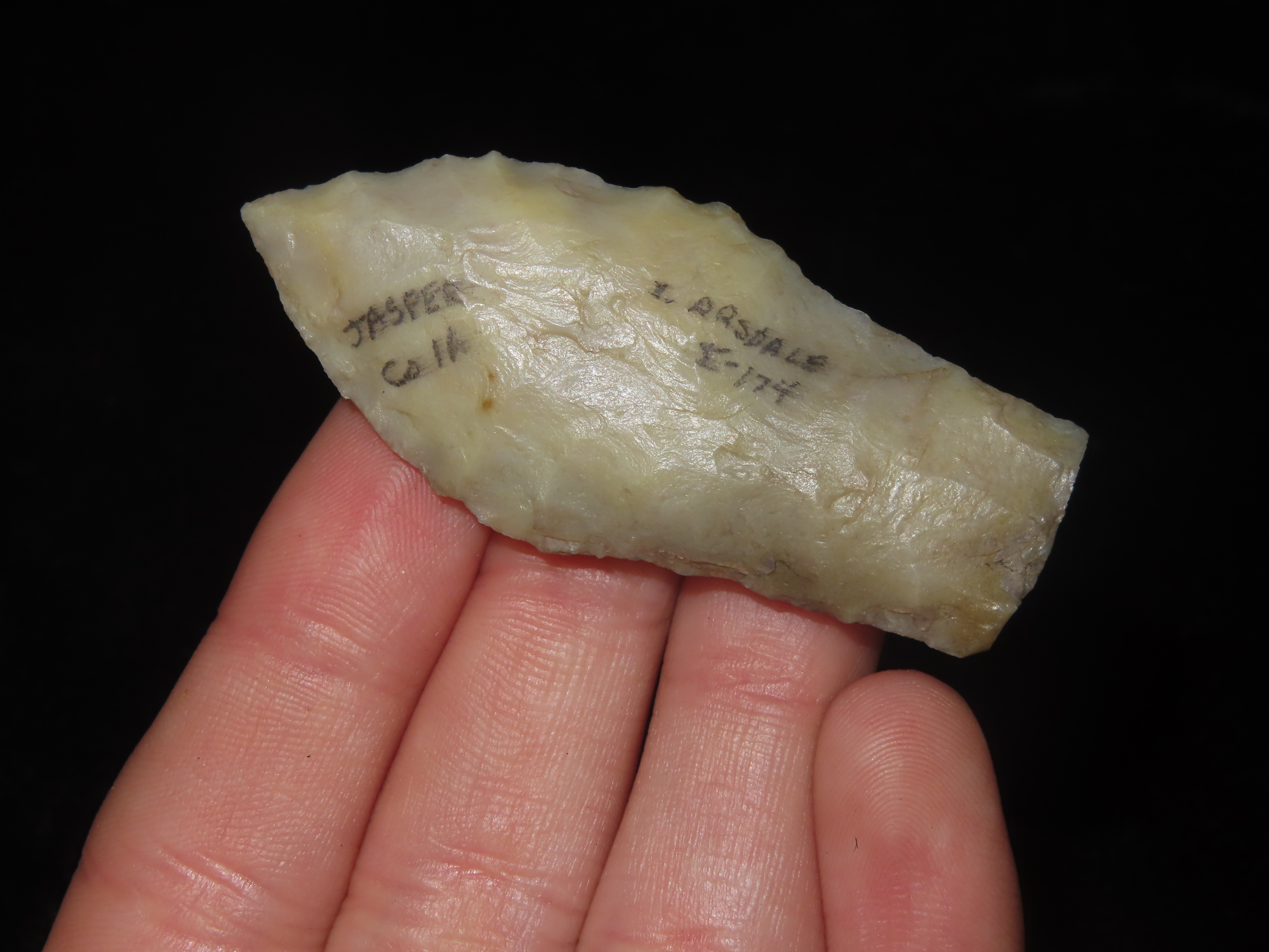 2 3/16″ Hell Gap, Jasper County Iowa, Motley COA. Ex Jerry Dickey. Beautiful Semi Translucent Chalcedony. Nice High Plains Paleo Era Arrowhead