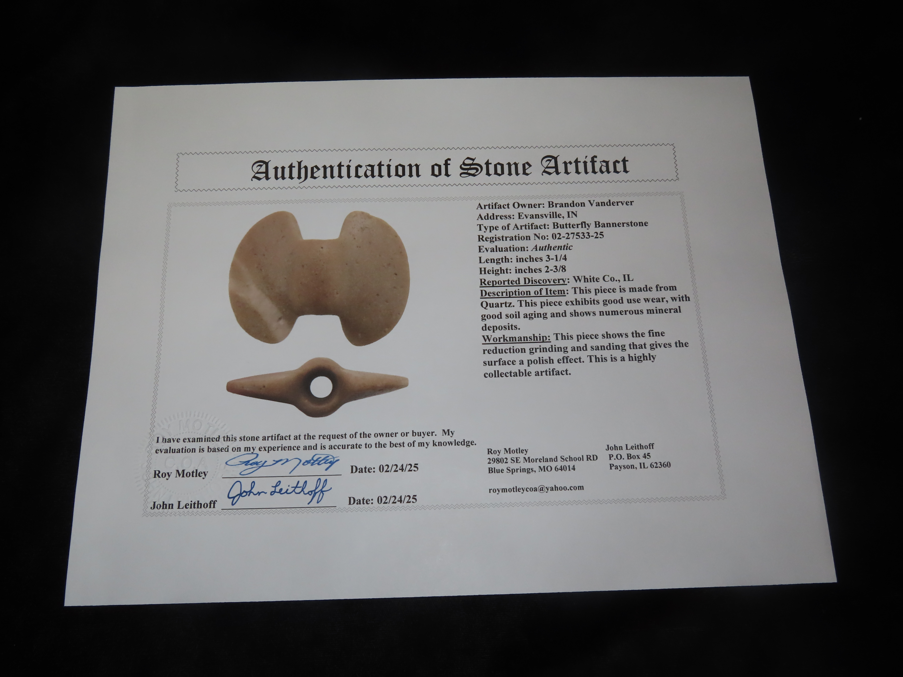 Incredible Quartz Butterfly Bannerstone, White Co. Illinois, Motley COA. Beautiful piece of Quartz with a Bright White Vein Running through one Wing. Excellent form and Amazing Polish!