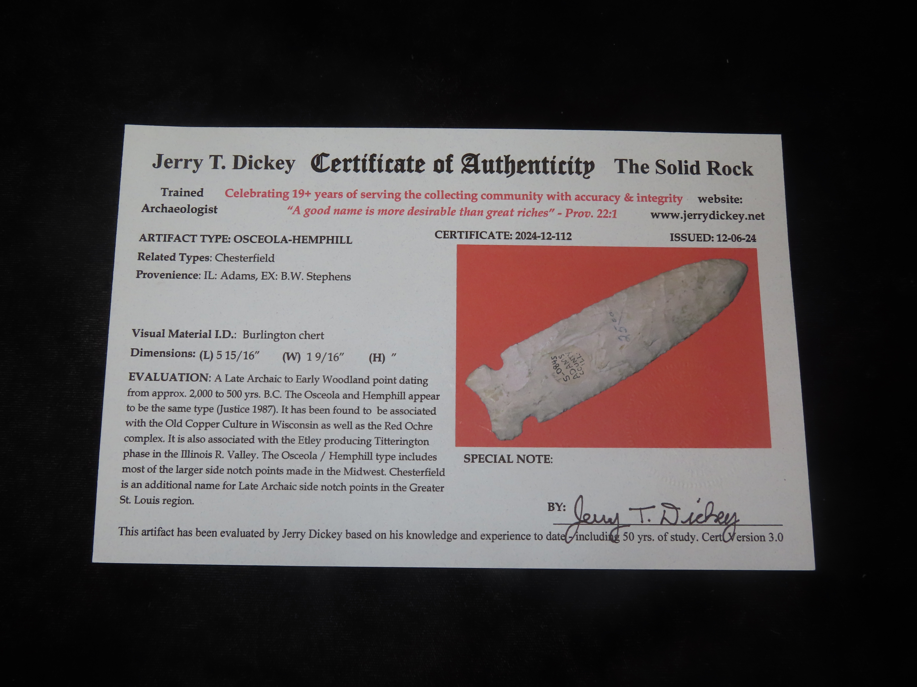World Class Hemphill / Osceola, 5 15/16" Long, Adams Co. Illinois, Dickey & Motley COA's. Ex B.W. Stephens 1st Collection purchased from "Stivers" in 1949, later sold to Tom Moxley, then onto Mitch Lewis, Perry Hanson, Brandon Vanderver. This is the first