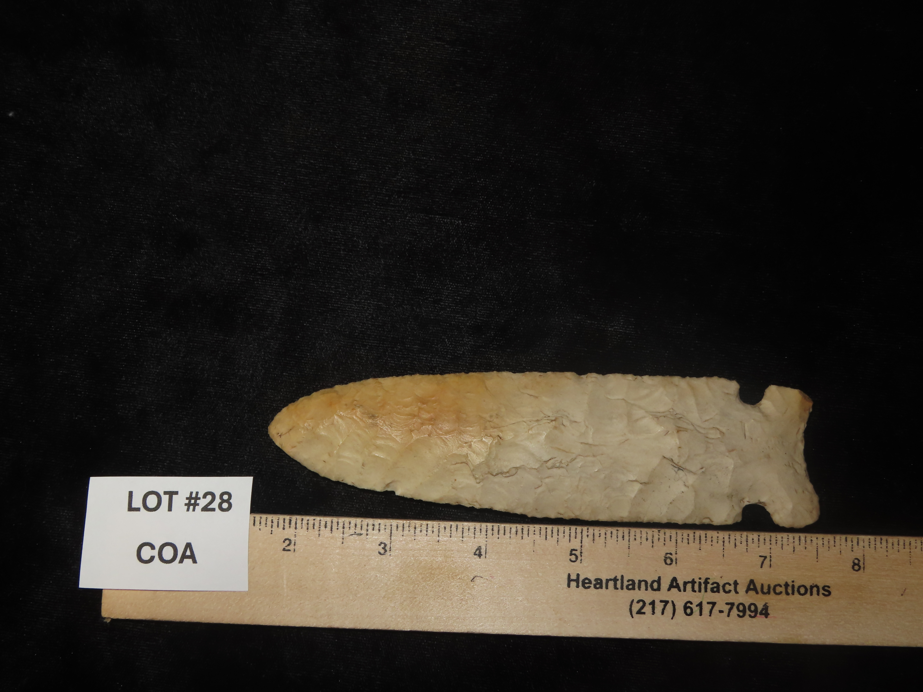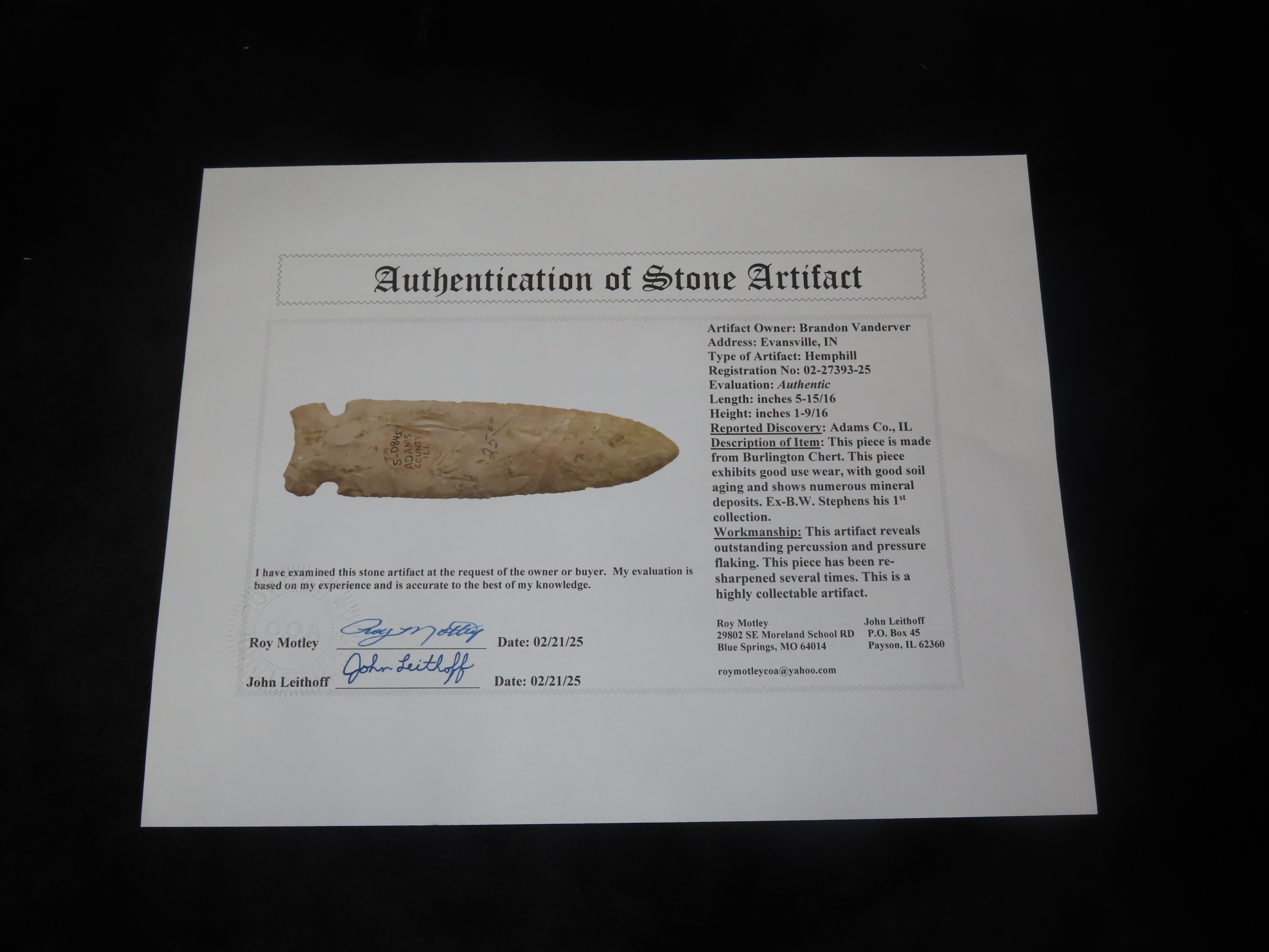 World Class Hemphill / Osceola, 5 15/16″ Long, Adams Co. Illinois, Dickey & Motley COA’s. Ex B.W. Stephens 1st Collection purchased from “Stivers” in 1949, later sold to Tom Moxley, then onto Mitch Lewis, Perry Hanson, Brandon Vanderver. This is the first time it has ever been sold Publicly. Collector Grade Example with Super History!