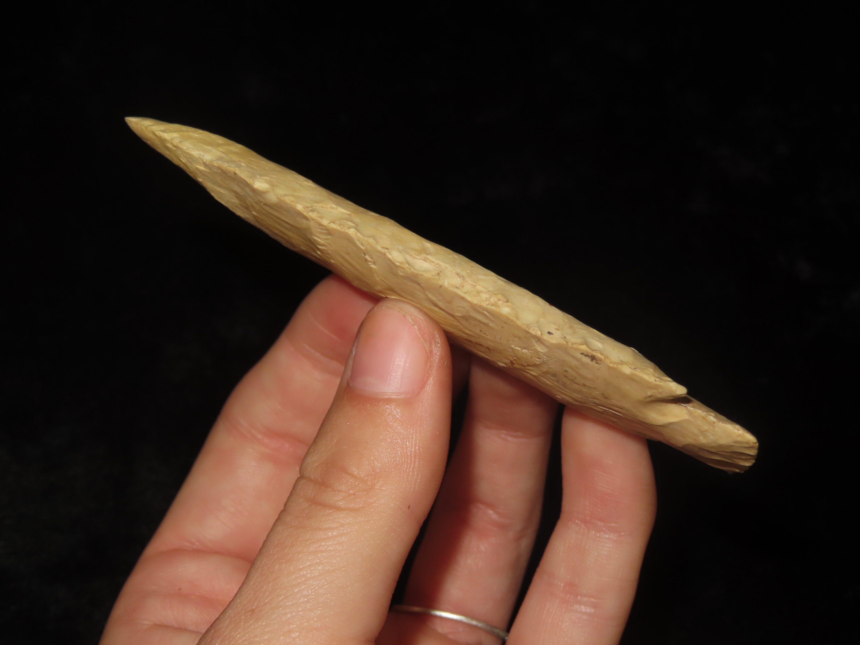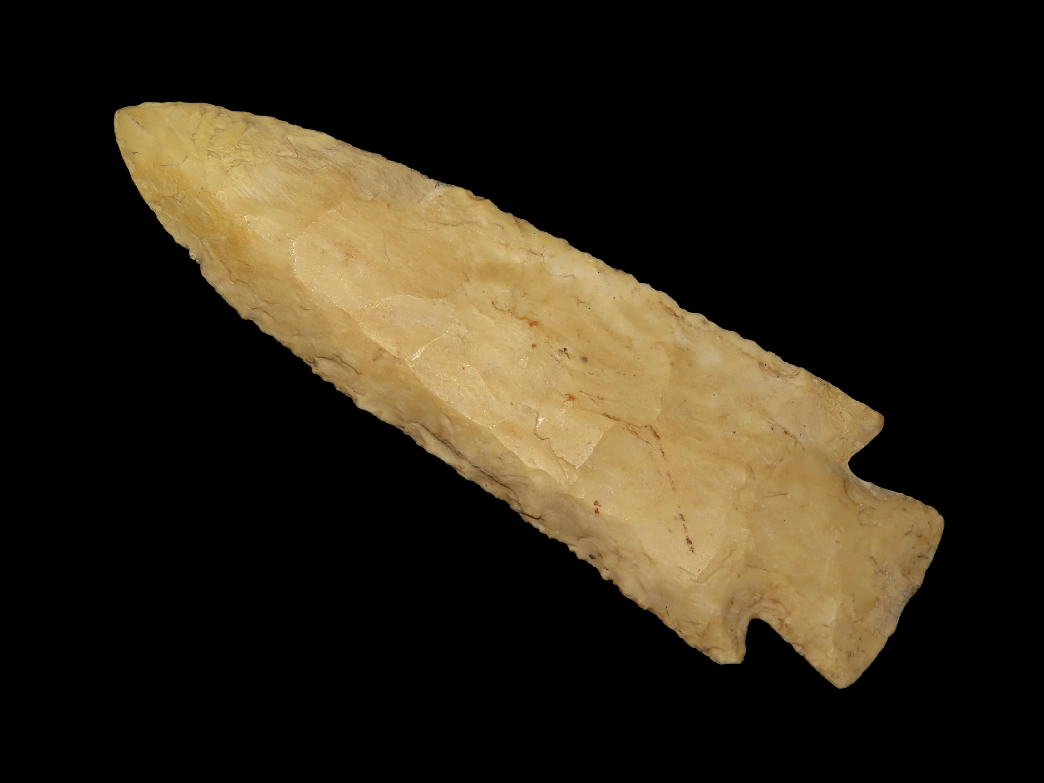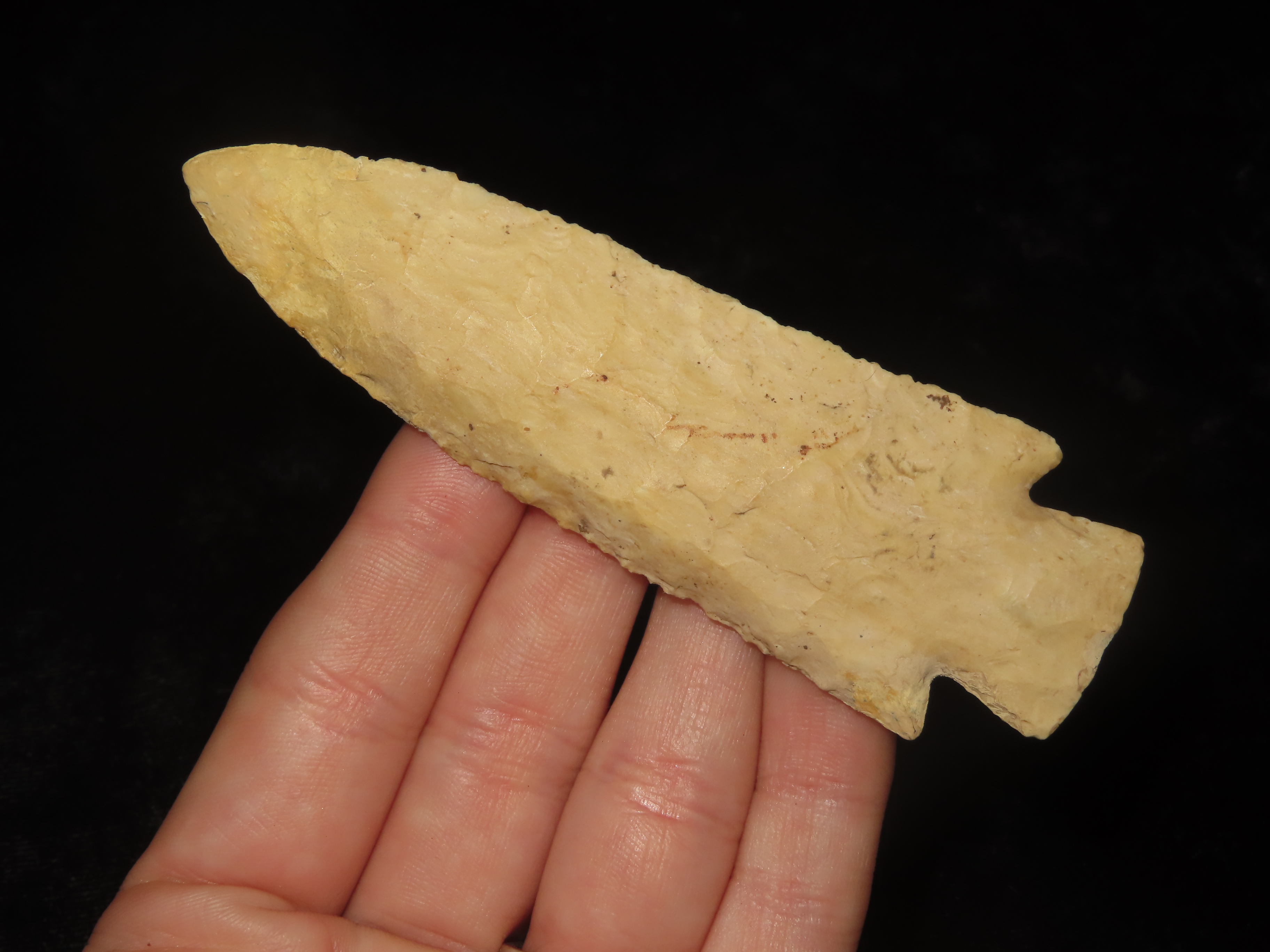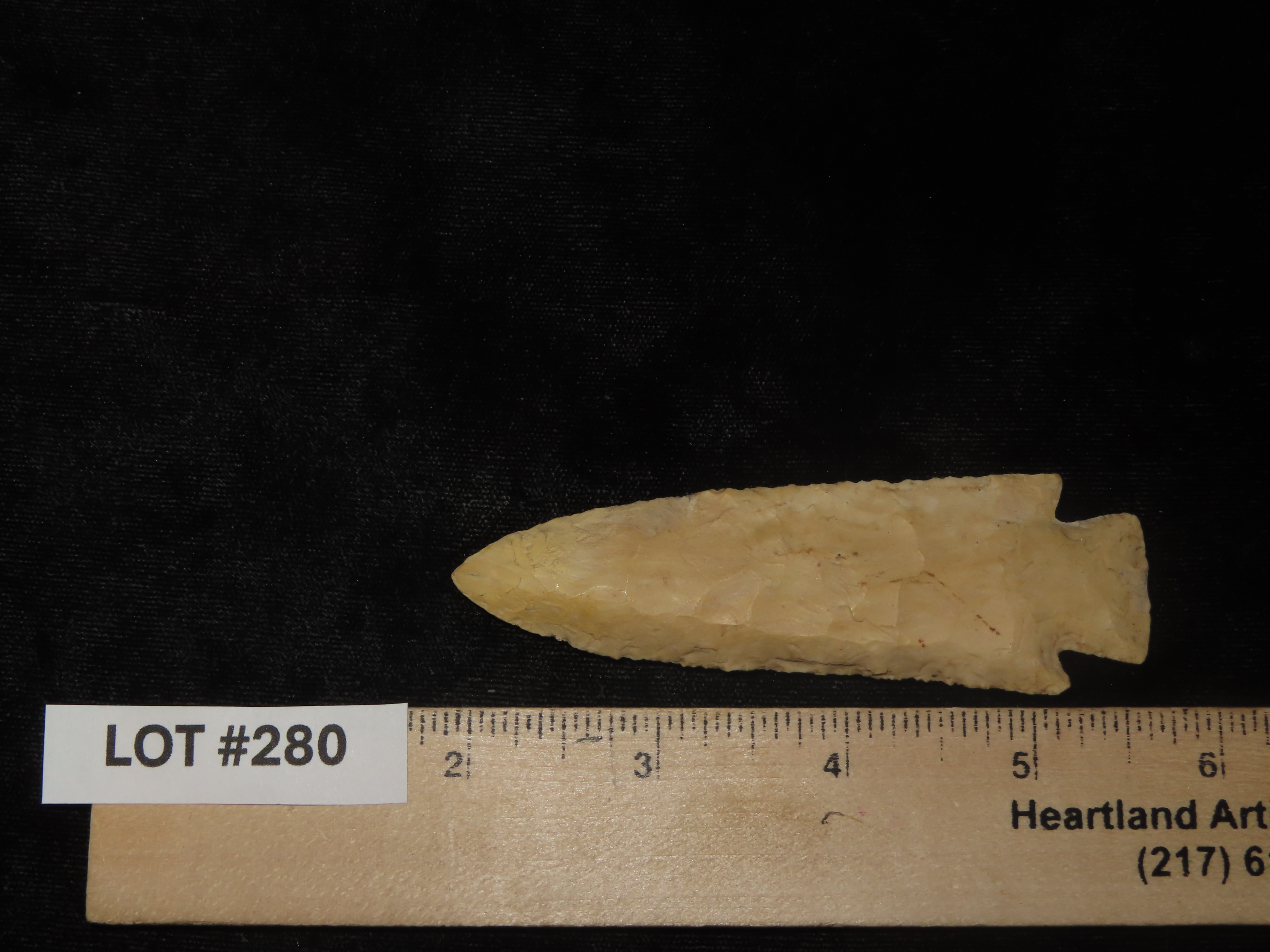 3 3/4″ Hardin, Brown County Illinois *Minor Resto to Tip & 1 Ear* Finely Flaked Example with Steep Bevels & Great Patina. Restored on the tip and a tiny bit of one ear.