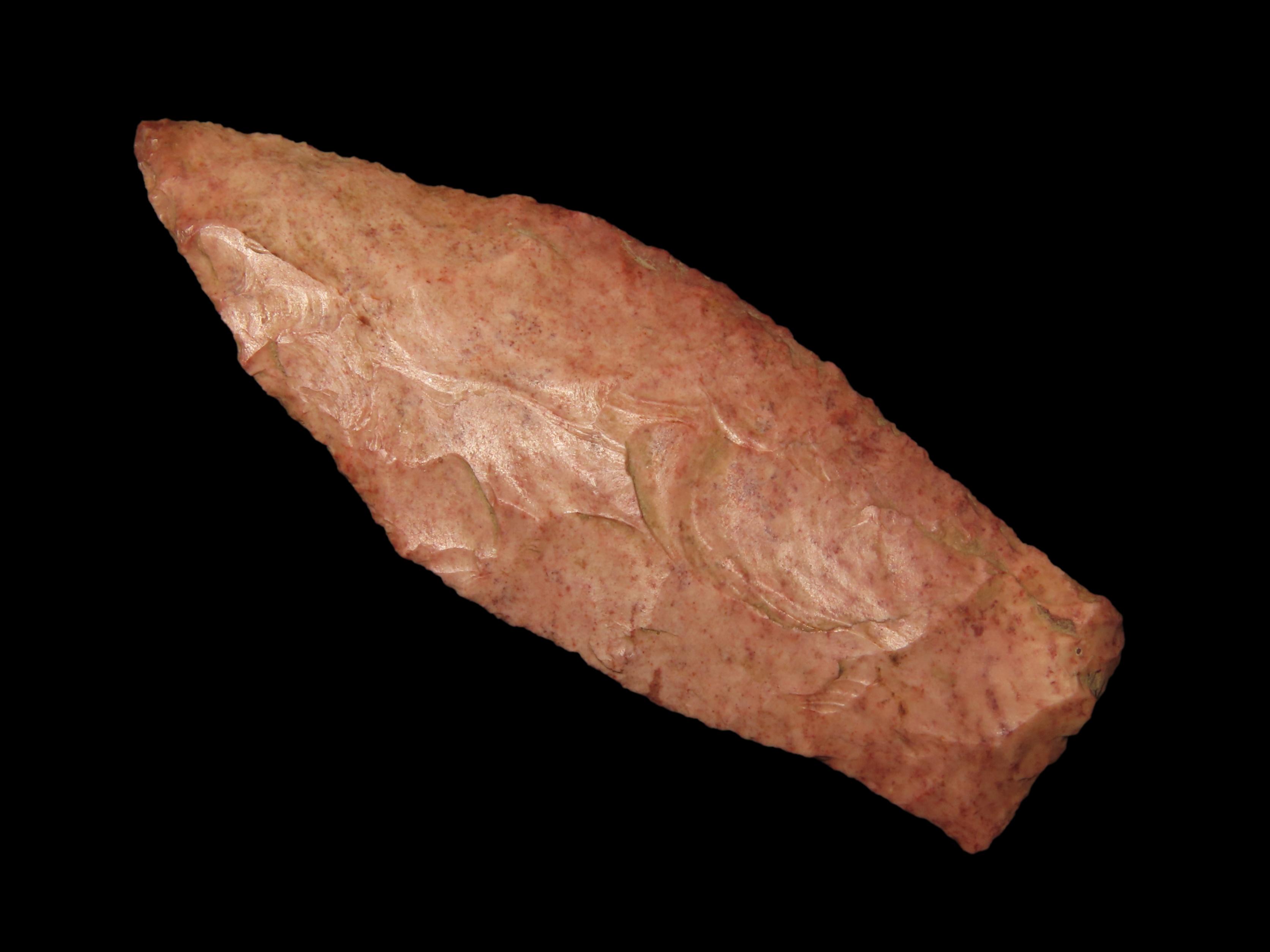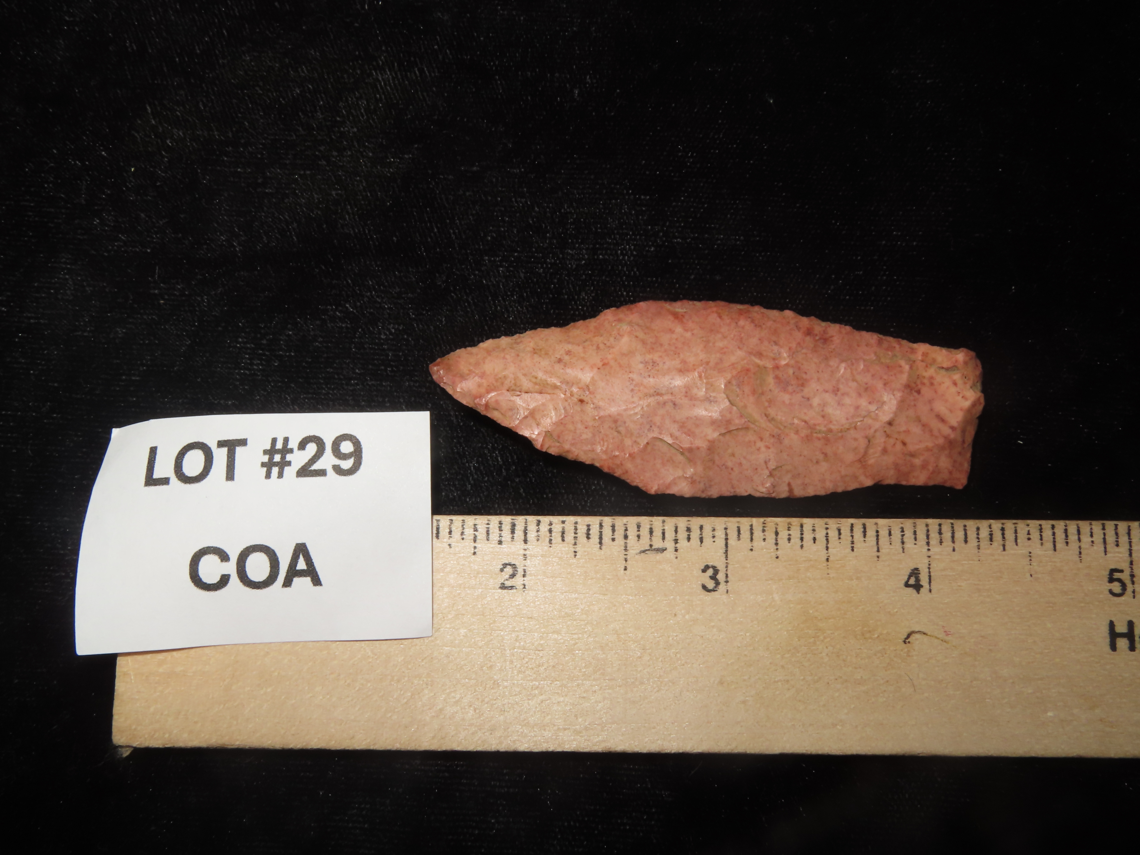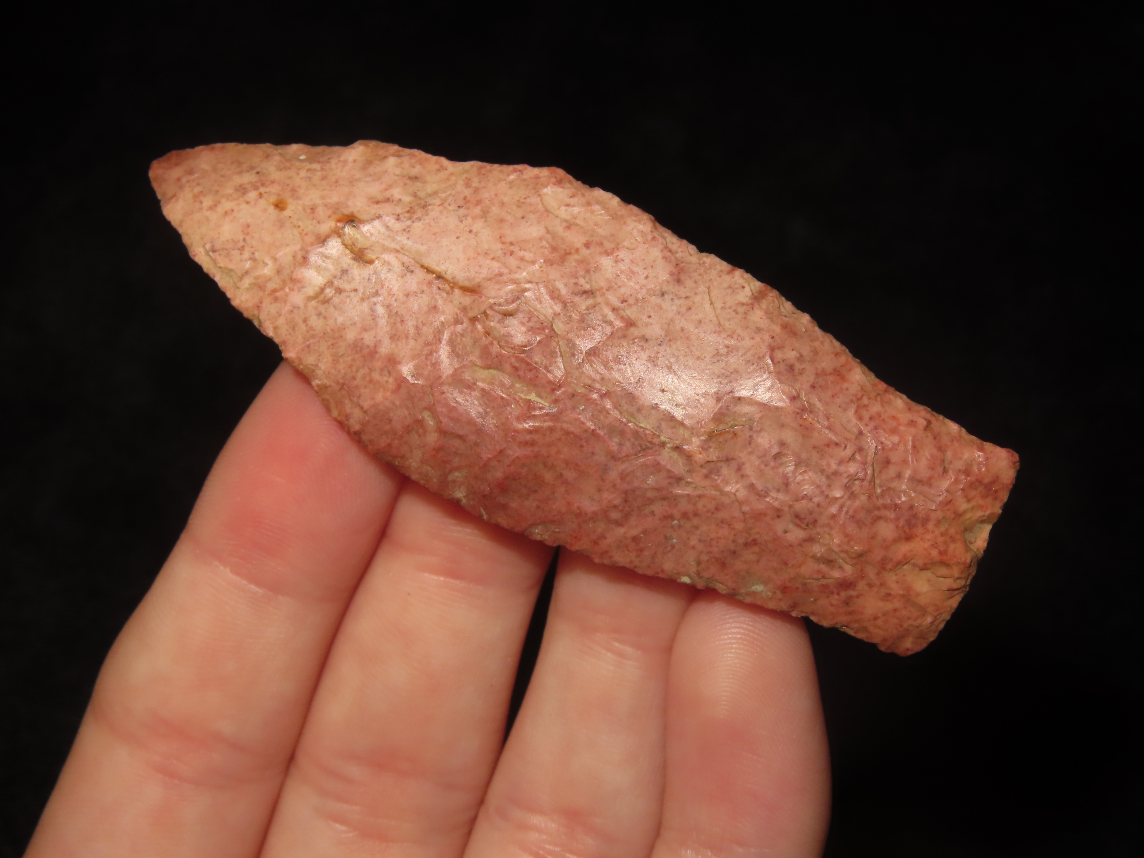 2 13/16″ Beaver Lake, Greene Co Illinois, Motley COA, Beautiful Strawberry Burlington Chert, Thin & Well Flaked, Purposely Flaked with a Twist.
