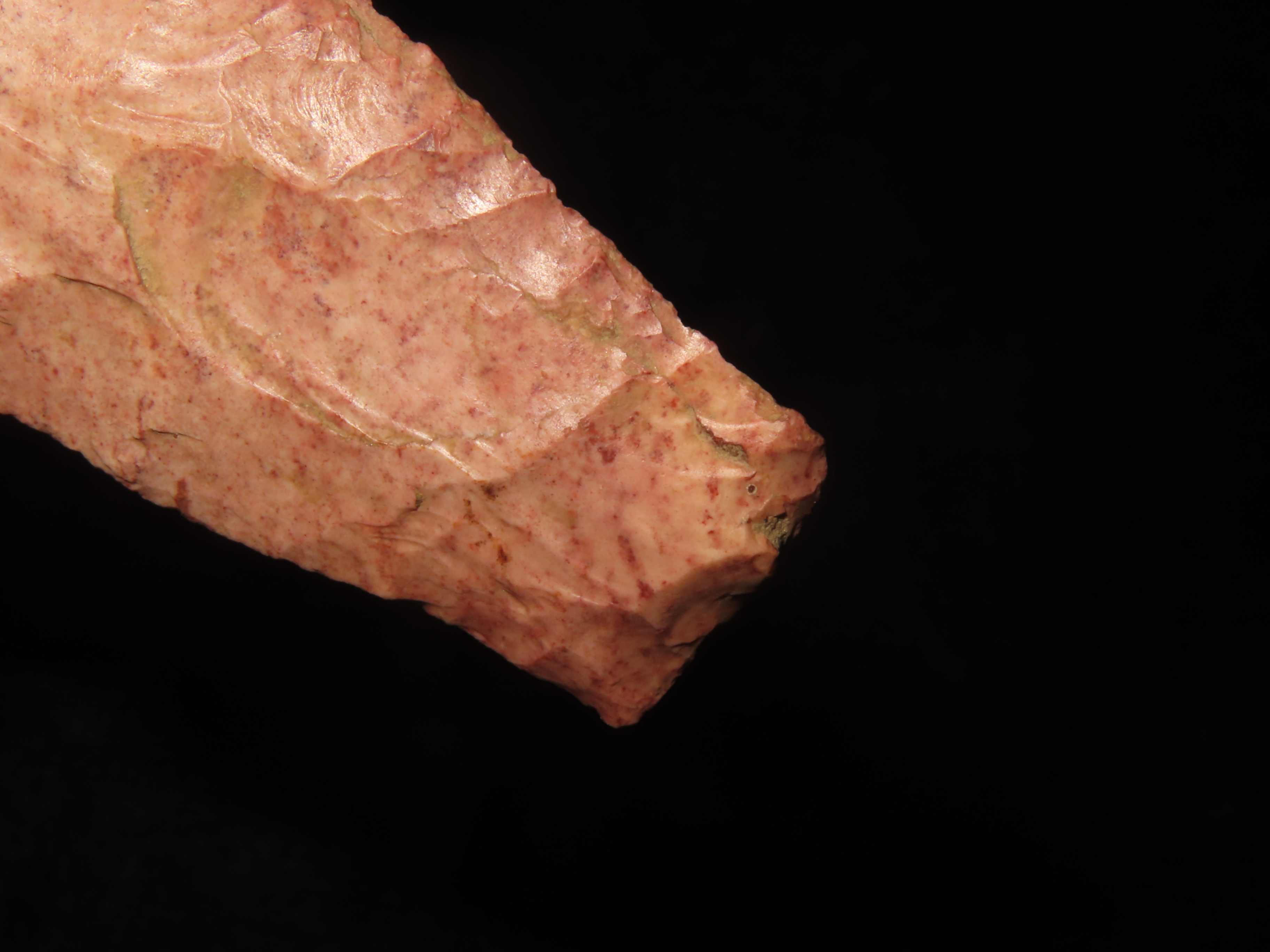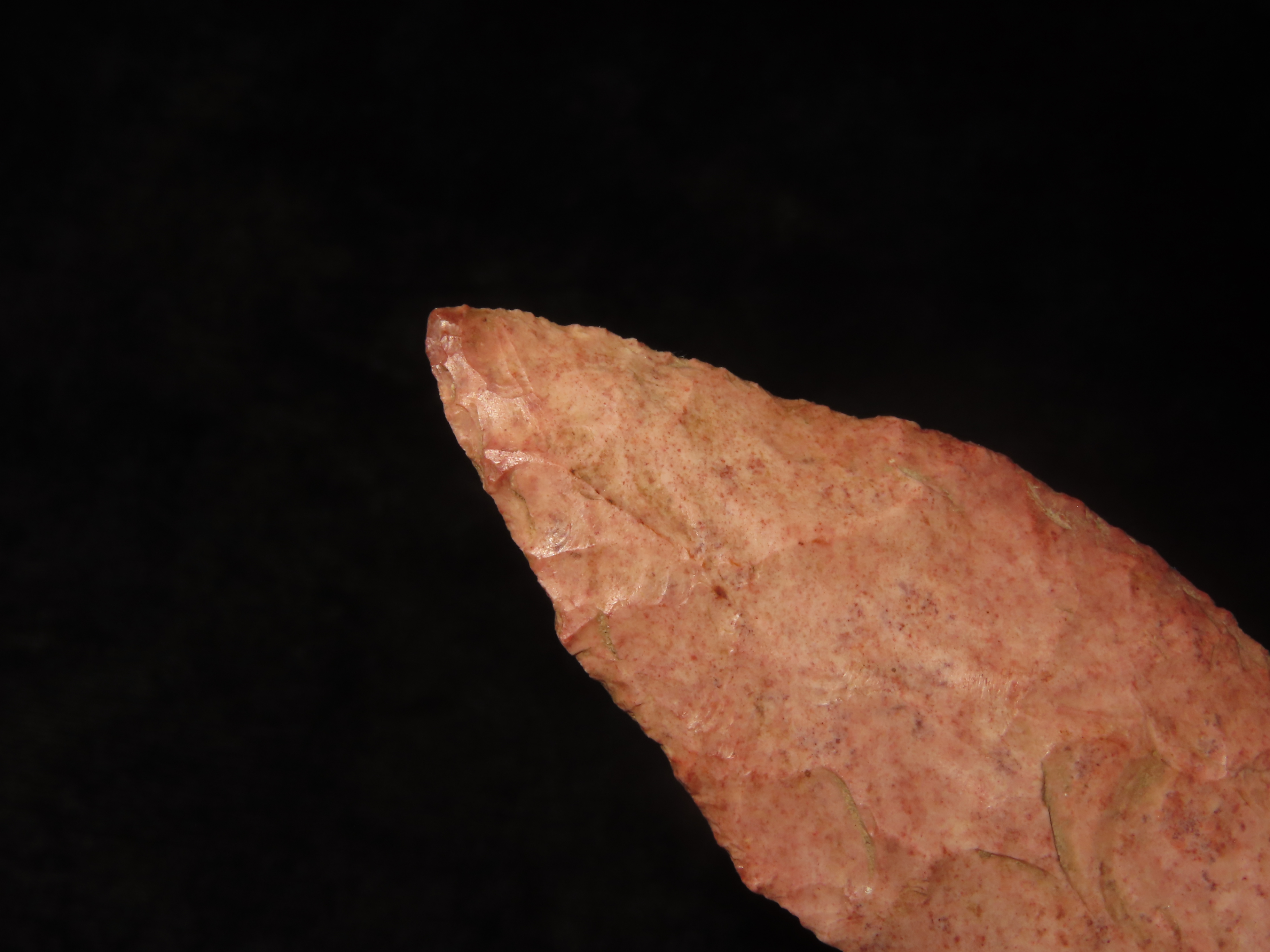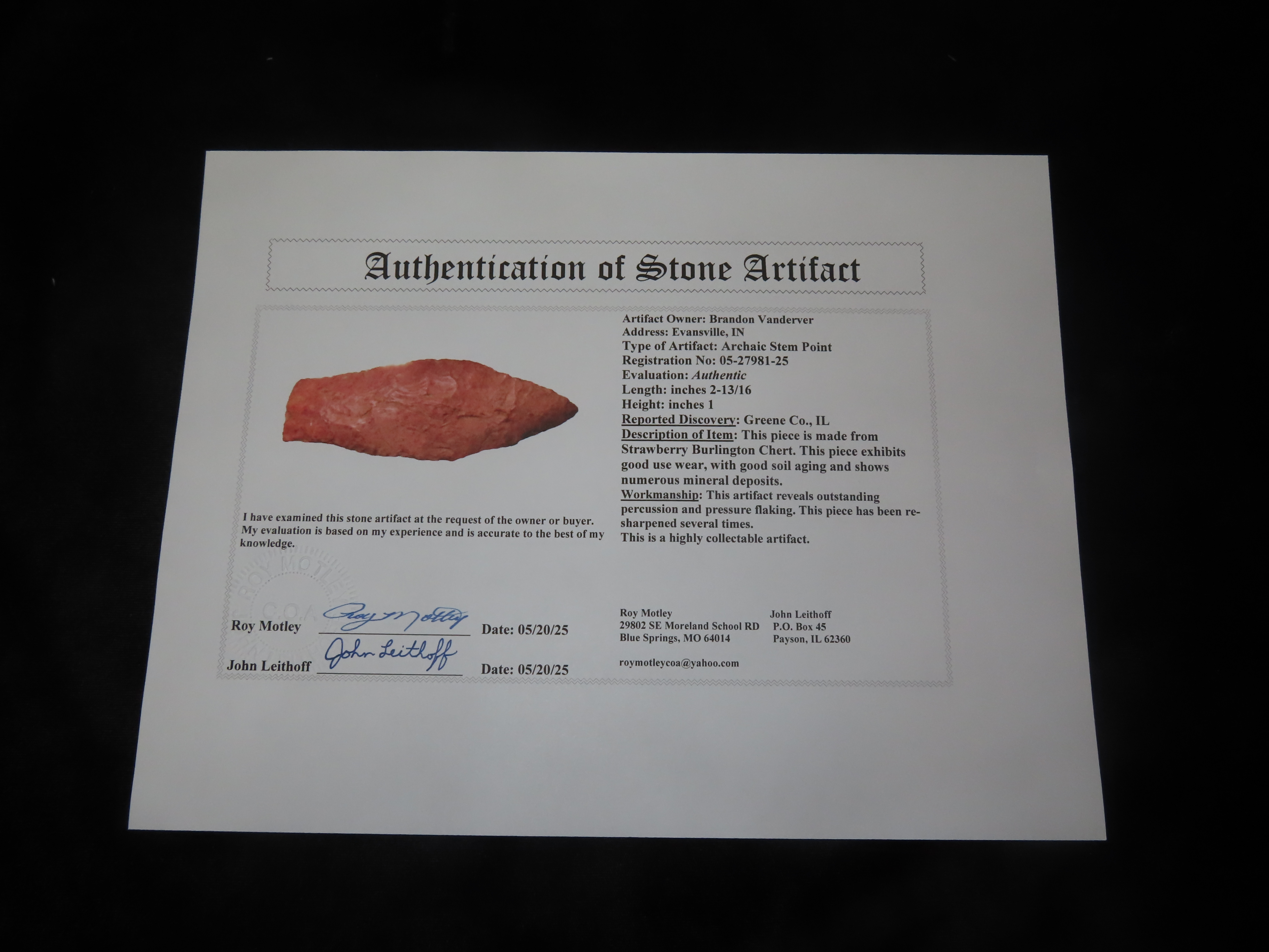 2 13/16″ Beaver Lake, Greene Co Illinois, Motley COA, Beautiful Strawberry Burlington Chert, Thin & Well Flaked, Purposely Flaked with a Twist.