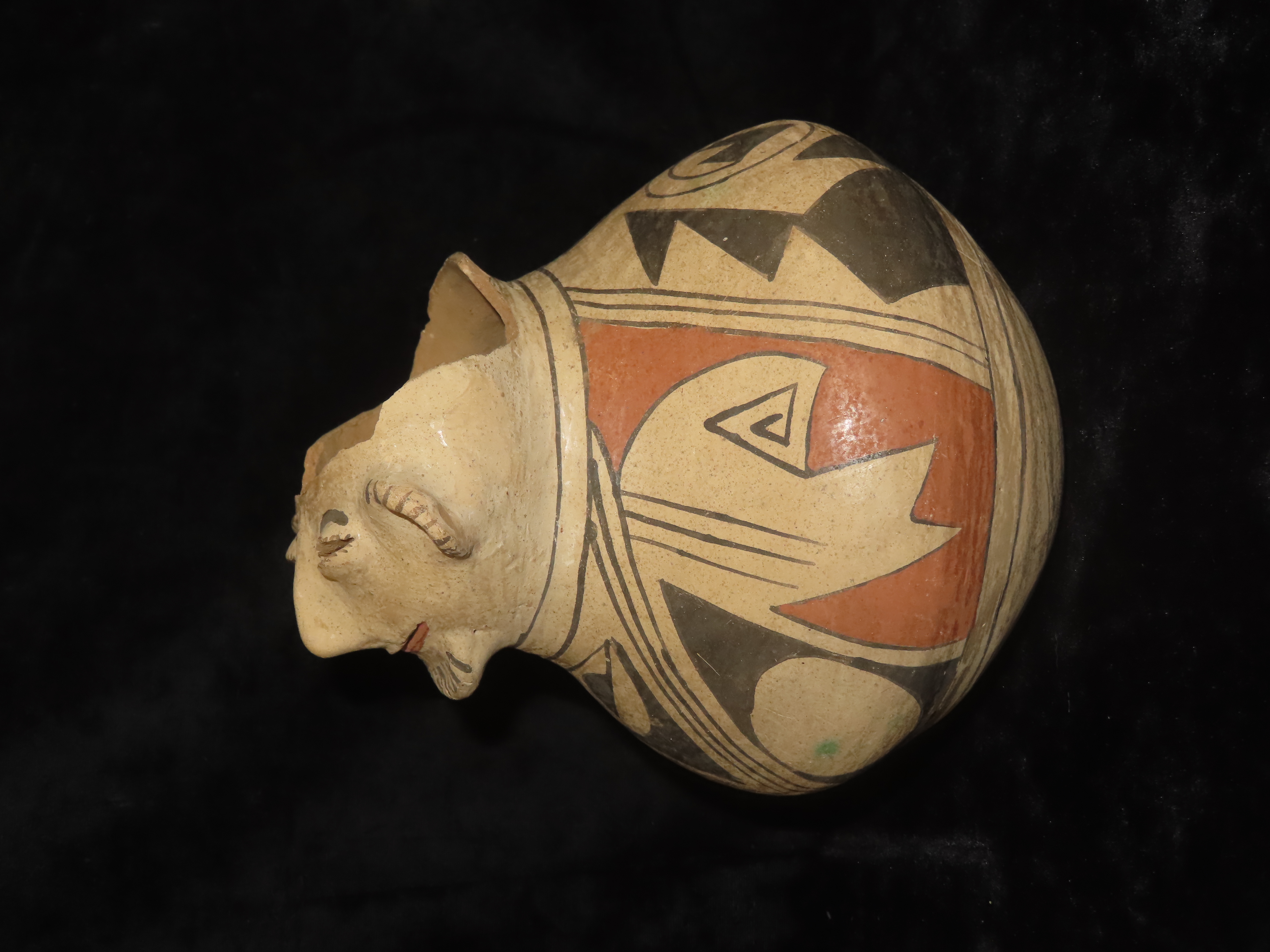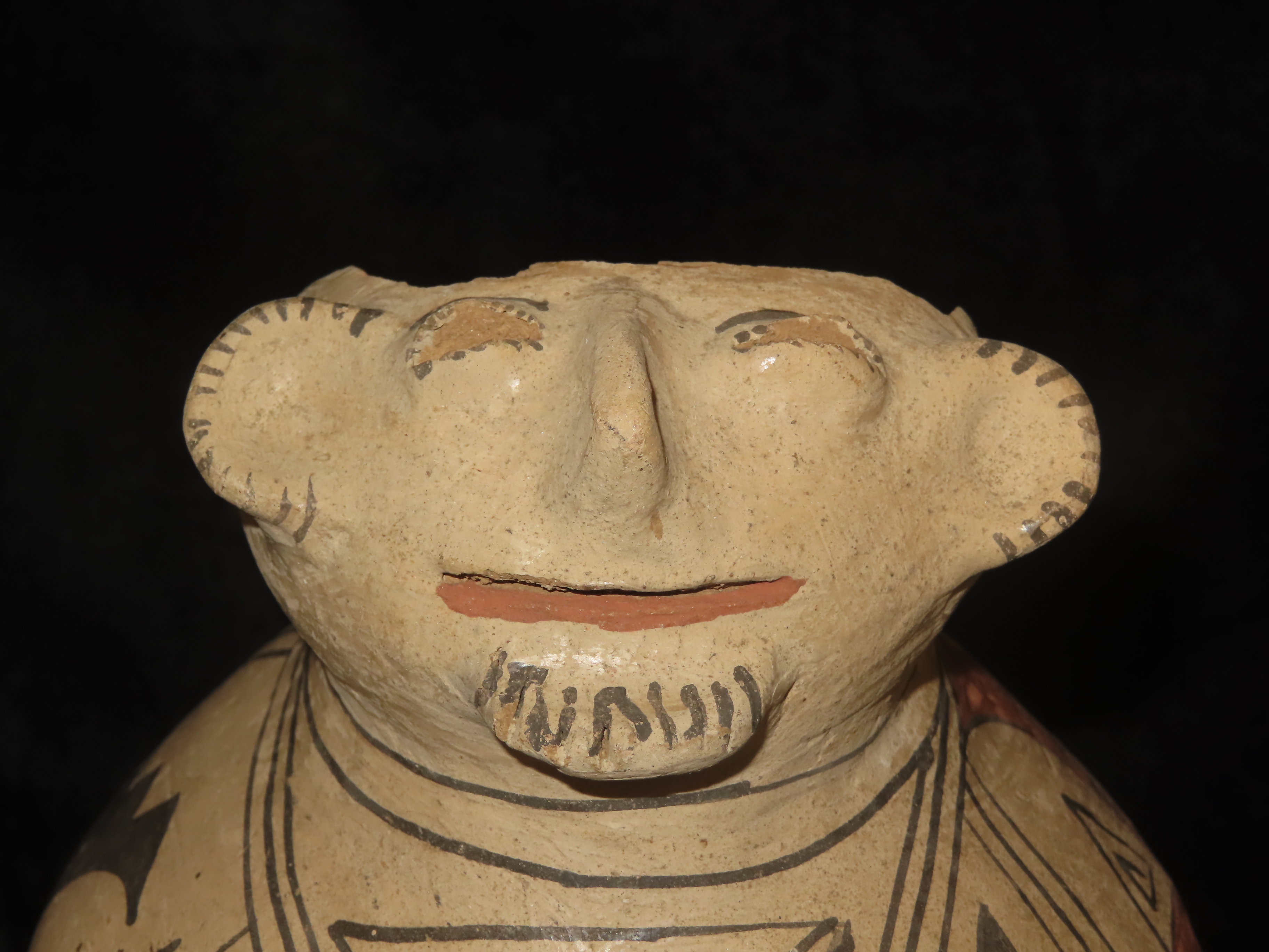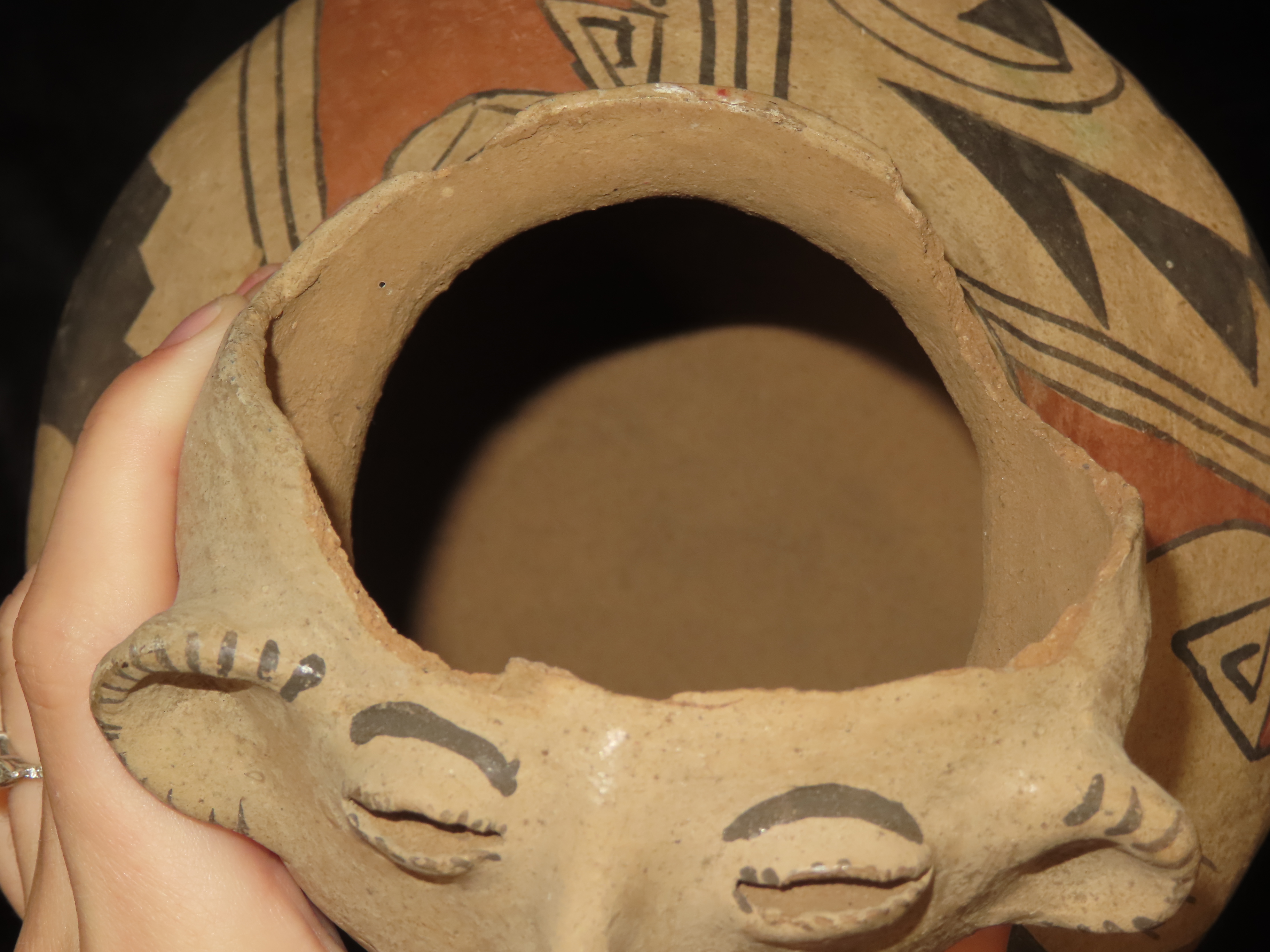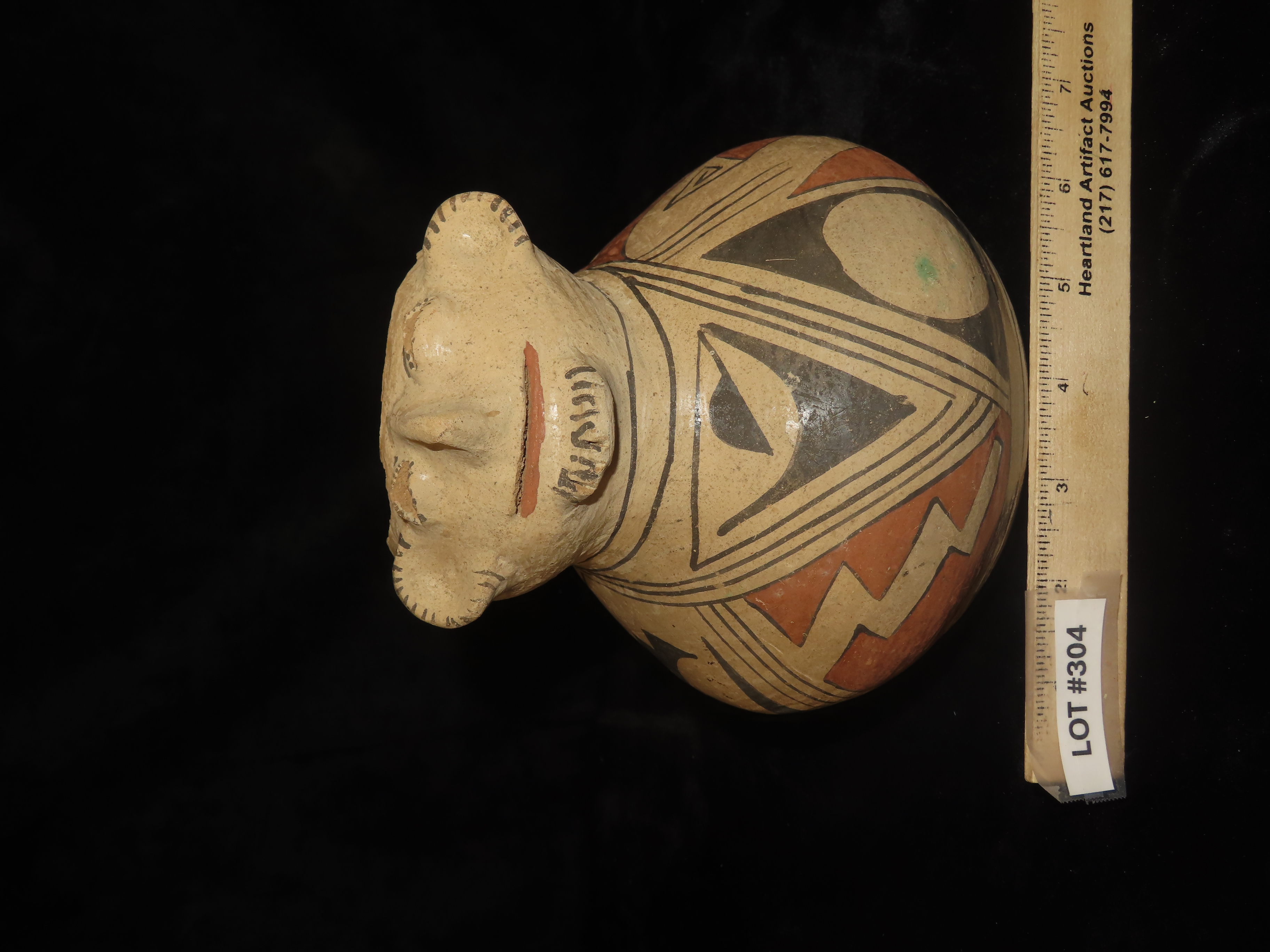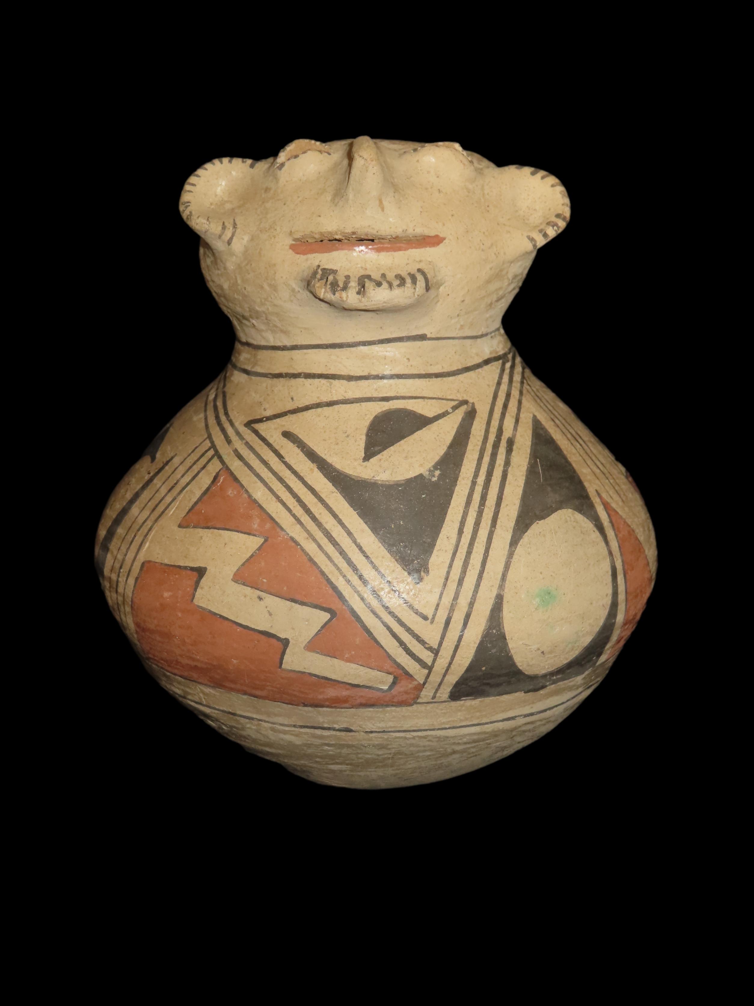 Incredible 7″ Tall Casas Grandes Figural Olla, Human Effigy Pottery Vessel. Great Original hand painted Polychrome Geometric Designs, Solid with No repairs or restoration, Circa 1280 to 1440 CE.