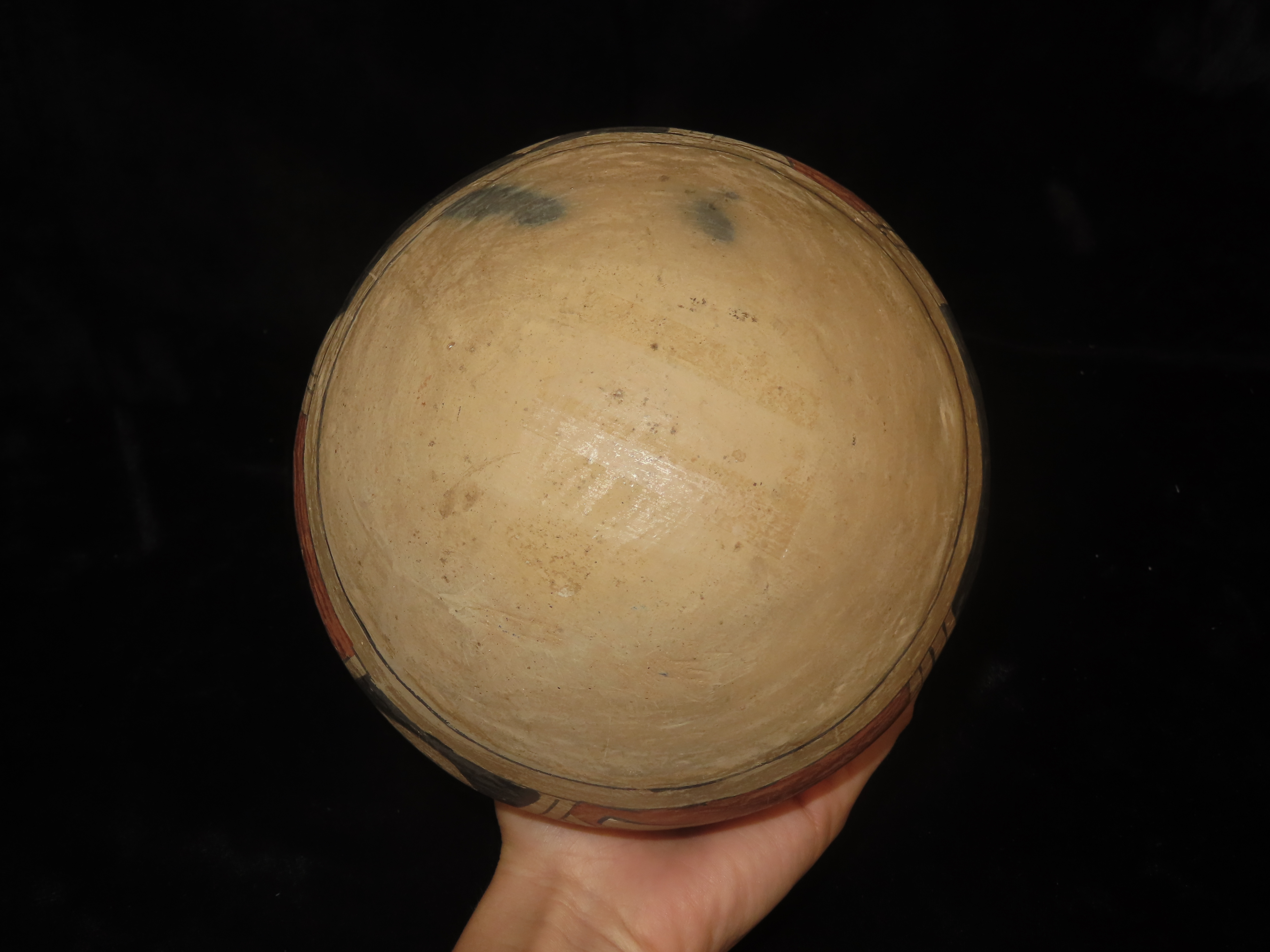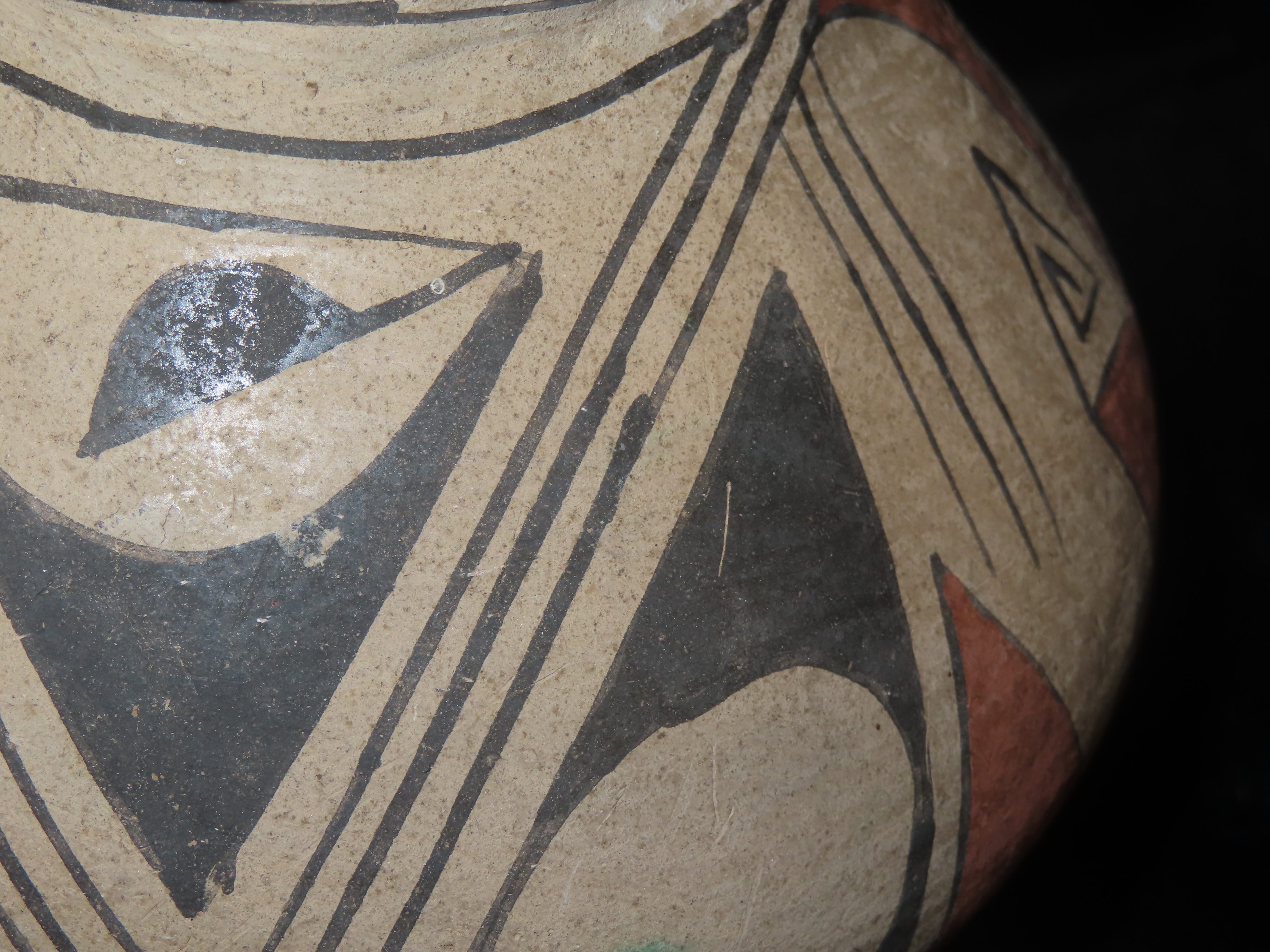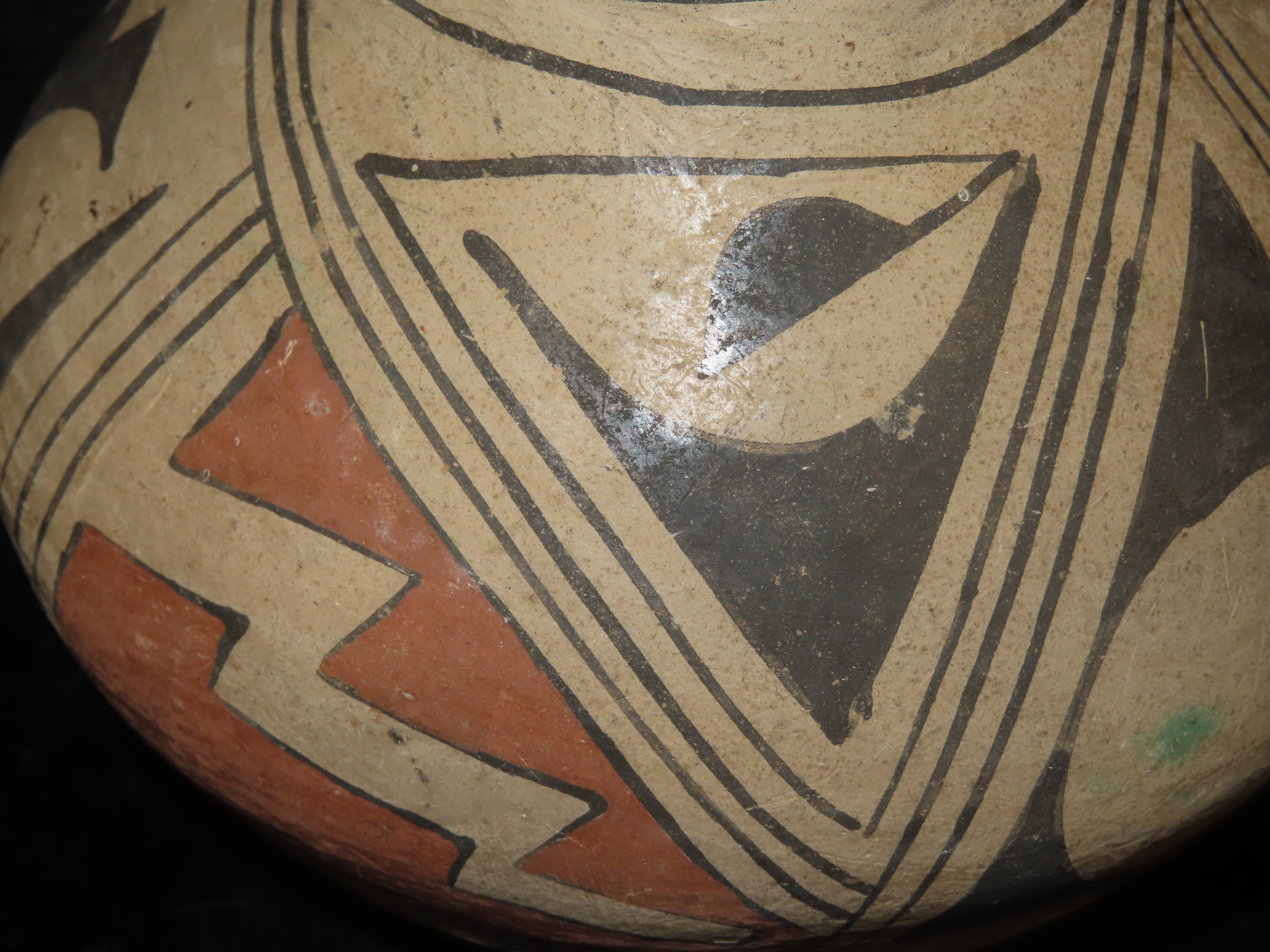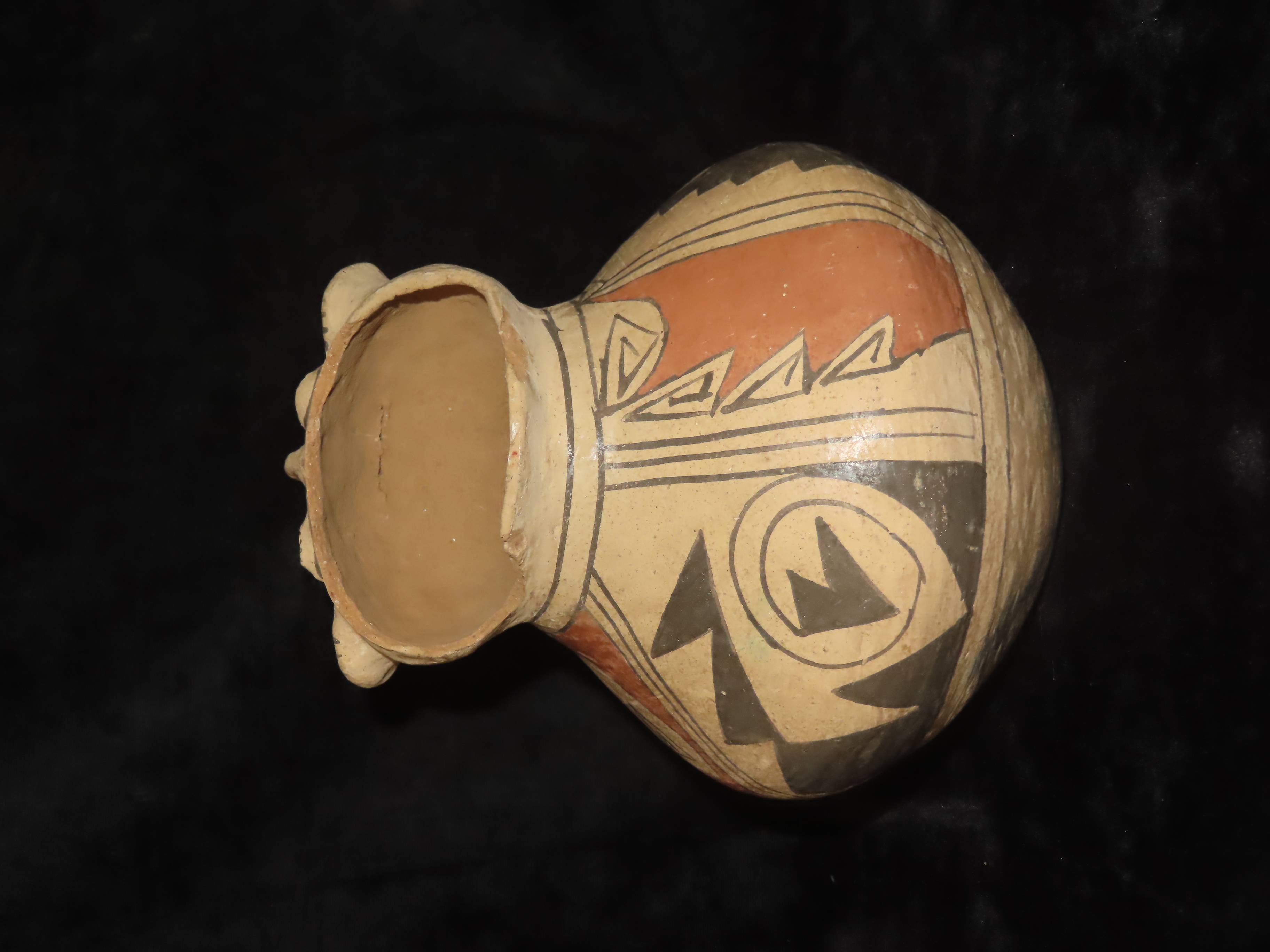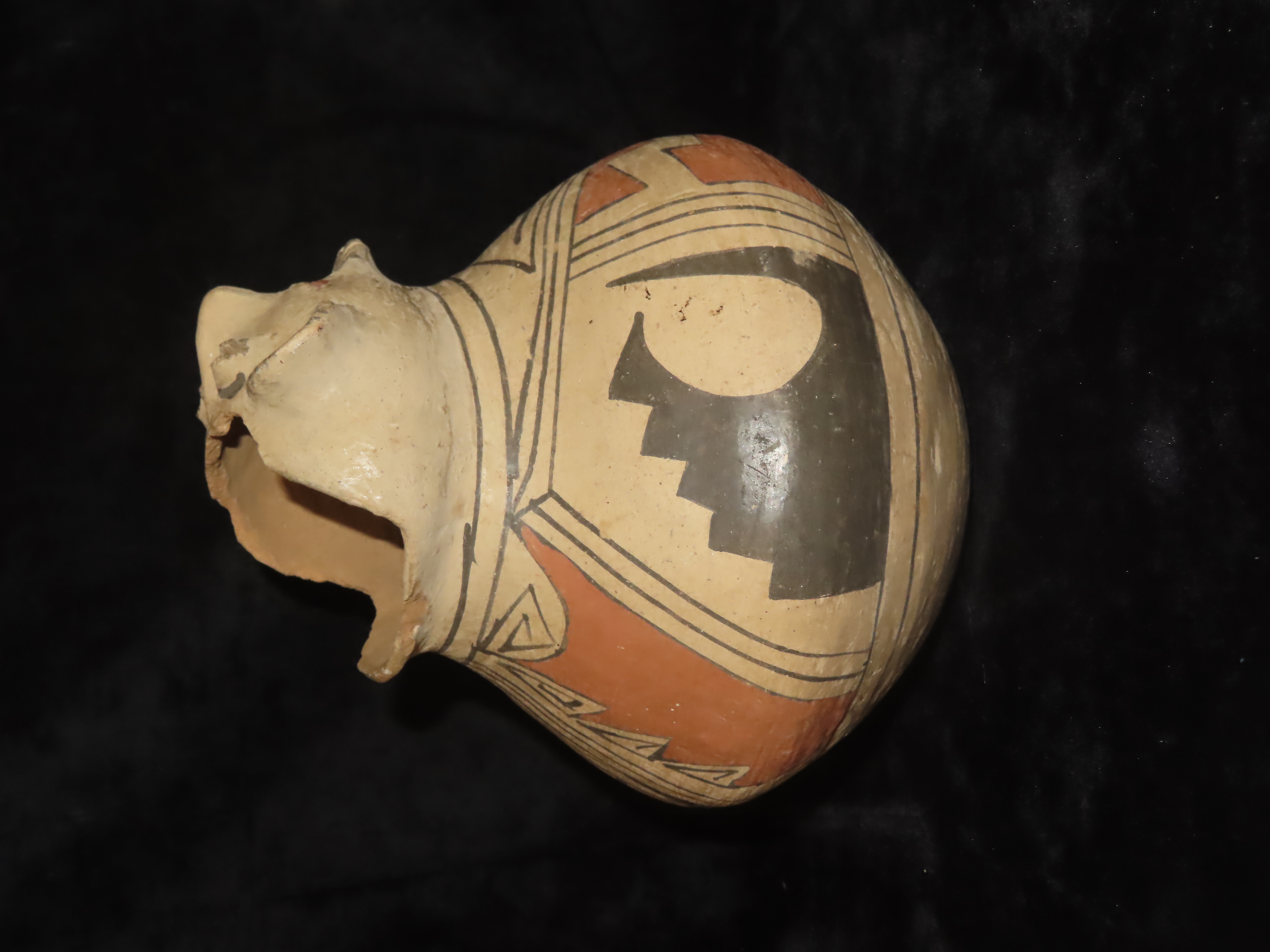 Incredible 7″ Tall Casas Grandes Figural Olla, Human Effigy Pottery Vessel. Great Original hand painted Polychrome Geometric Designs, Solid with No repairs or restoration, Circa 1280 to 1440 CE.
