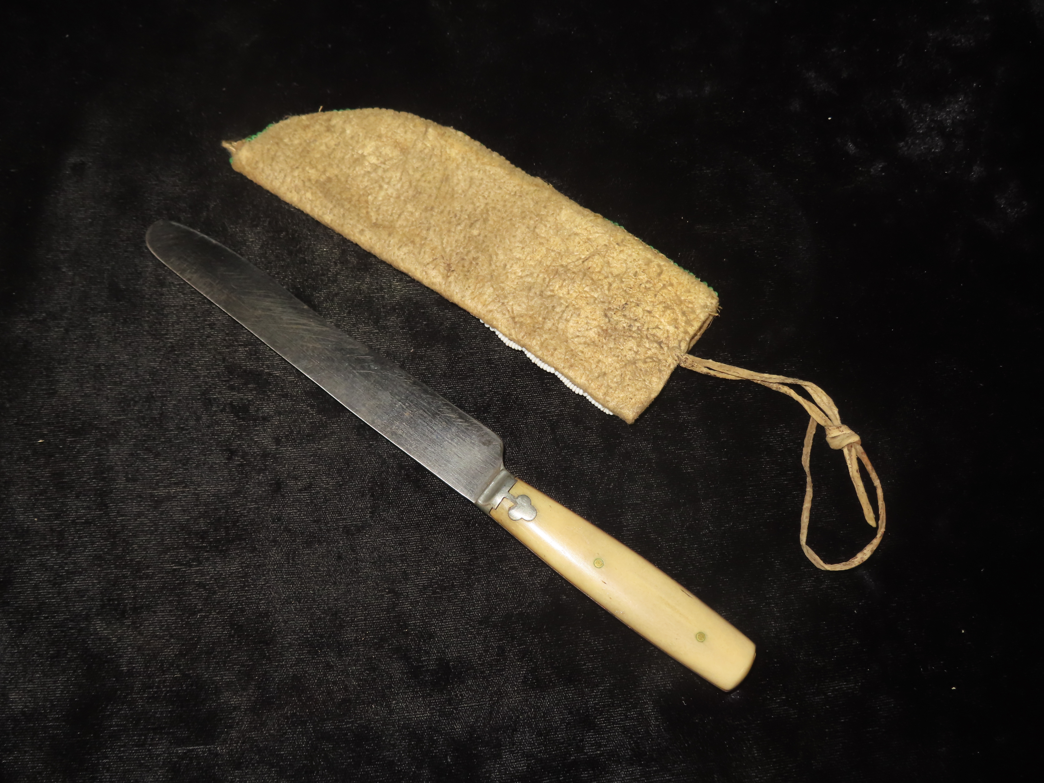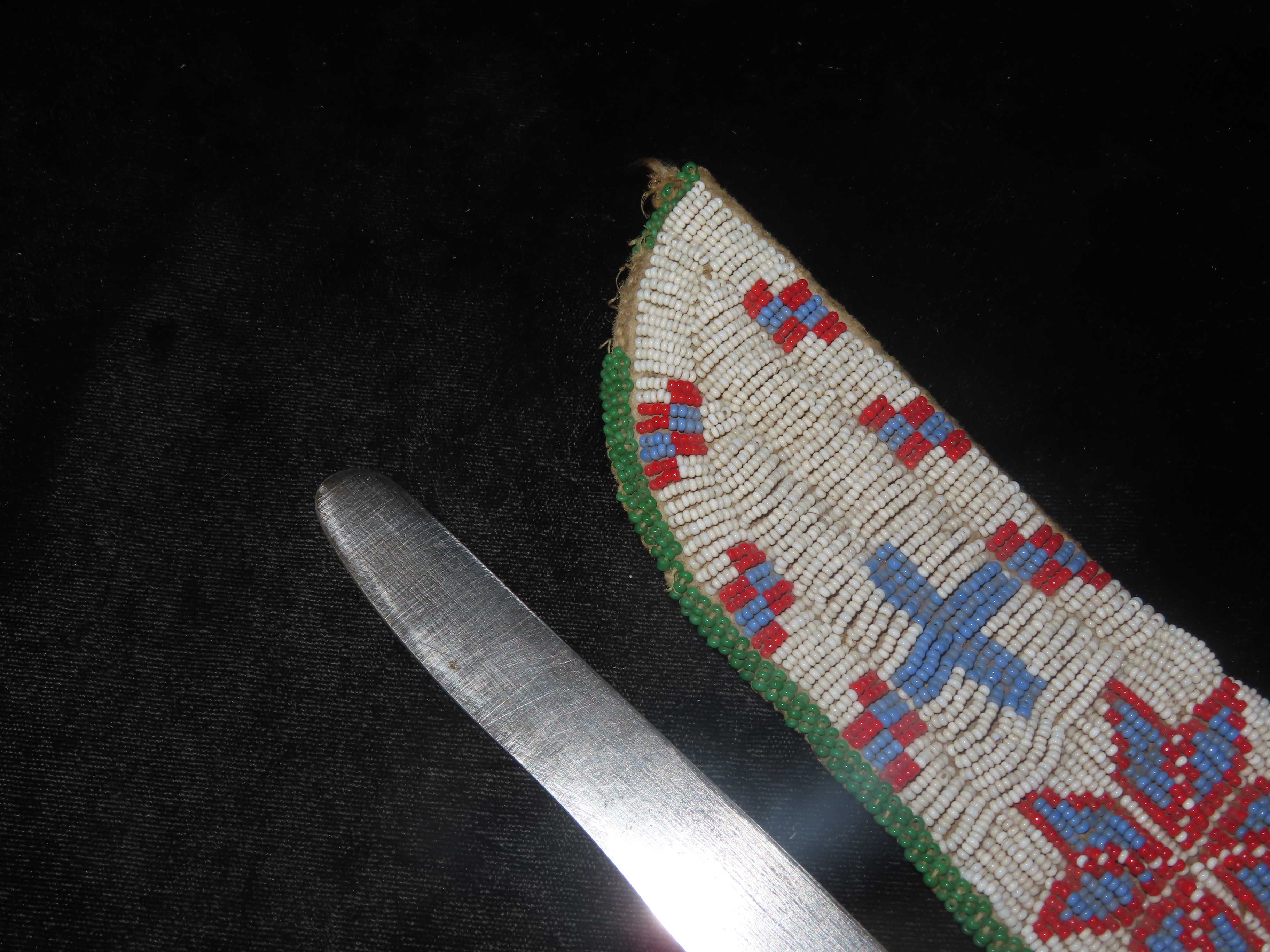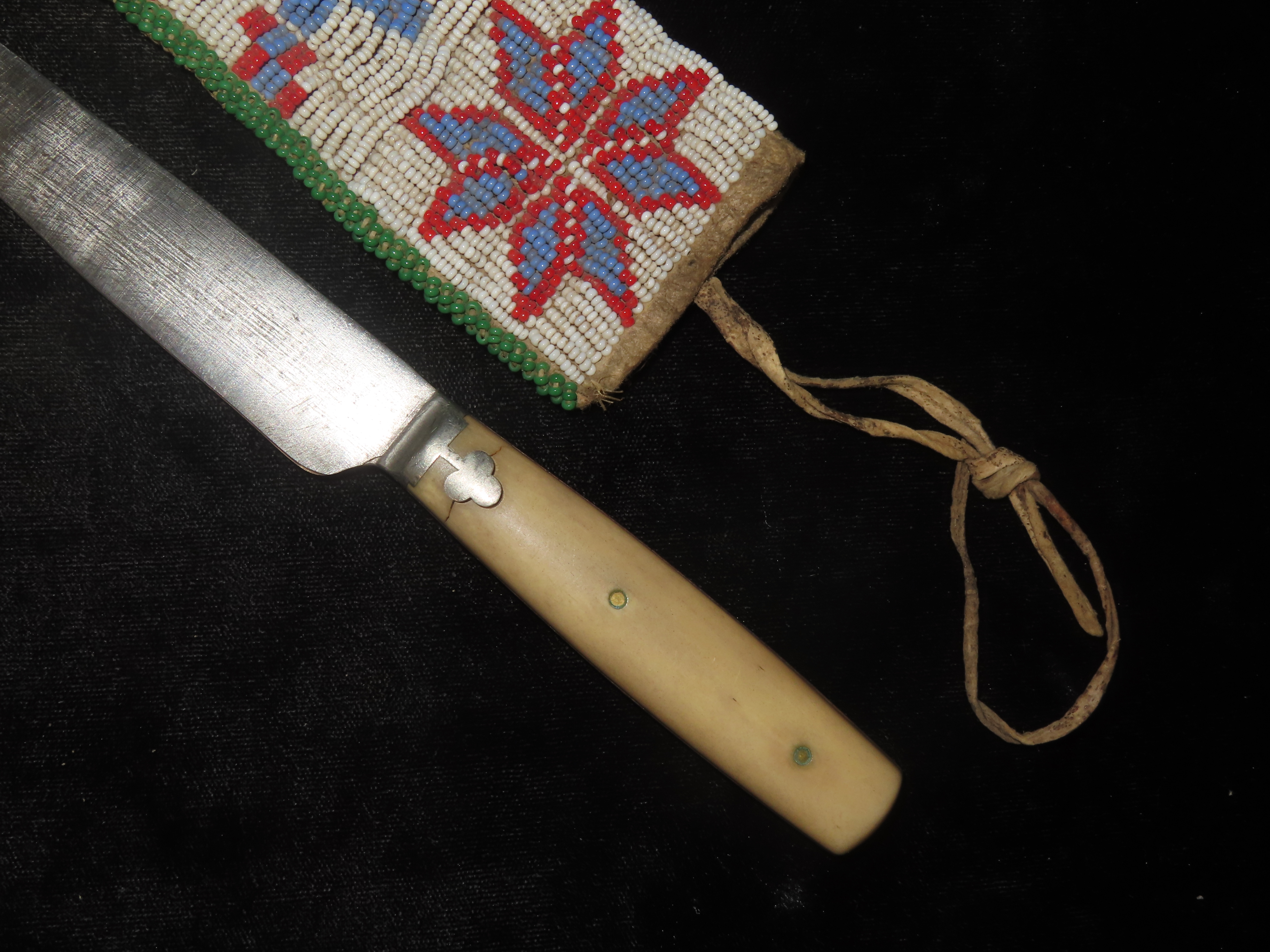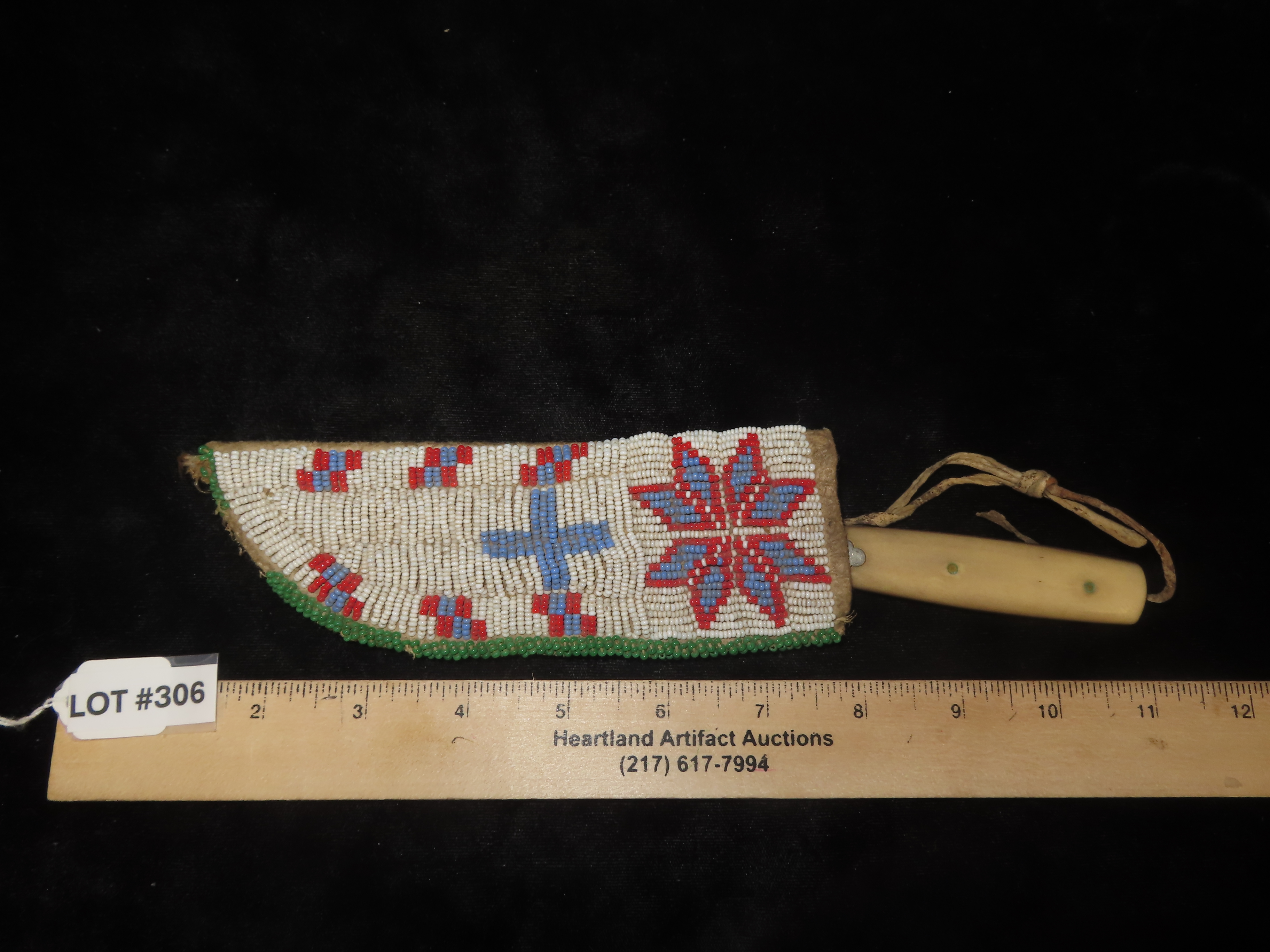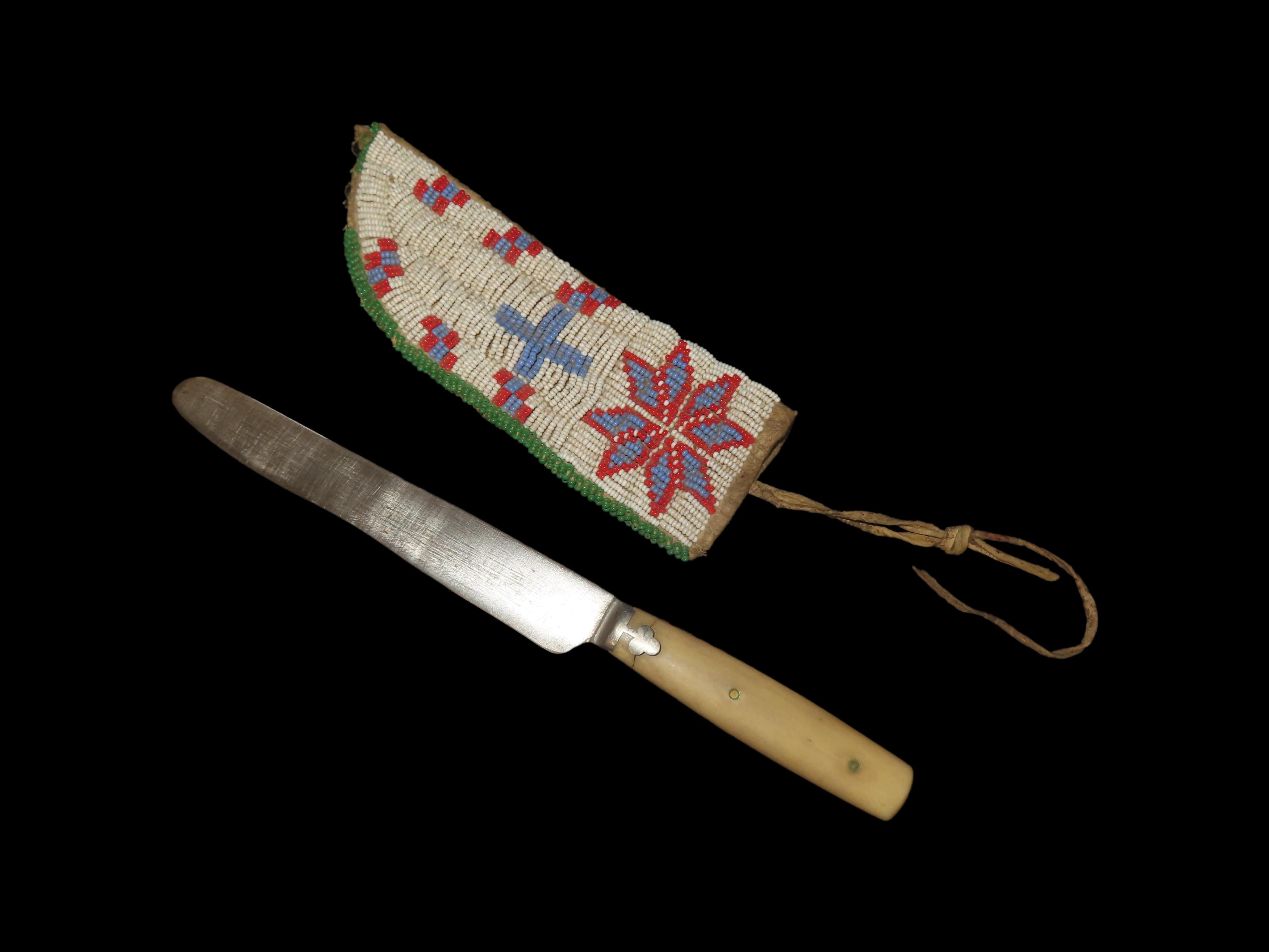 AMAZING HISTORIC PLAINS INDIAN BEADED KNIFE SHEATH, CIRCA 1800’S, SIOUX / LAKOTA INDIANS, GREAT OLD EXAMPLE, MINIMAL BEAD LOSS, EX PRIVATE OHIO COLLECTION THAT SPANNED BACK 3 GENERATIONS