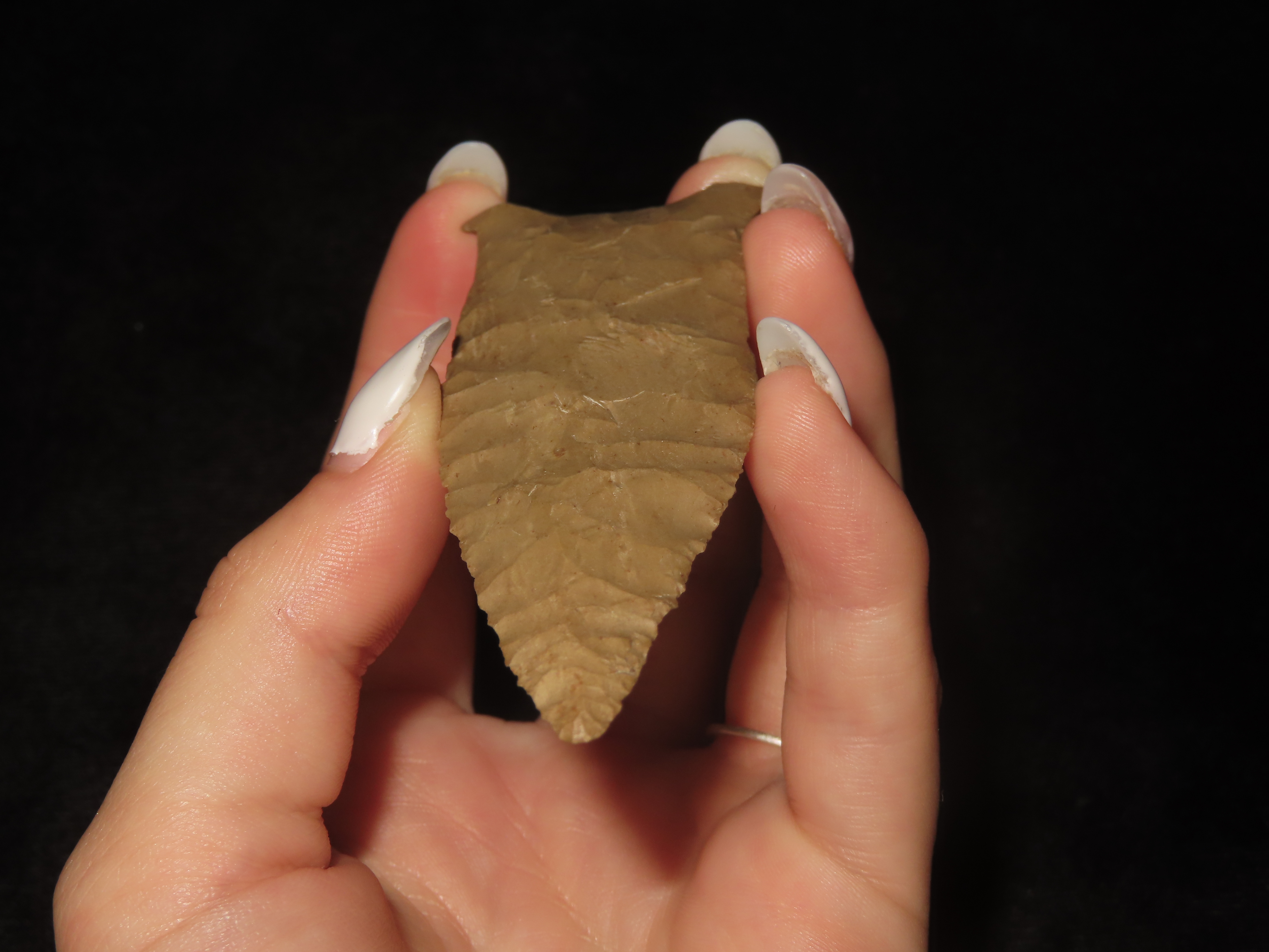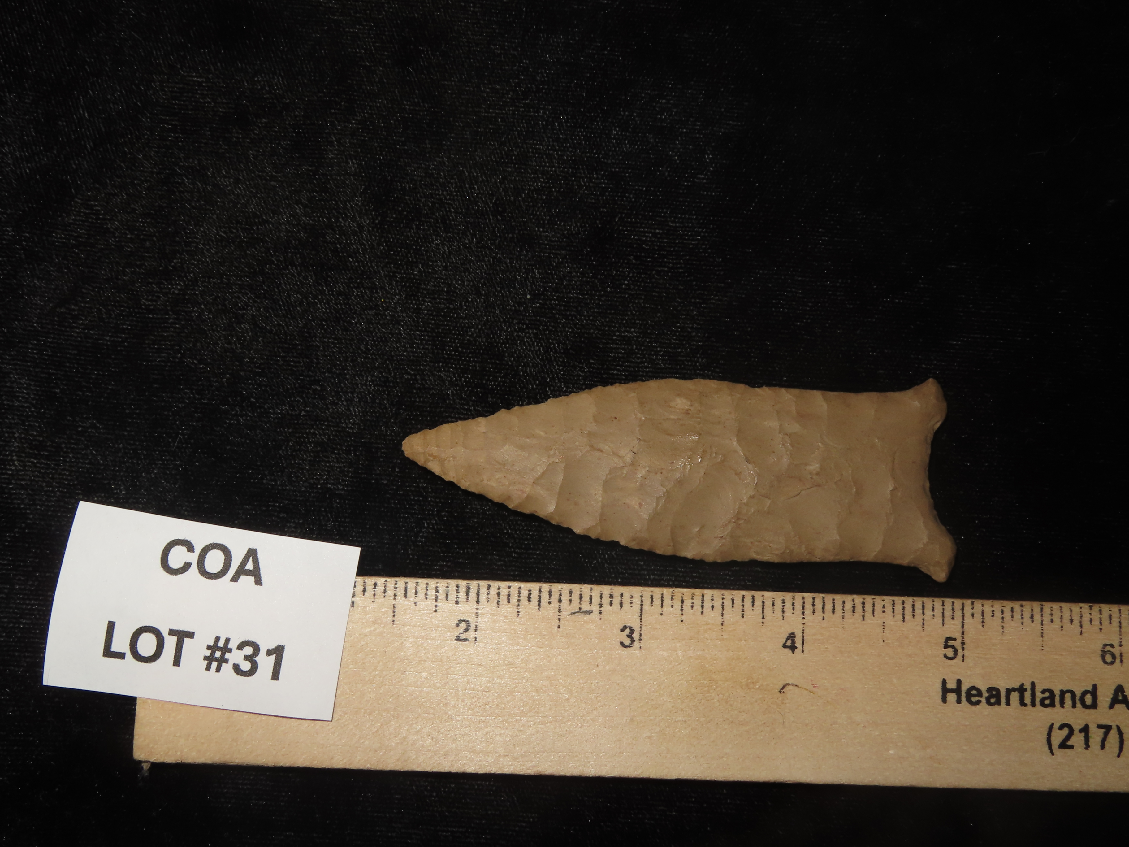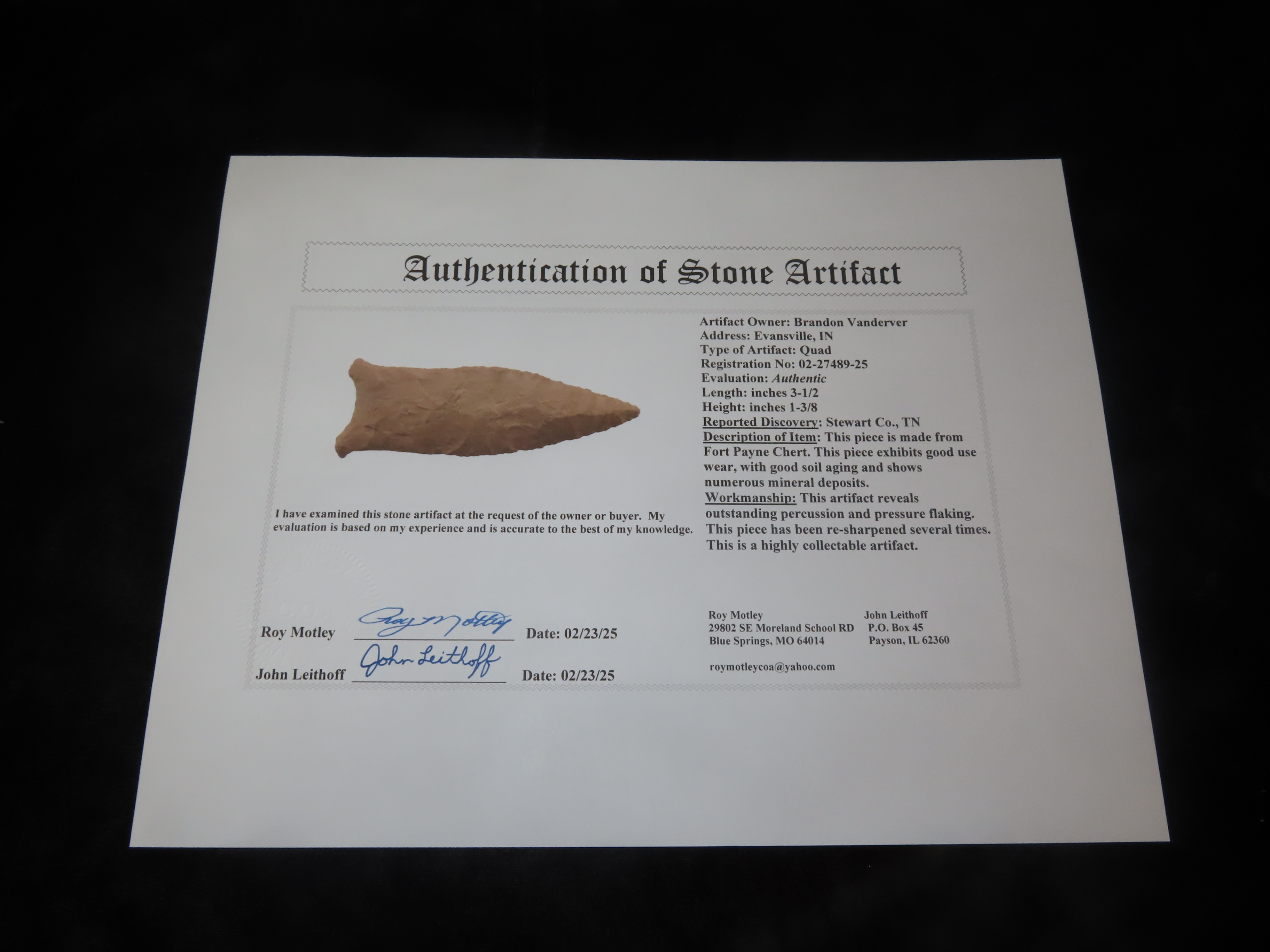 Impressive 3 1/2″ Paleo Quad, Stewart Co. Tennessee, Motley COA. Very Thin & Expertly Flaked Example, Great patina, Indian Arrowhead, Artifact, Spear