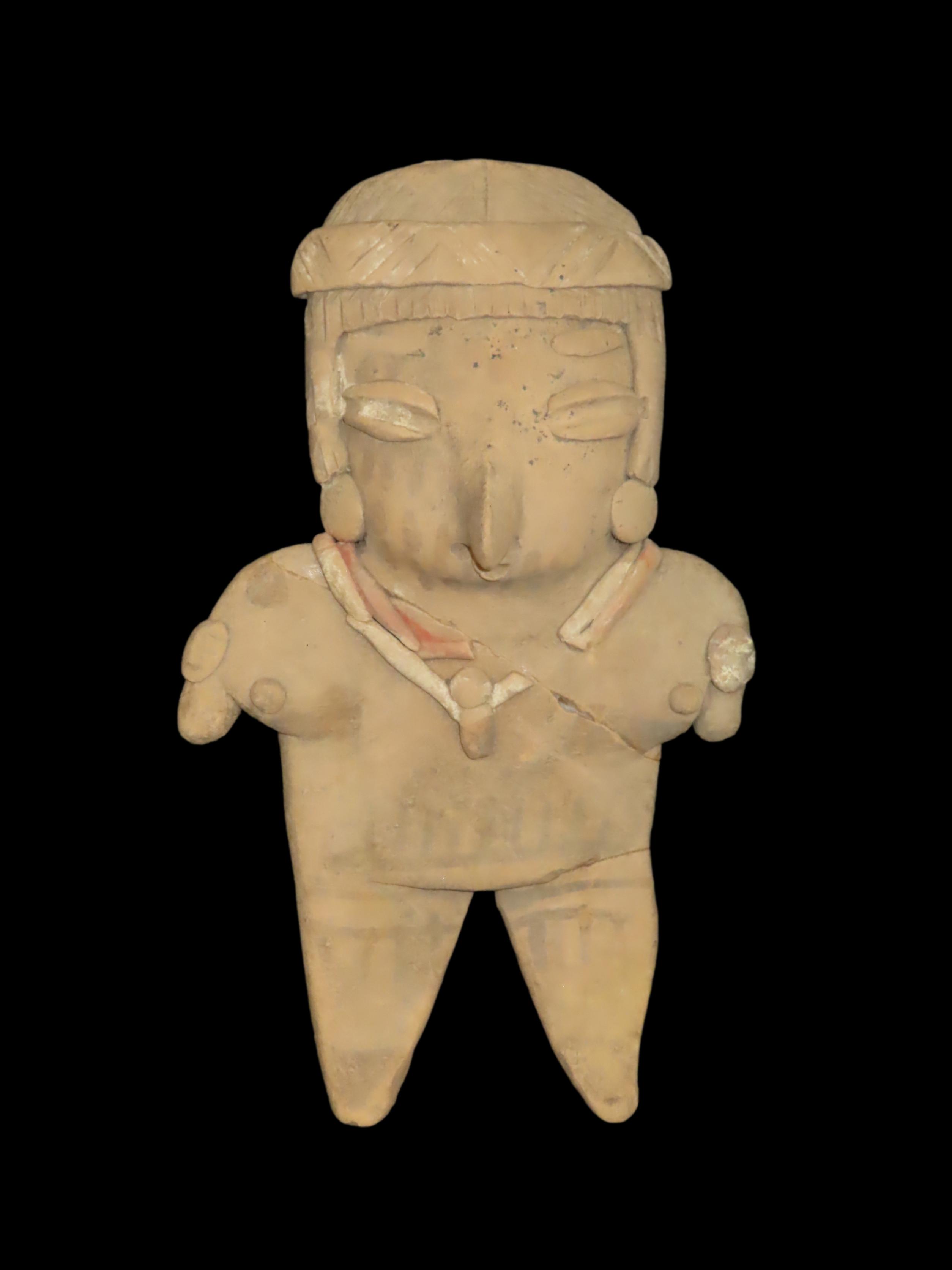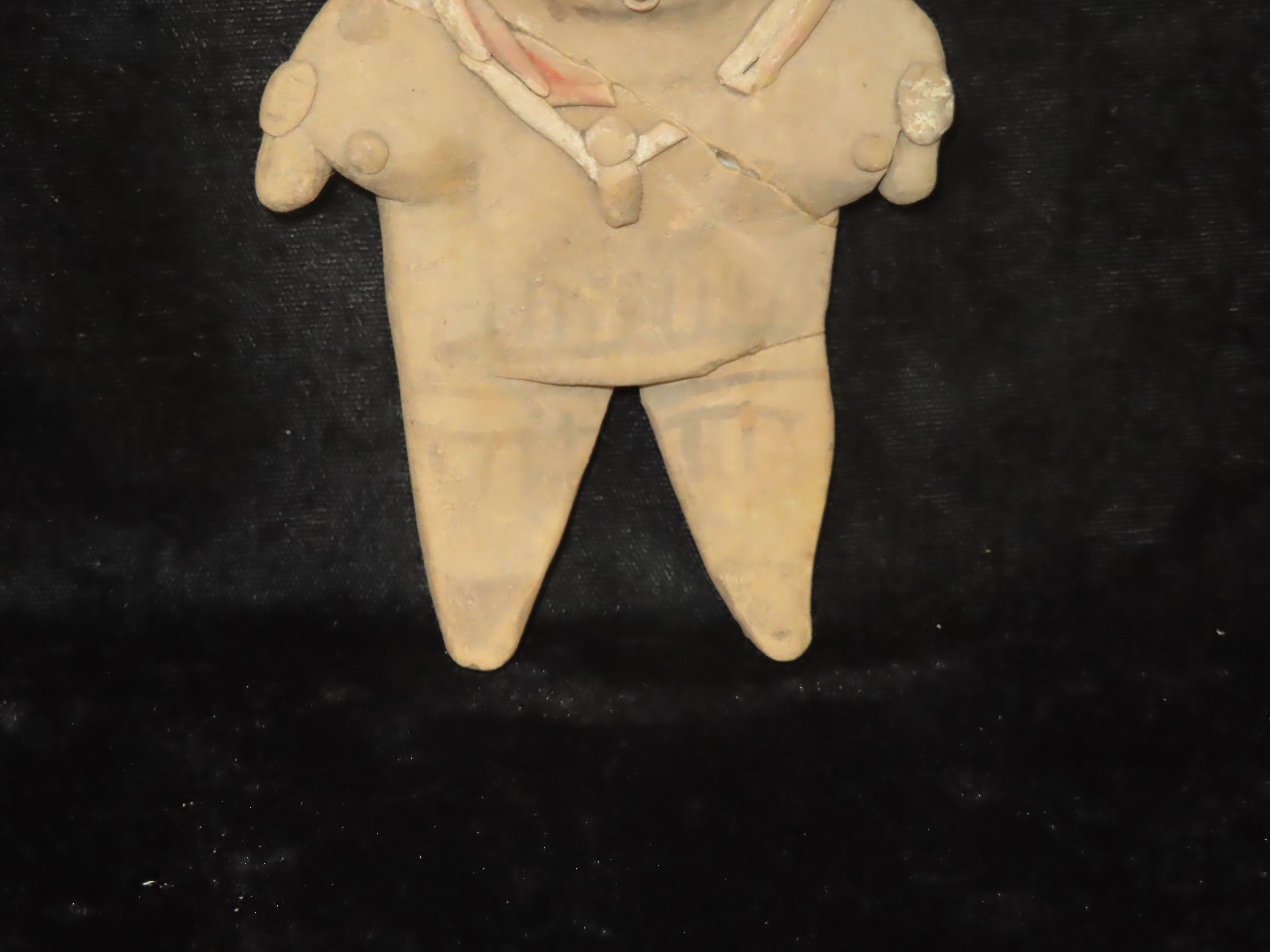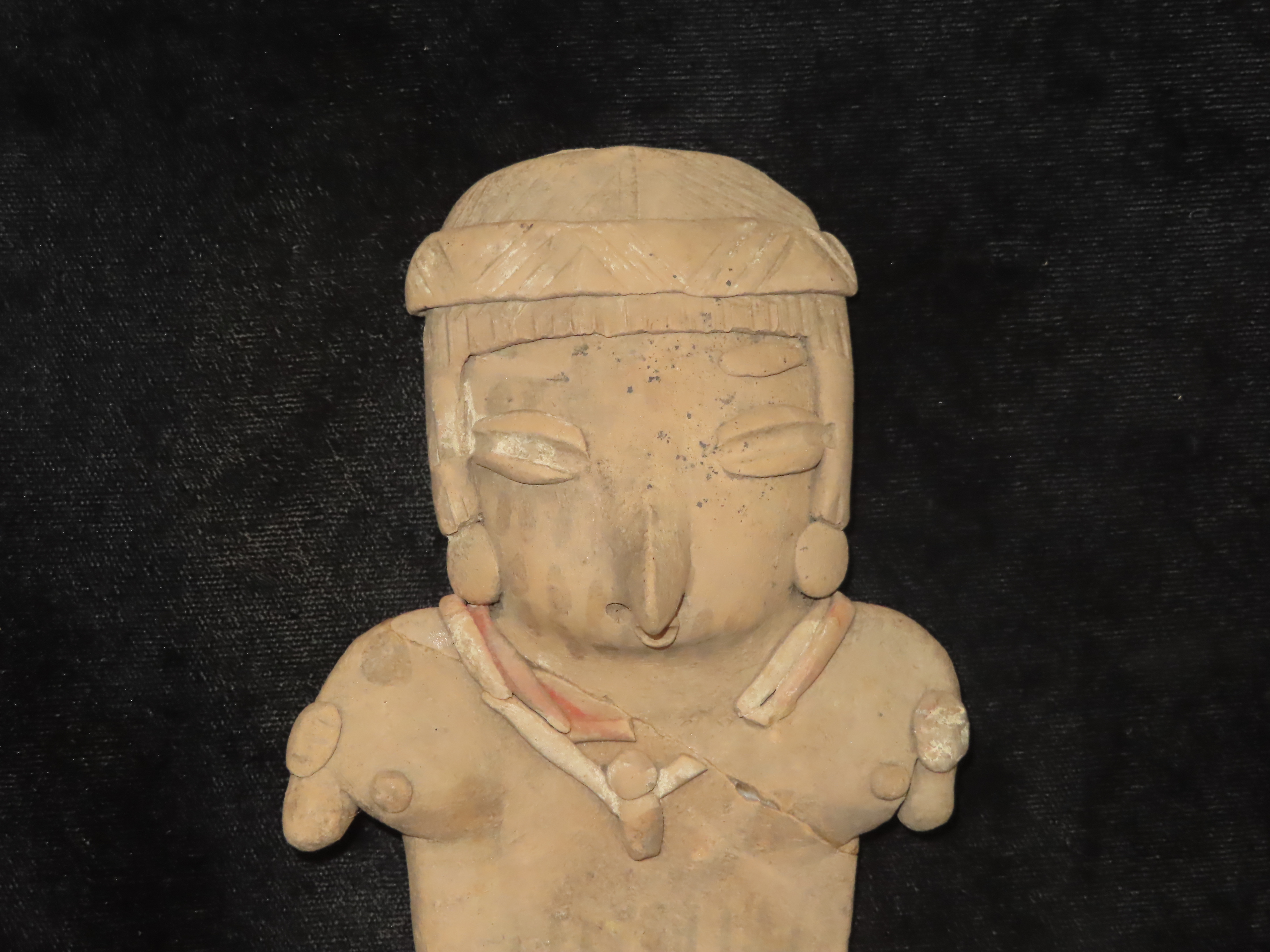 Large Chupicuaro Flat Figure. Mexico. Terracotta. 5 3/4″. Ex Dr Harner. Repaired across chest, with loss to necklace. Traces of paint still present, which is rare.