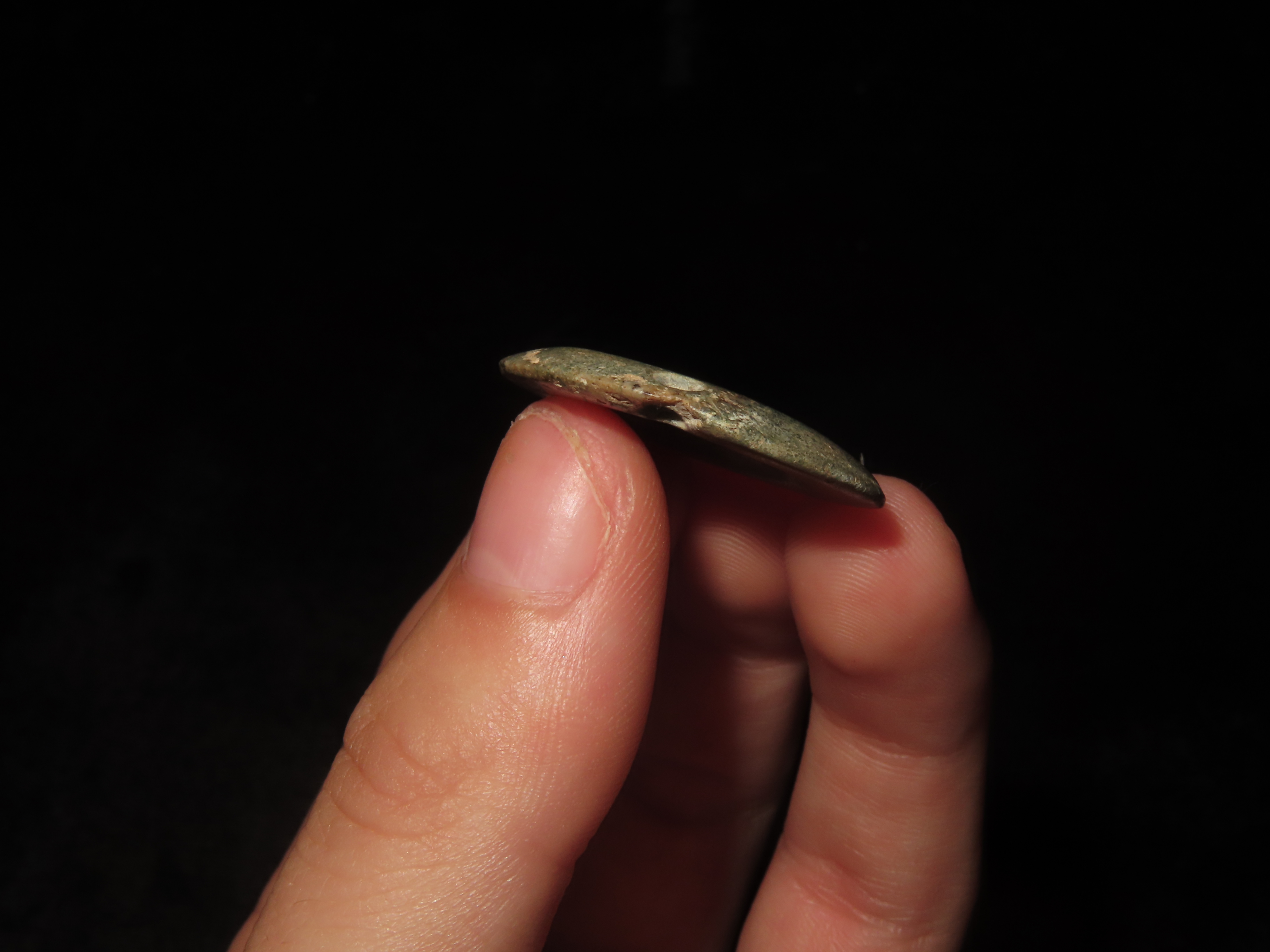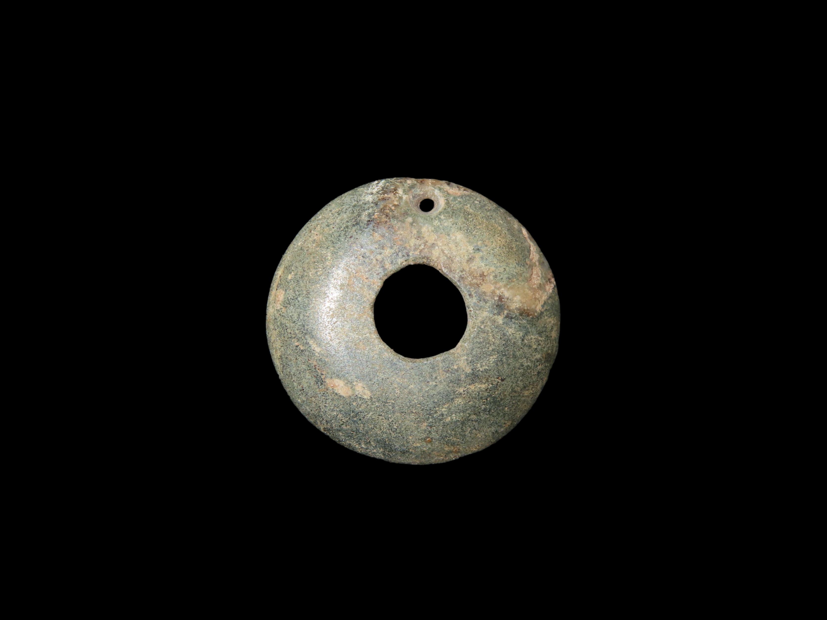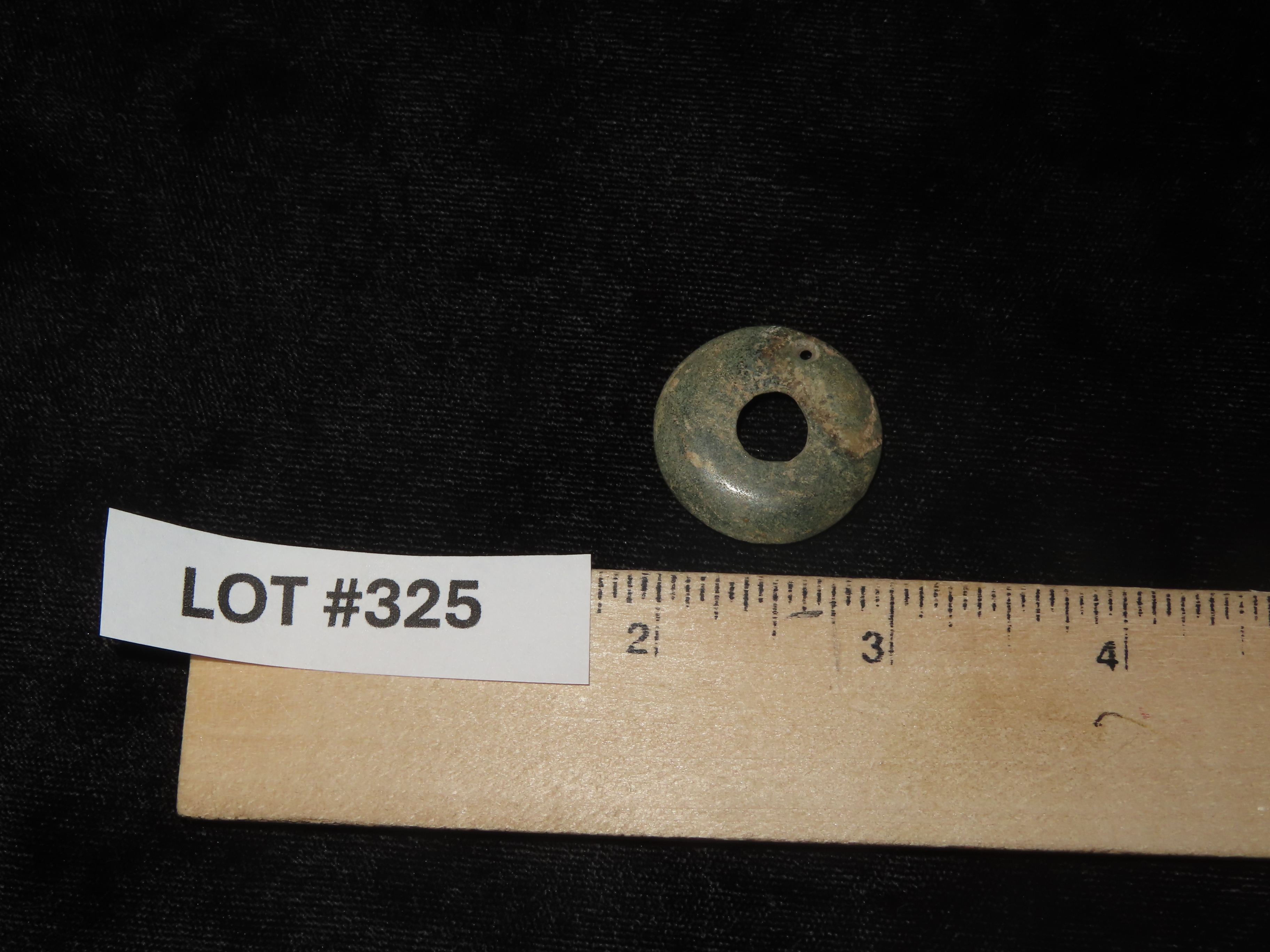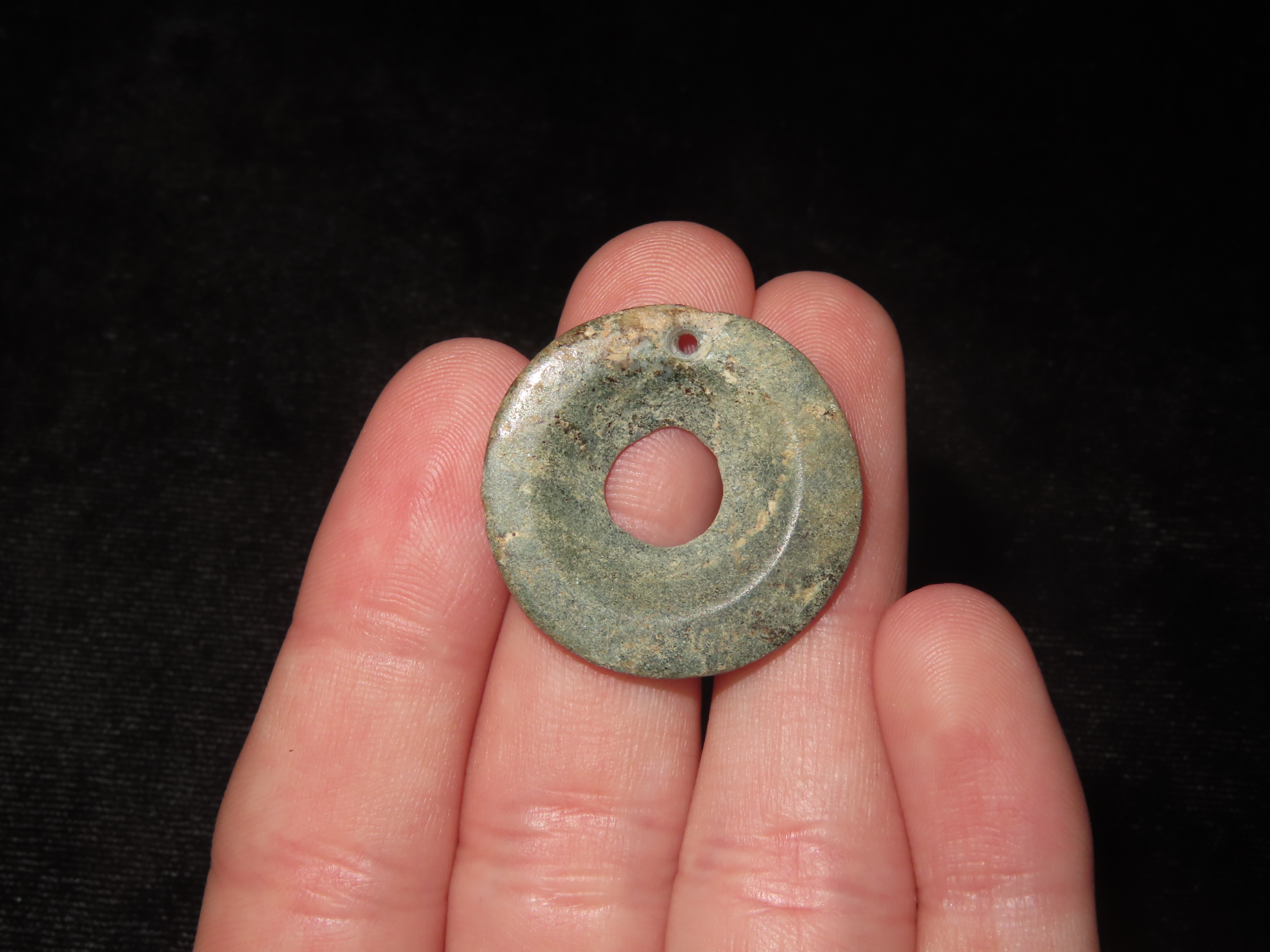 Maya Ear Spool, Central America. Greenstone, 1 inch wide. Ex Dr David Harner, Arkansas.