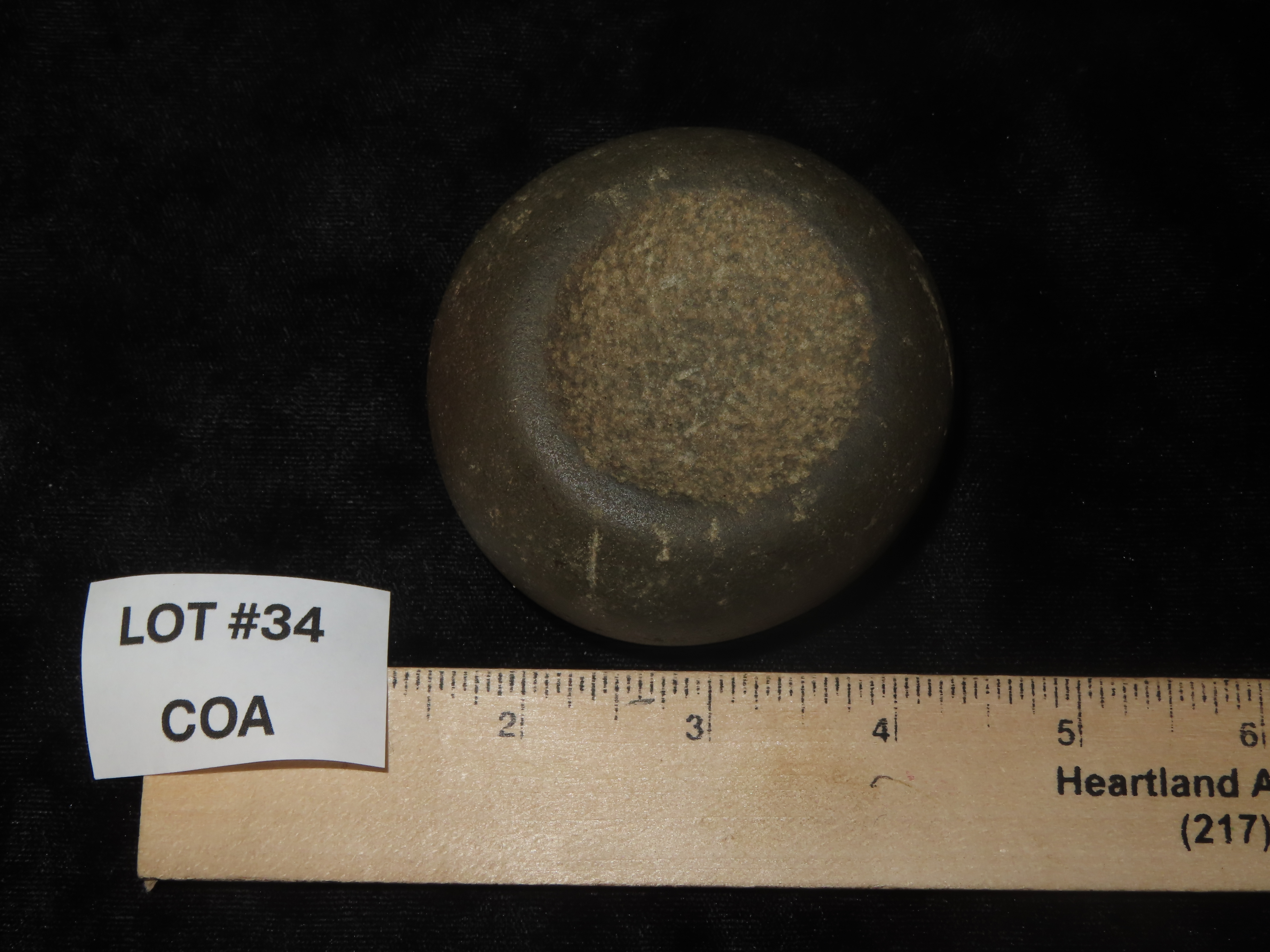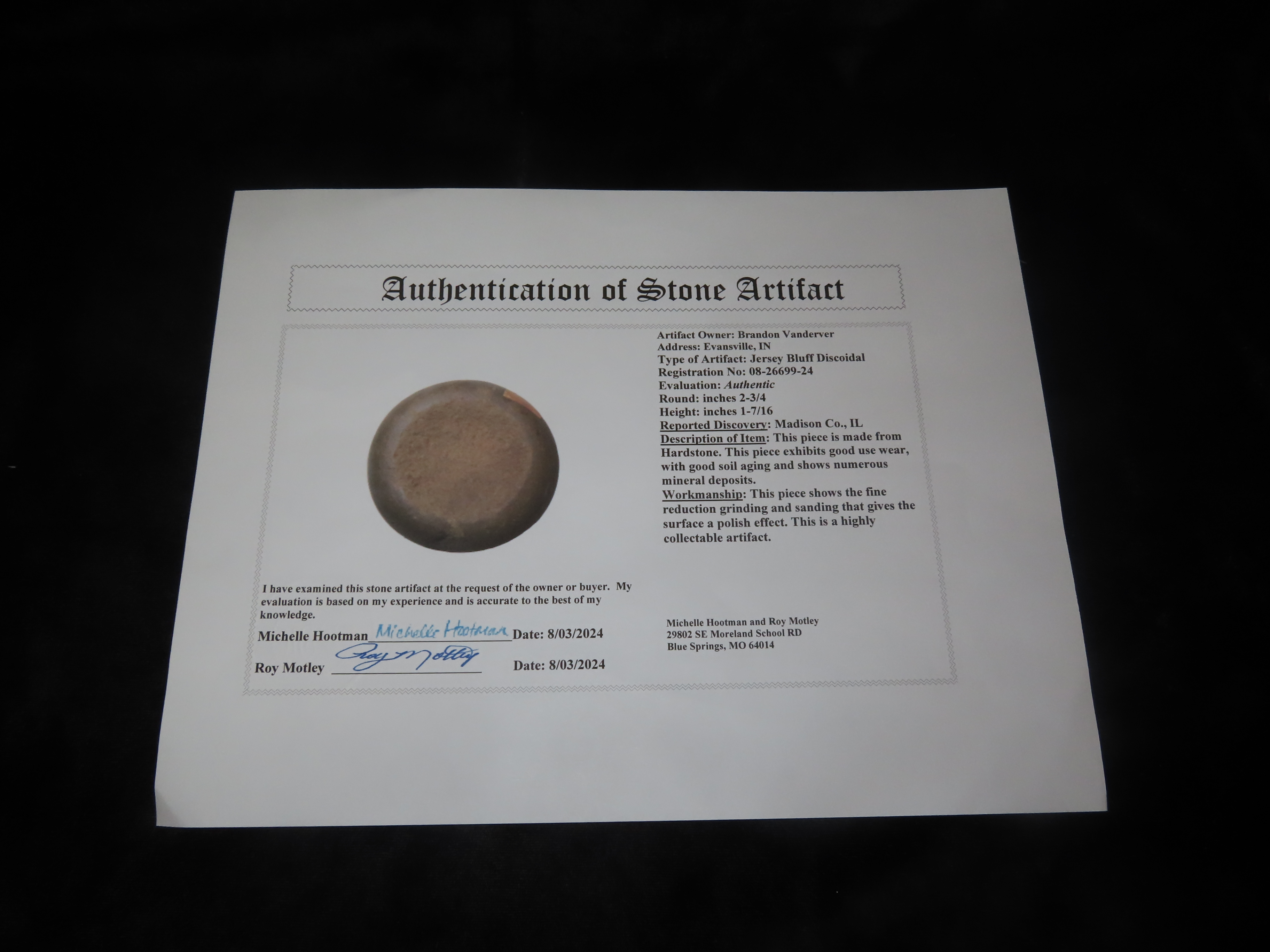 Amazing Jersey Bluff Discoidal, Madison Co. Illinois, Motley COA. 2 3/4″ Wide, Nice Deep Cups on both sides with great Polish. A Nice No Brainer Example!