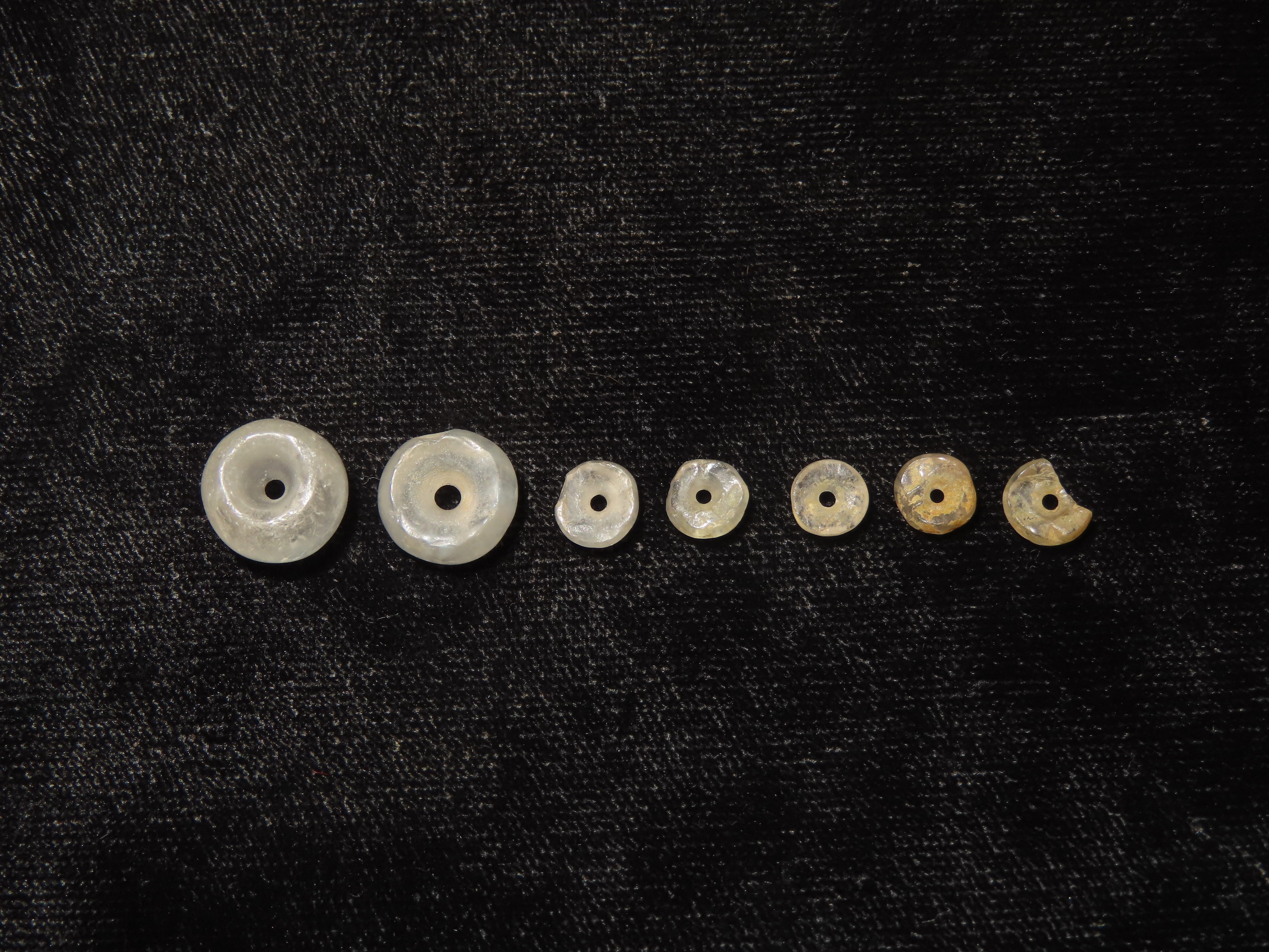 Lot of 7 Pre-Columbian Clear Crystal Quartz Drilled Beads from South America. Just imagine the time & Patience to make these in primitive times!