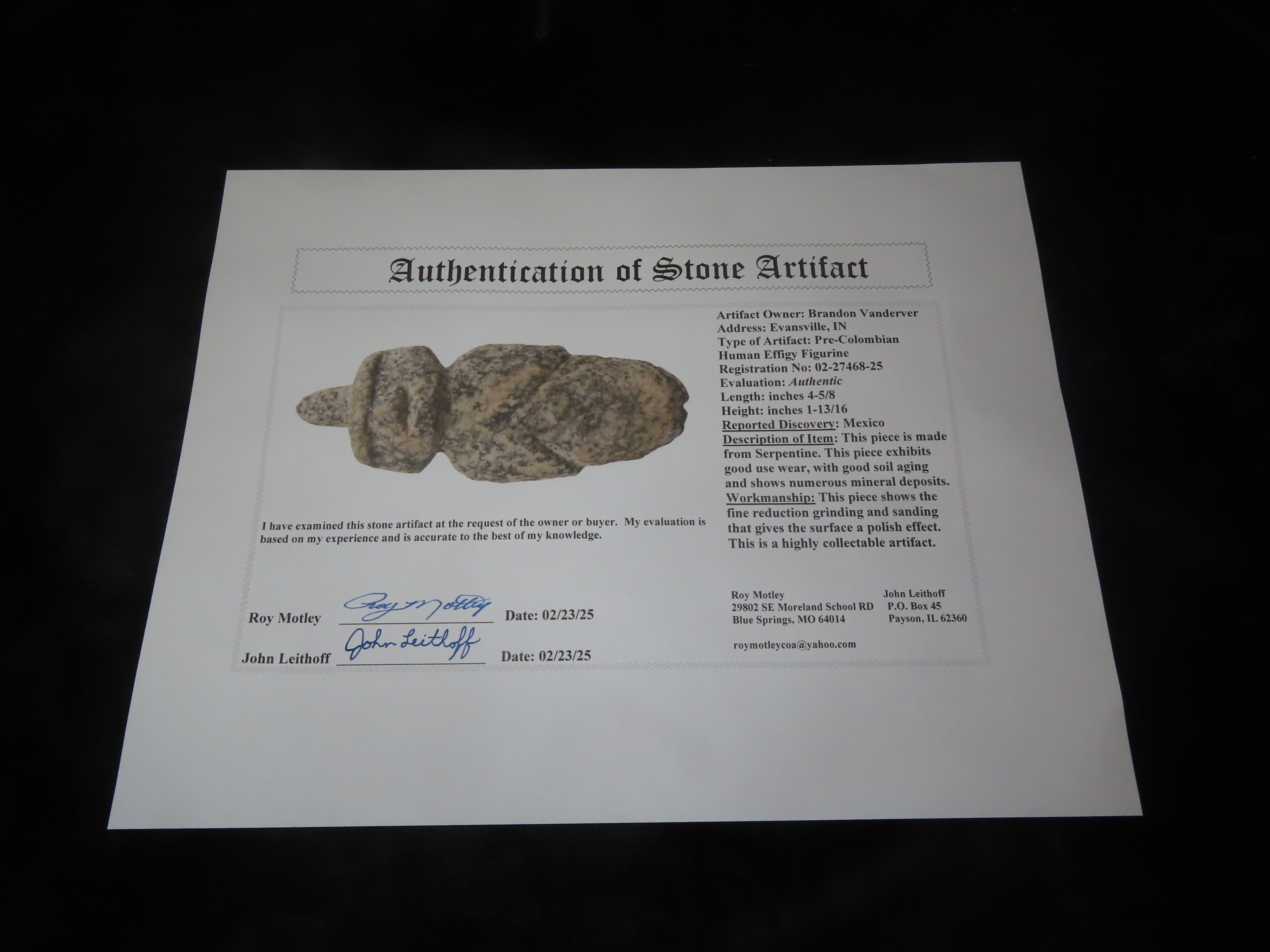 4 5/8″ Human Effigy Figurine / Axe God, Mexico, Motley COA. Colorful Example, Well Shaped with Detailed Head & Face, & Engraved Arms & Legs.