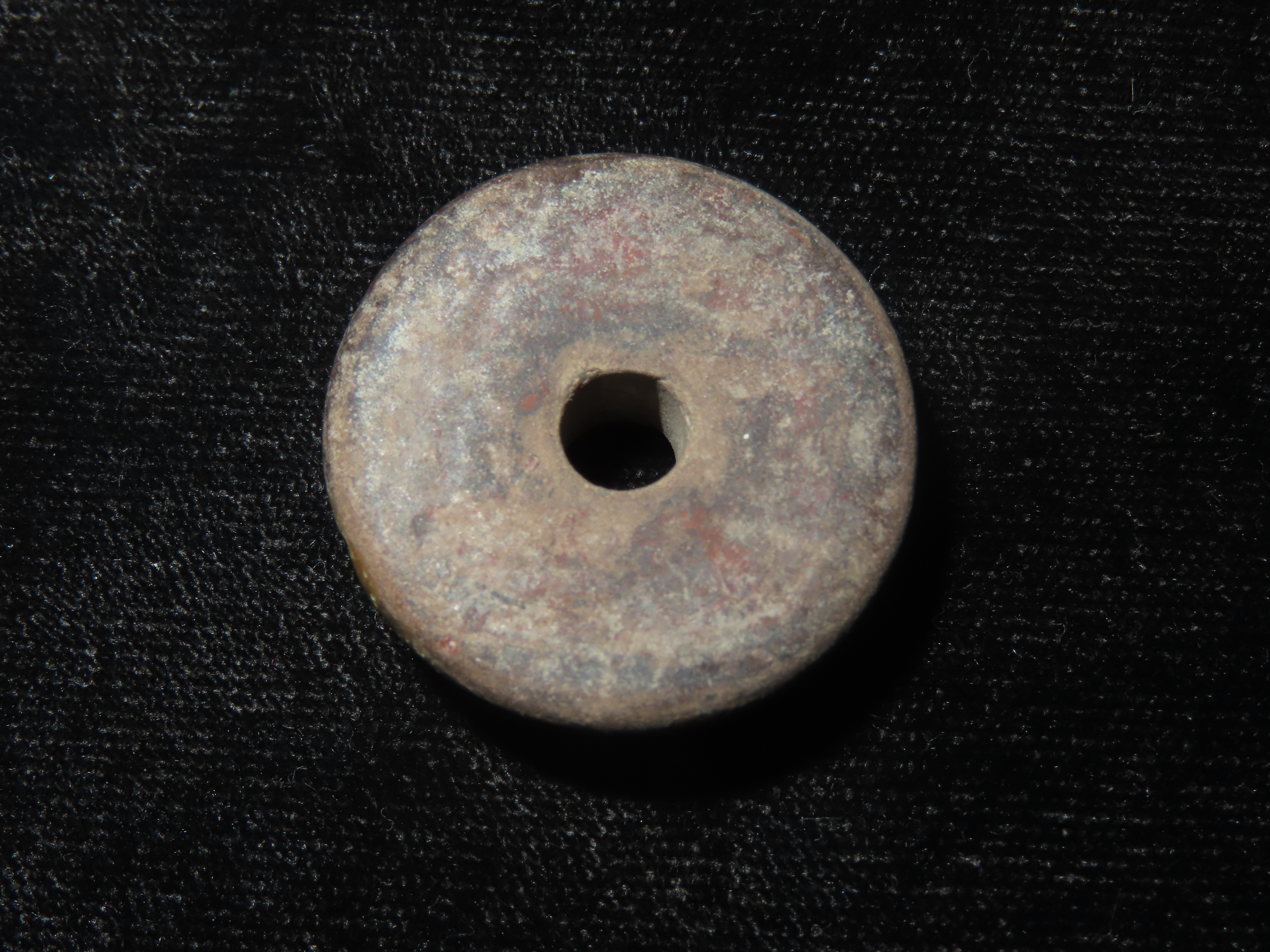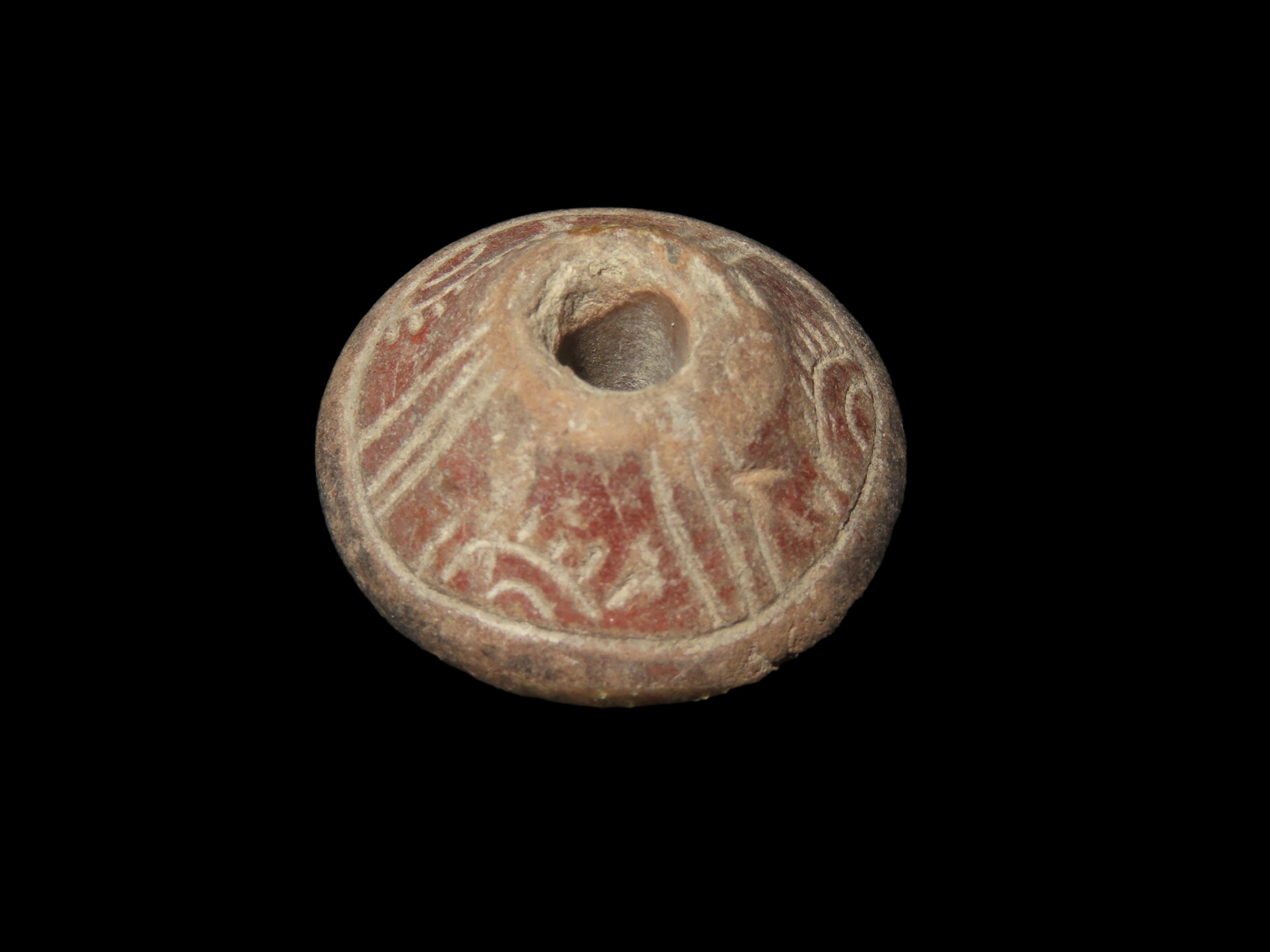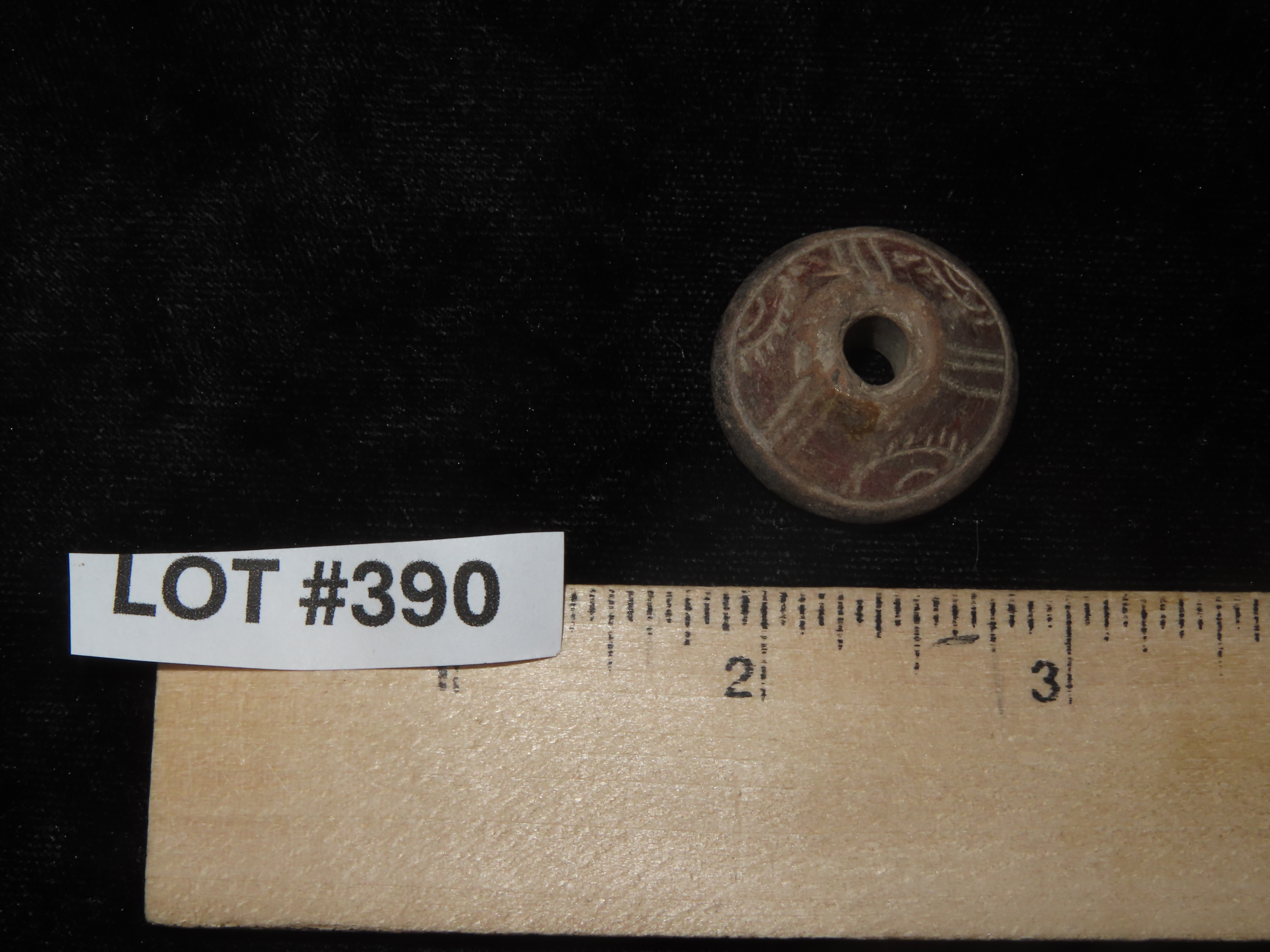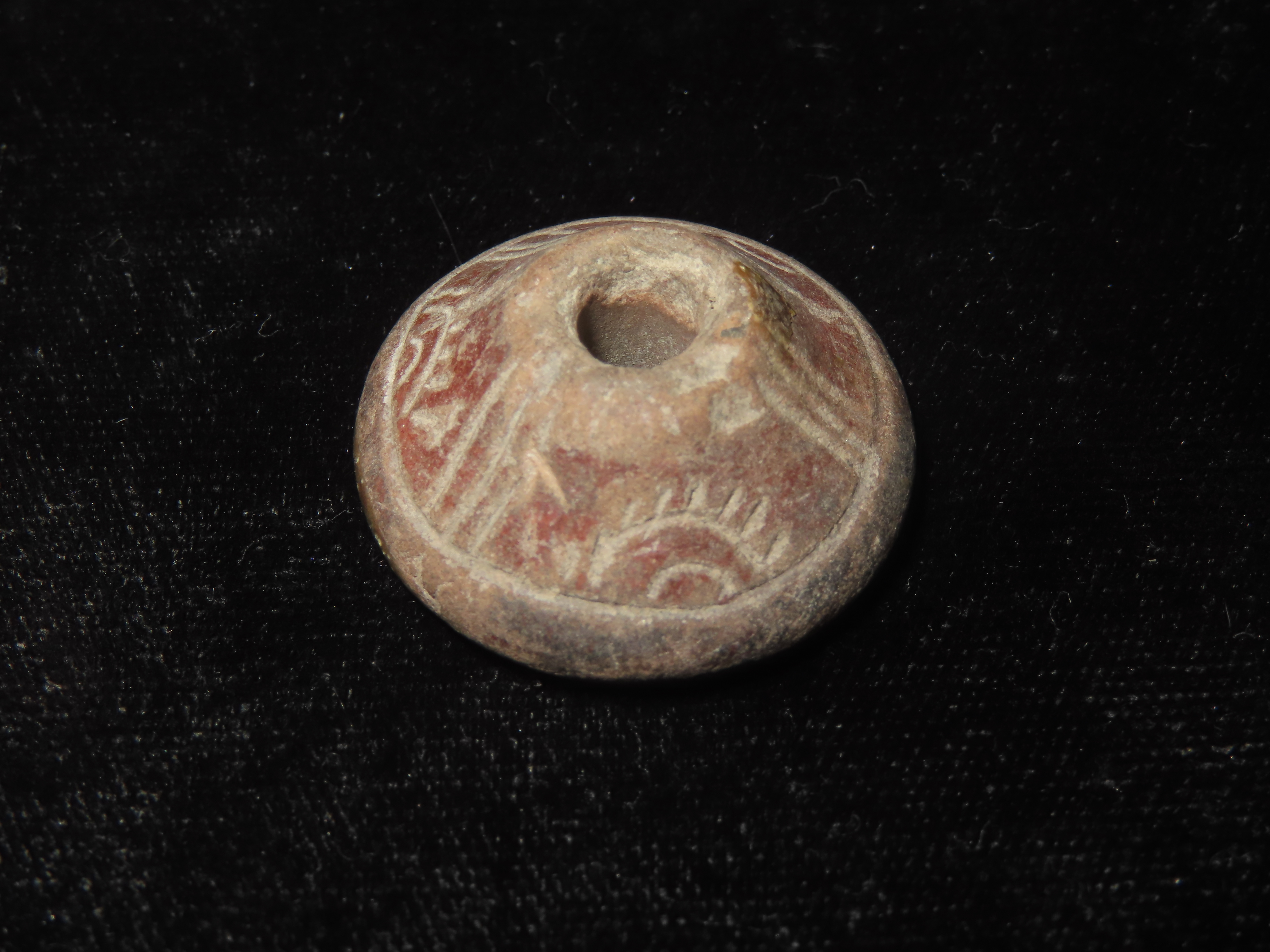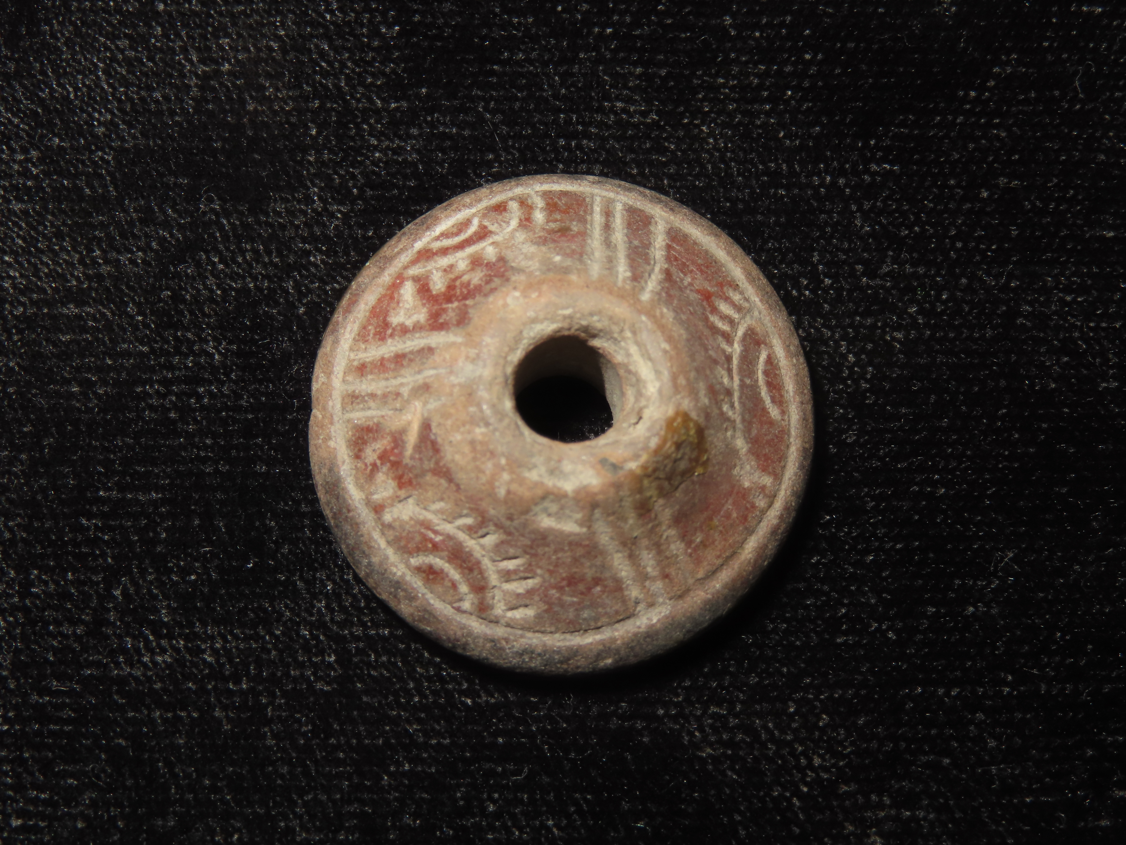 Heavily Engraved Clay Bead, Mexico. Elaborate Incised Design all the way around, Perforation in Center for Suspension. Nice example.
