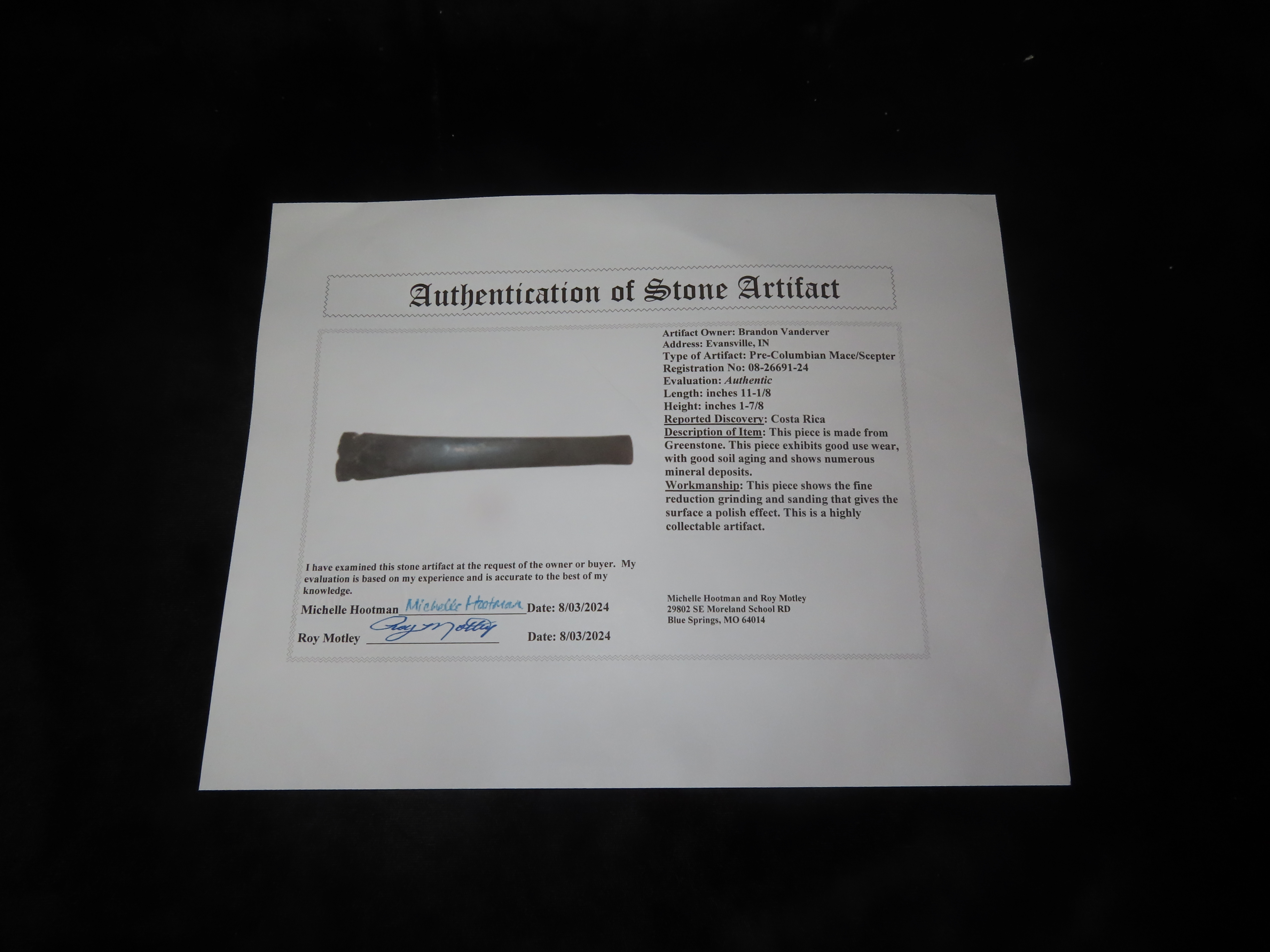 Incredible Rare 11 1/8″ Mace / Scepter, Costa Rica, Motley COA, Highly Polished Example with No Damage. Rarely Seen for sale. Great Patina. Museum Grade Ceremonial Type Artifact!