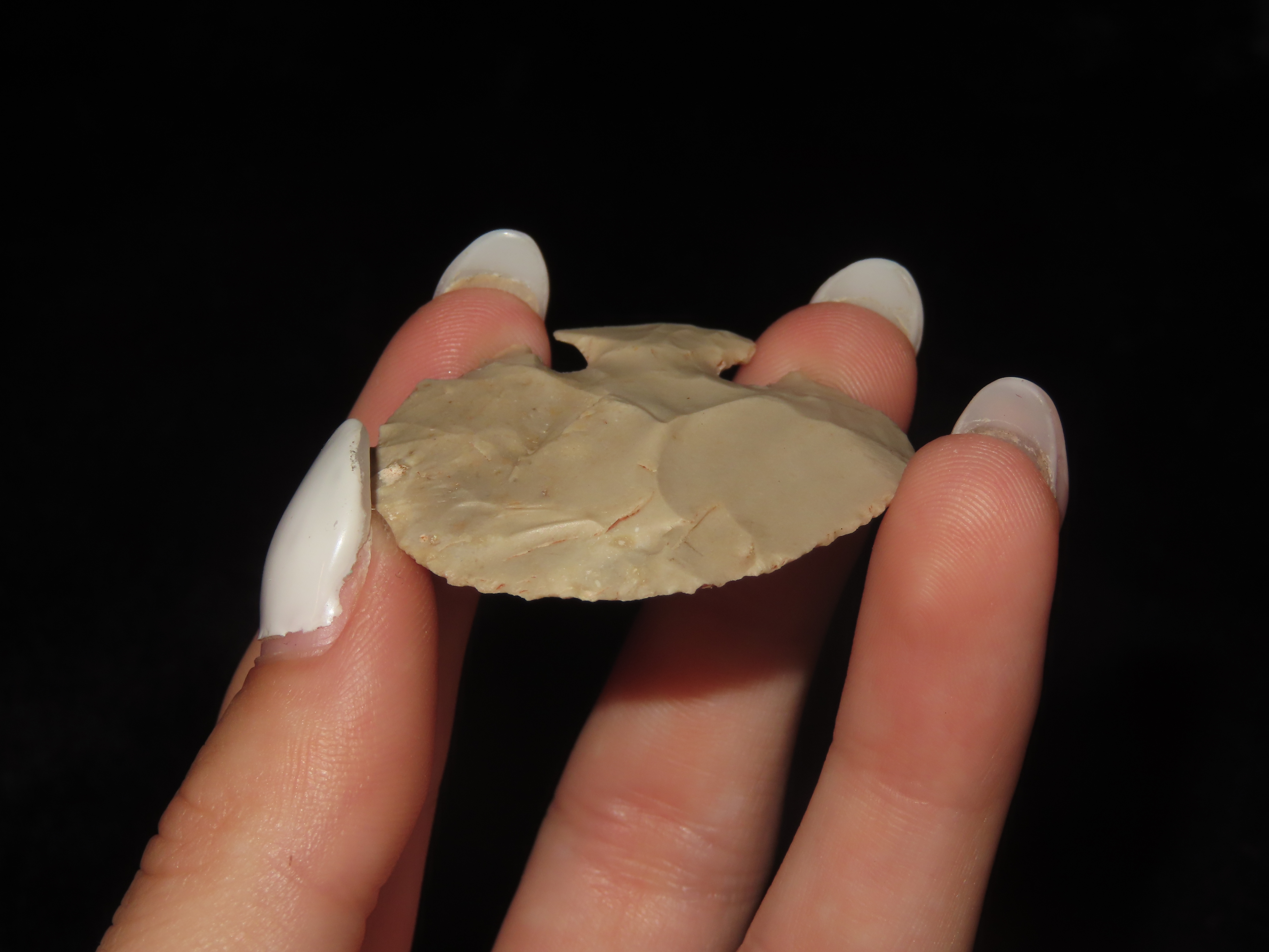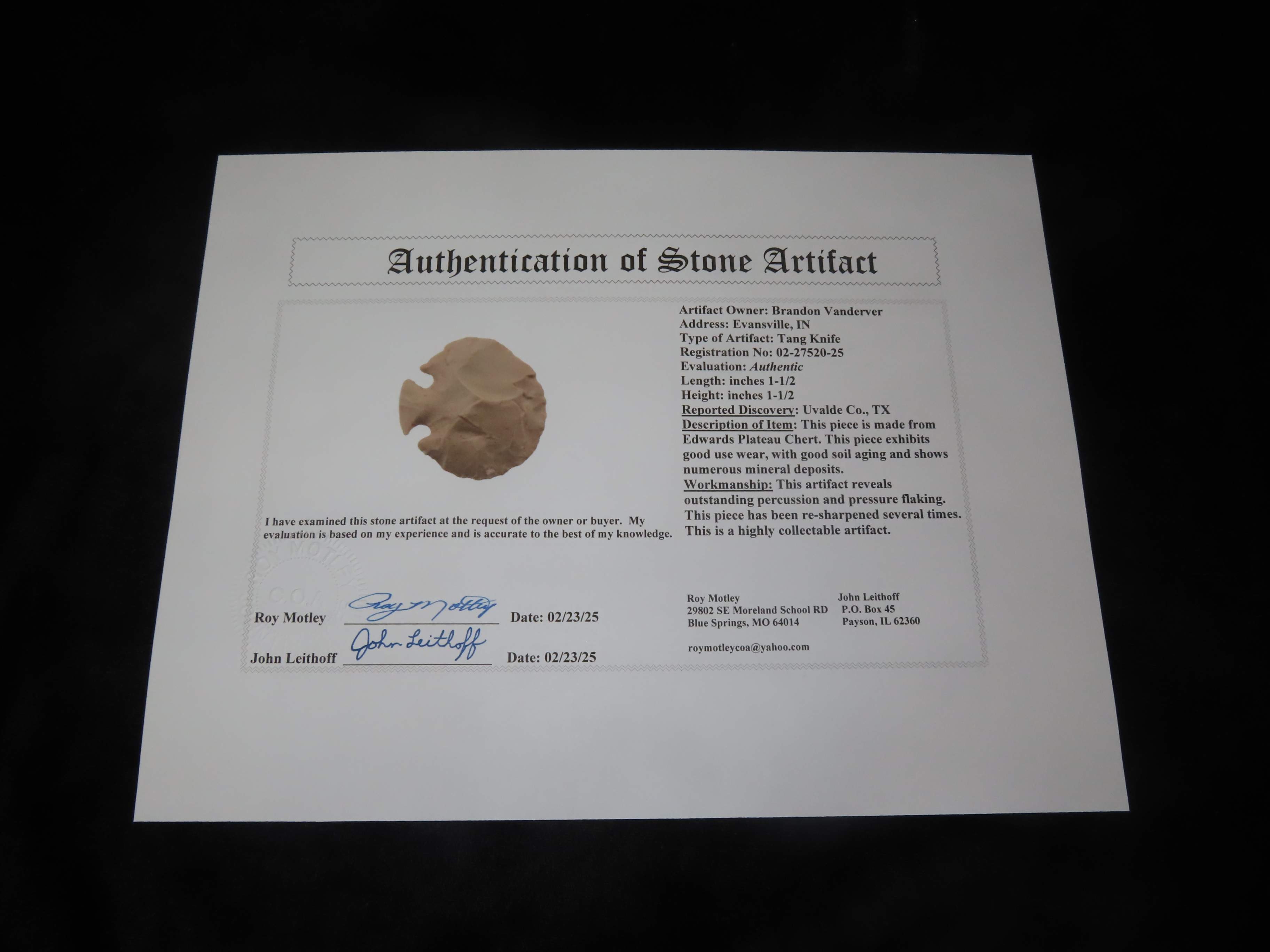 1 1/2″ Tang Knife, Uvalde County Texas, Motley COA. Wonderful Example with great form, Indian Artifact, Arrowhead, Scraper, Corner Tang, Midback Tang