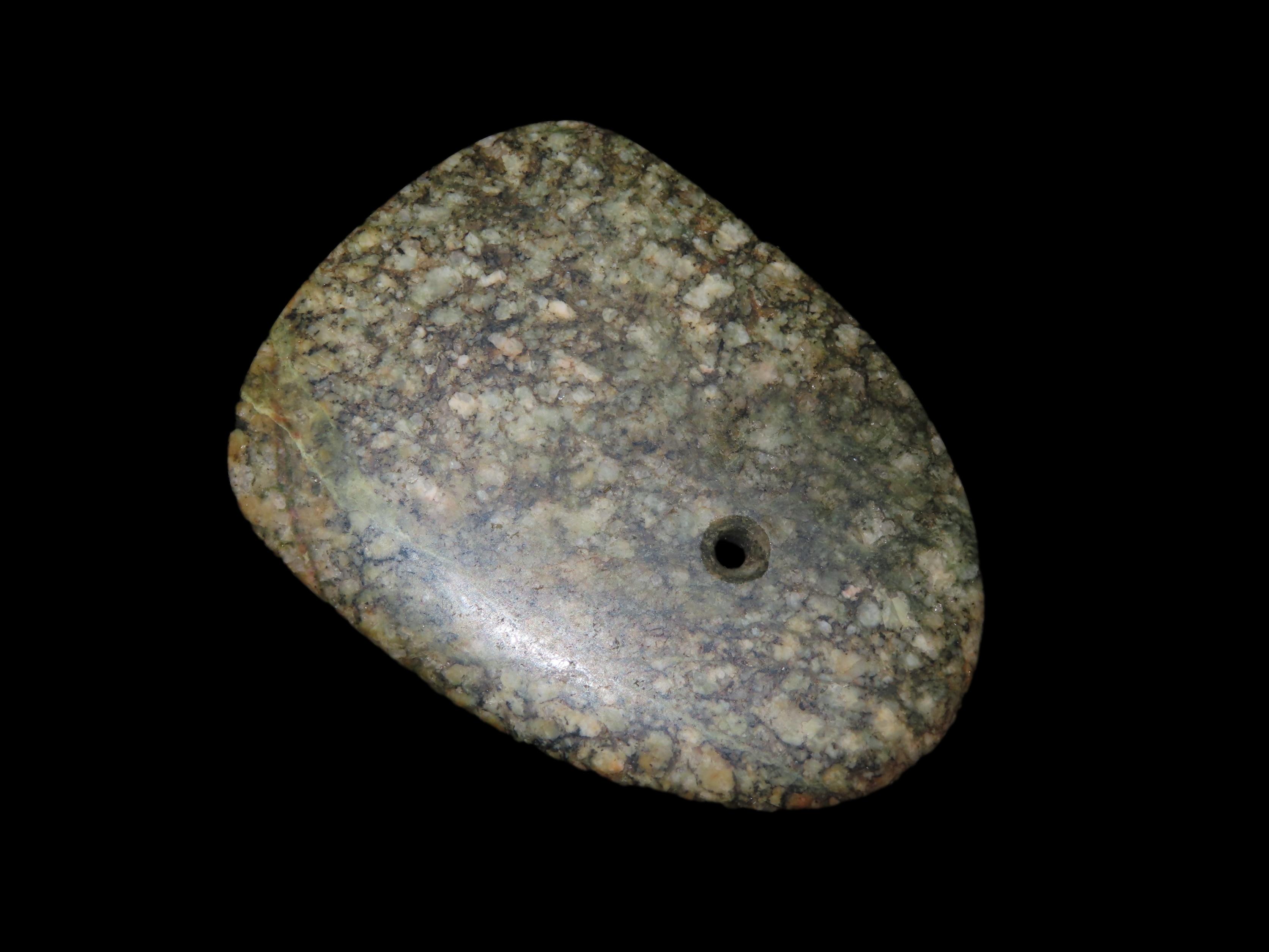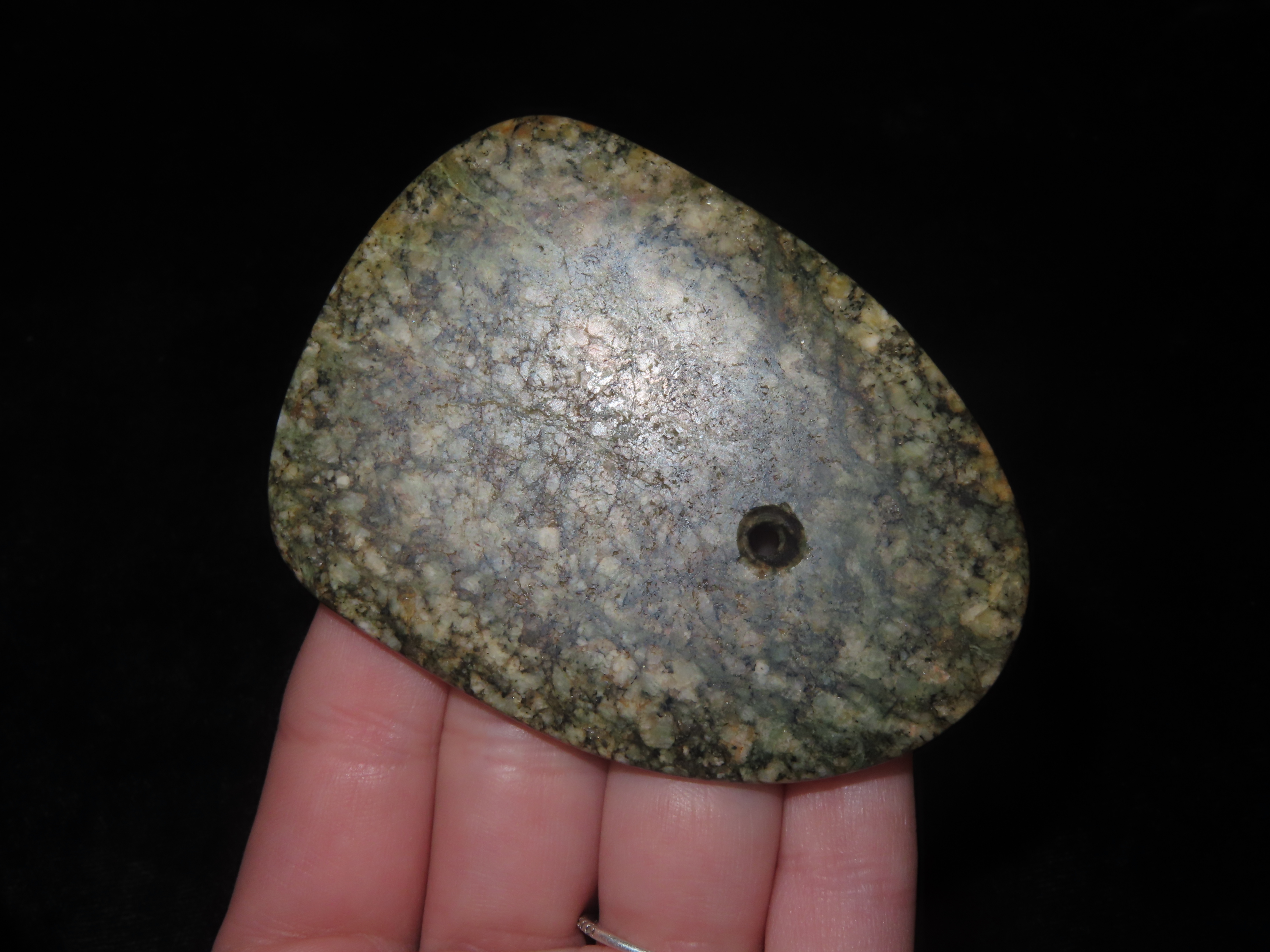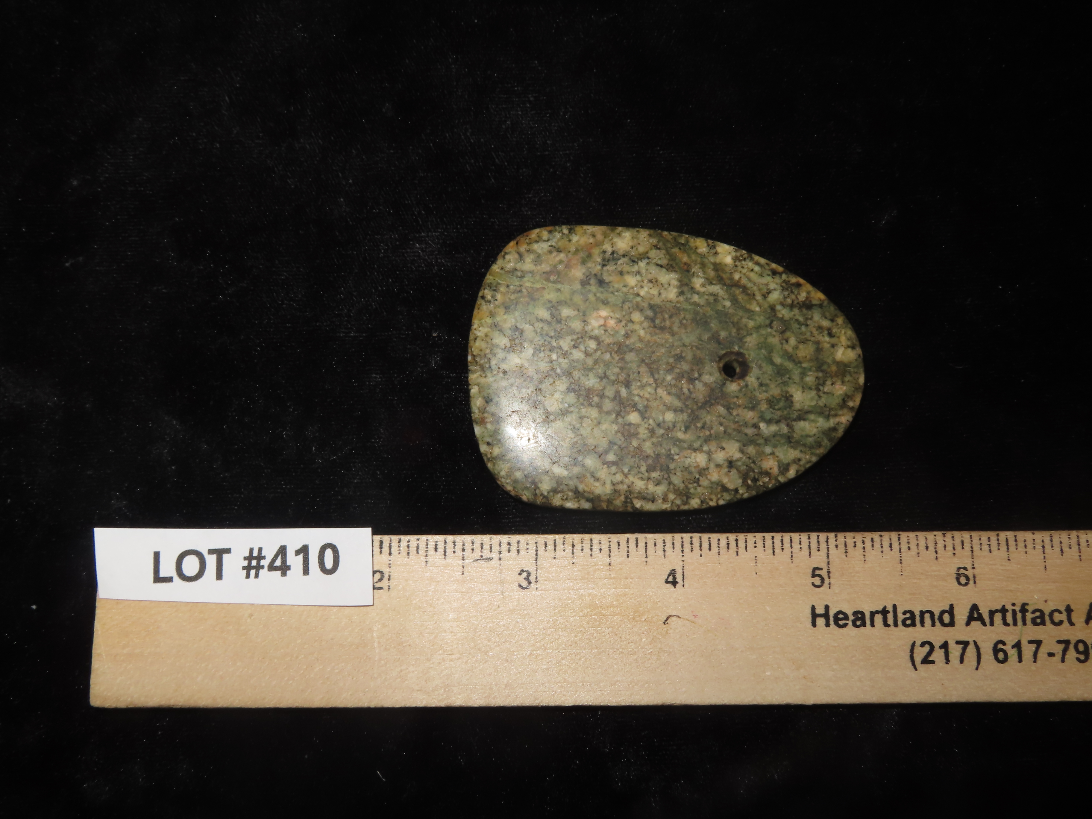 Maya Pendant, Fine! Mexico. 2 3/4″, highly polished, speckled greenstone. Ex Converse auction.