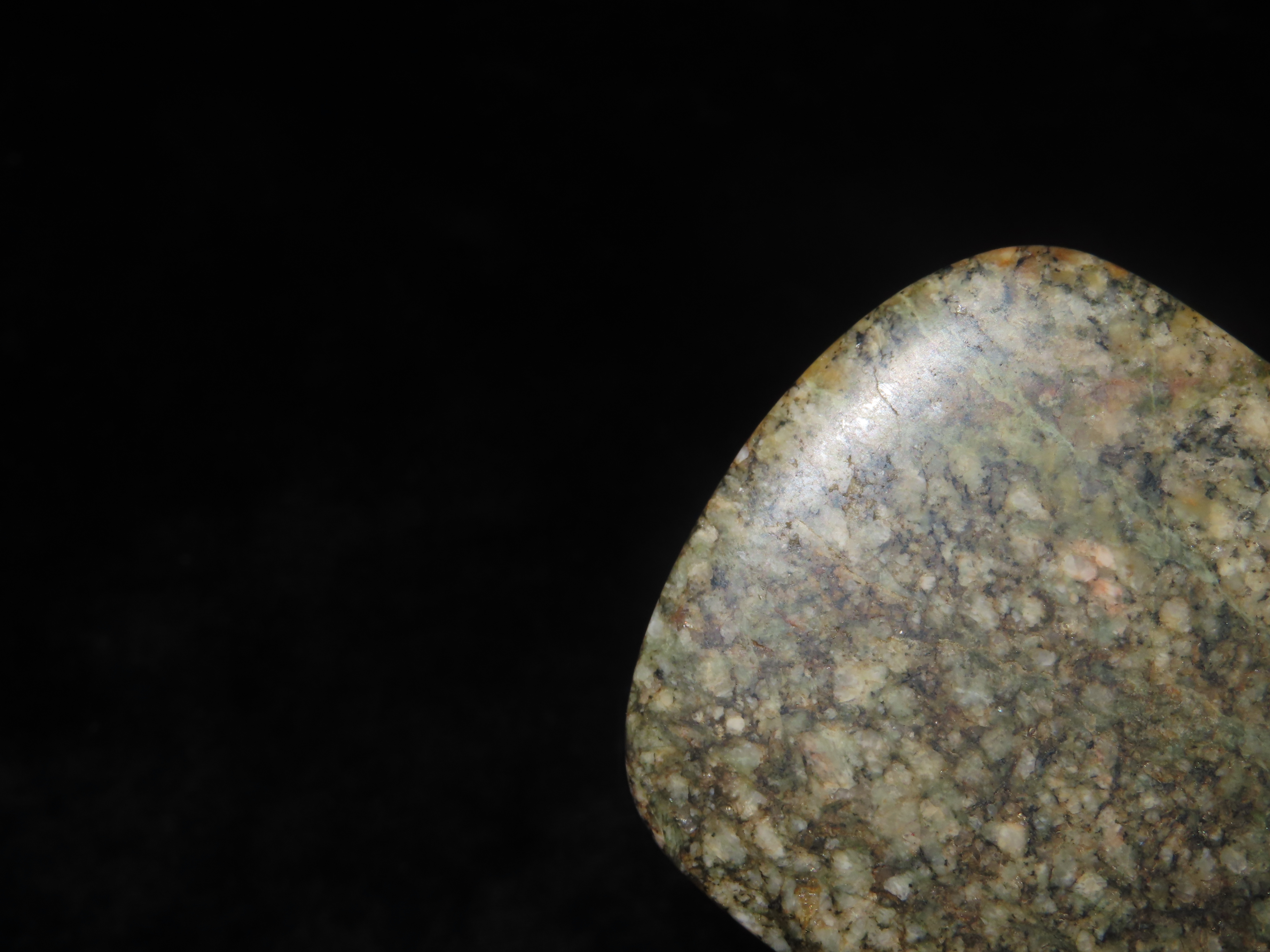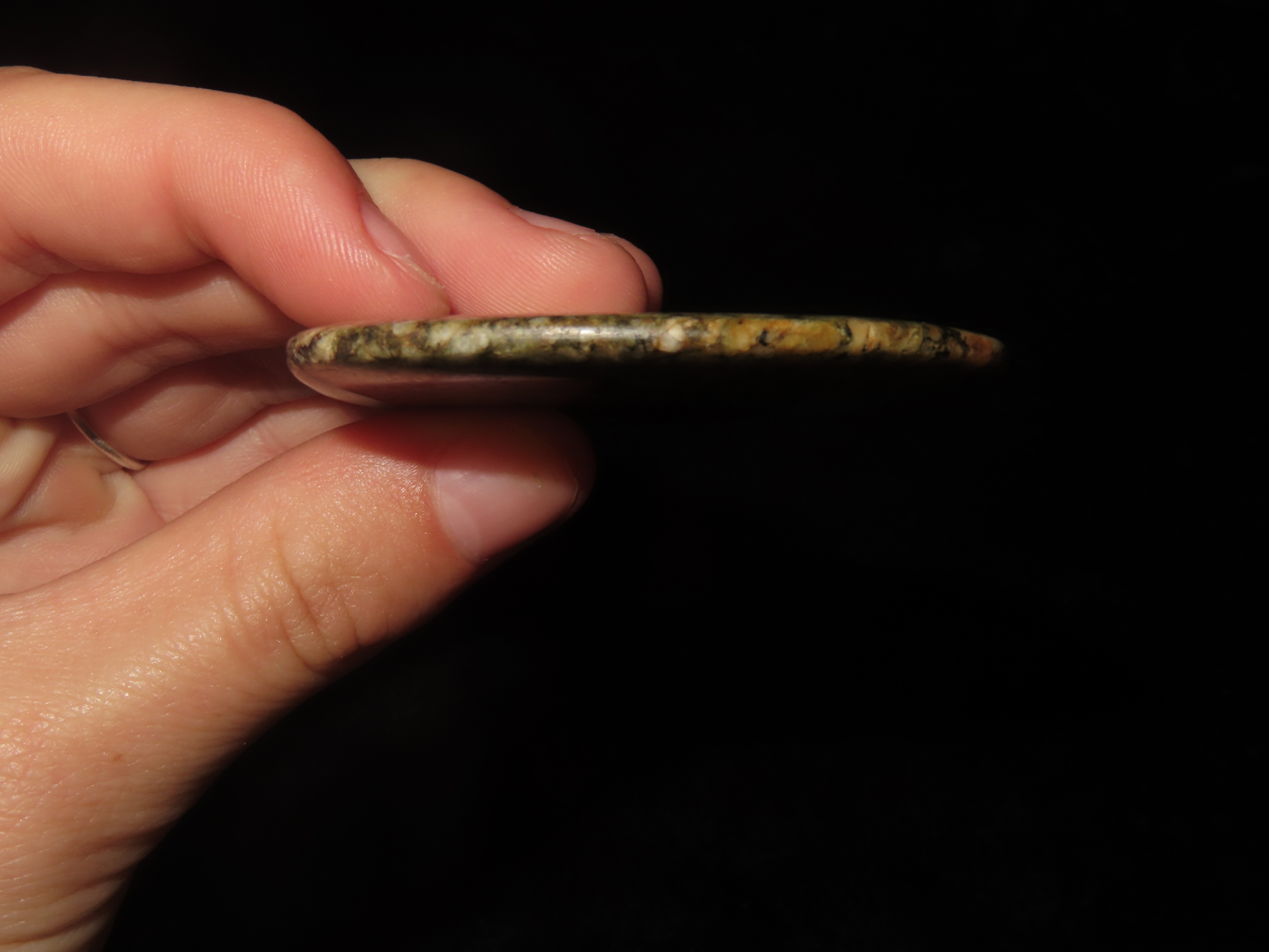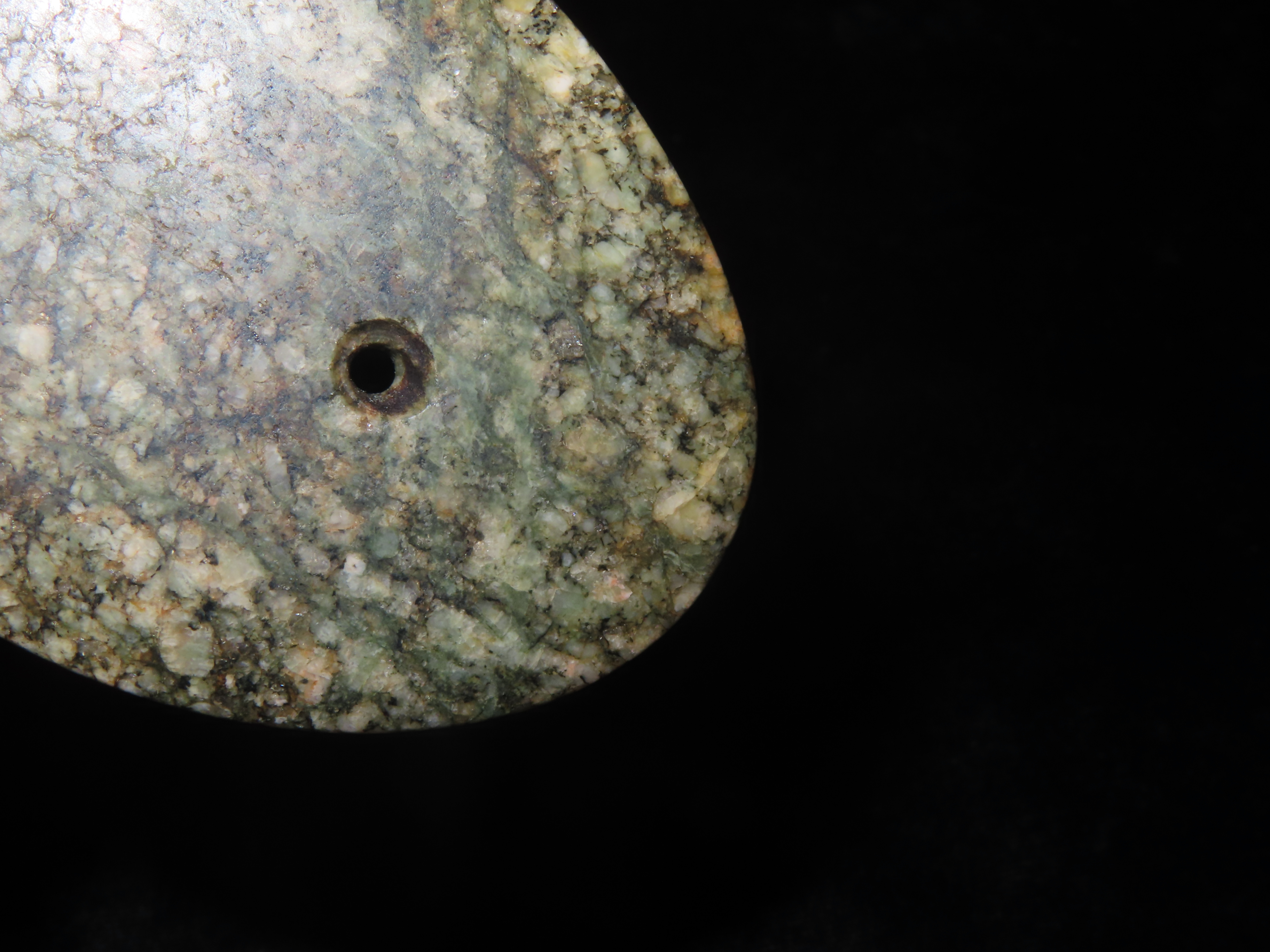 Maya Pendant, Fine! Mexico. 2 3/4″, highly polished, speckled greenstone. Ex Converse auction.