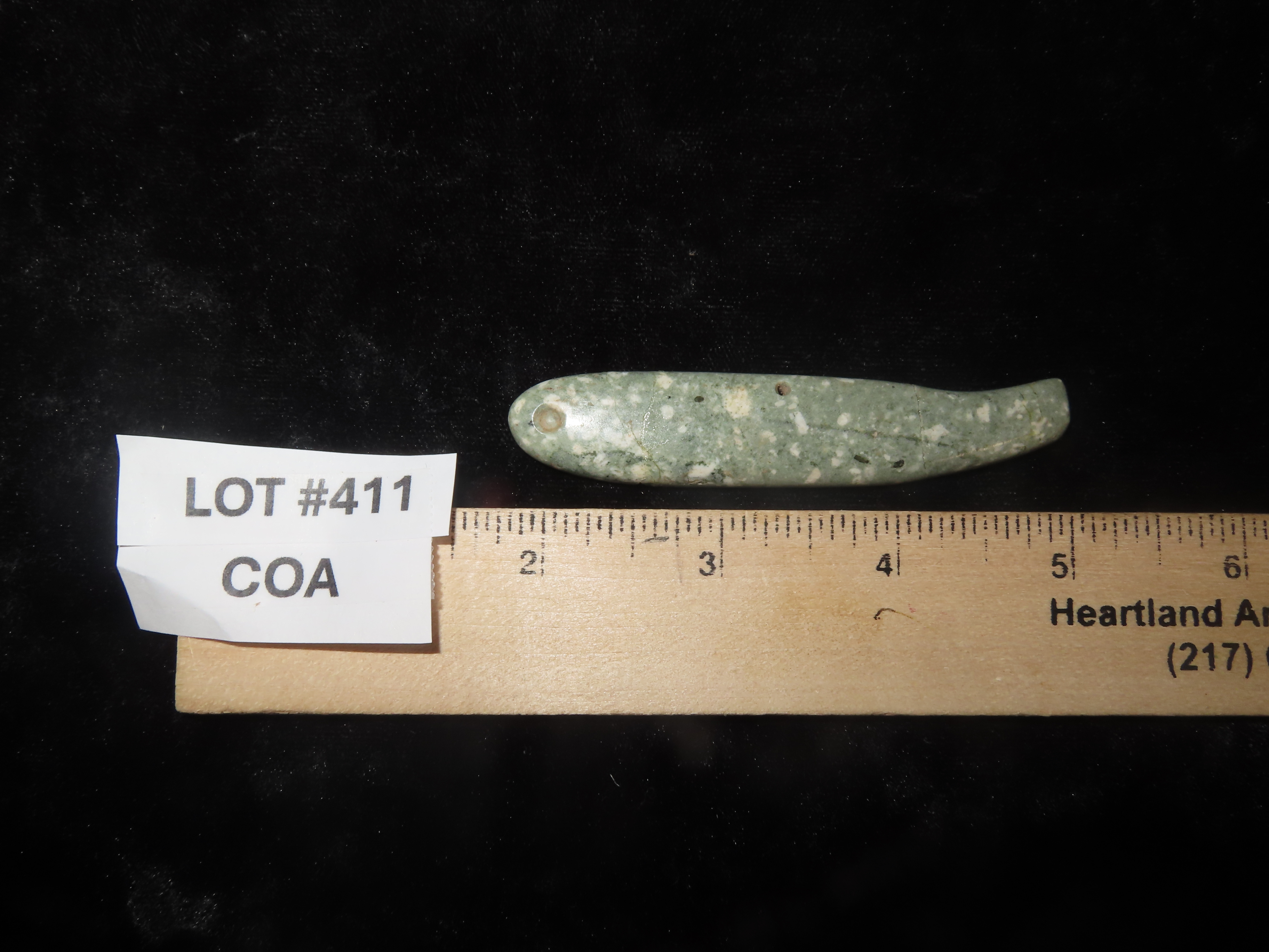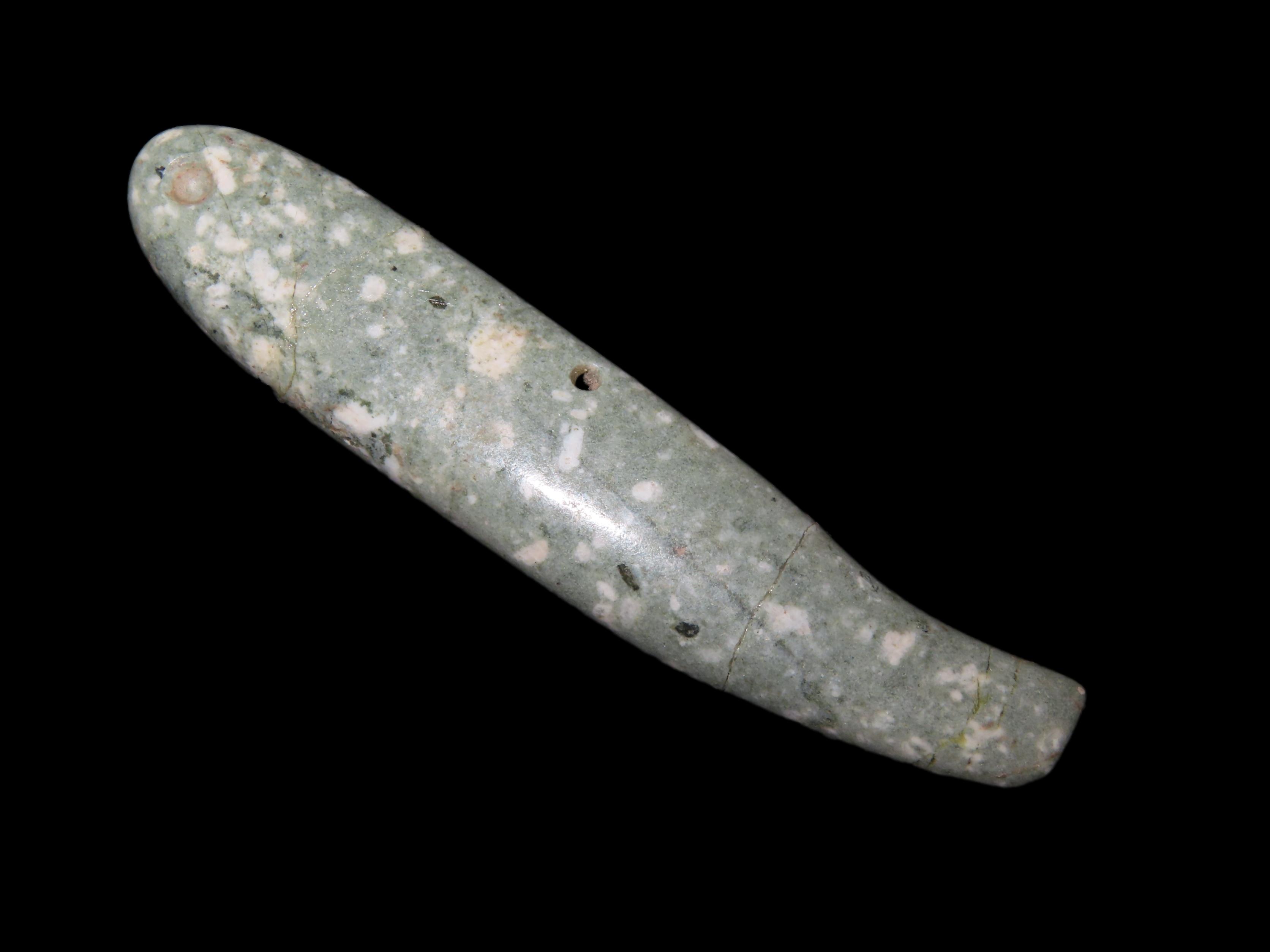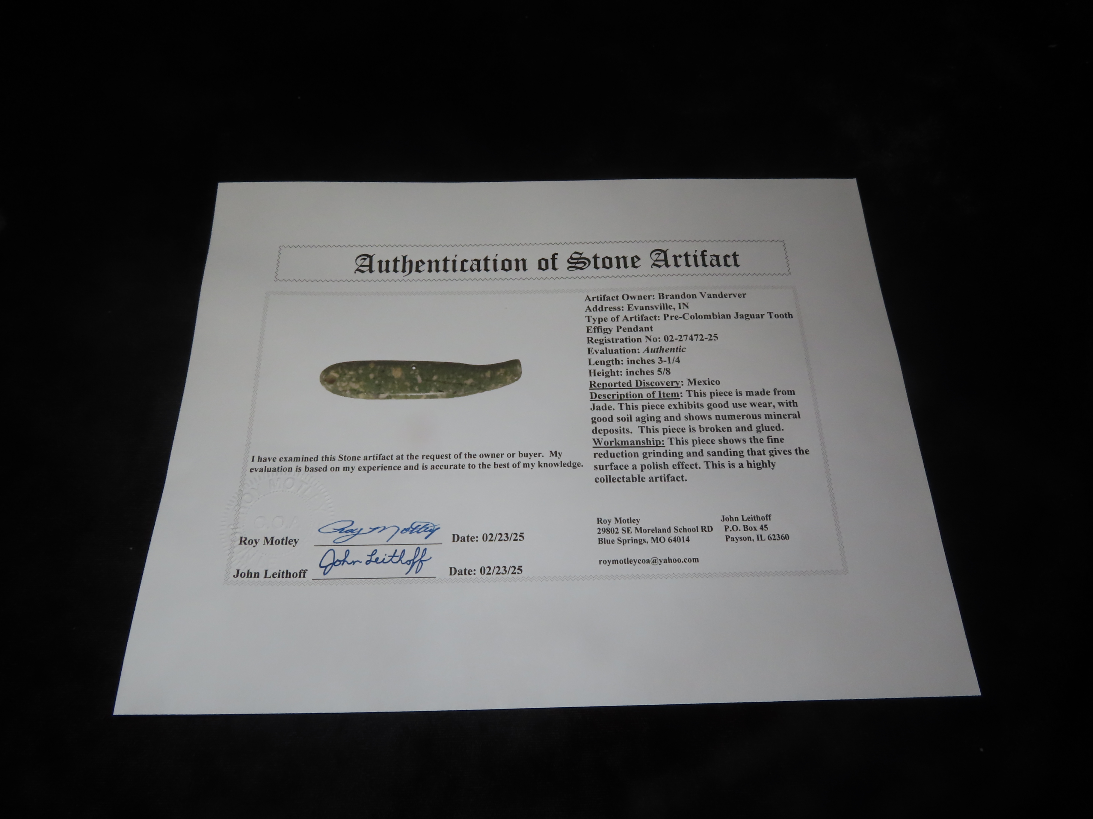 Rare Olmec Jaguar Tooth Effigy Pendant, Jade, Mexico, Motely COA. Highly Polished Example, Dished out on the back side and Rounded on the other. Broken & Glued tightly.