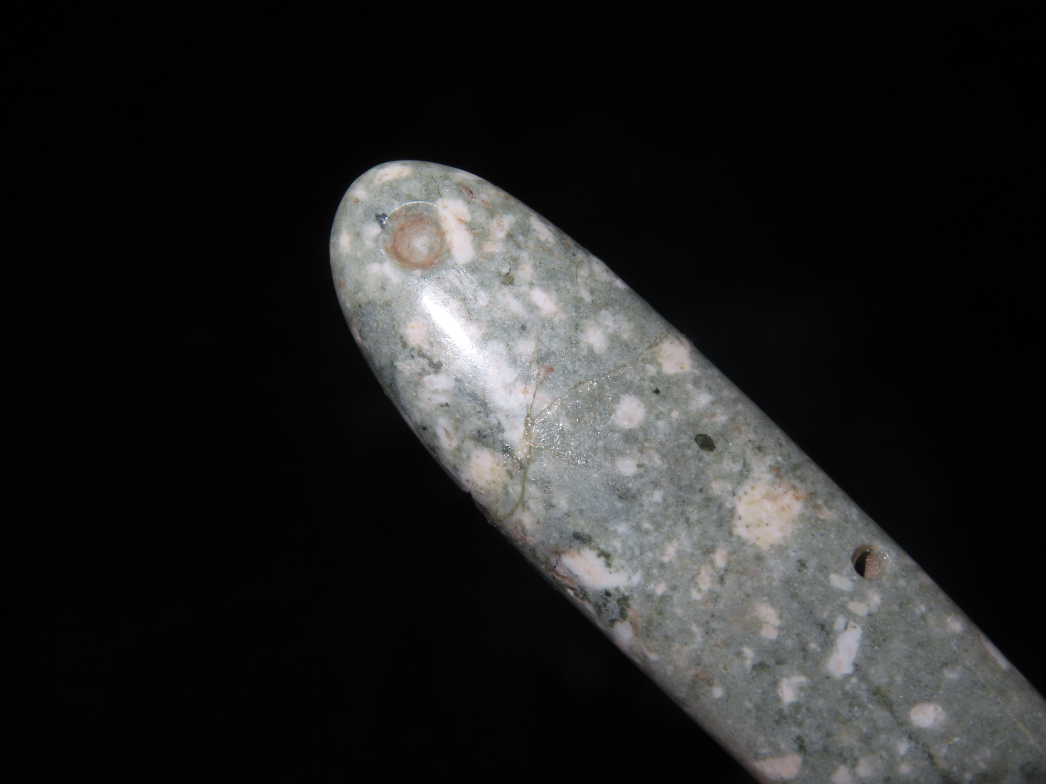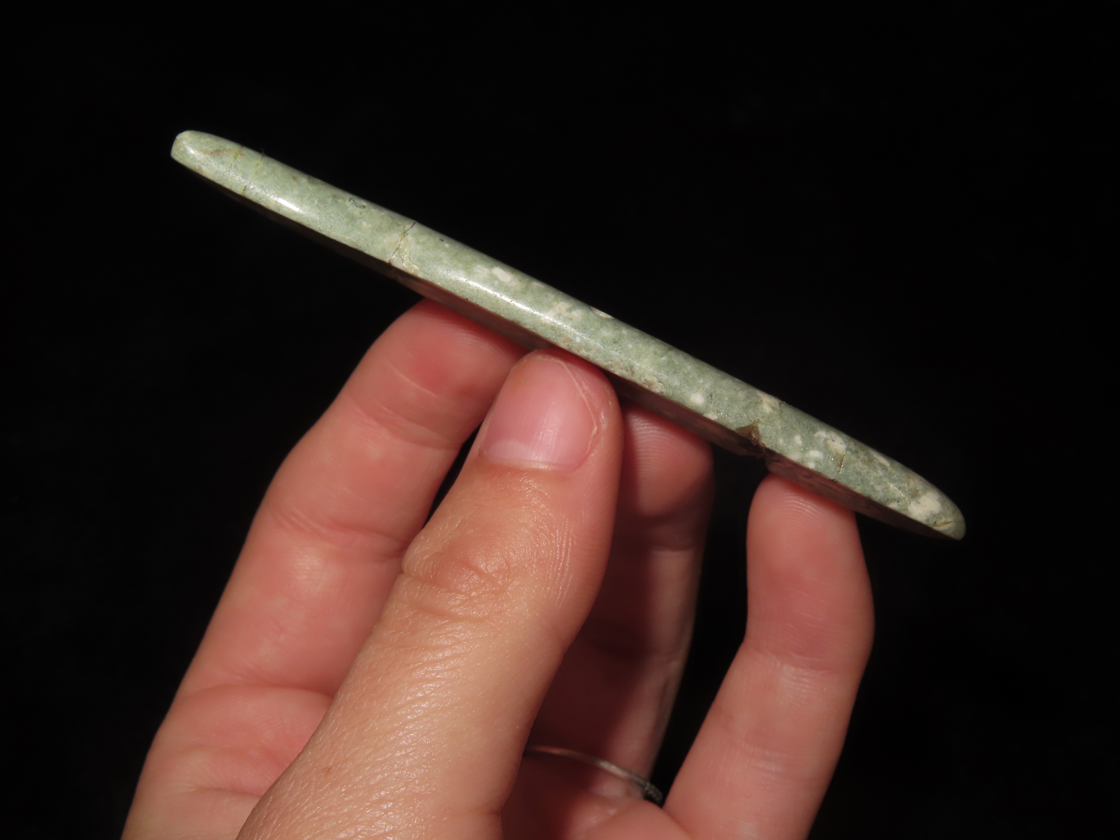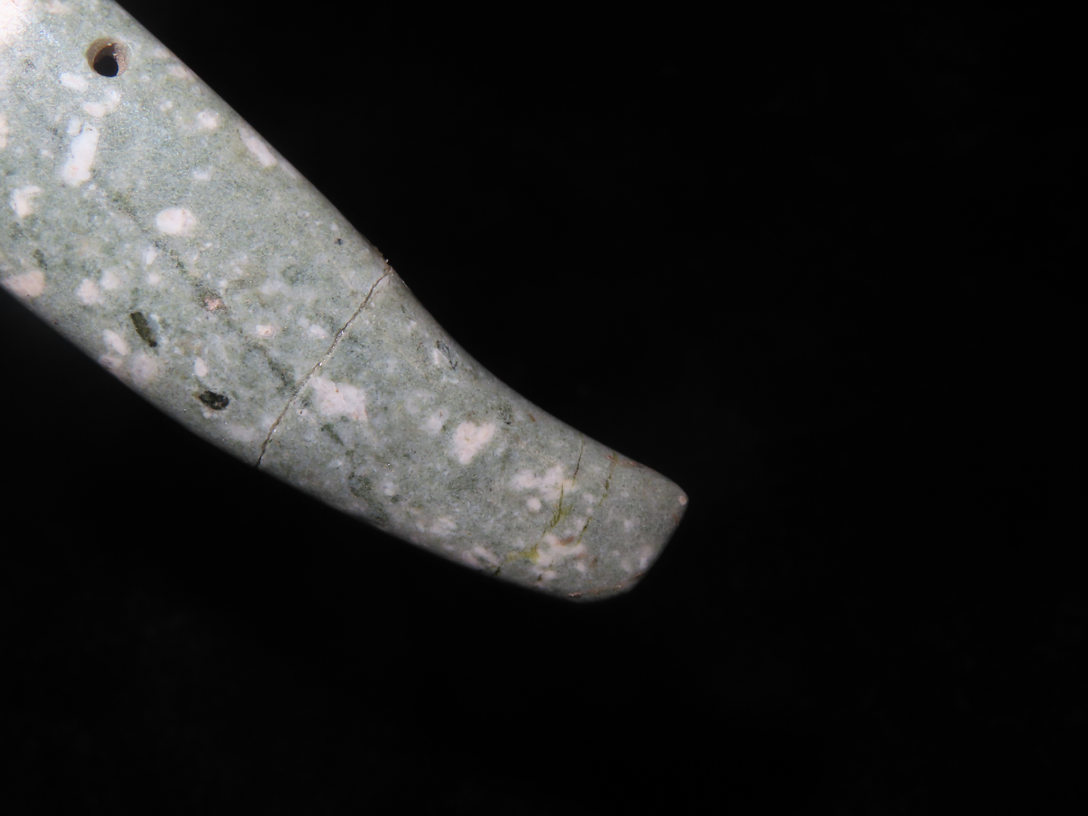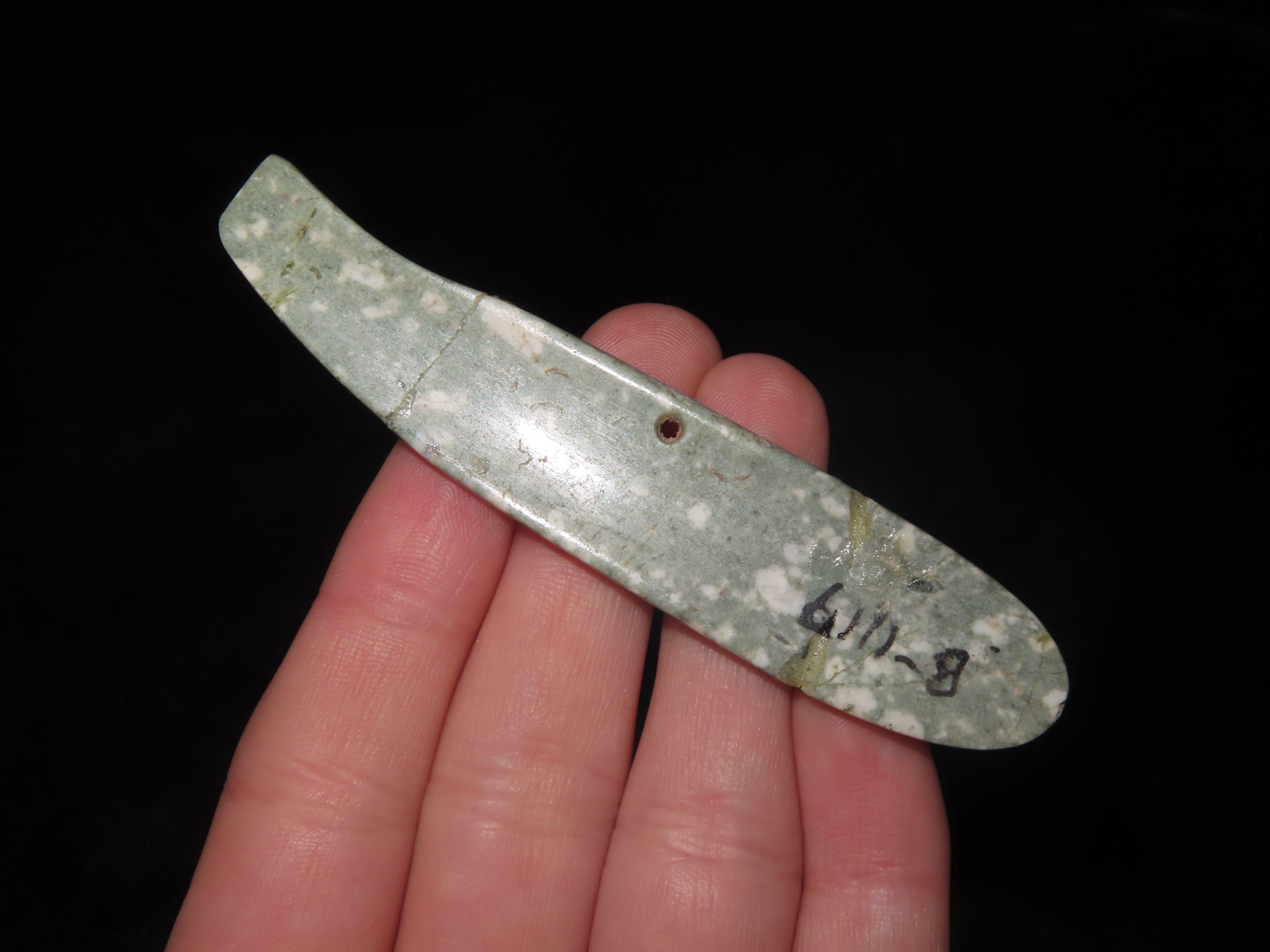 Rare Olmec Jaguar Tooth Effigy Pendant, Jade, Mexico, Motely COA. Highly Polished Example, Dished out on the back side and Rounded on the other. Broken & Glued tightly.
