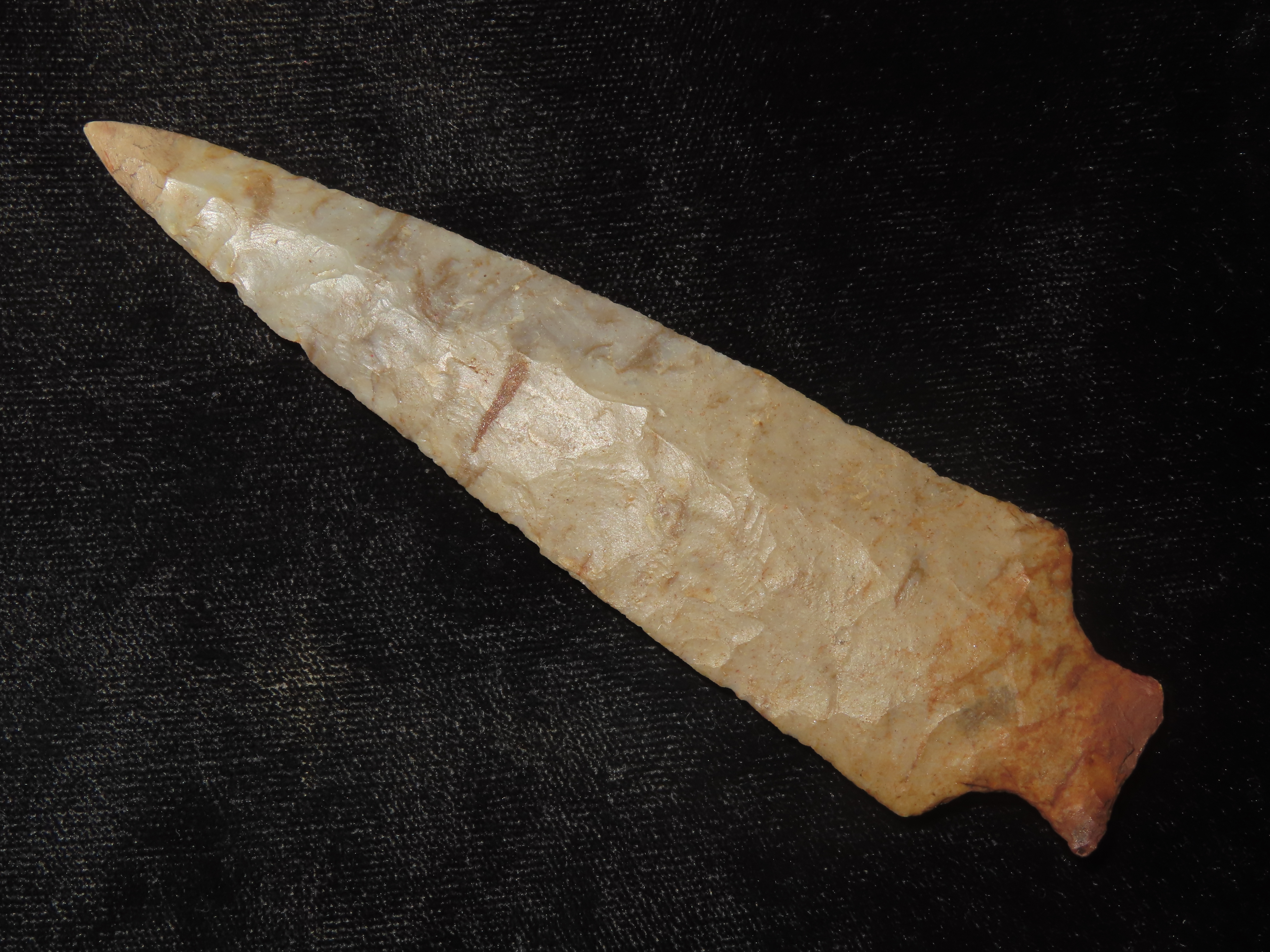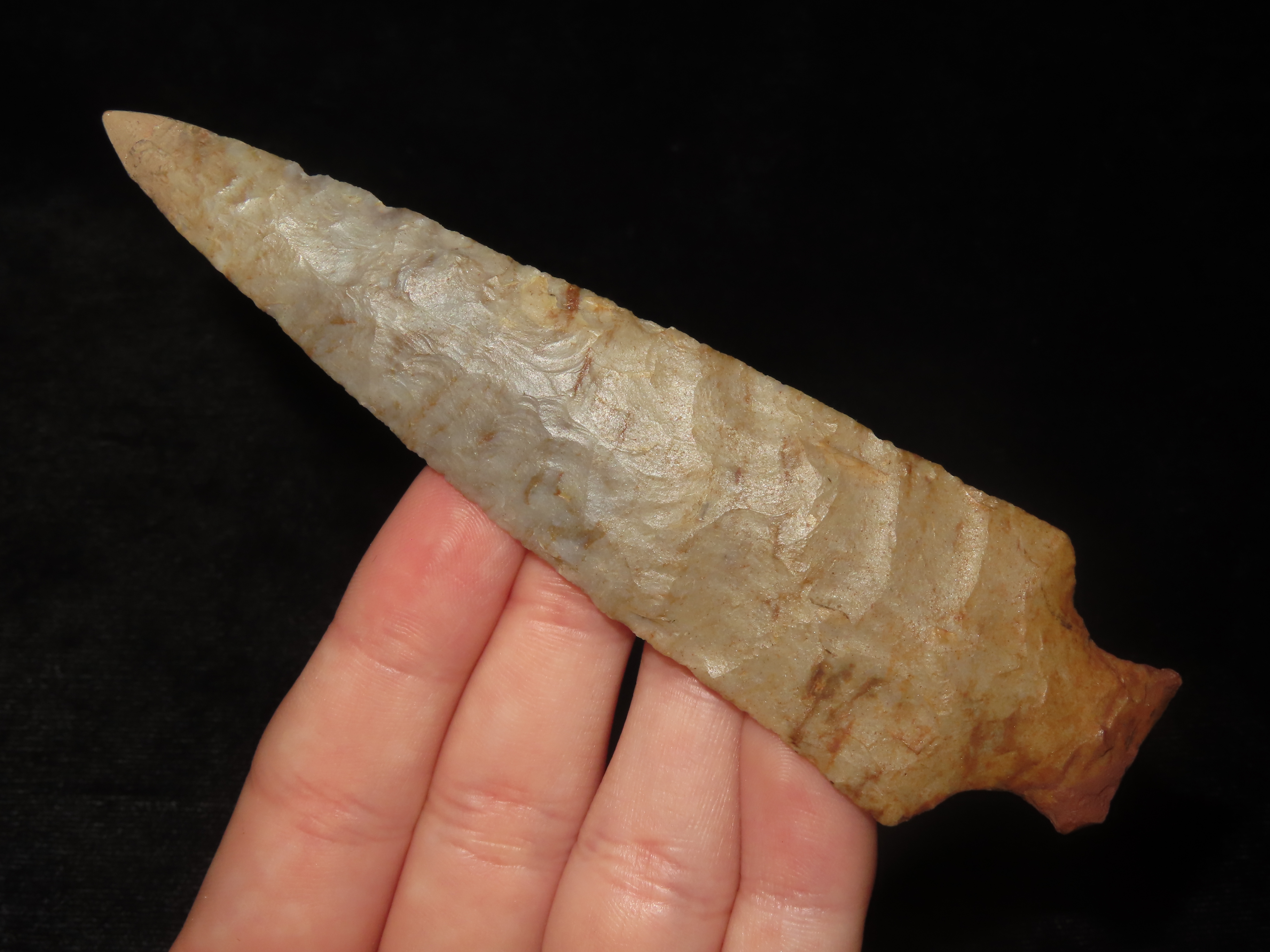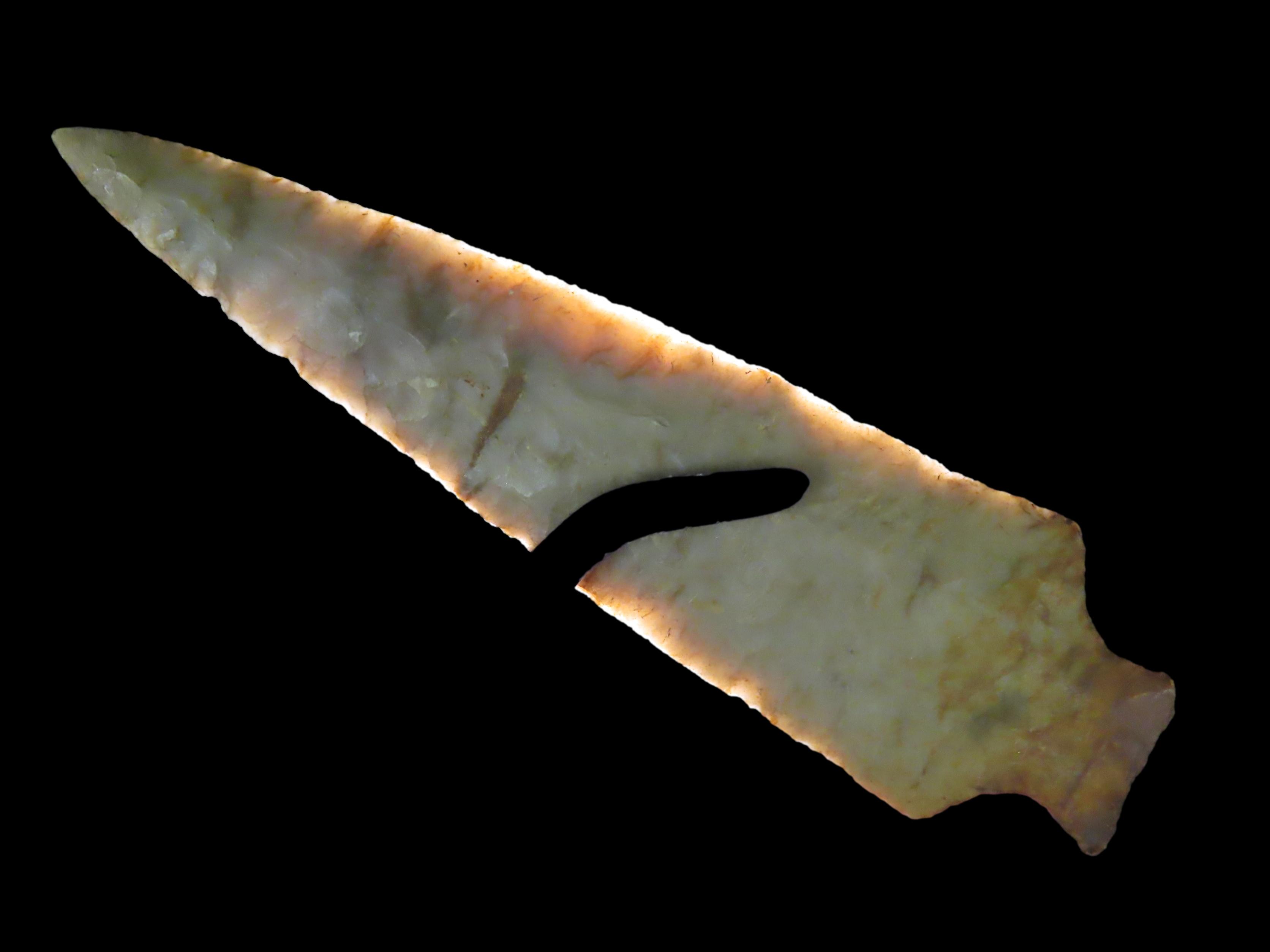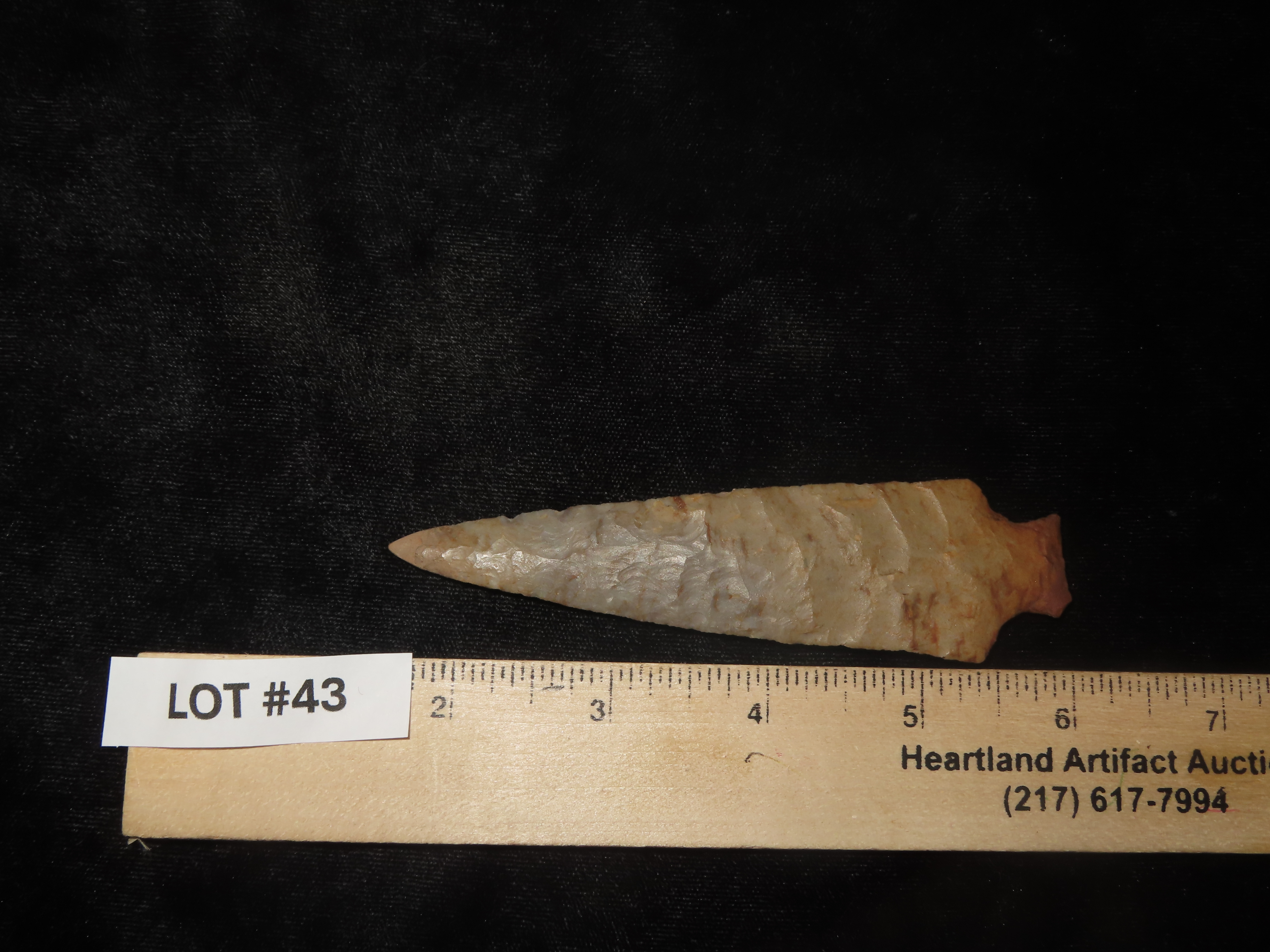 4 1/2″ Ohio Ashtabula, Flint Ridge (Restored Tip) Beautiful Color, Translucent, Very Thin & Expertly Flaked Example. Does have the last 1/4″ of the Tip Restored, But what a Great Example of the Type!