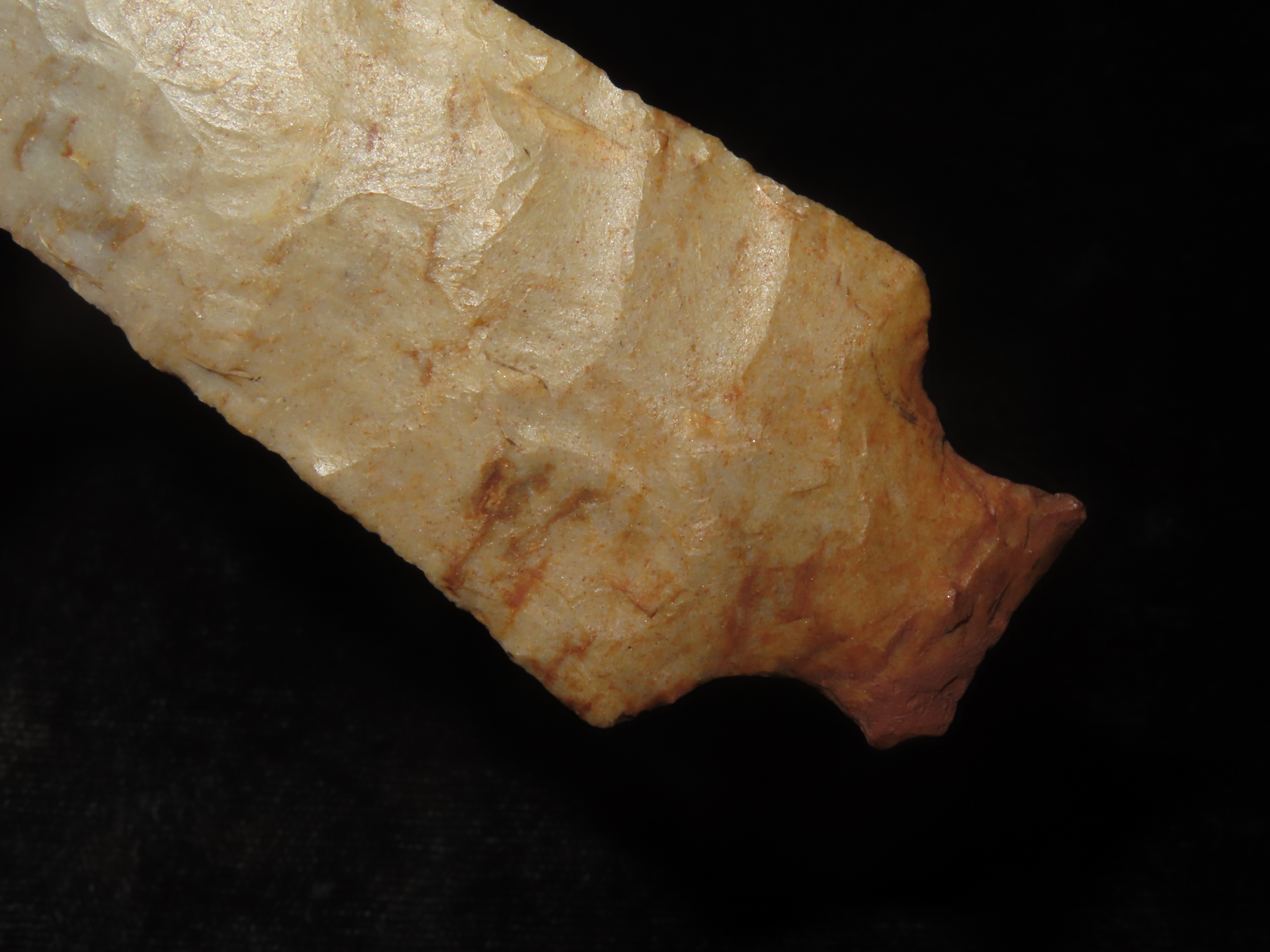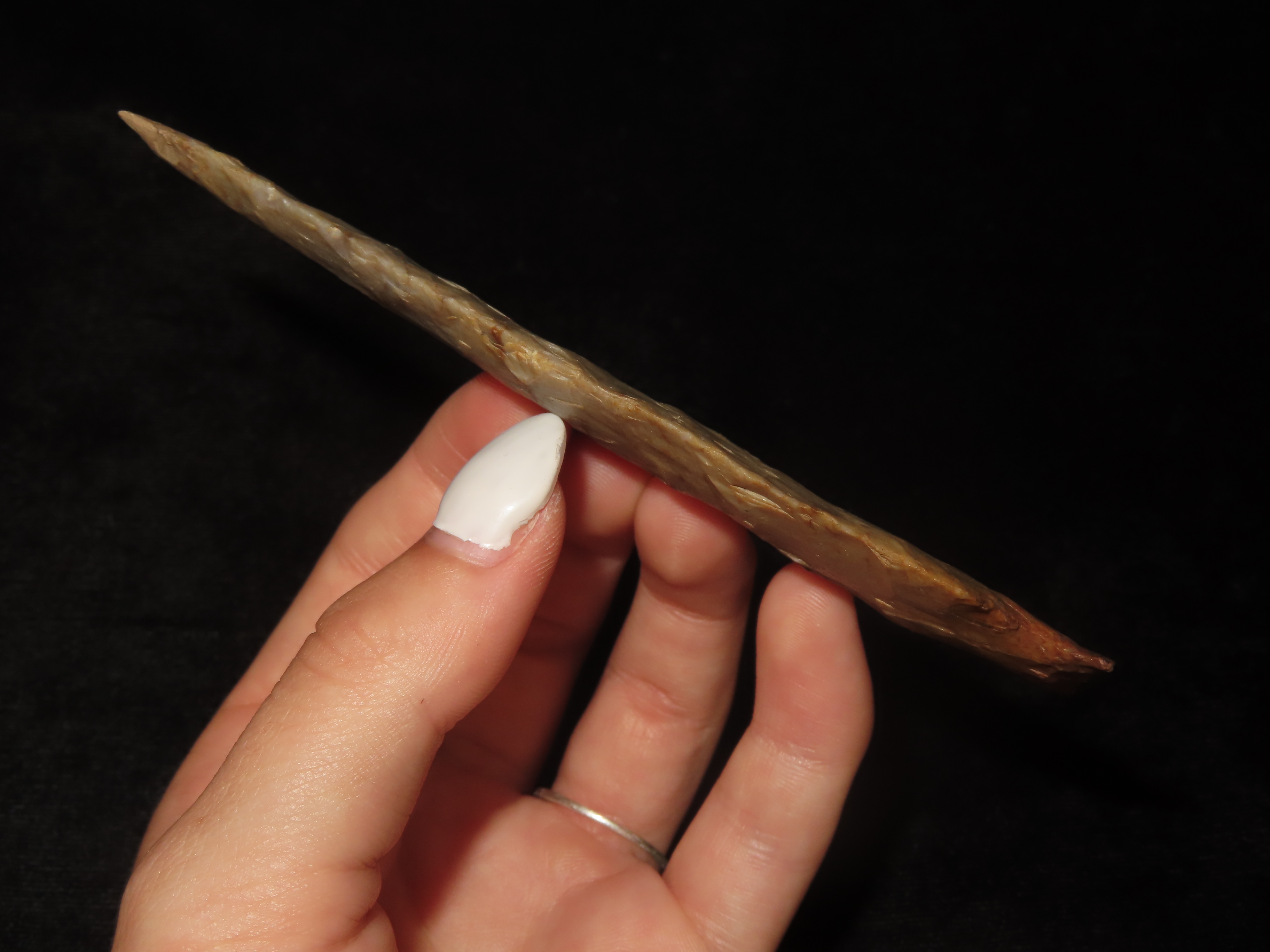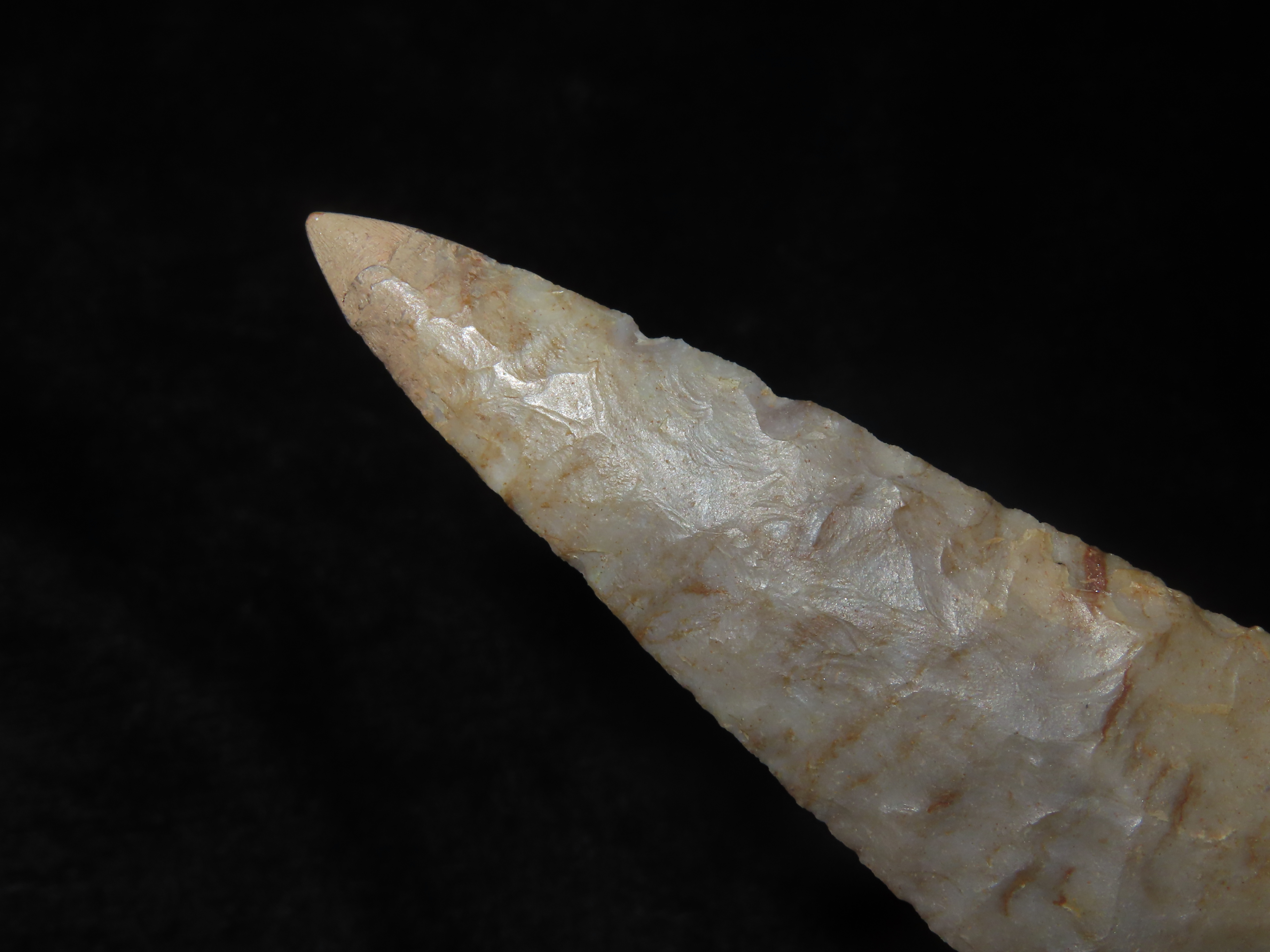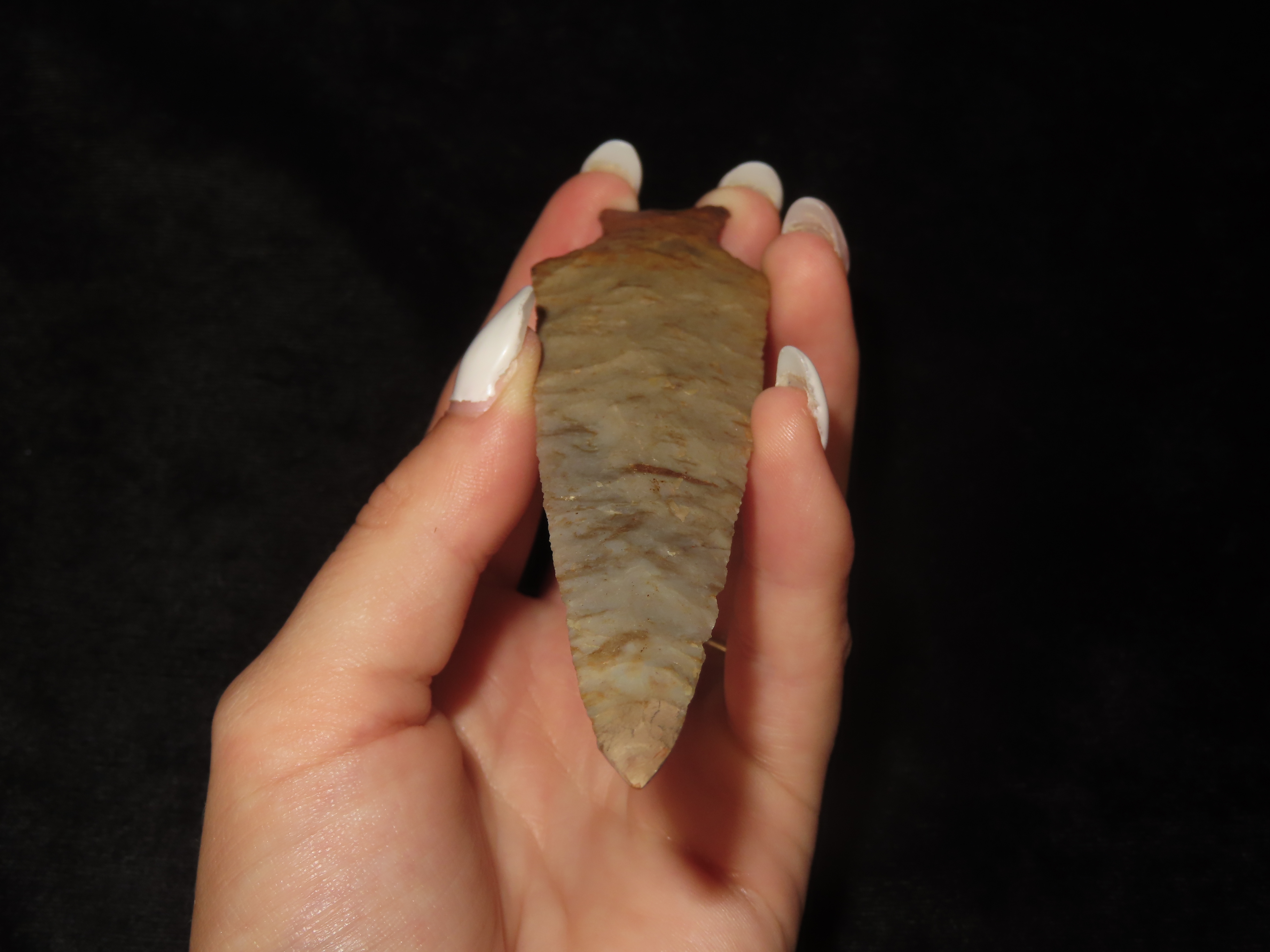 4 1/2″ Ohio Ashtabula, Flint Ridge (Restored Tip) Beautiful Color, Translucent, Very Thin & Expertly Flaked Example. Does have the last 1/4″ of the Tip Restored, But what a Great Example of the Type!