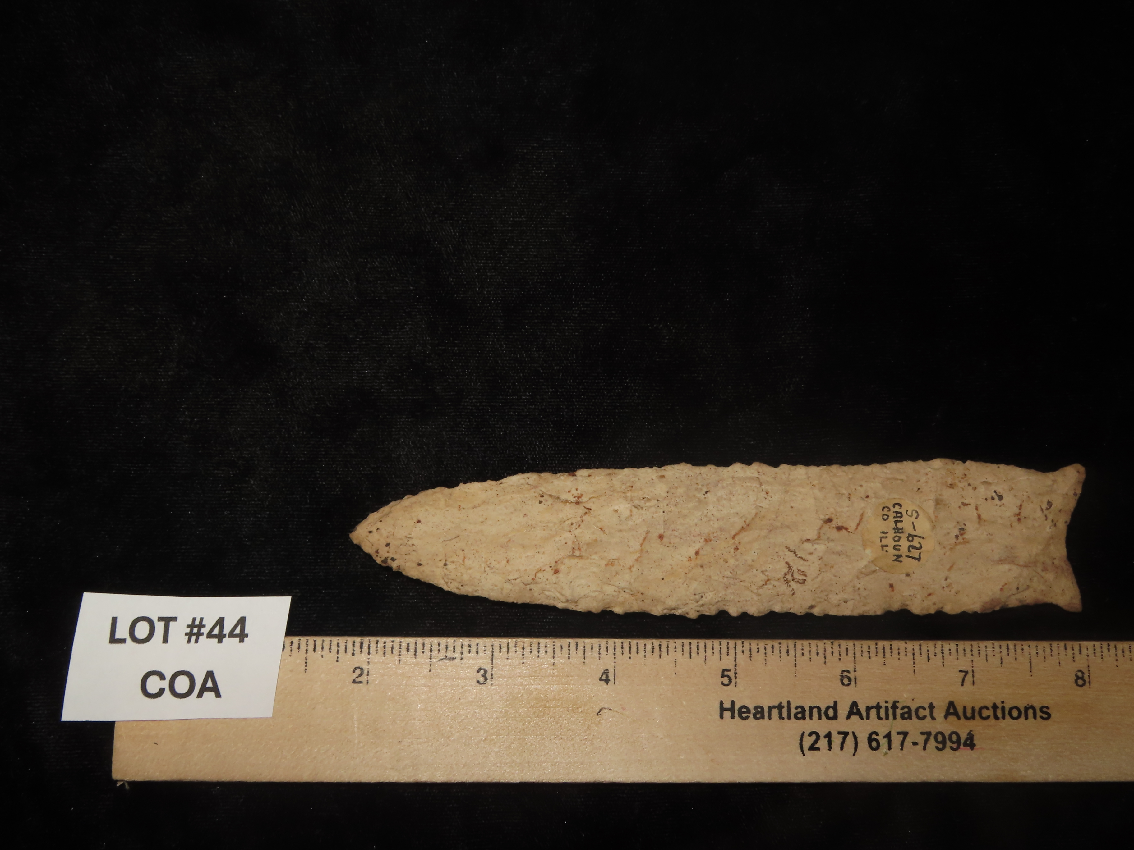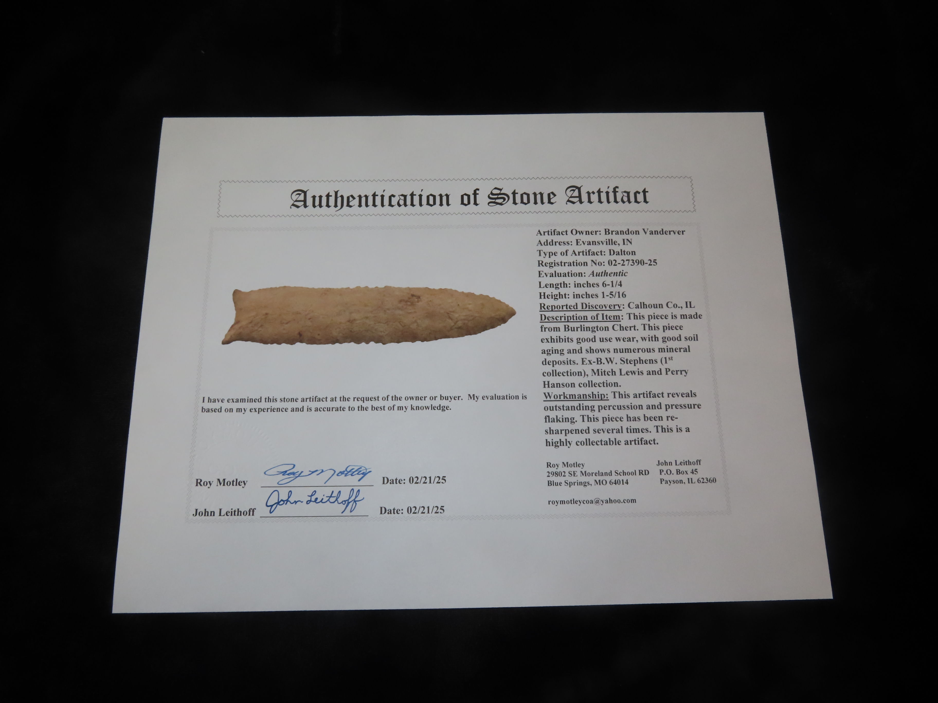 Phenomenal Dalton, 6 1/4″ Long, Calhoun Co. Illinois, Motley COA. Ex B.W. Stephens 1st Collection purchased on 9-22-1923, later sold to Tom Moxley, then onto Mitch Lewis, Perry Hanson, Brandon Vanderver. This is the first time to ever be sold Publicly. Collector Grade Example with Super History!