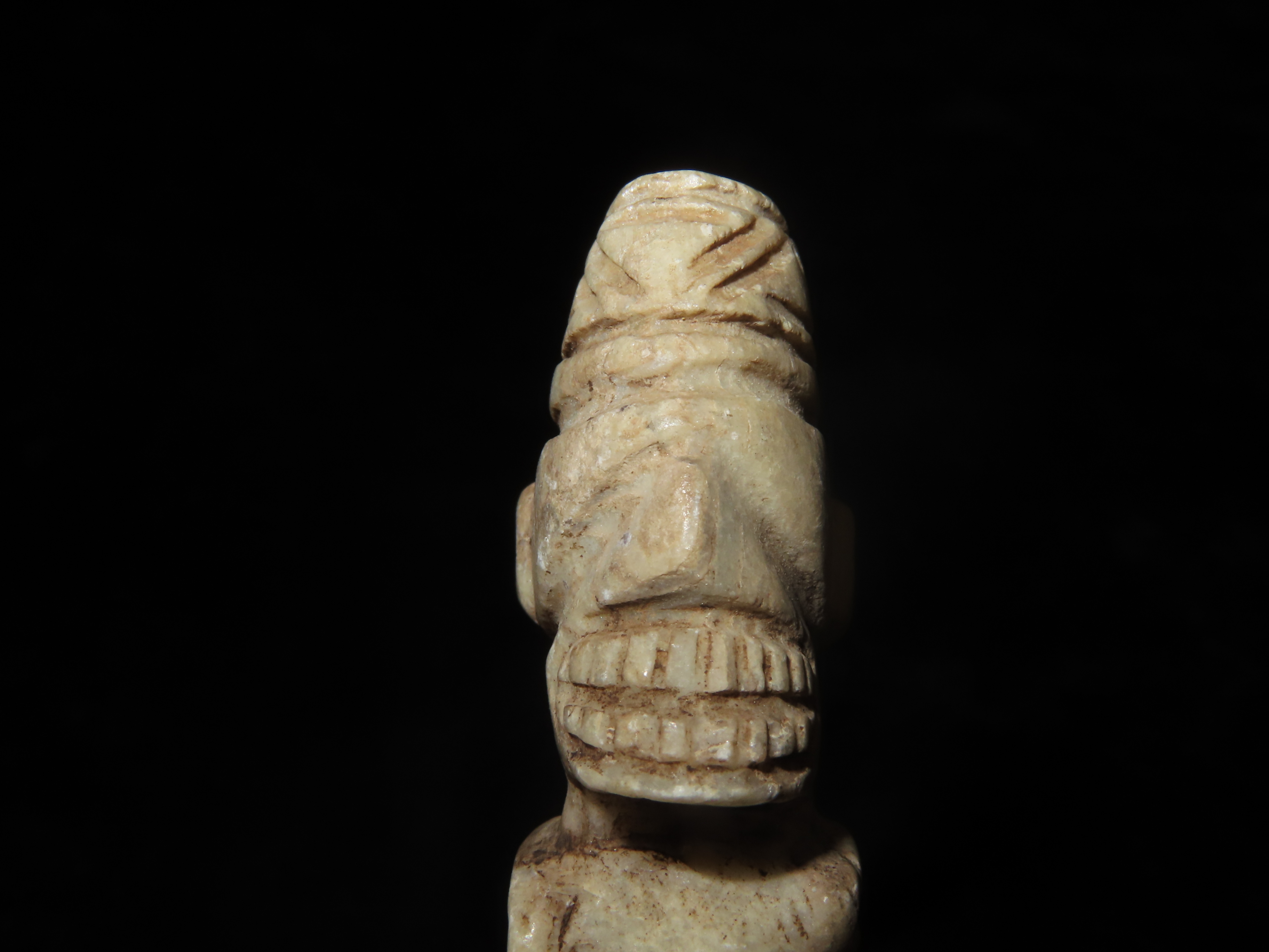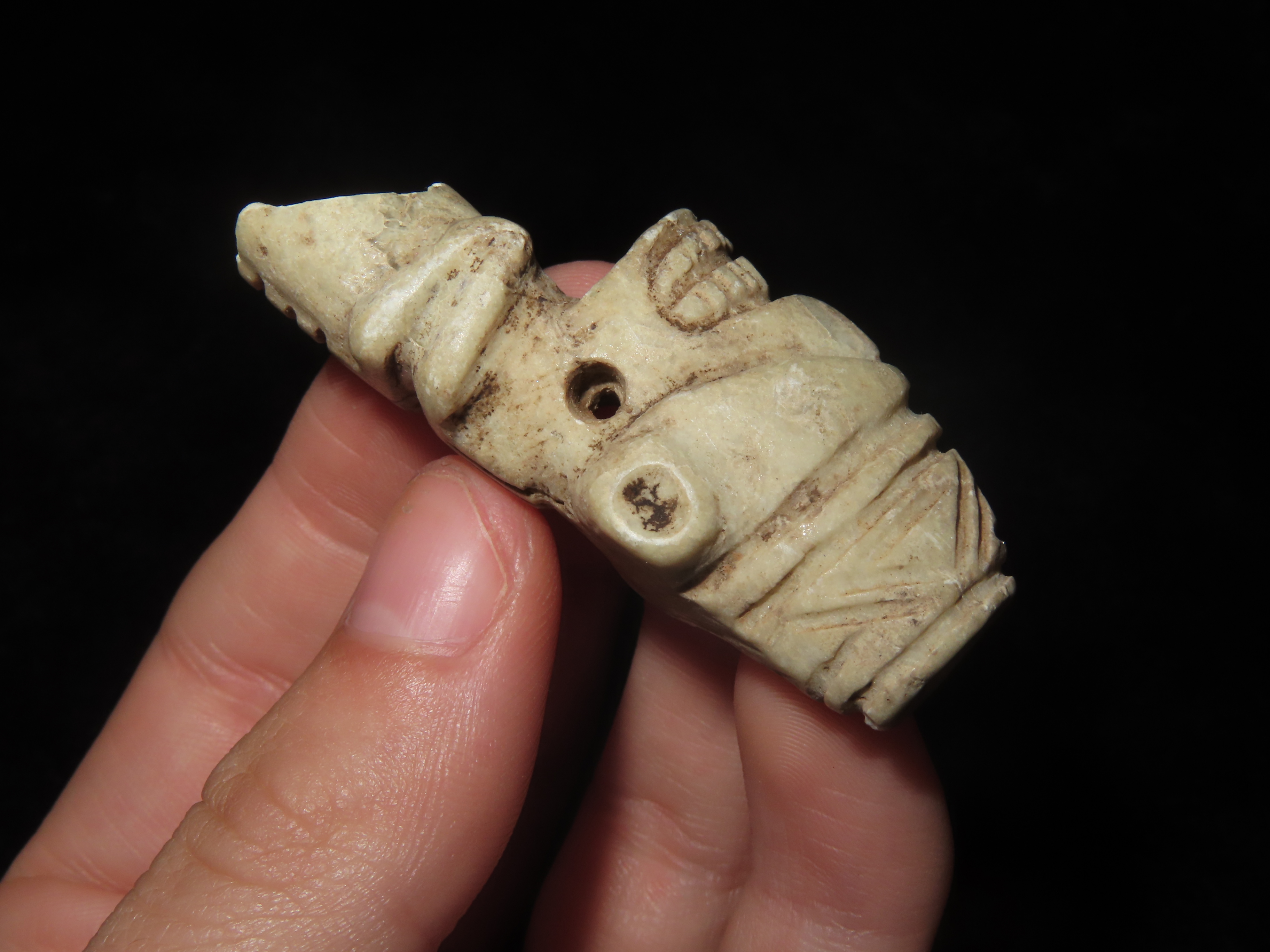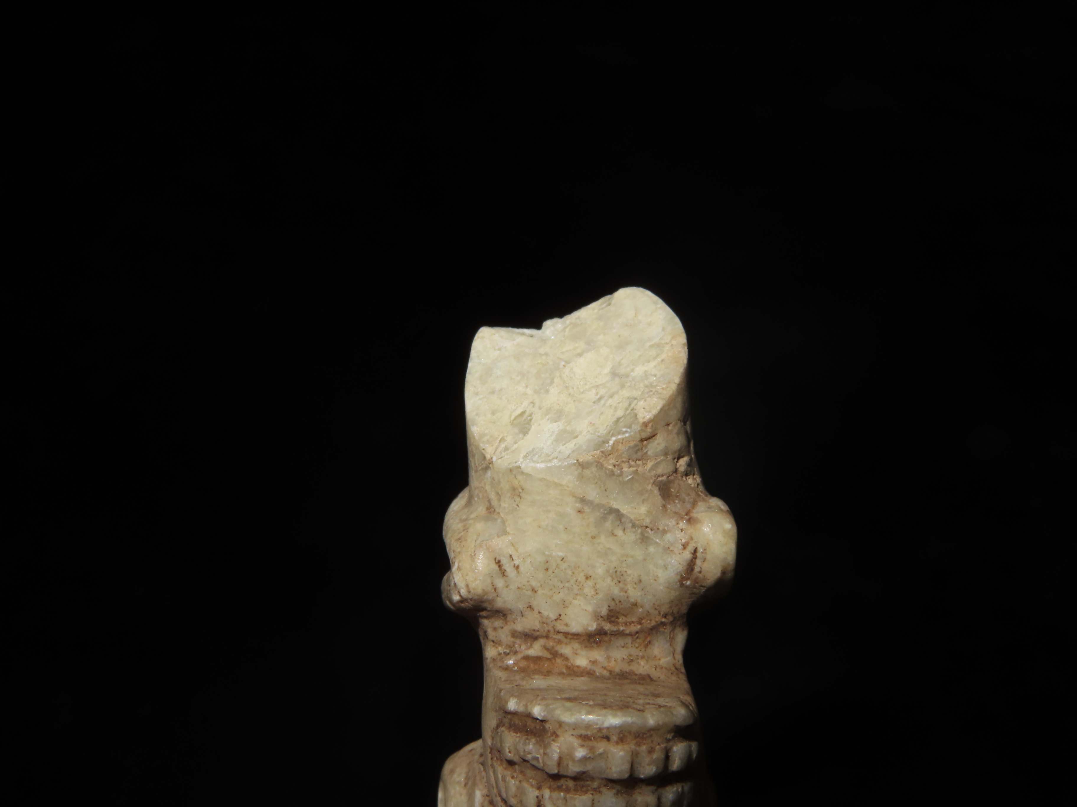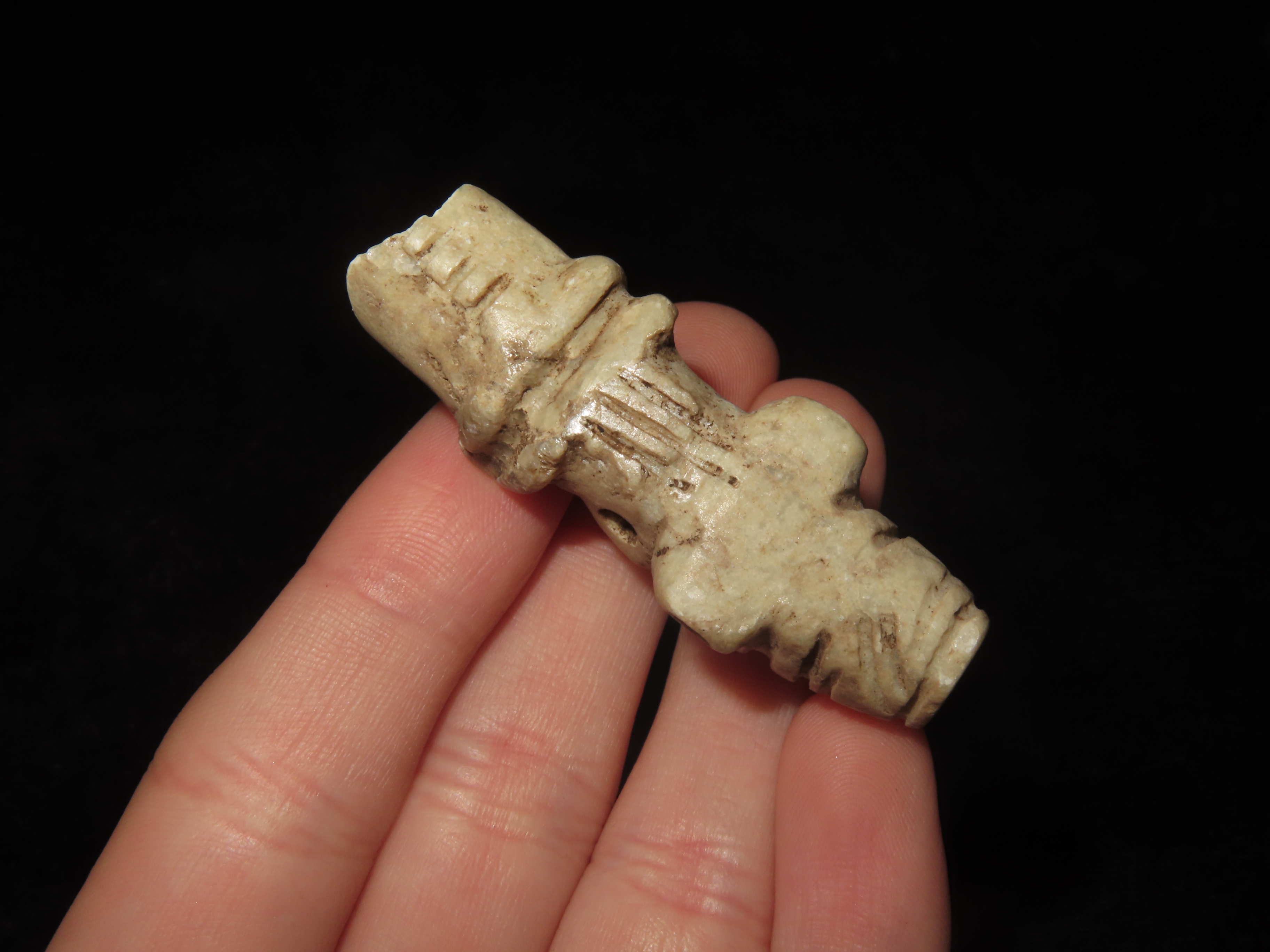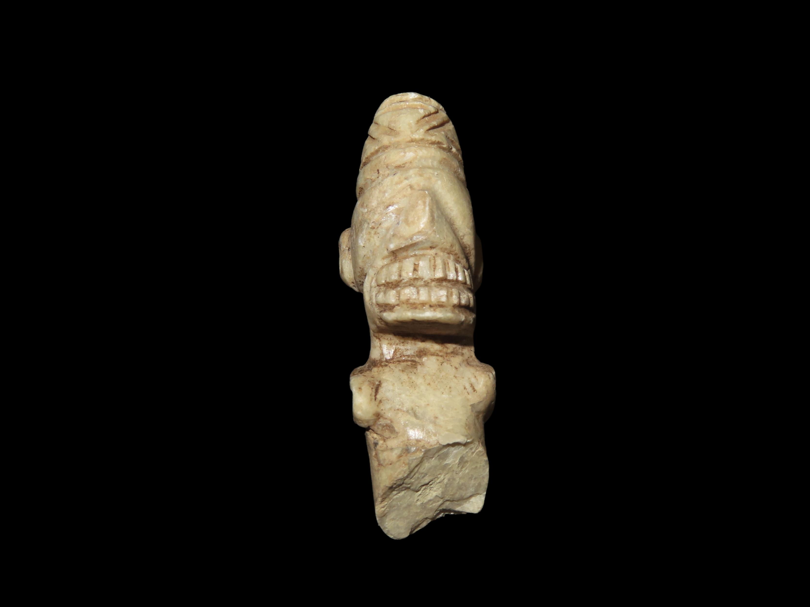 Elaborate Mayan Bound Captive Human Effigy Pendant, Has a very Distinct Blindfold, Arms tied behind the back. Broken at the Torso and missing the lower half, but a Very rare & Highly Detailed example.