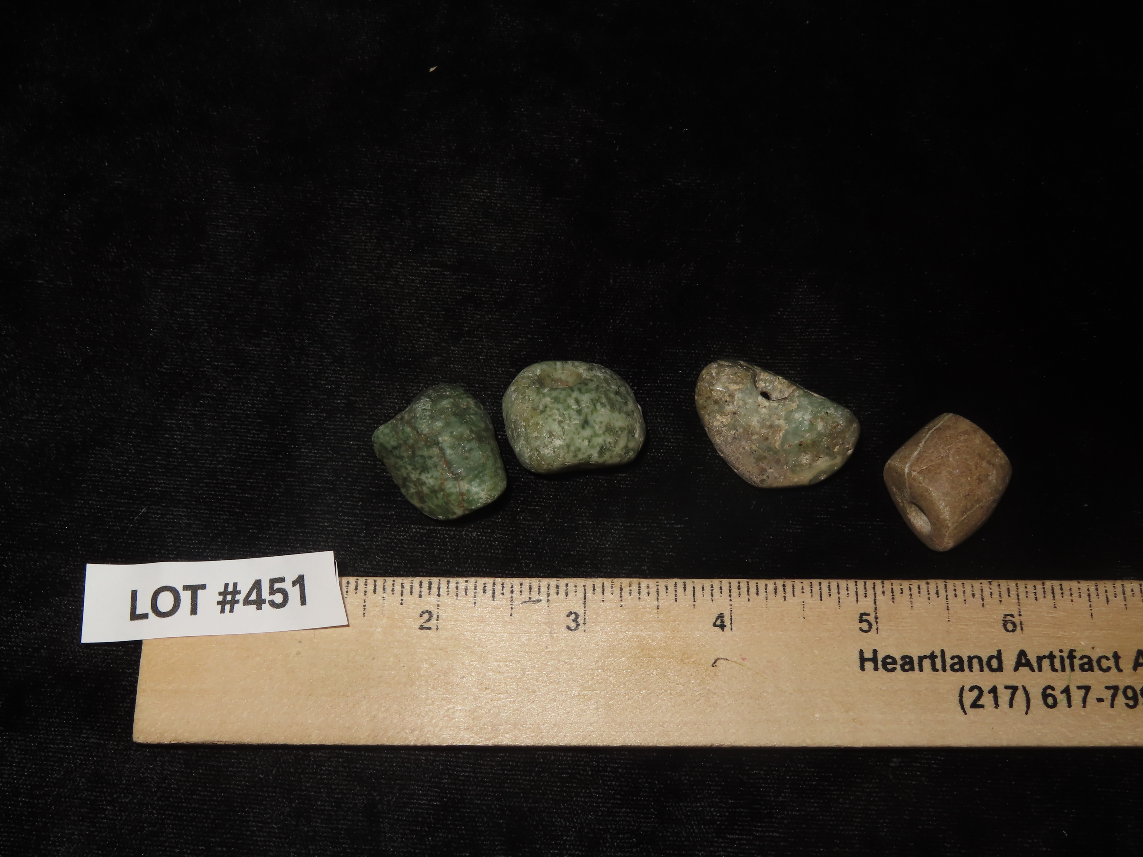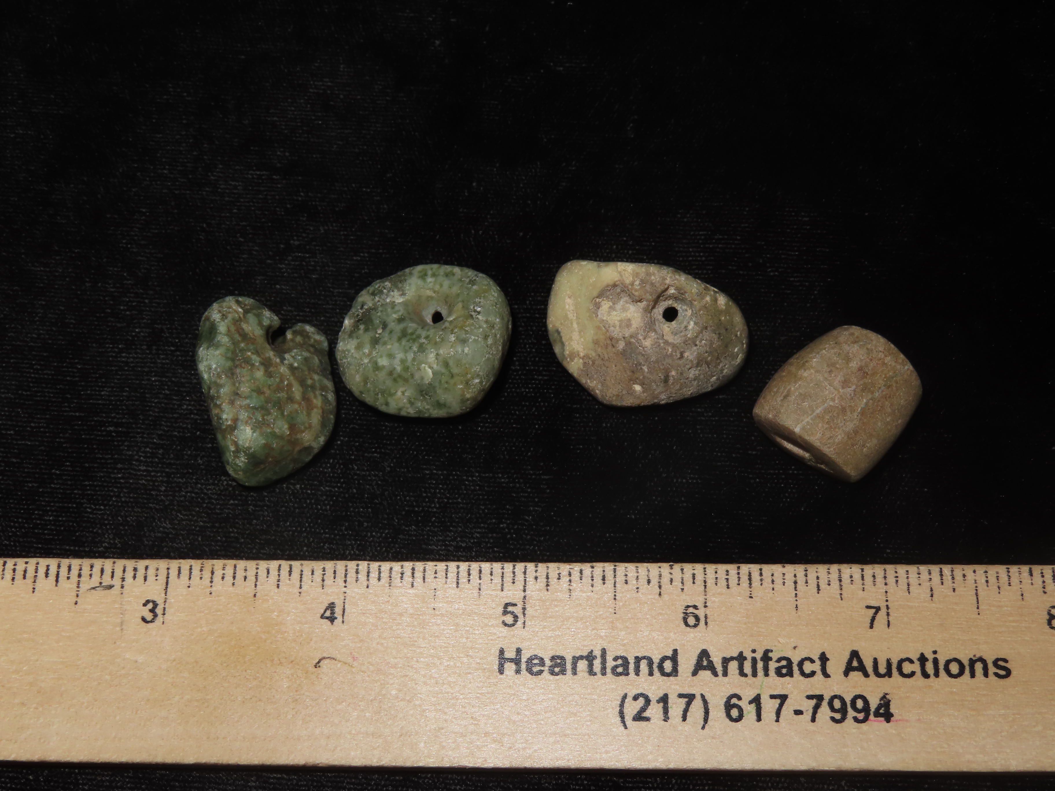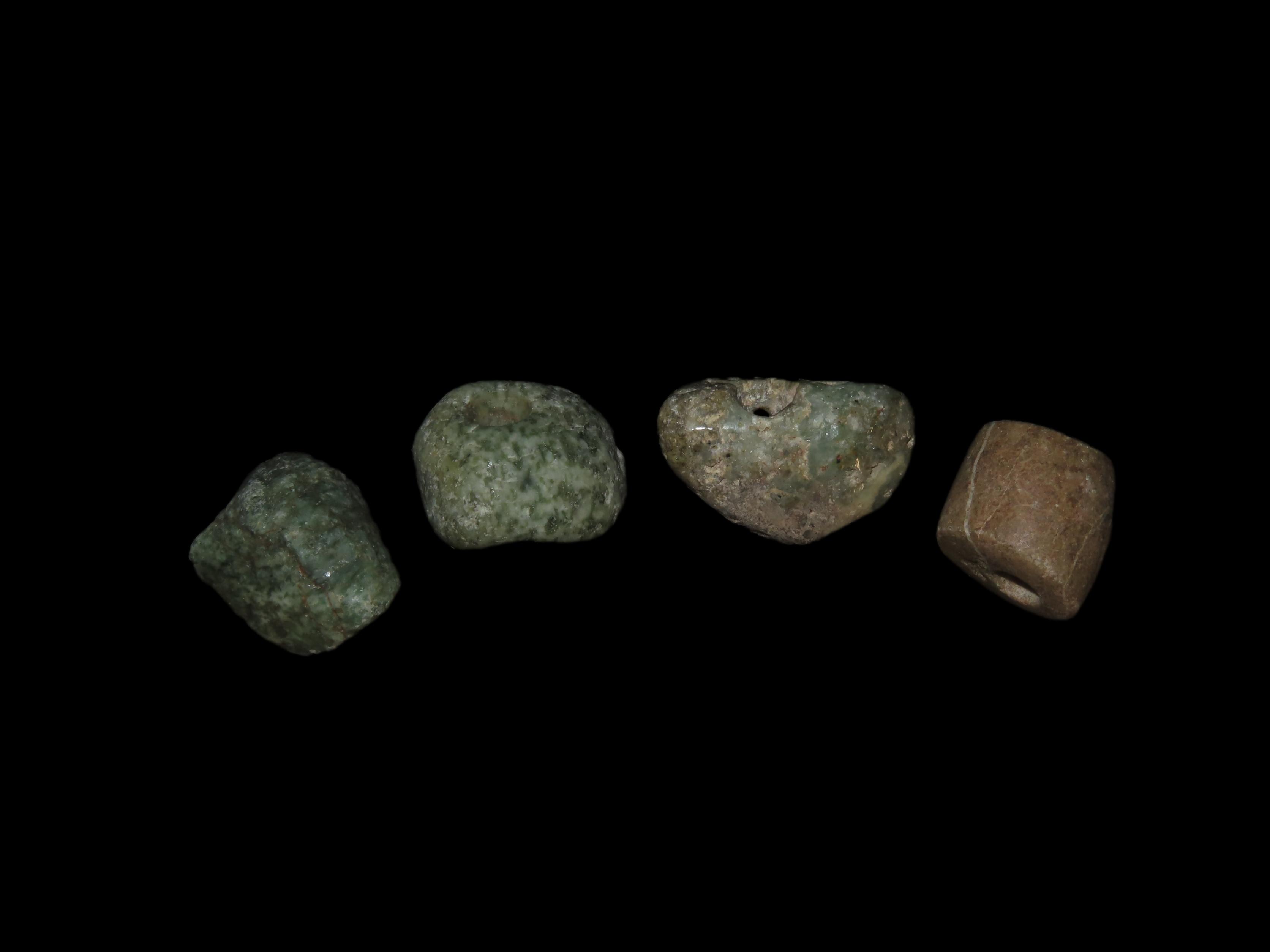 3 Colorful Mezcala Jadeite Beads, Guerrero México, largest is 1 1/4″ wide.