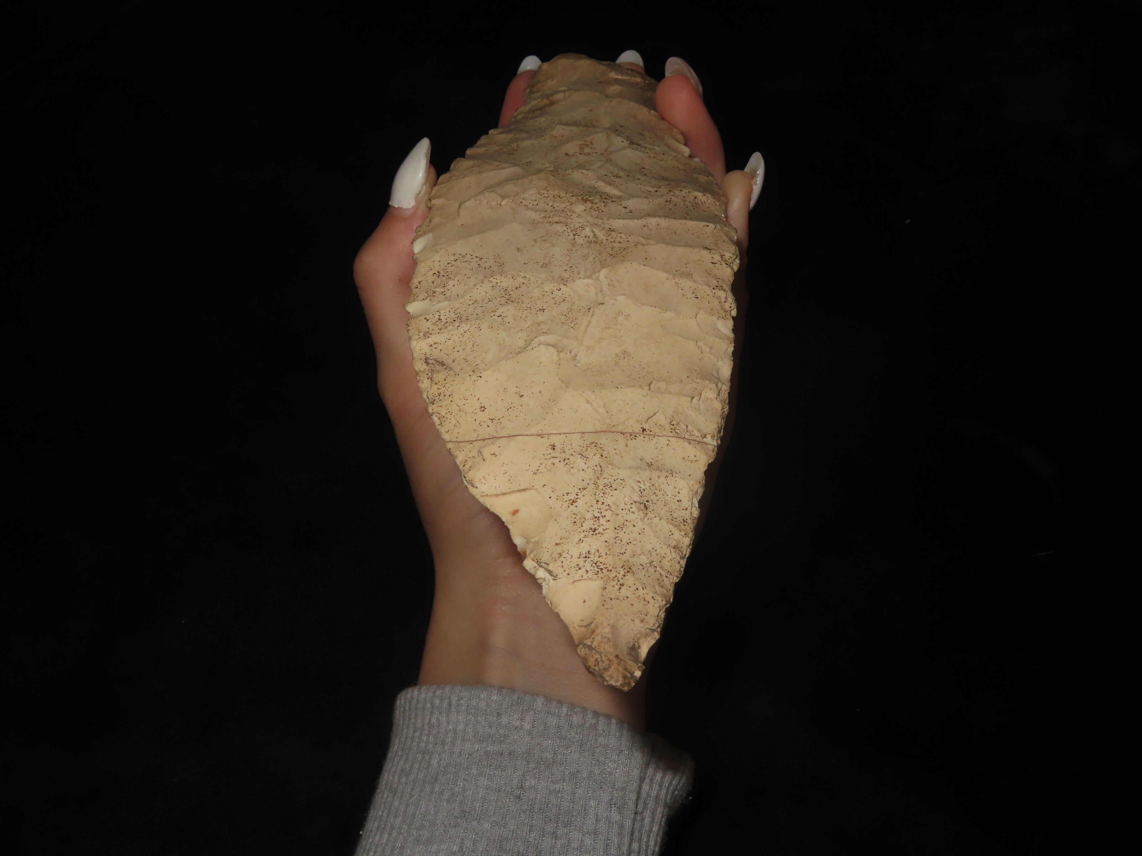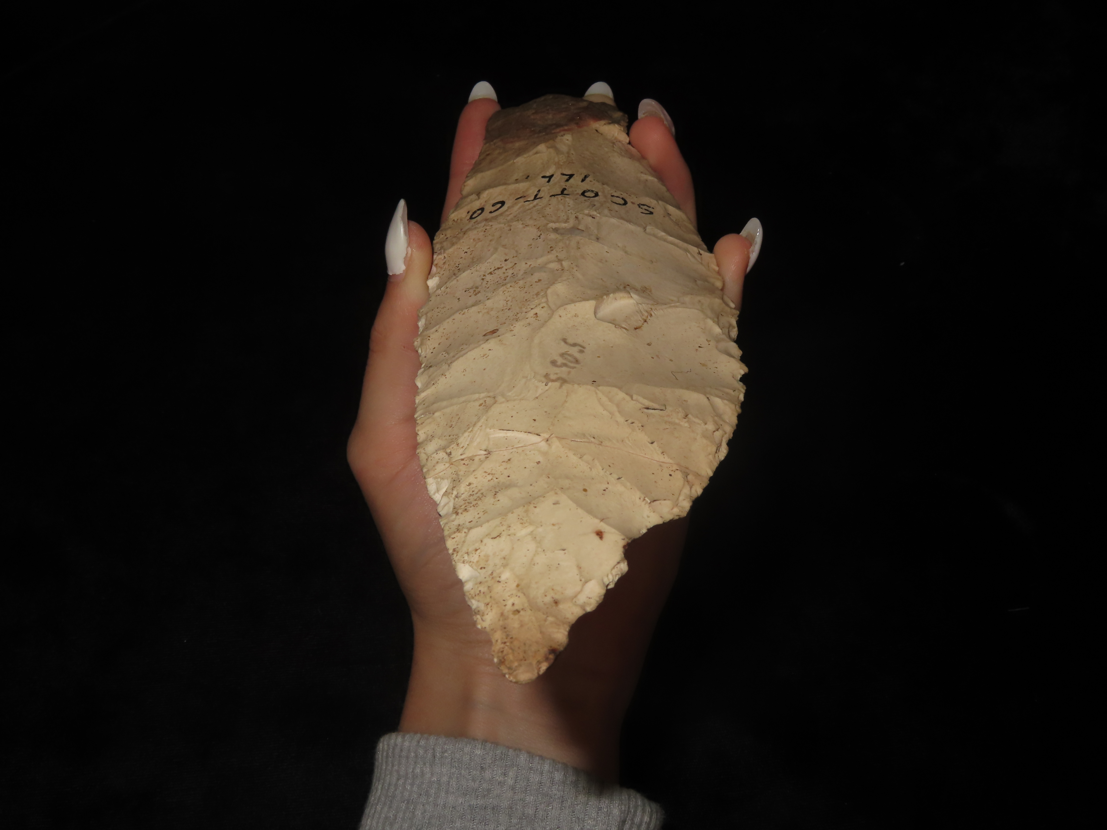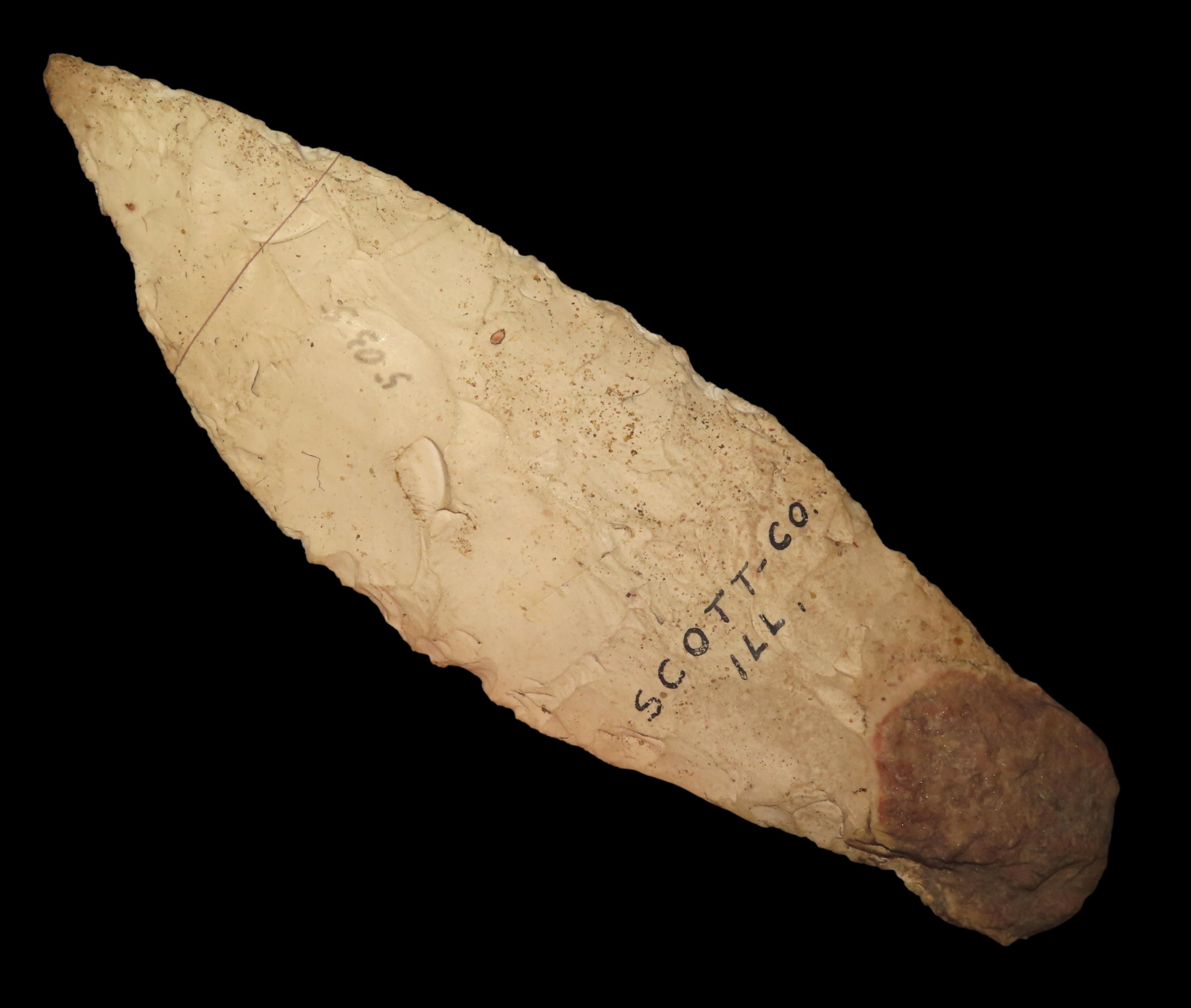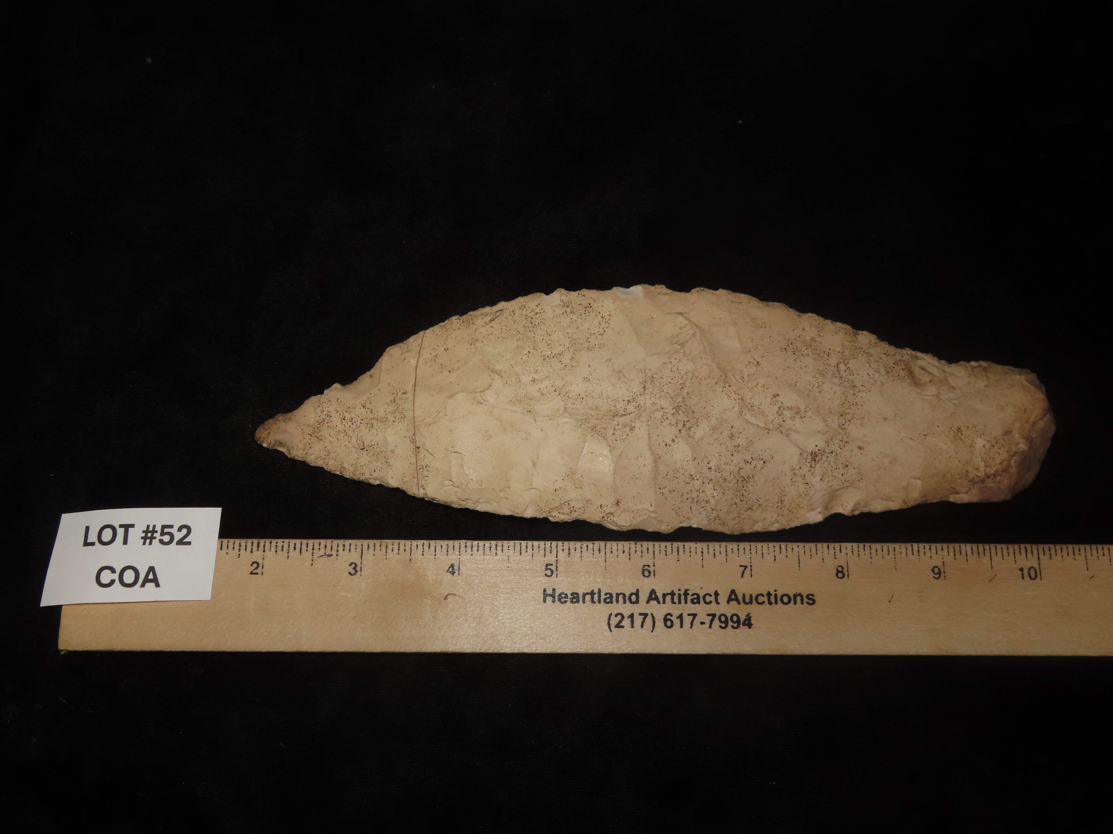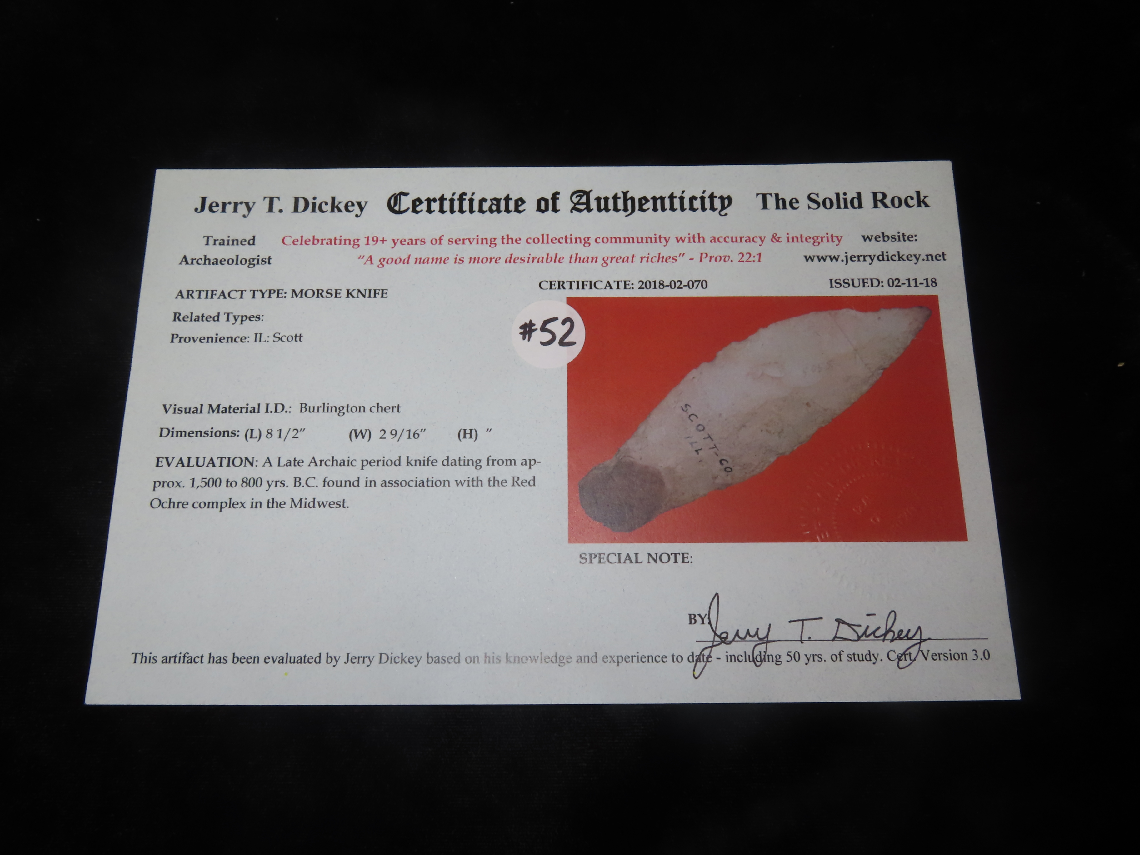 Huge 8 1/2″ Morse Knife, Scott Co. Illinois, Dickey COA. Ex Floyd Ritter Collection, Very Large Colorful Well Patinated Example! Has a Beautiful Pinkish Quartz Vein running through the Material up near the tip. Heavily Patinated Example!