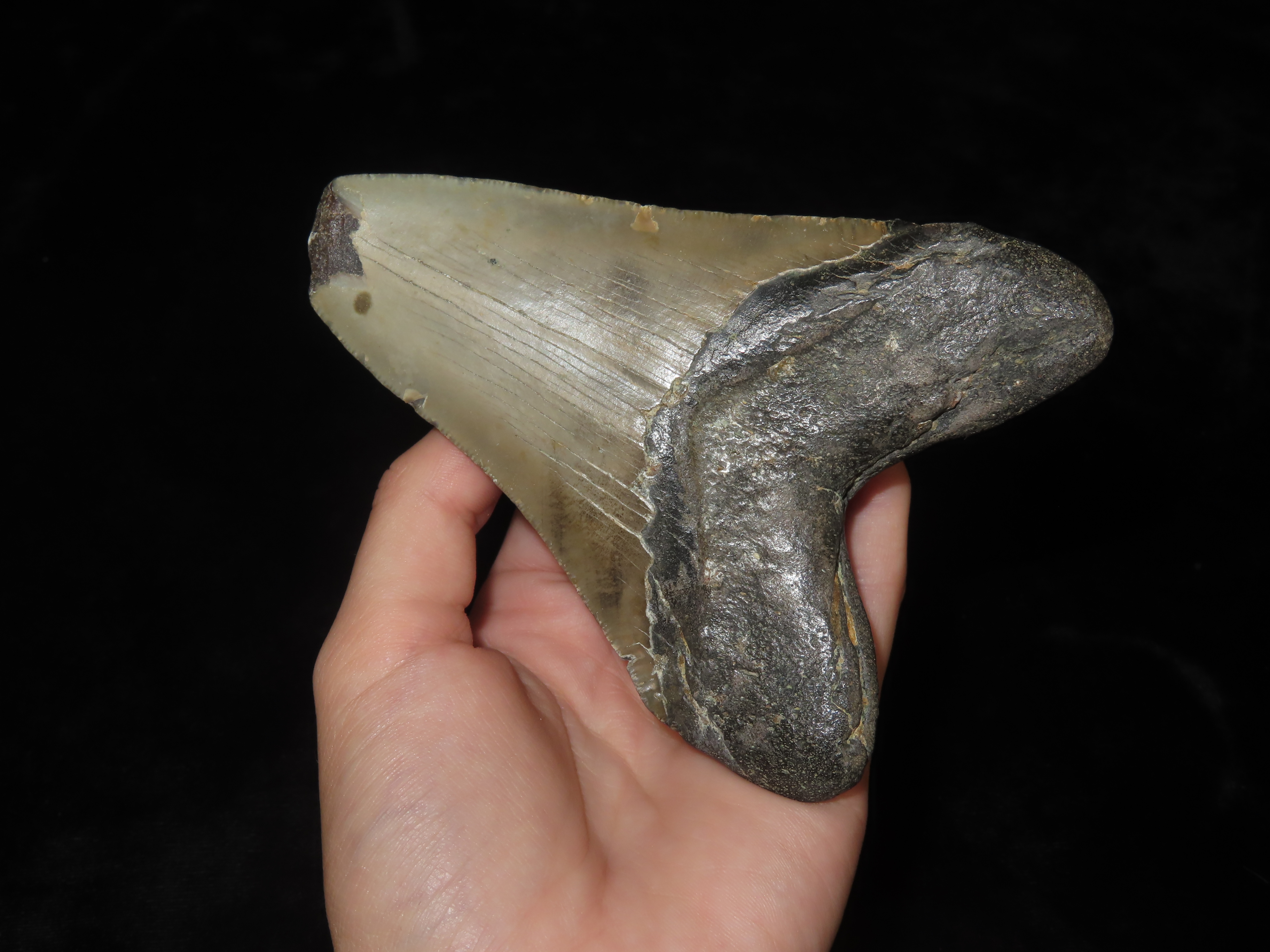 HUGE 4 9/16″ Megalodon Shark Tooth, 2.5-23 Million Year Old Fossil found off the coast of the Carolinas. No Repair, No Resto, No Polishing. Great Example!