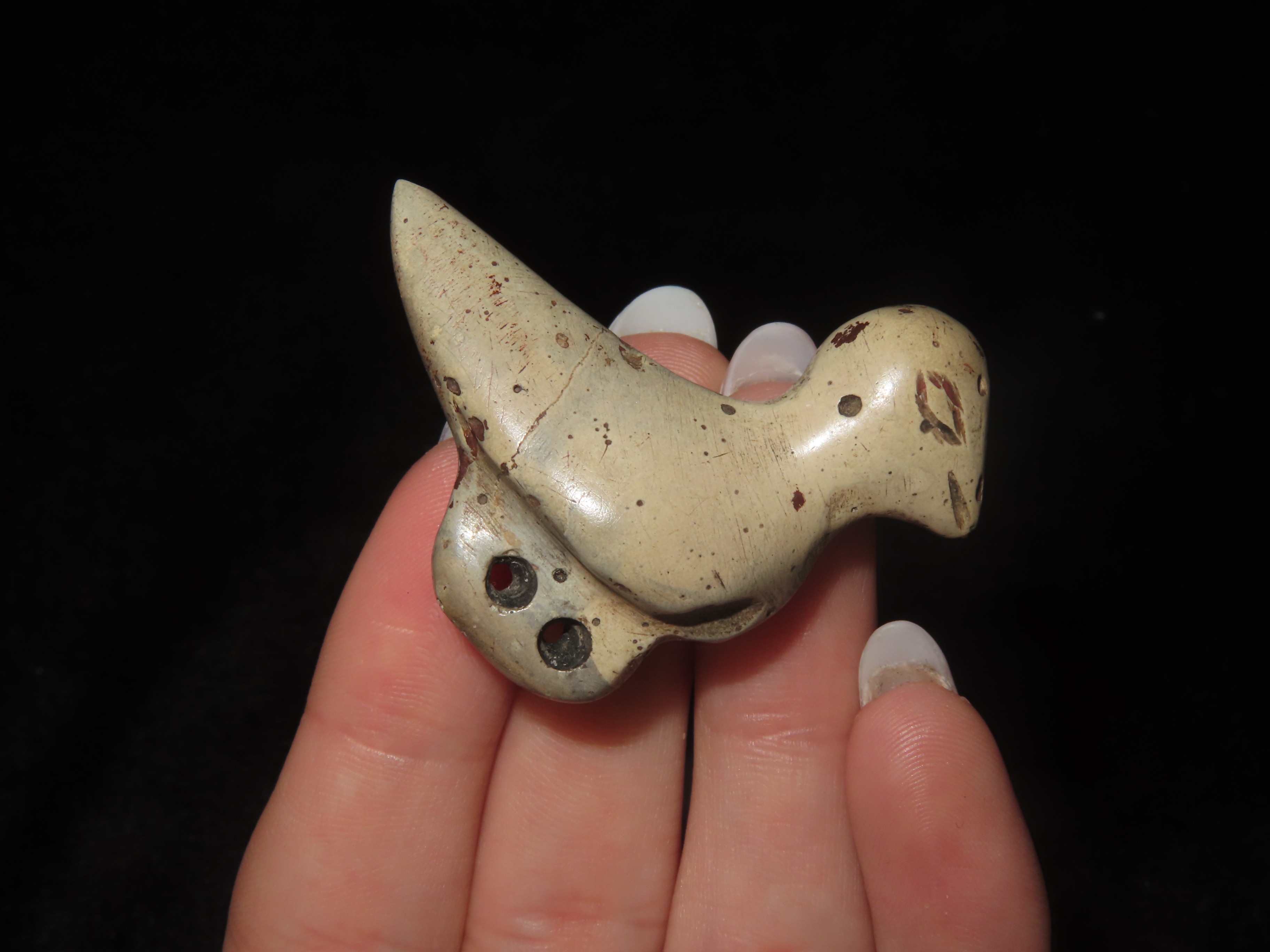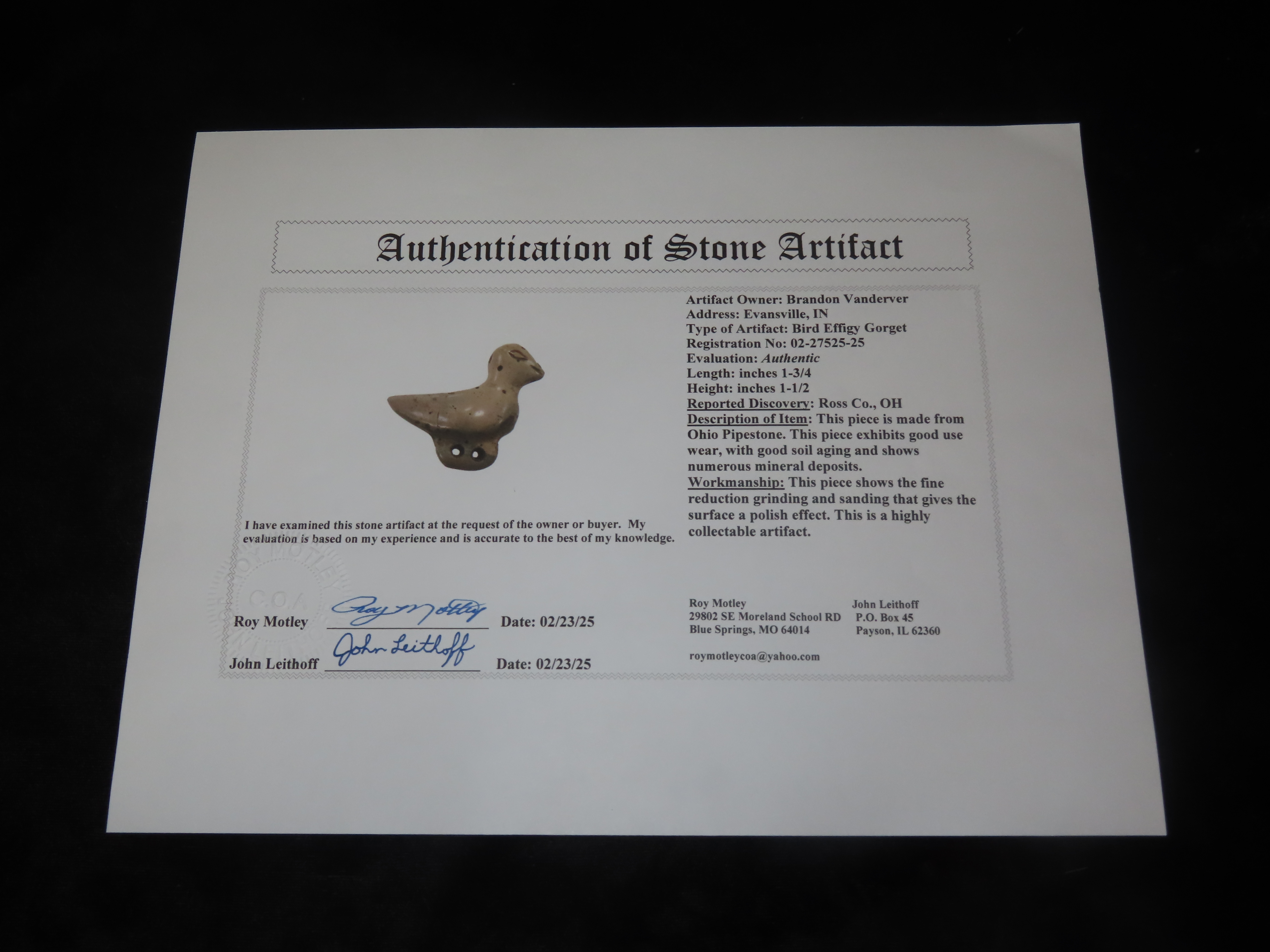 Amazing Bird Effigy Gorget, Ross Co. Ohio, Motley COA. Highly Polished Ohio Pipestone. Very Unique Piece, Very Artistic form. Broken and Glued on the Tail