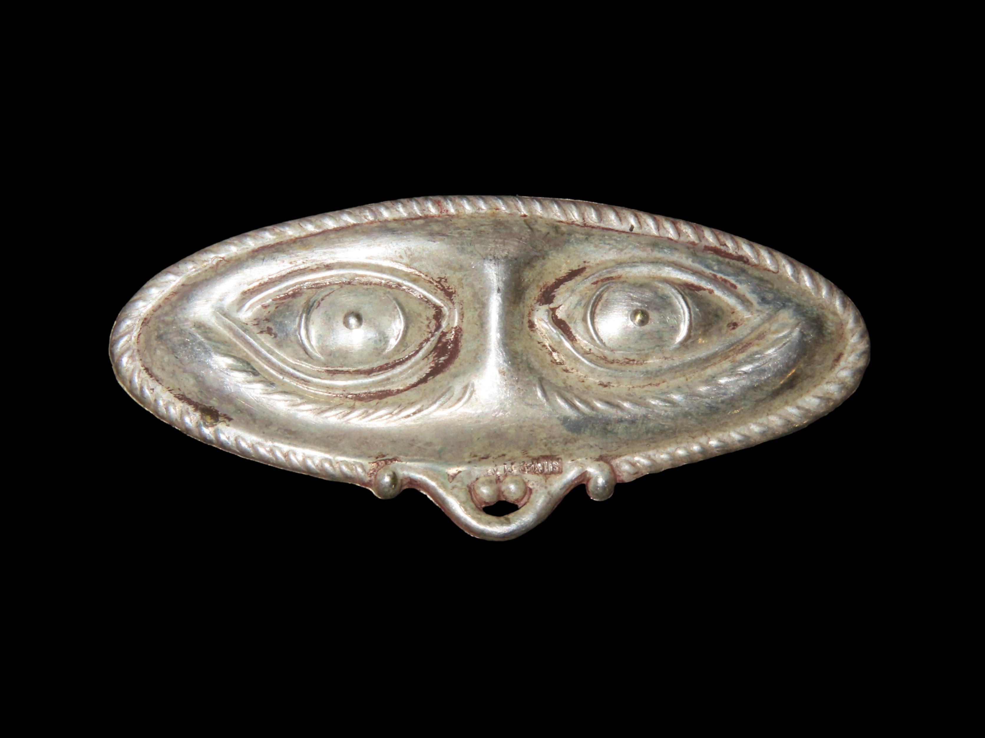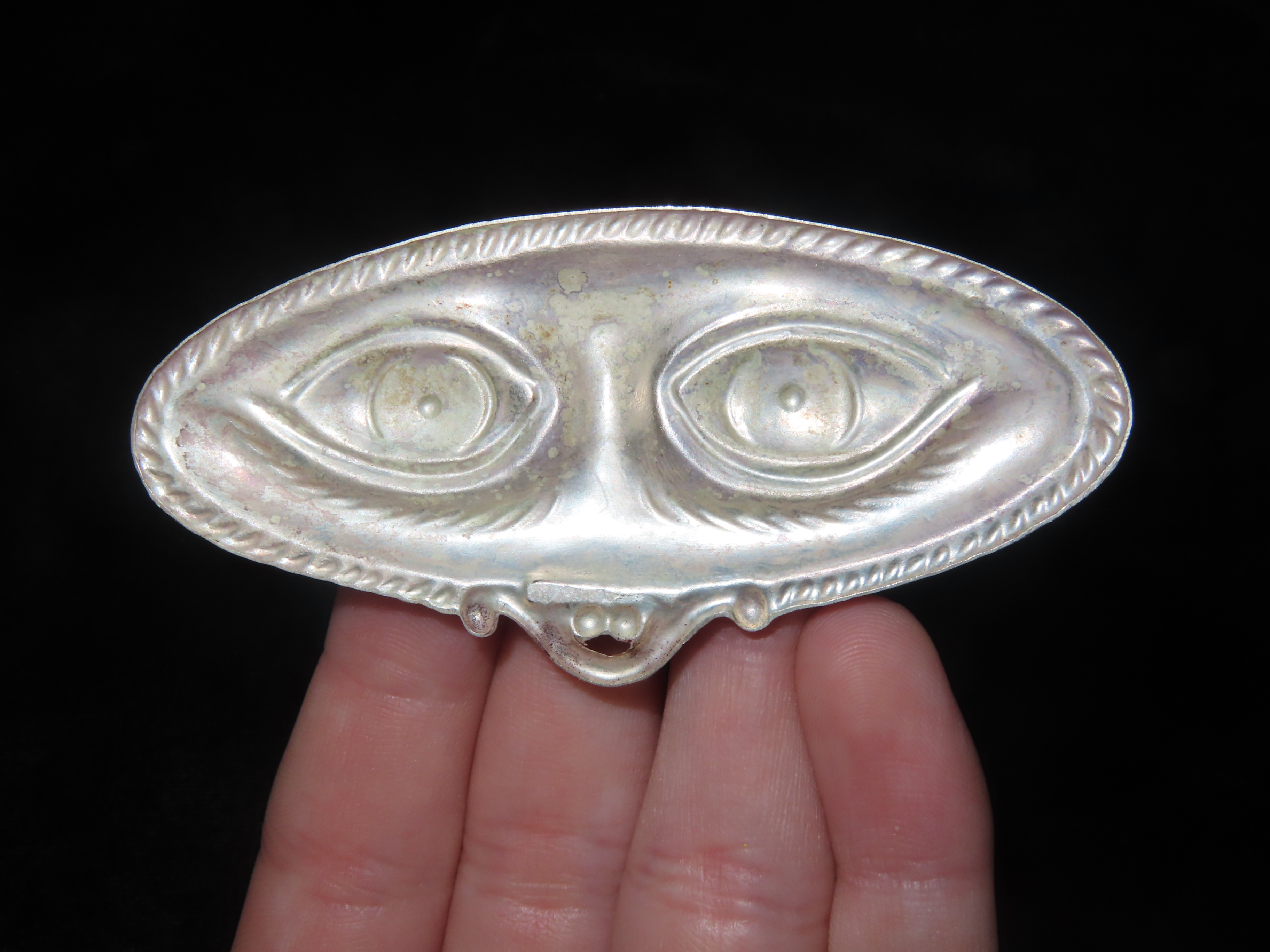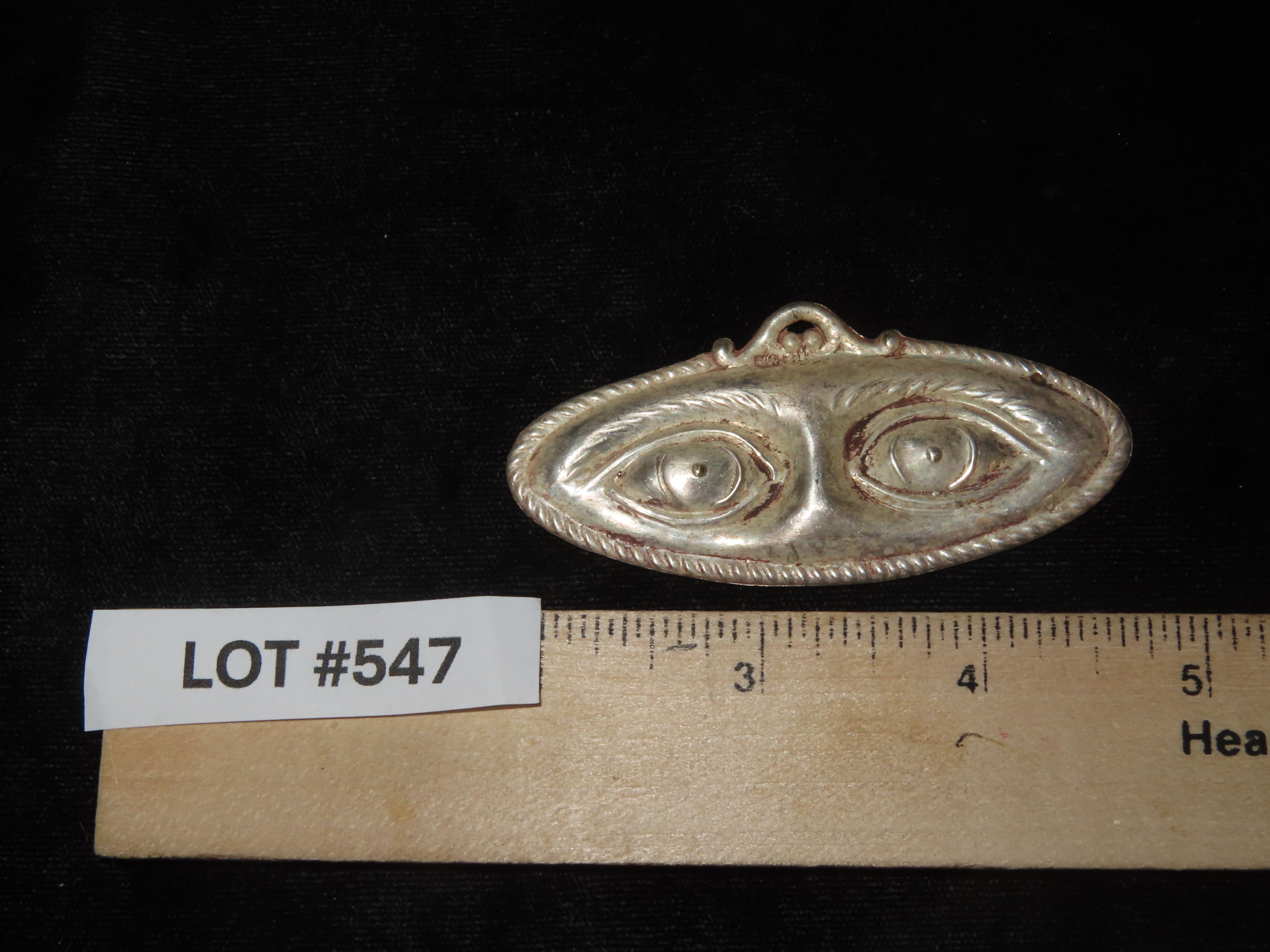 Nice 3″ Colonial Silver Milagro Pendant, Circa 1800’s-early 1900’s. Early Mexican / Spanish Era Folk Art Ex-Votos Religious Charms. This one in the Shape of a Human Face Mask. Very Detailed Example with Decorative Border.