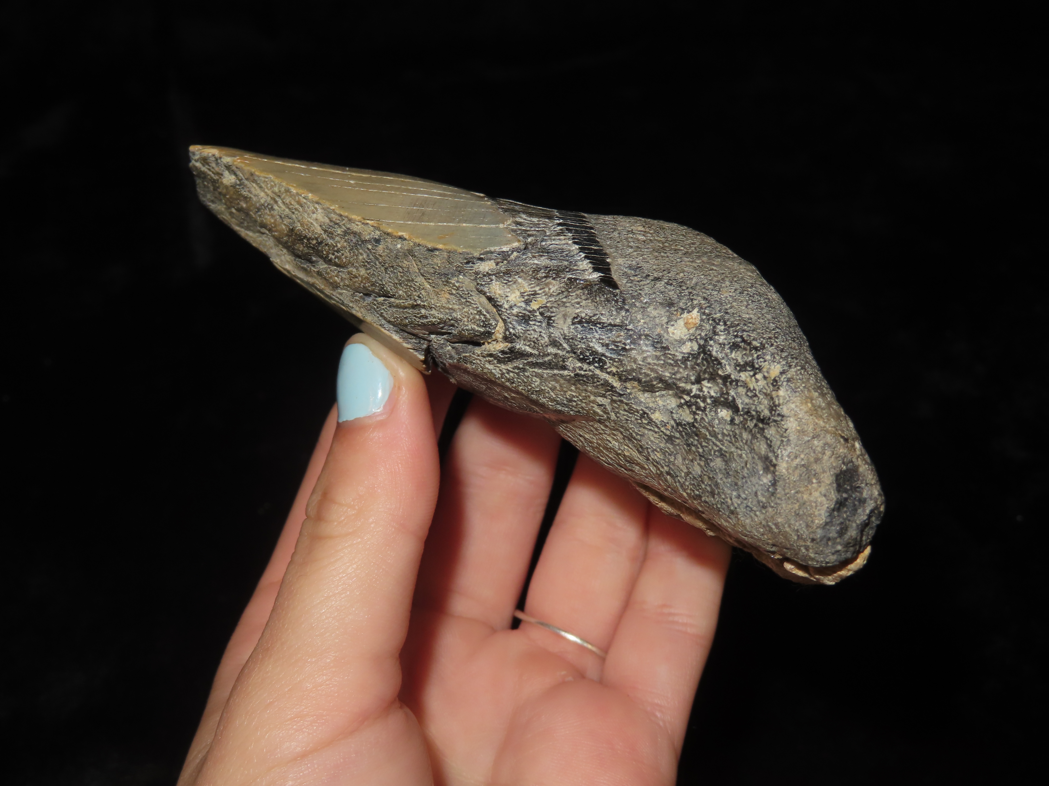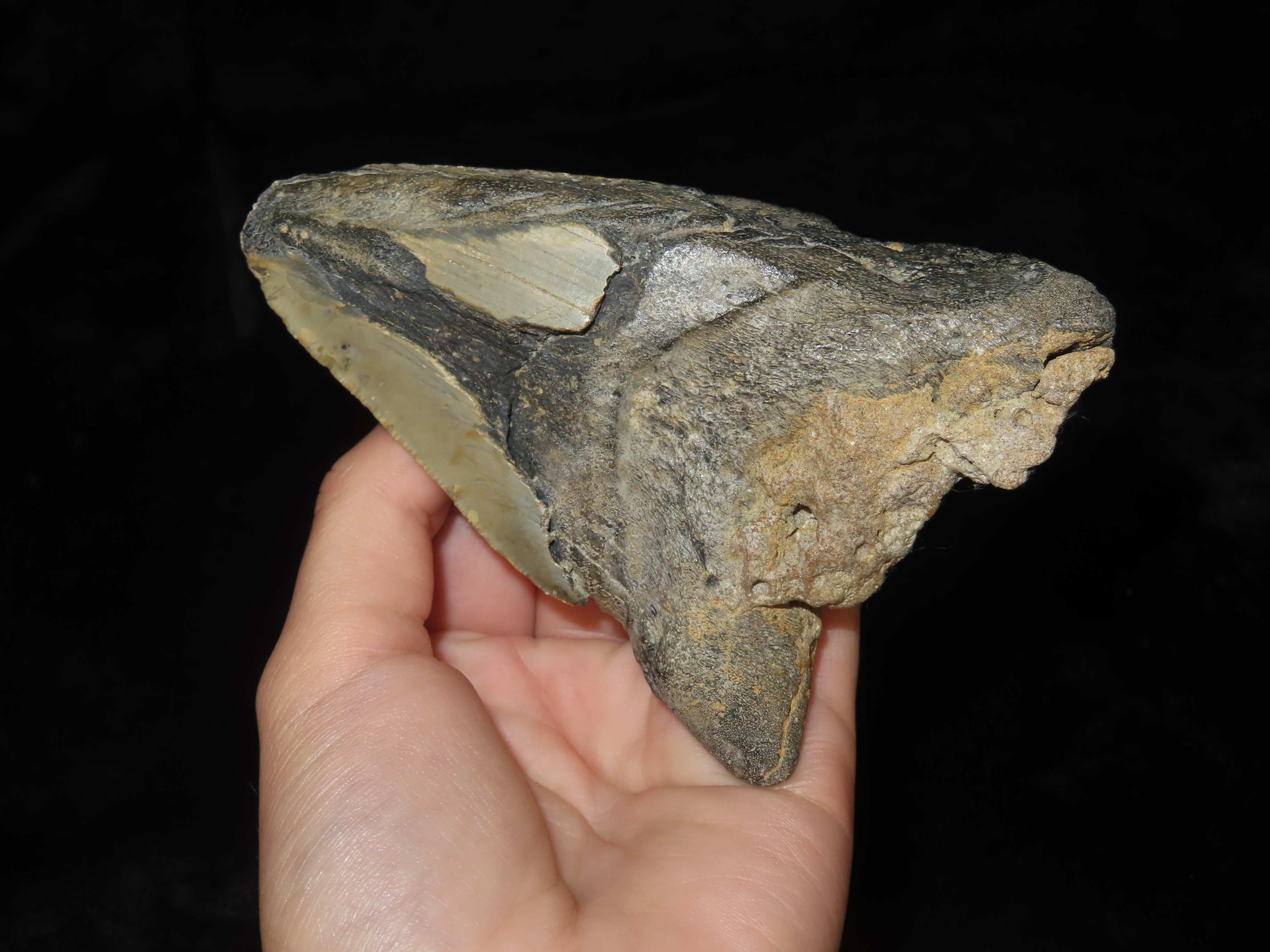 HUGE 4 1/2" Megalodon Shark Tooth, 2.5-23 Million Year Old Fossil found off the coast of the Carolinas. No Repair, No Resto, No Polishing. Great Example!
