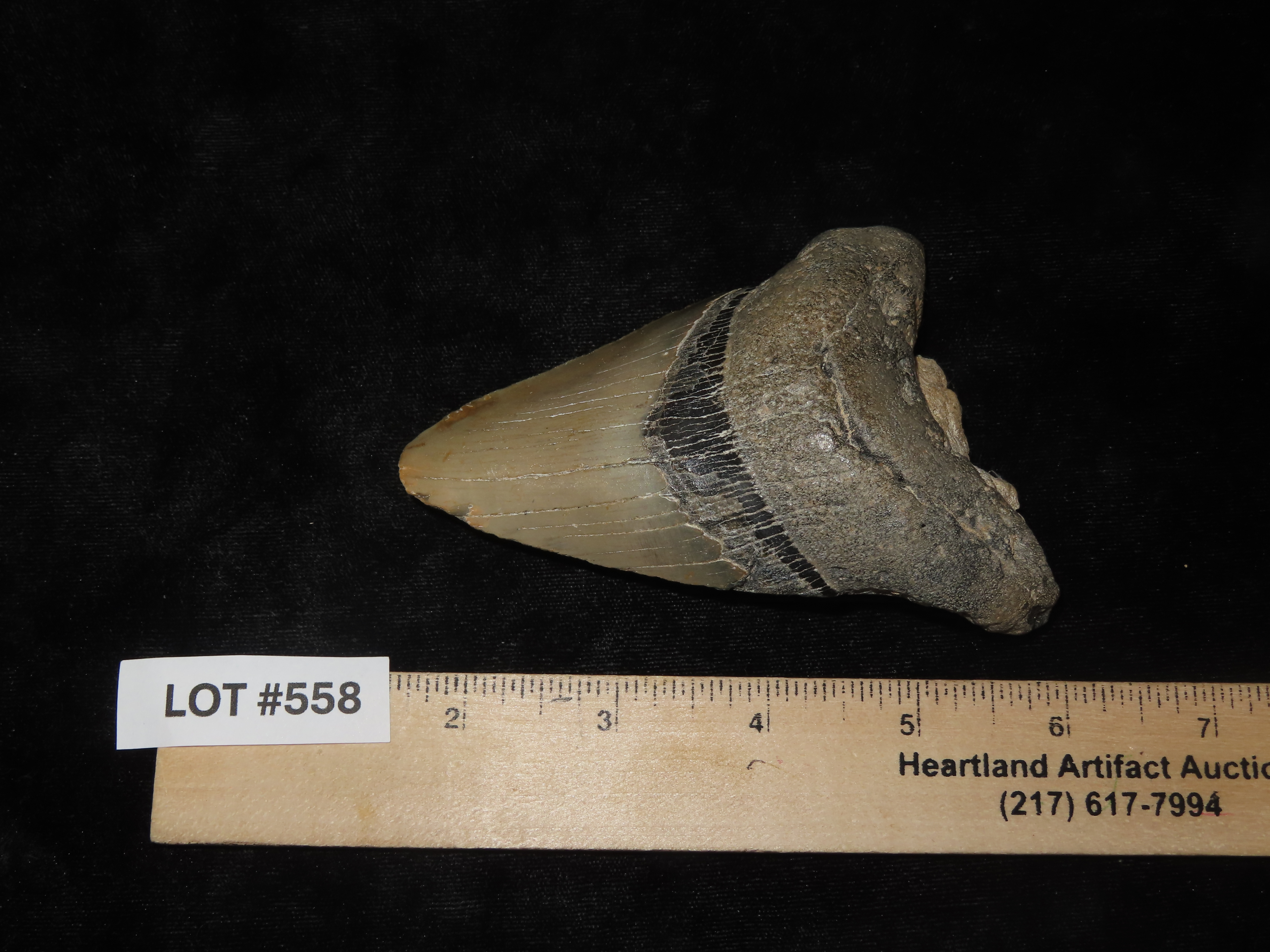 HUGE 4 1/2″ Megalodon Shark Tooth, 2.5-23 Million Year Old Fossil found off the coast of the Carolinas. No Repair, No Resto, No Polishing. Great Example!